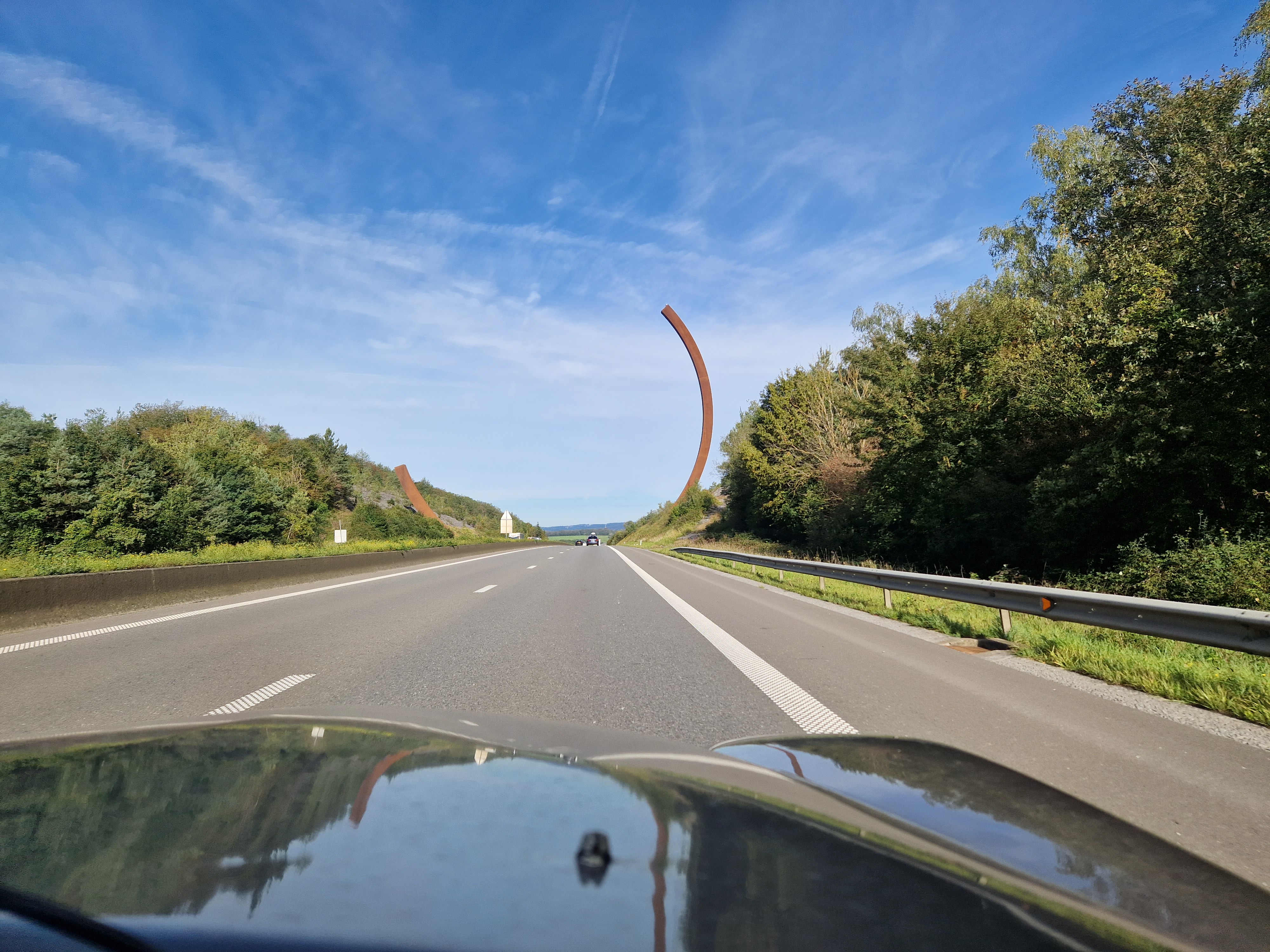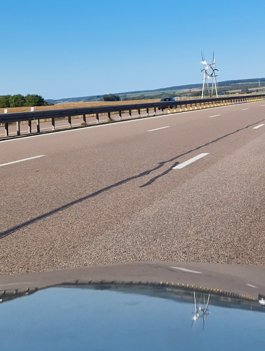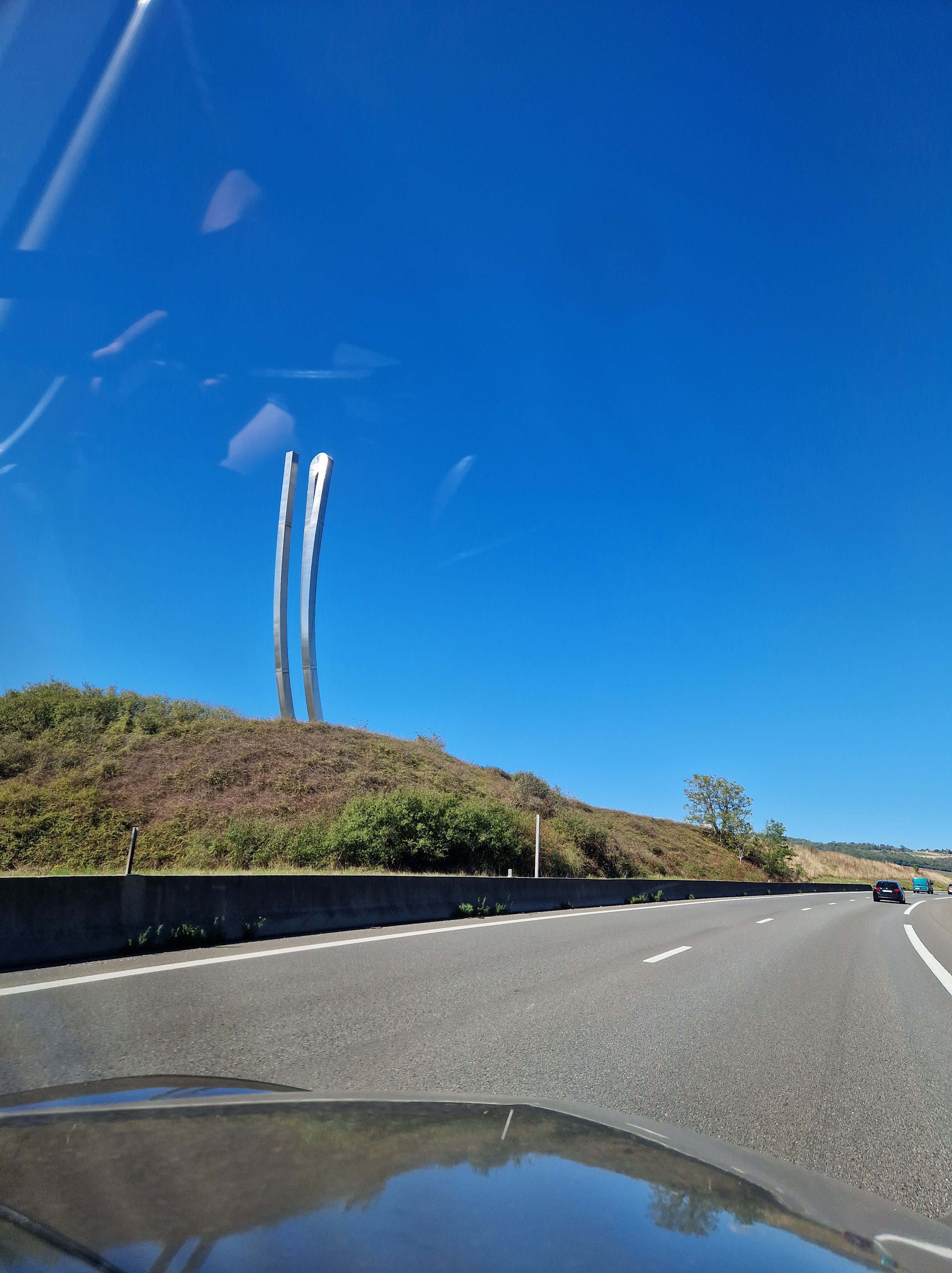 Tom stuurt ons de périphérique op, helaas niet dwars door Lyon. Dat rijdt prima, alleen een beetje eentonig. Onverwacht doemt het landmark Signe Infini recht vóór ons op. We zijn terug op de A6. Bij Macon stoppen we voor koffie, broodje en praatje. Bij Langres-Nord schittert het kunstwerk net als op de heenreis in de zon. We zijn op de helft.