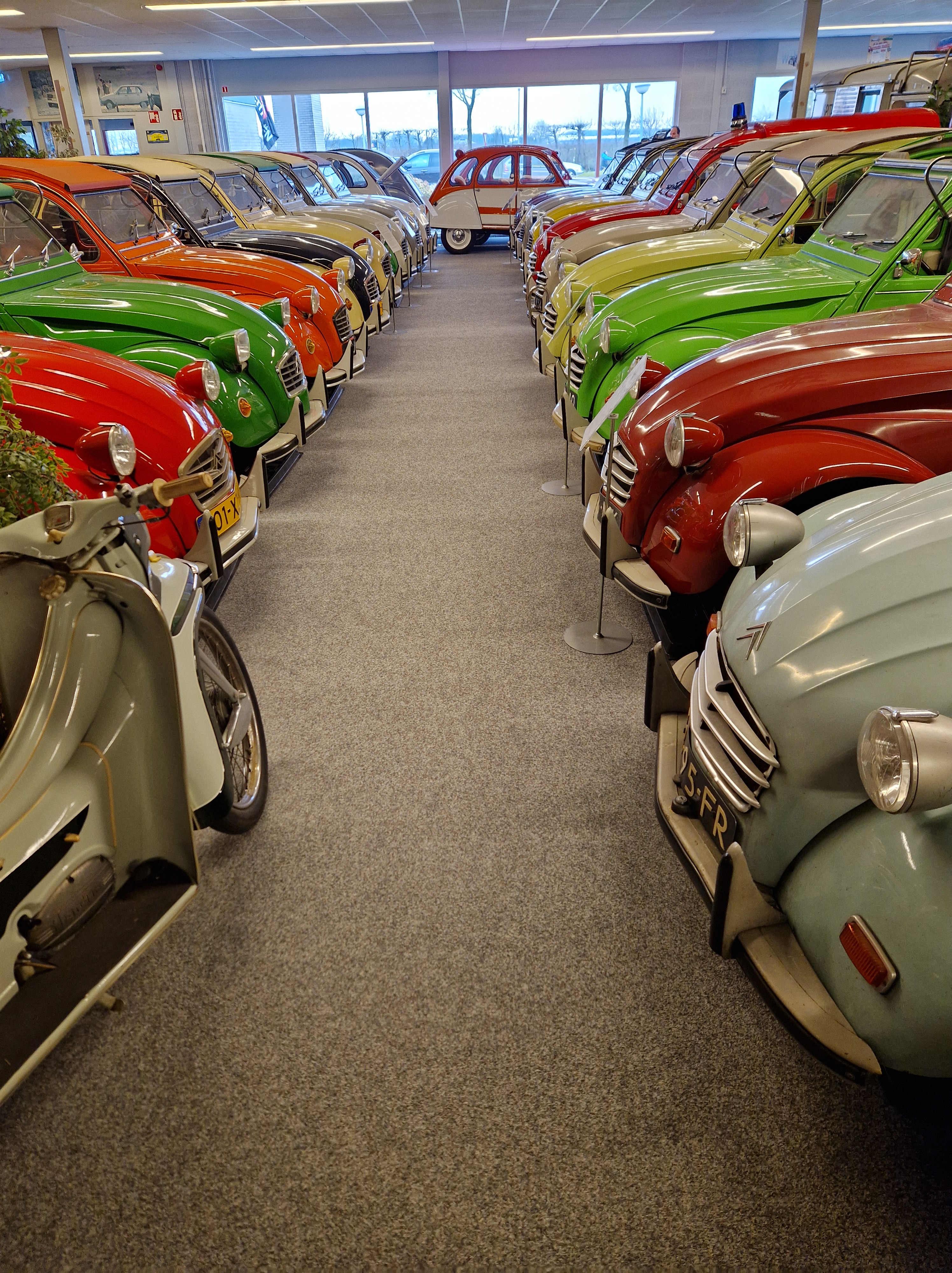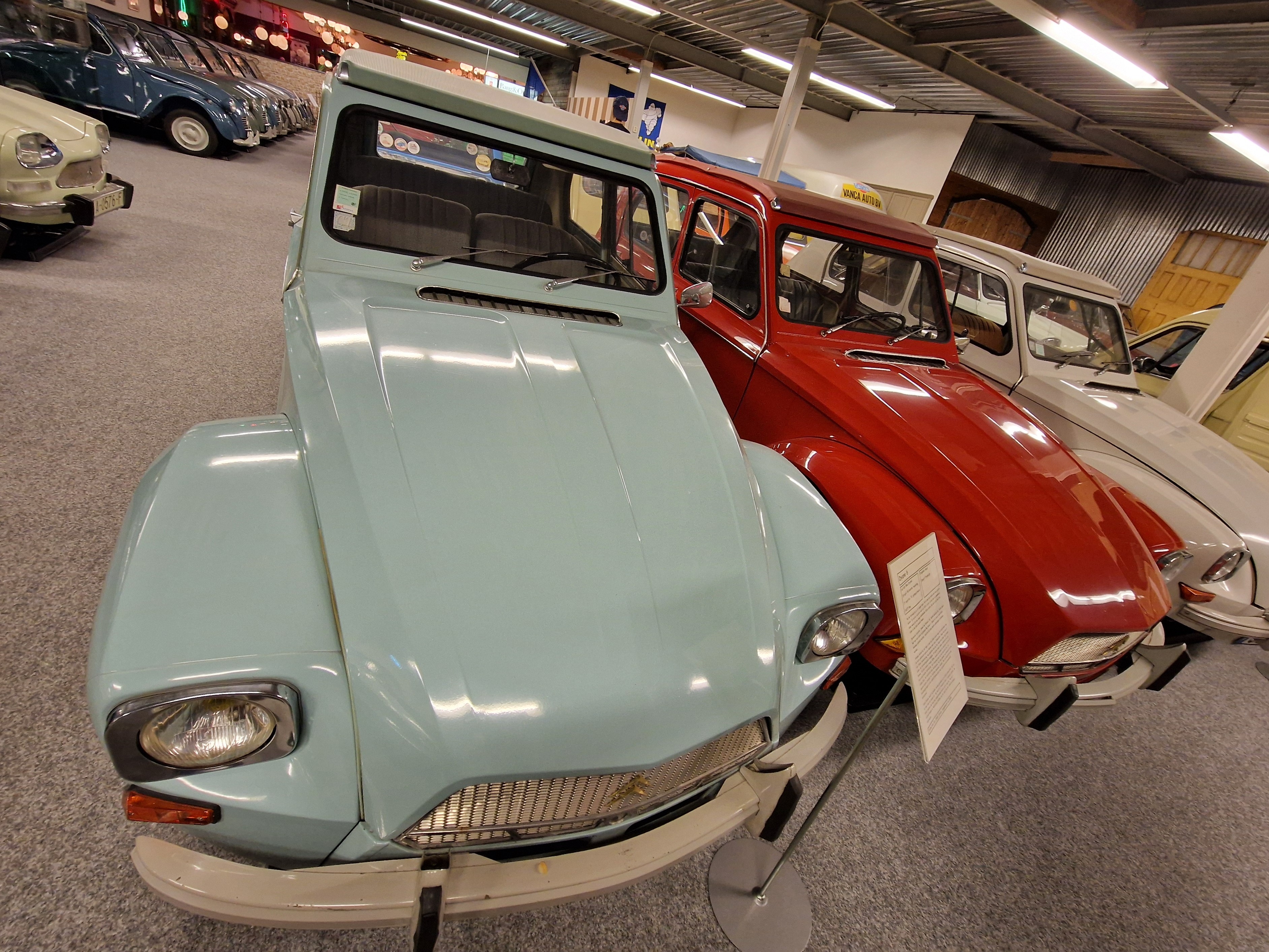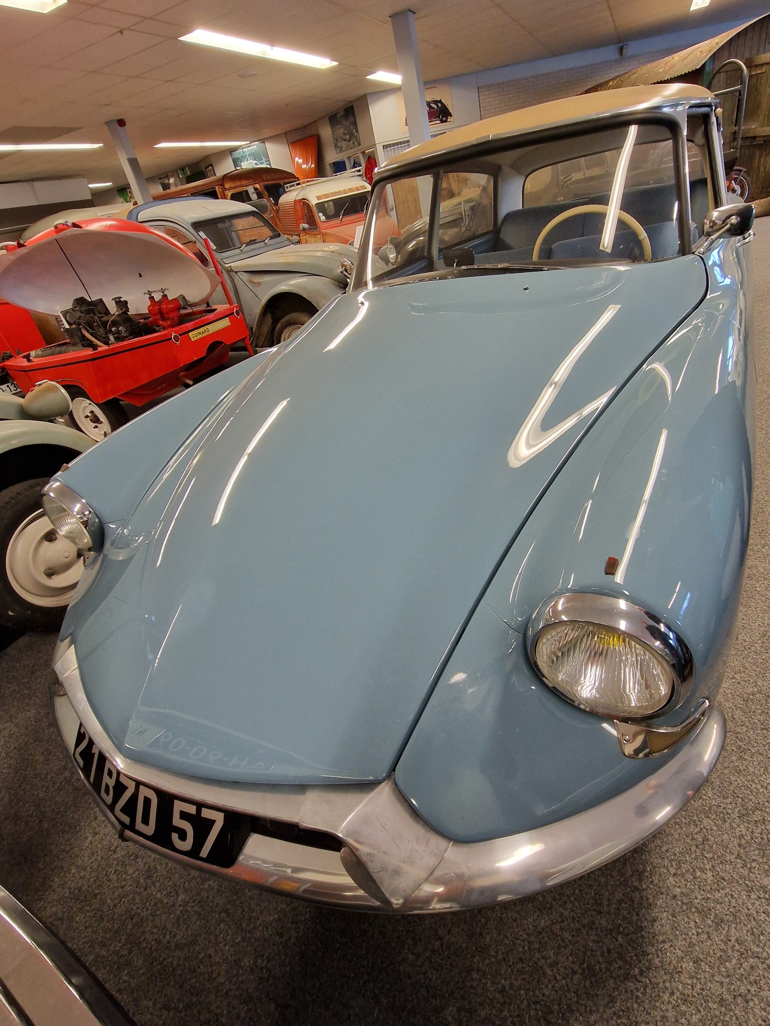 Op de diverse clubs zijn er veel mensen die gemengde gevoelens hebben bij dit museum. Deels kan ik het met ze eens zijn: die auto’s moeten de weg op! Gewoon rijden met die oldtimers is veel leuker dan ze voor de eeuwigheid te bewaren. Aan de andere kant is dit domweg een leuke saaiezondagmiddag-besteding hier eens rond te scharrelen. Dyanes, Acadianes, een rijtje HY-tjes, wat mooie en wat aftandse Ami’s, een hele rij Sahara-eenden waar er slechts een paar honderd van gemaakt zijn waarvan er nu zo’n 15 nooit meer de weg op zullen gaan want tentoongesteld. Een stelletje DS-en, van “schuurvondst-staat” tot compleet gerestaureerd. De mooiste staat buiten op de parkeerplaats. De onze.
