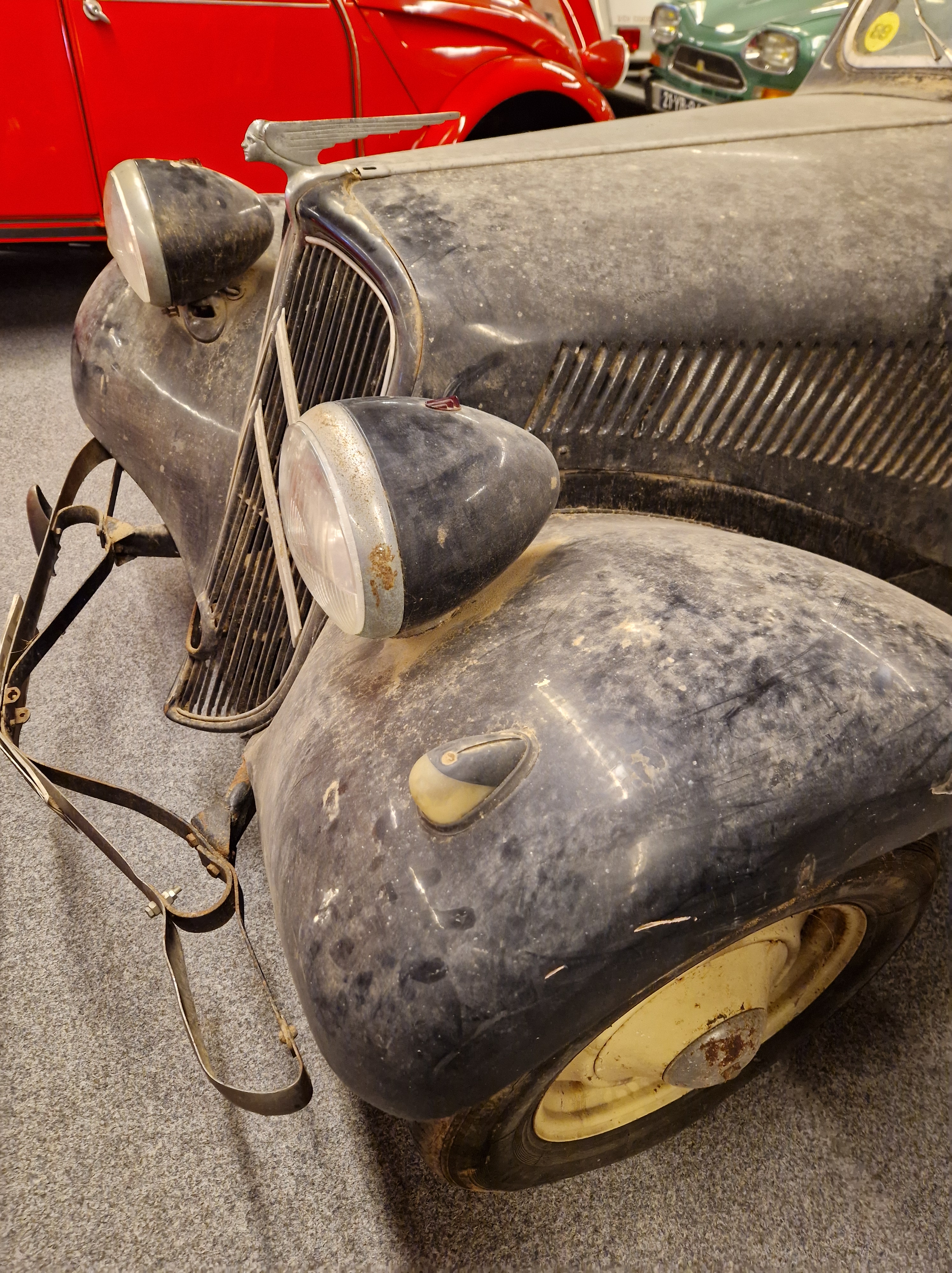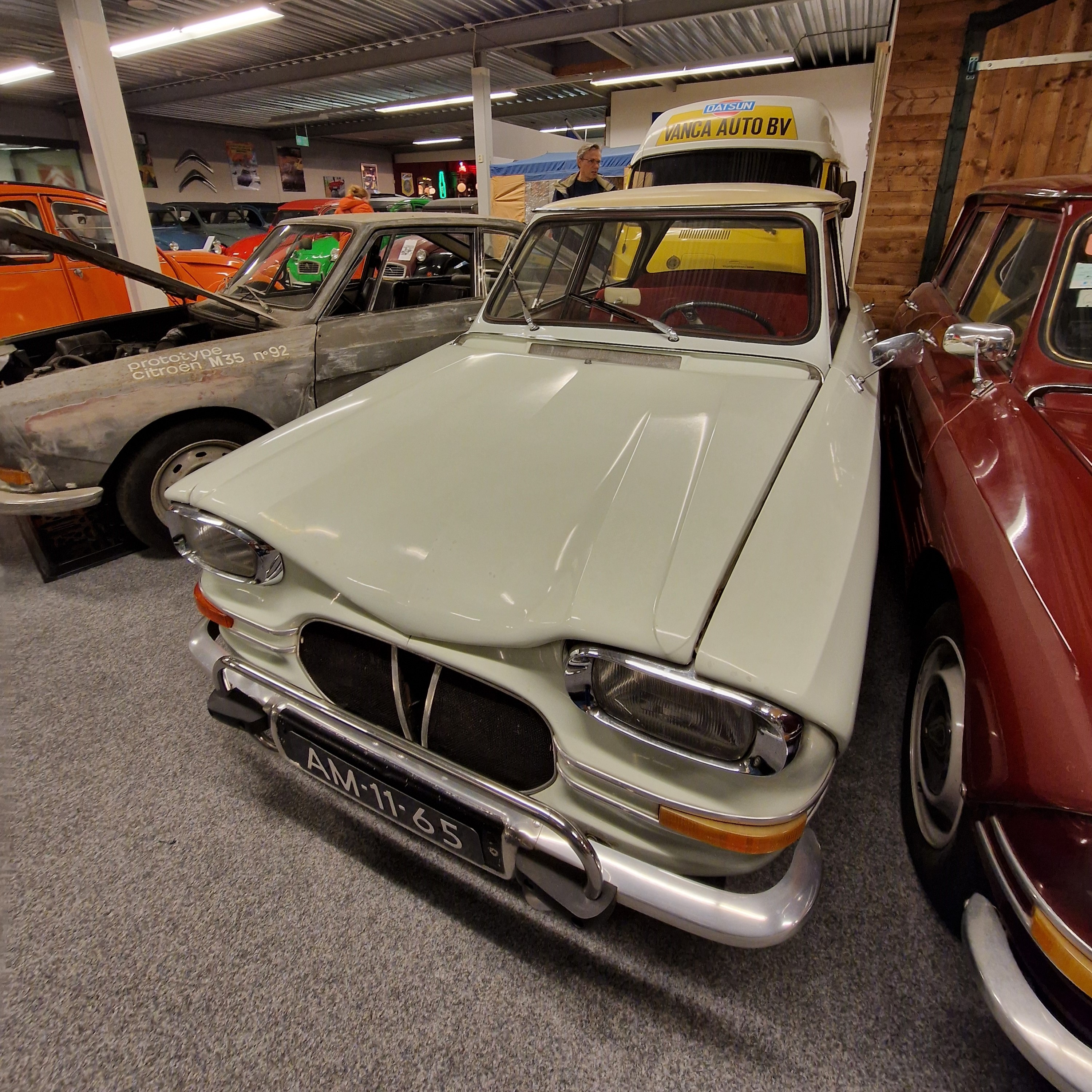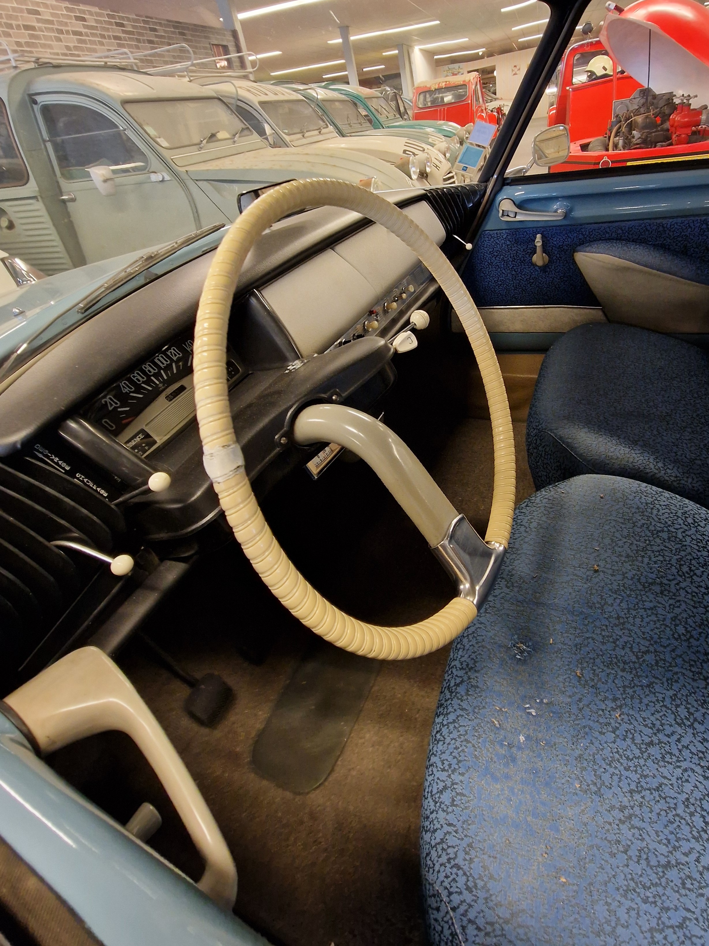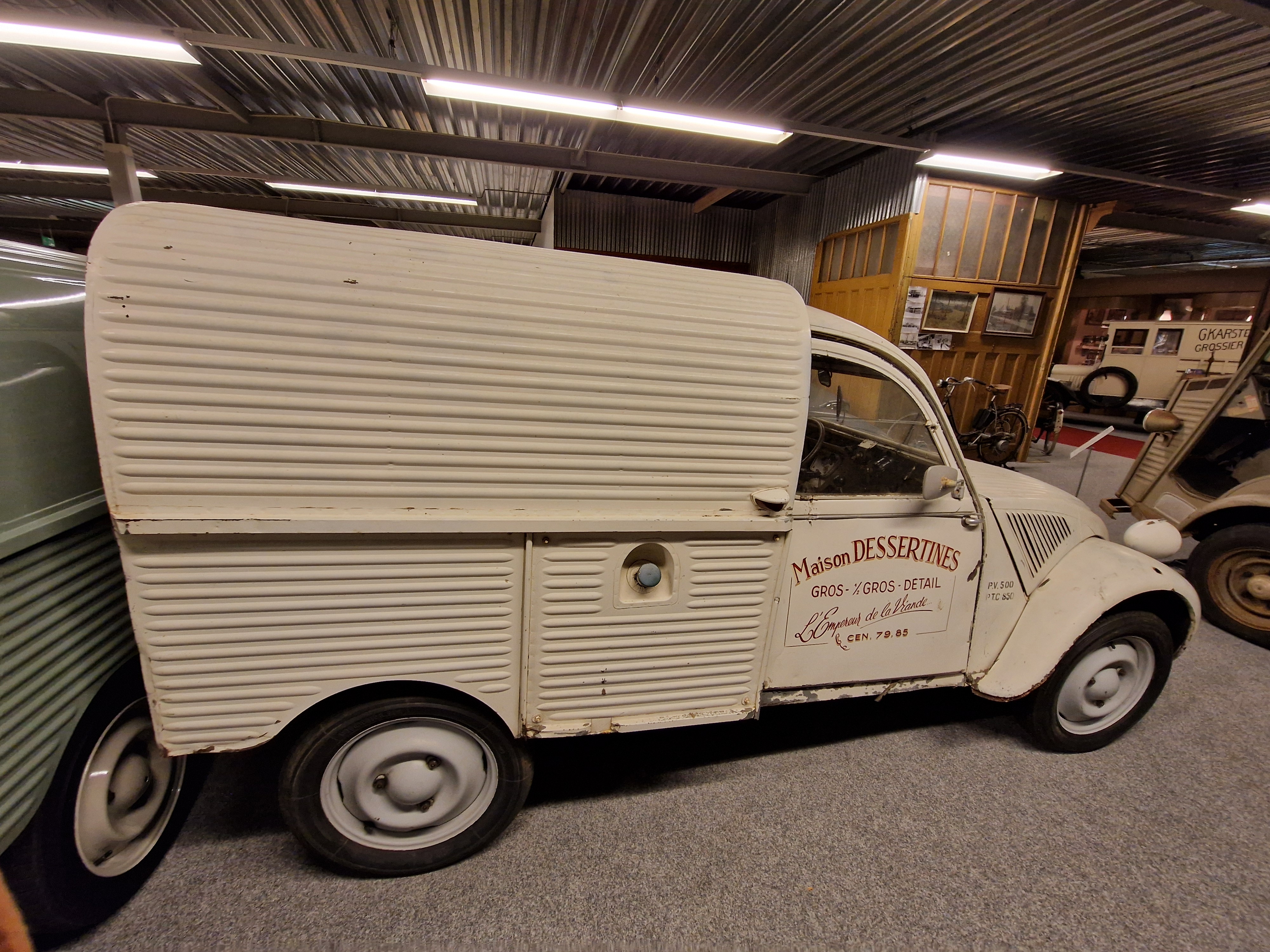 Op de diverse clubs zijn er veel mensen die gemengde gevoelens hebben bij dit museum. Deels kan ik het met ze eens zijn: die auto’s moeten de weg op! Gewoon rijden met die oldtimers is veel leuker dan ze voor de eeuwigheid te bewaren. Aan de andere kant is dit domweg een leuke saaiezondagmiddag-besteding hier eens rond te scharrelen. Dyanes, Acadianes, een rijtje HY-tjes, wat mooie en wat aftandse Ami’s, een hele rij Sahara-eenden waar er slechts een paar honderd van gemaakt zijn waarvan er nu zo’n 15 nooit meer de weg op zullen gaan want tentoongesteld. Een stelletje DS-en, van “schuurvondst-staat” tot compleet gerestaureerd. De mooiste staat buiten op de parkeerplaats. De onze.