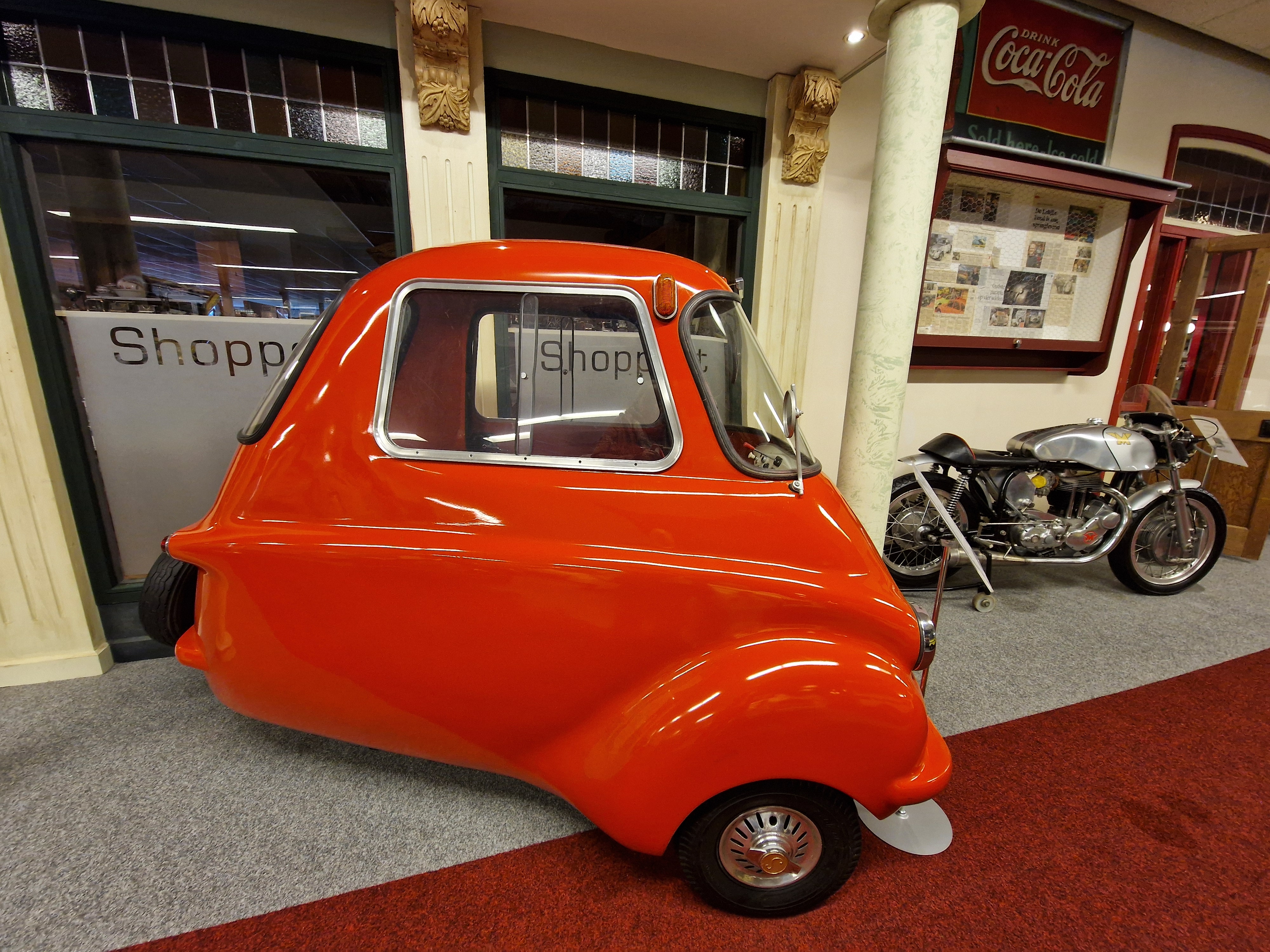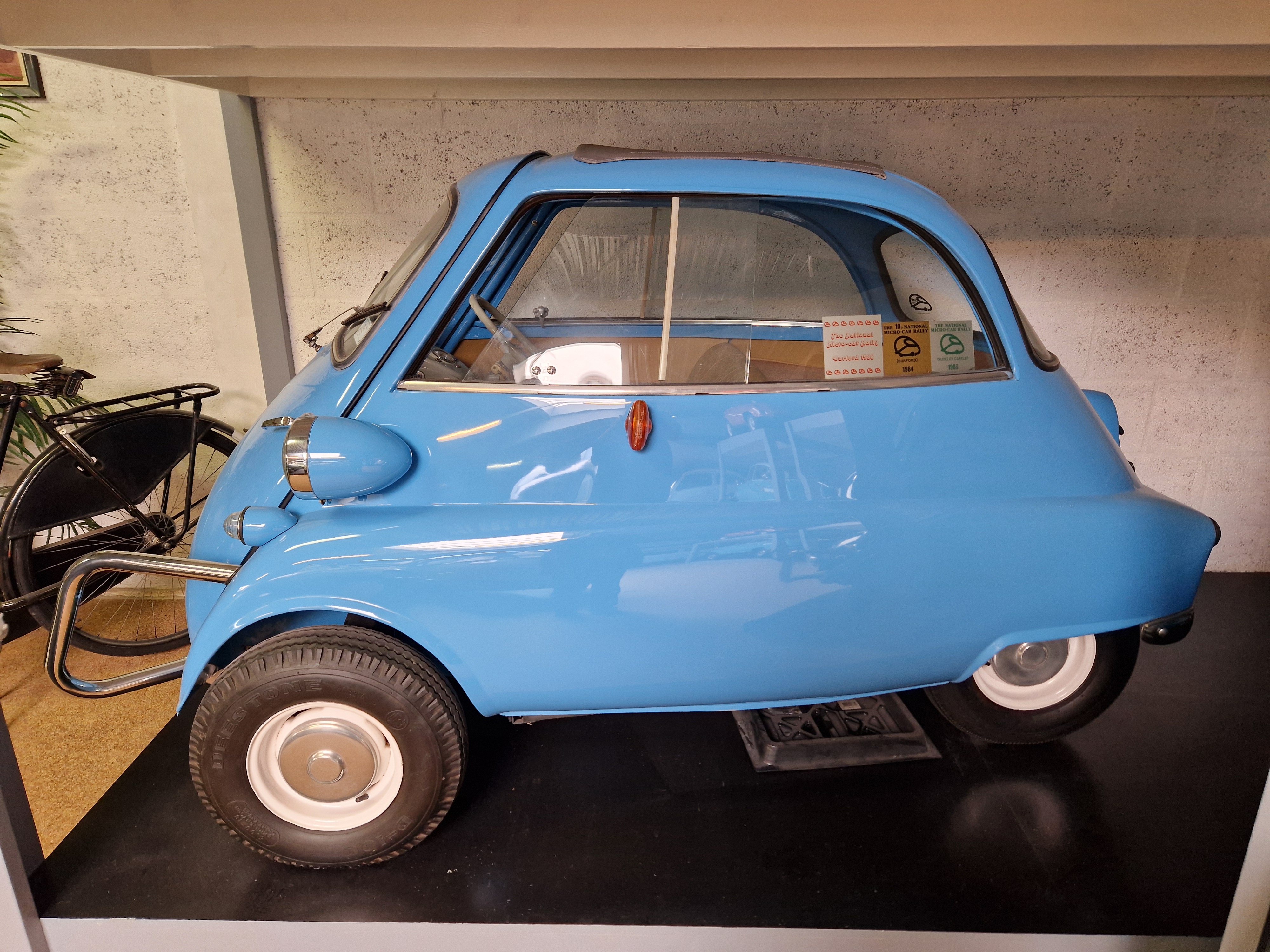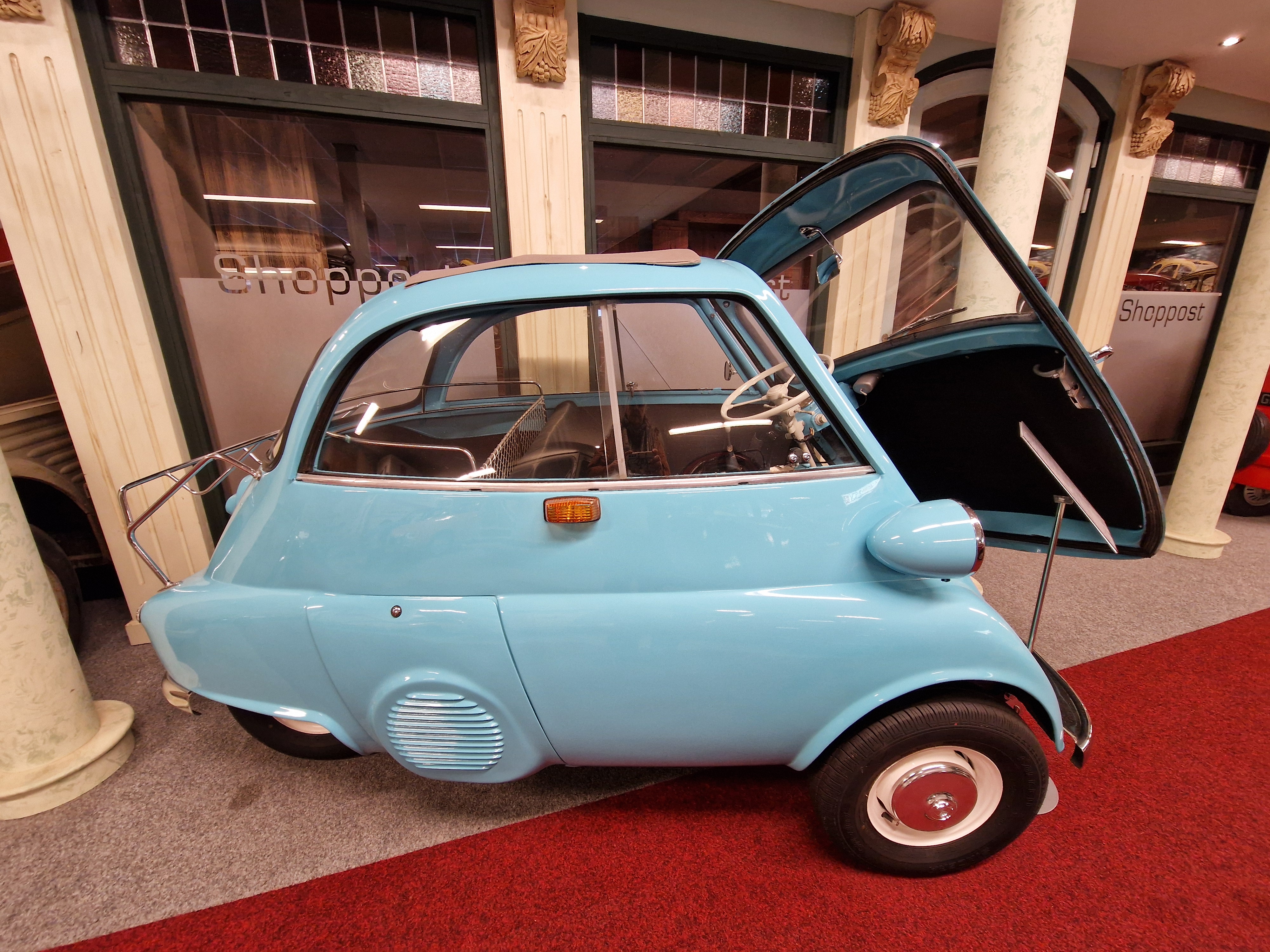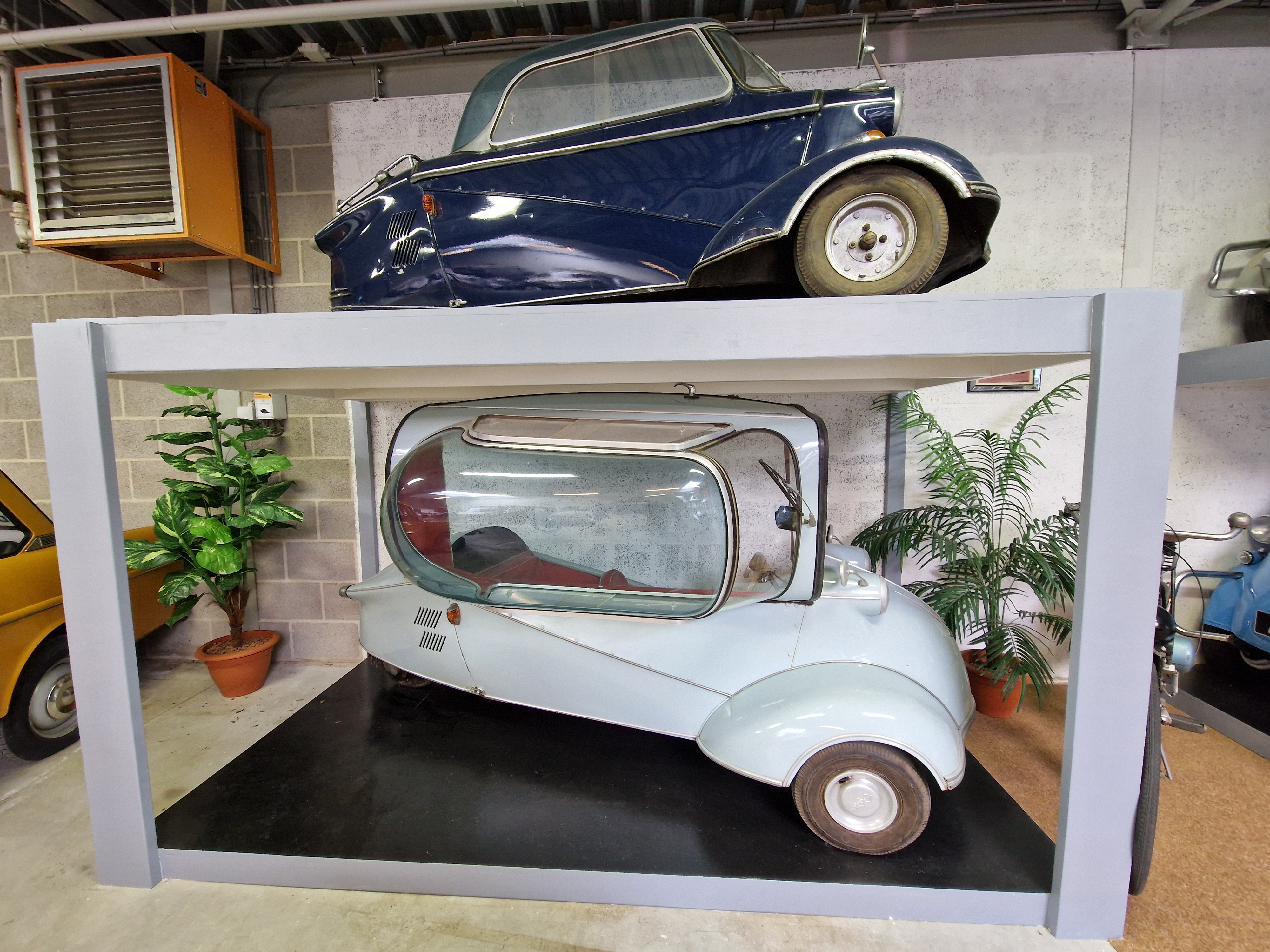 twee blauwe BMW’s Isetta en een Piaggio bestellertje.