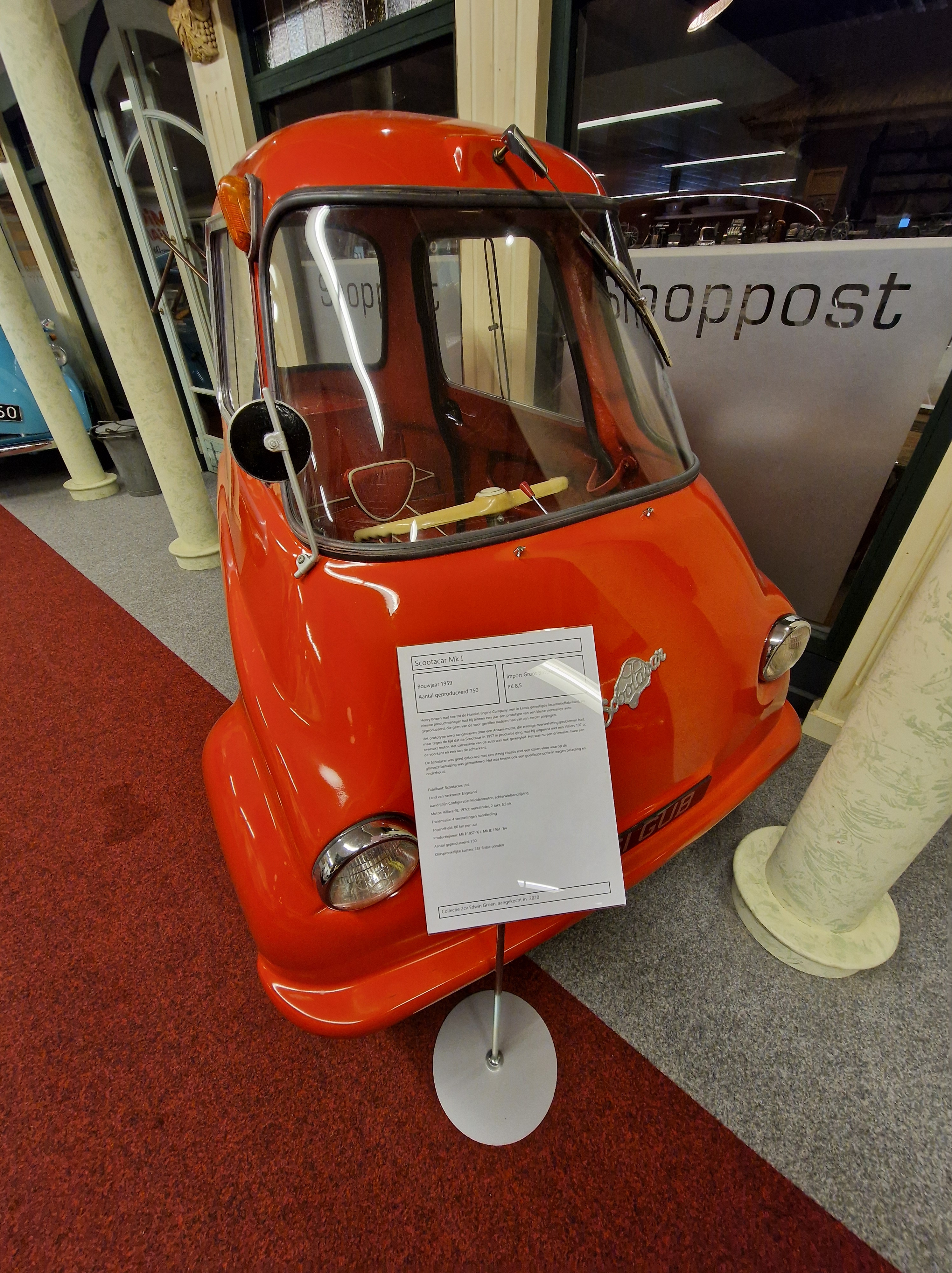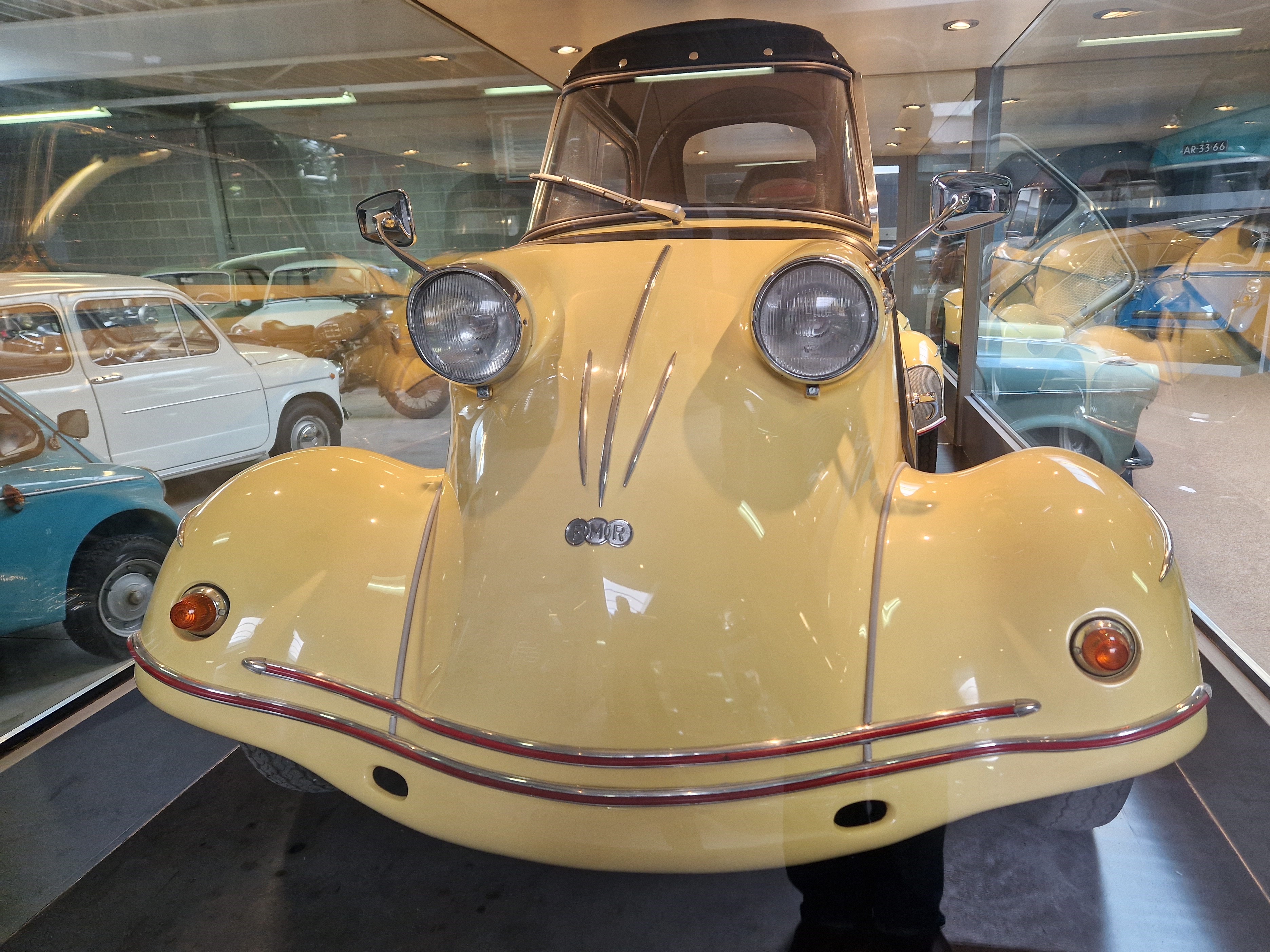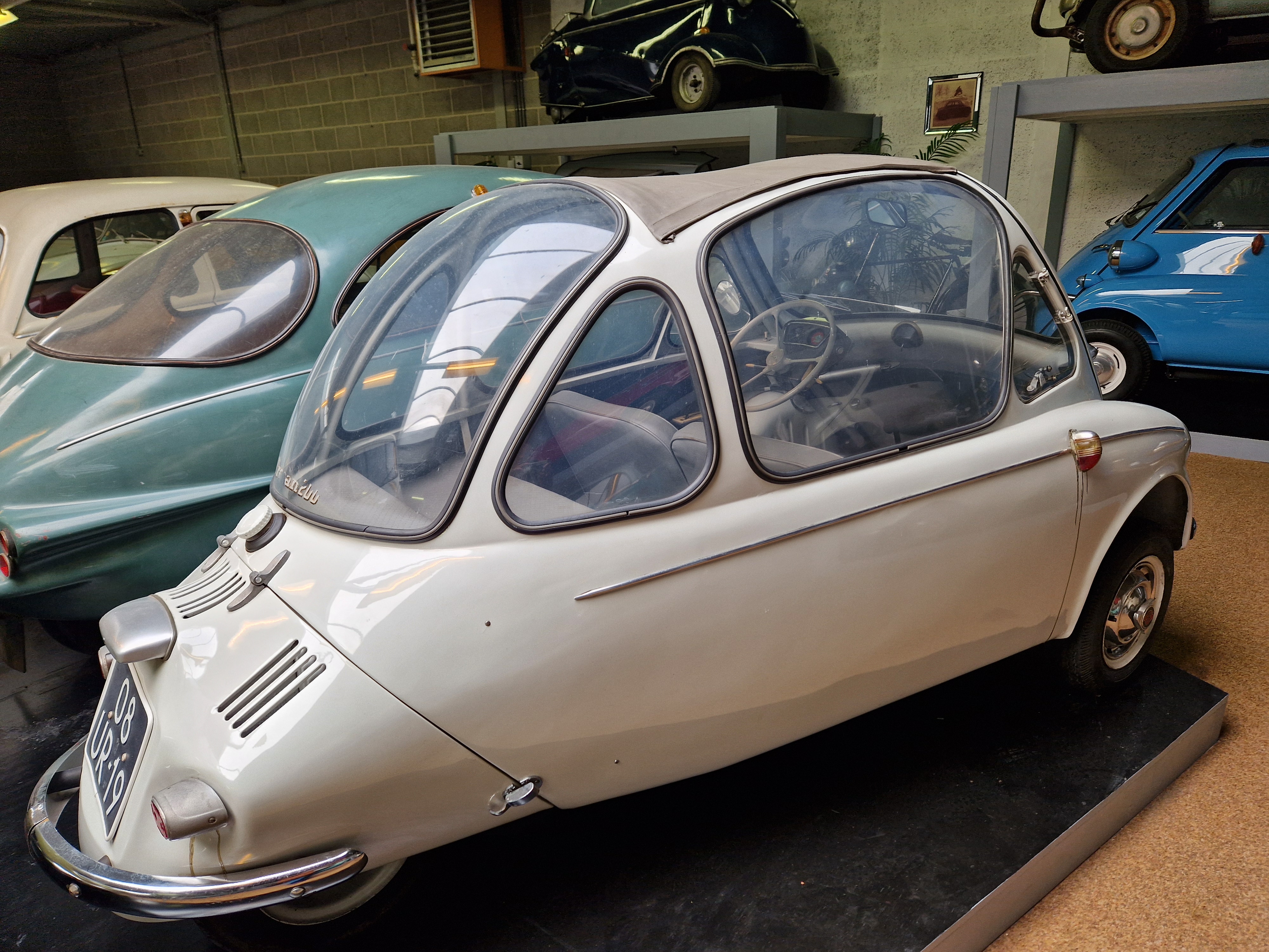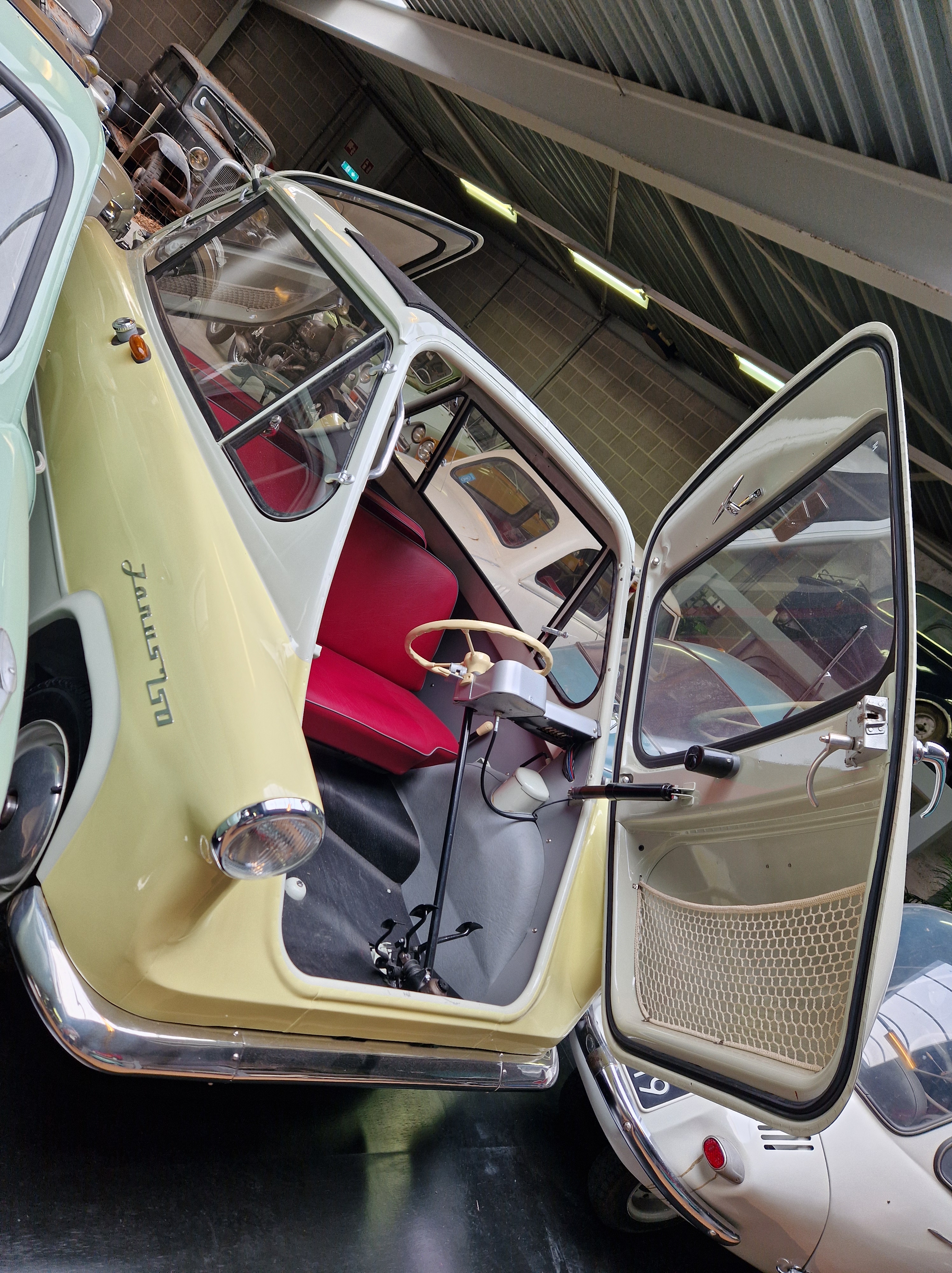 Ik ben wég van de Pieremachochels. Van die Cousin It autootjes uit de Adams Family, die overdwars opengaan. Ook van andere merken staan er zulke microkarretjes. Geweldig. Een Janus, een wagentje dat opent aan de voorkant en aan de achterkant en men zit rug-aan-rug. Fiatjes 600 keurig opgestapeld. Enkele Dafjes. Welgeteld één R4-tje. Eentje! Beetje jammer. Of juist niet, rijdt de rest nog? Het Dauphinetje ernaast is ook een dotje. Jammer dat juist bij al deze hoogst interessante wagentjes de bordjes met beschrijving ontbreken.