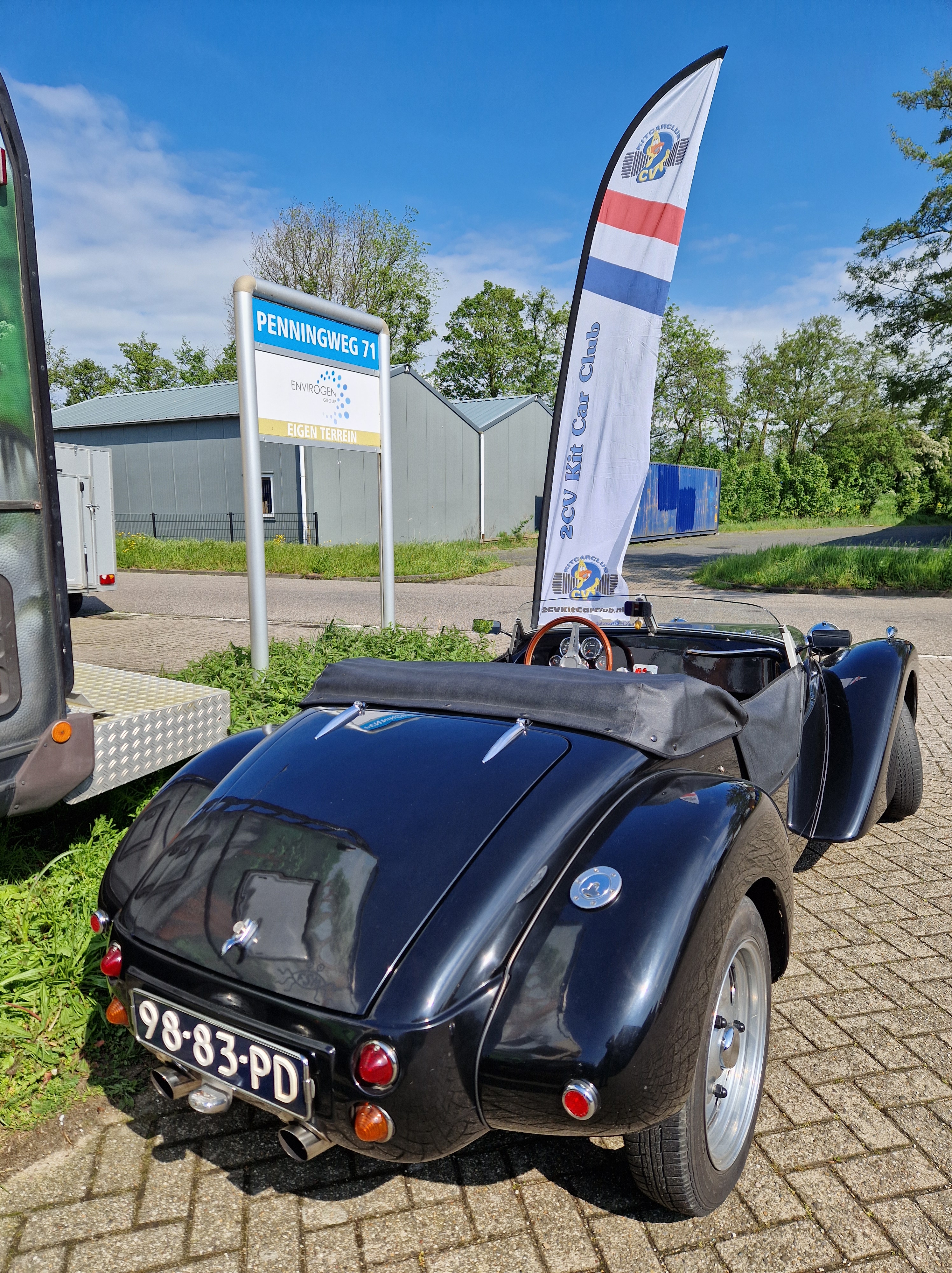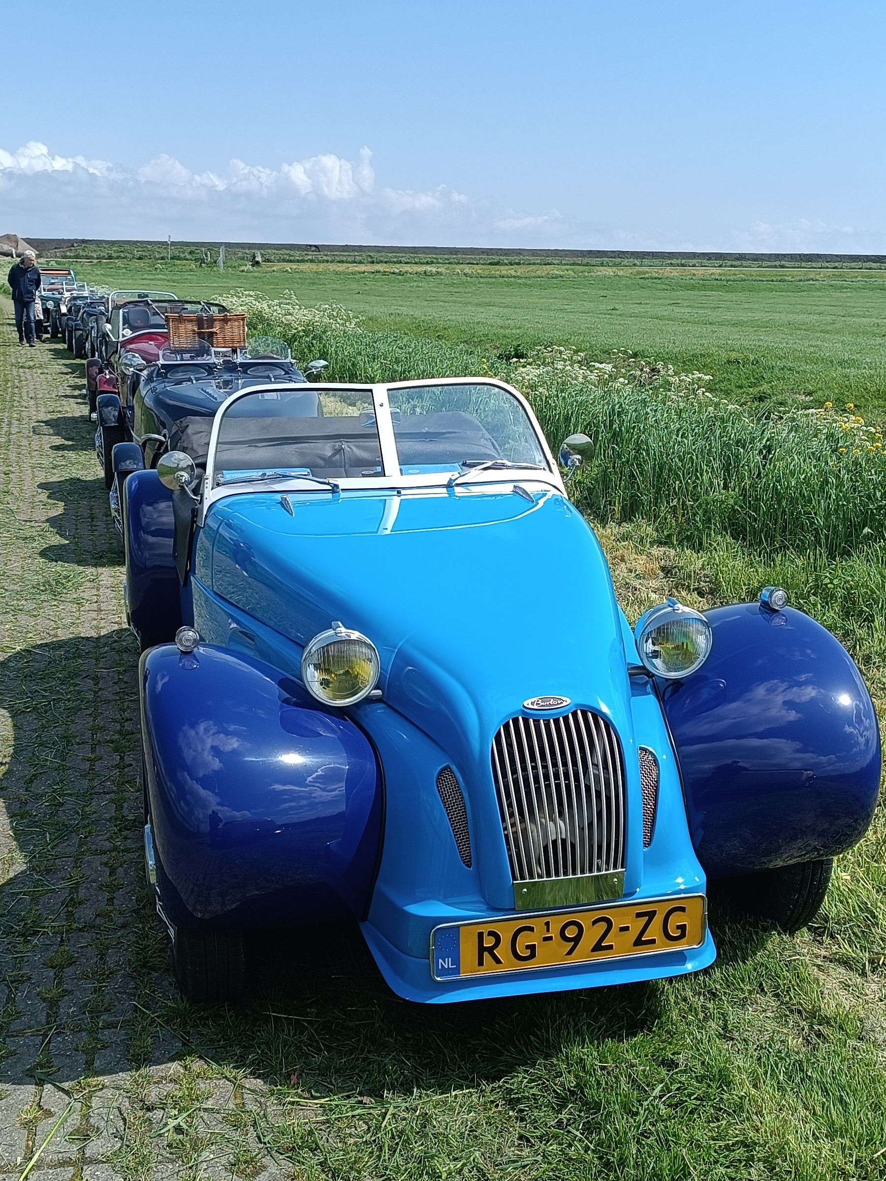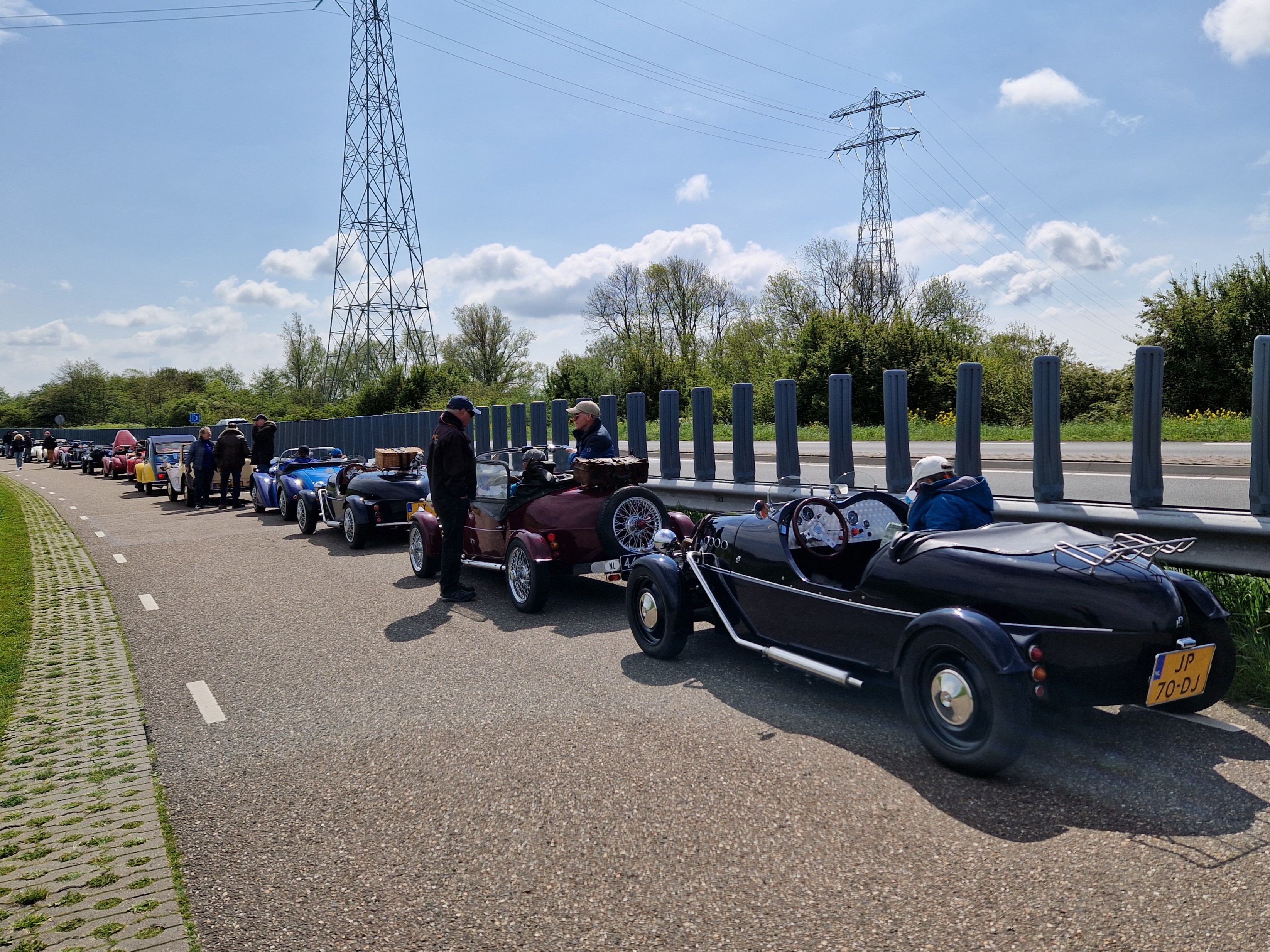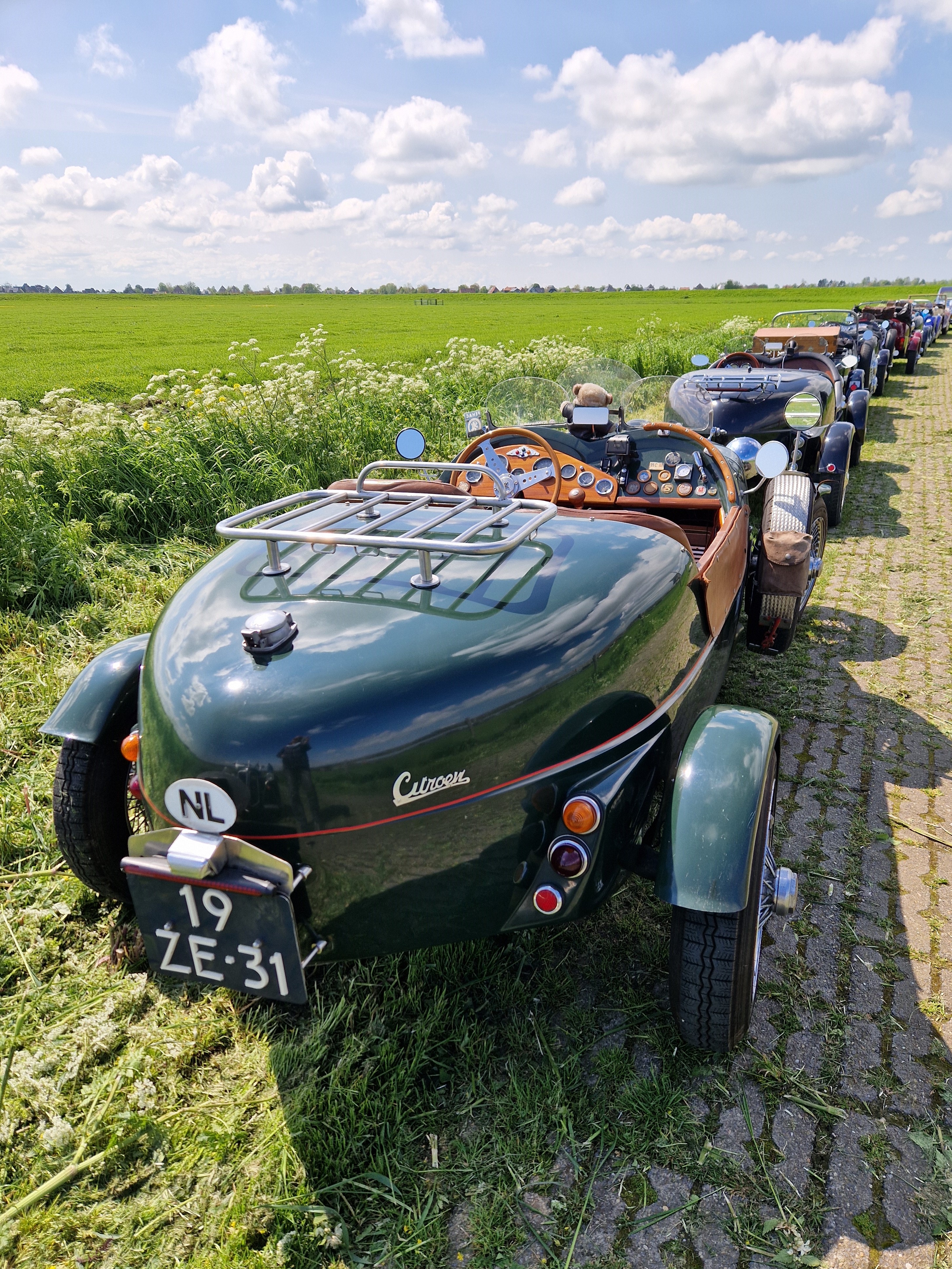 Tijd voor vertrek. Linksom en rechtsom draaien de karretjes het terrein af tot we aan de straat in een lange stoet staan opgesteld. Wij eindigen met het dak halfopen ergens in de achterhoede in de lange rij. Kitcars, twee eenden en wij, de enige Dyane.