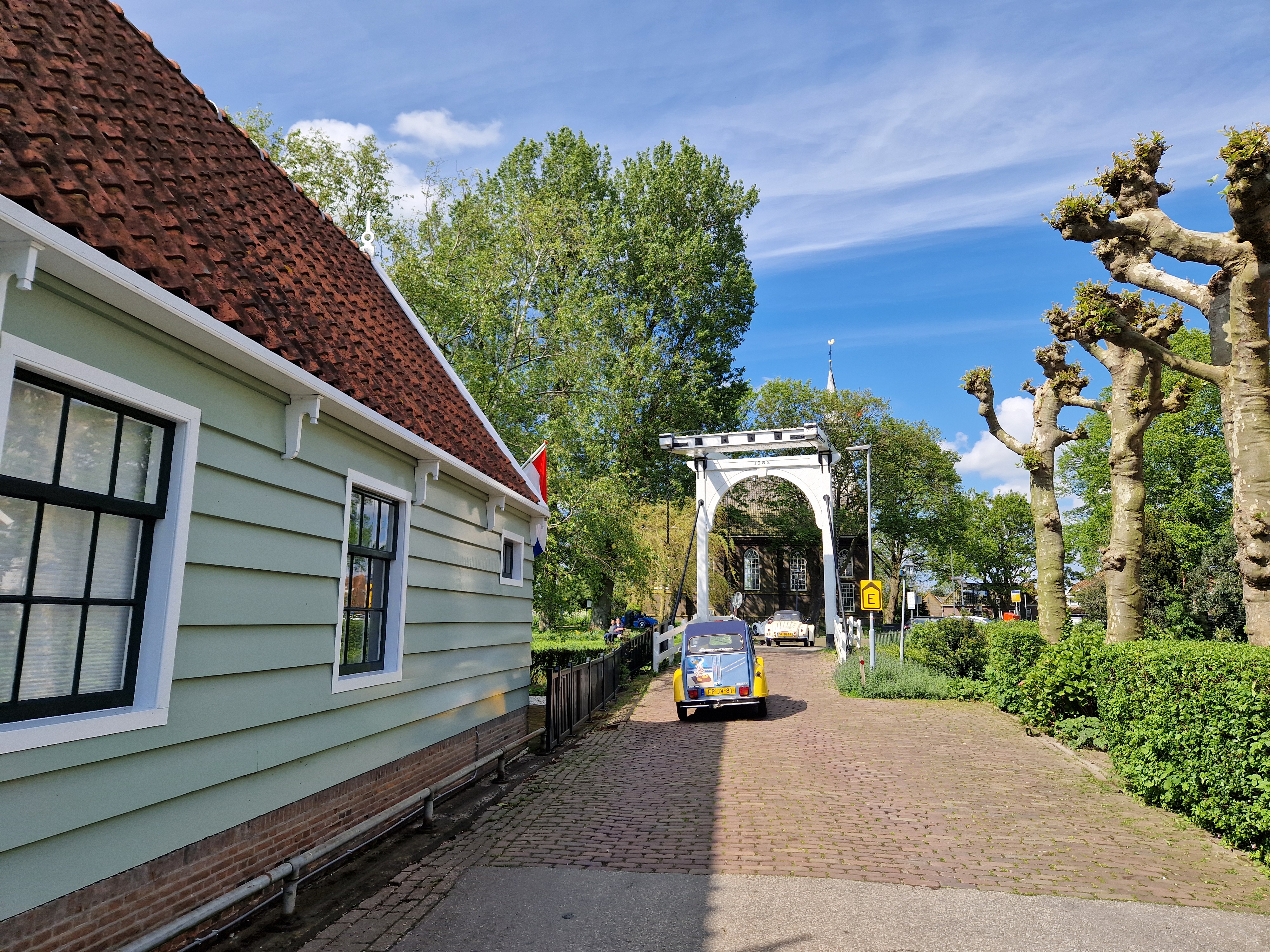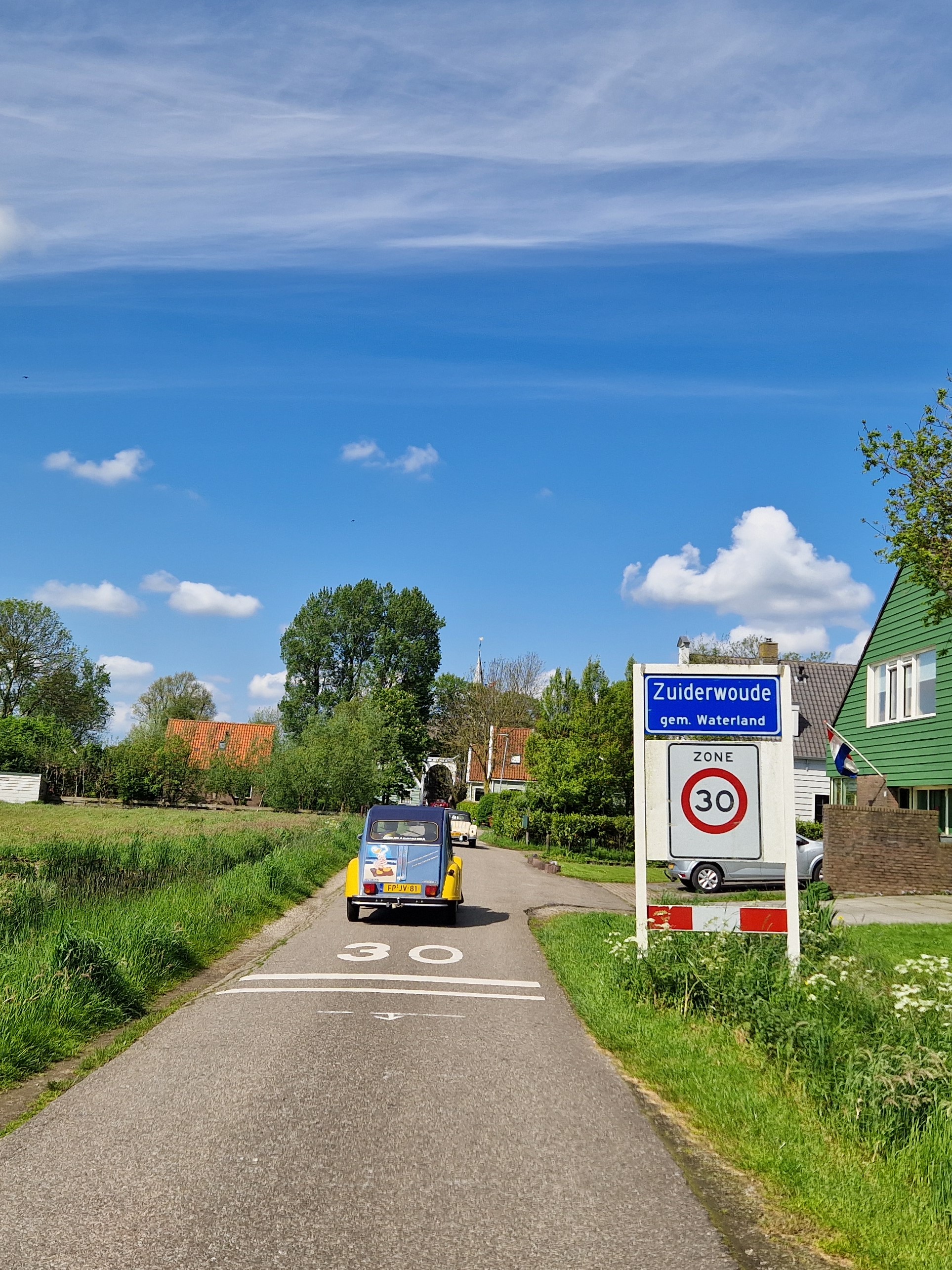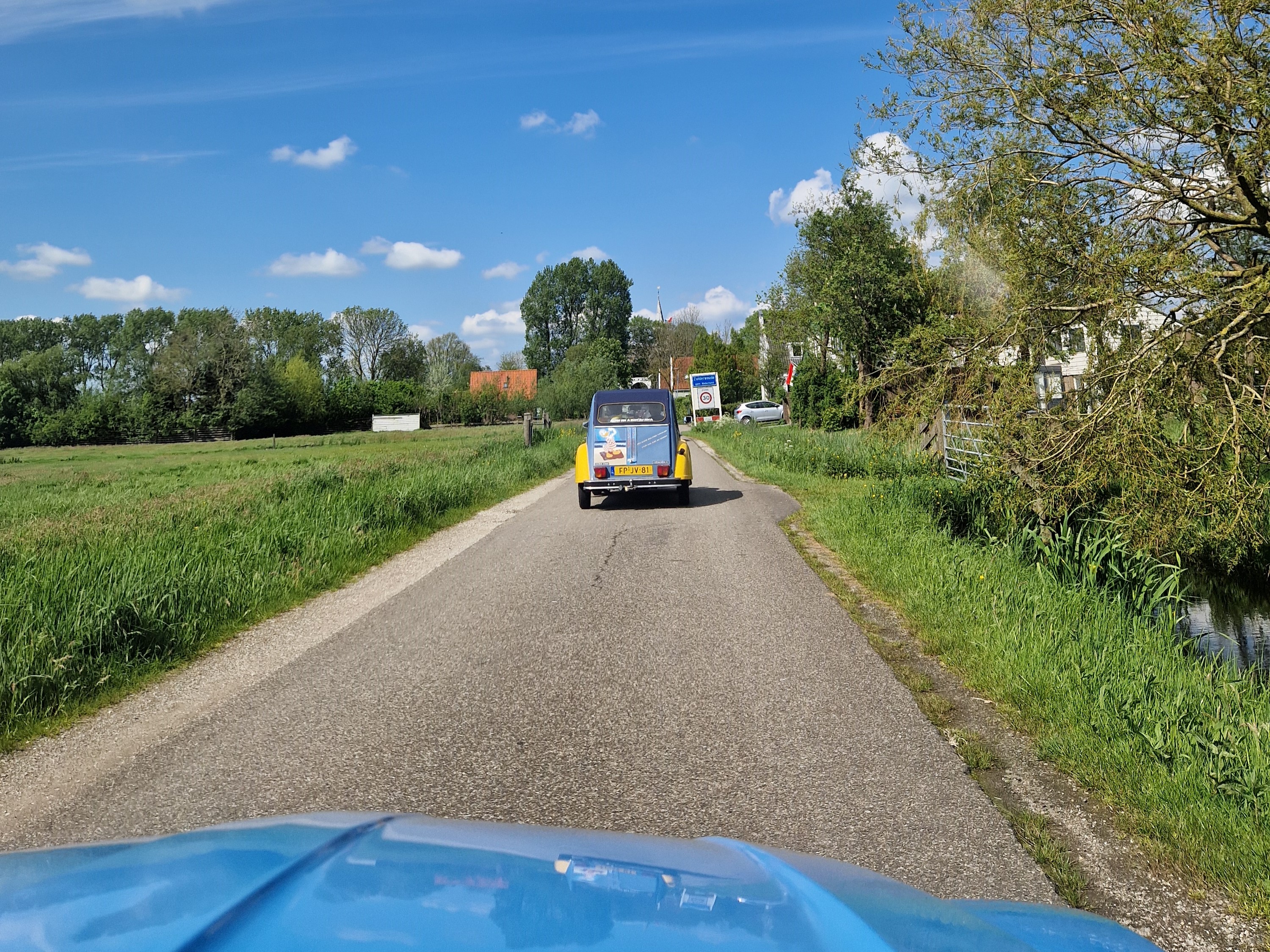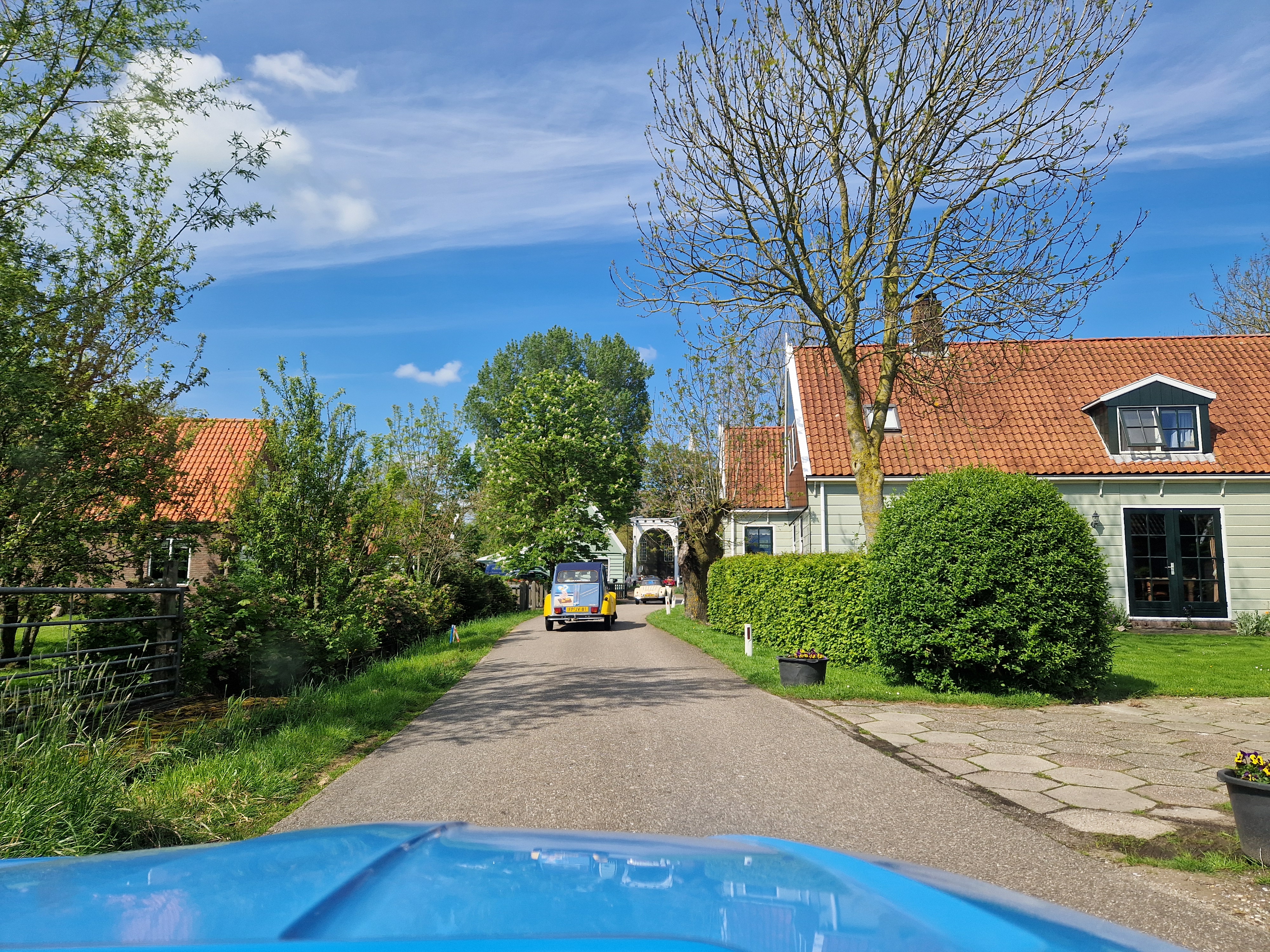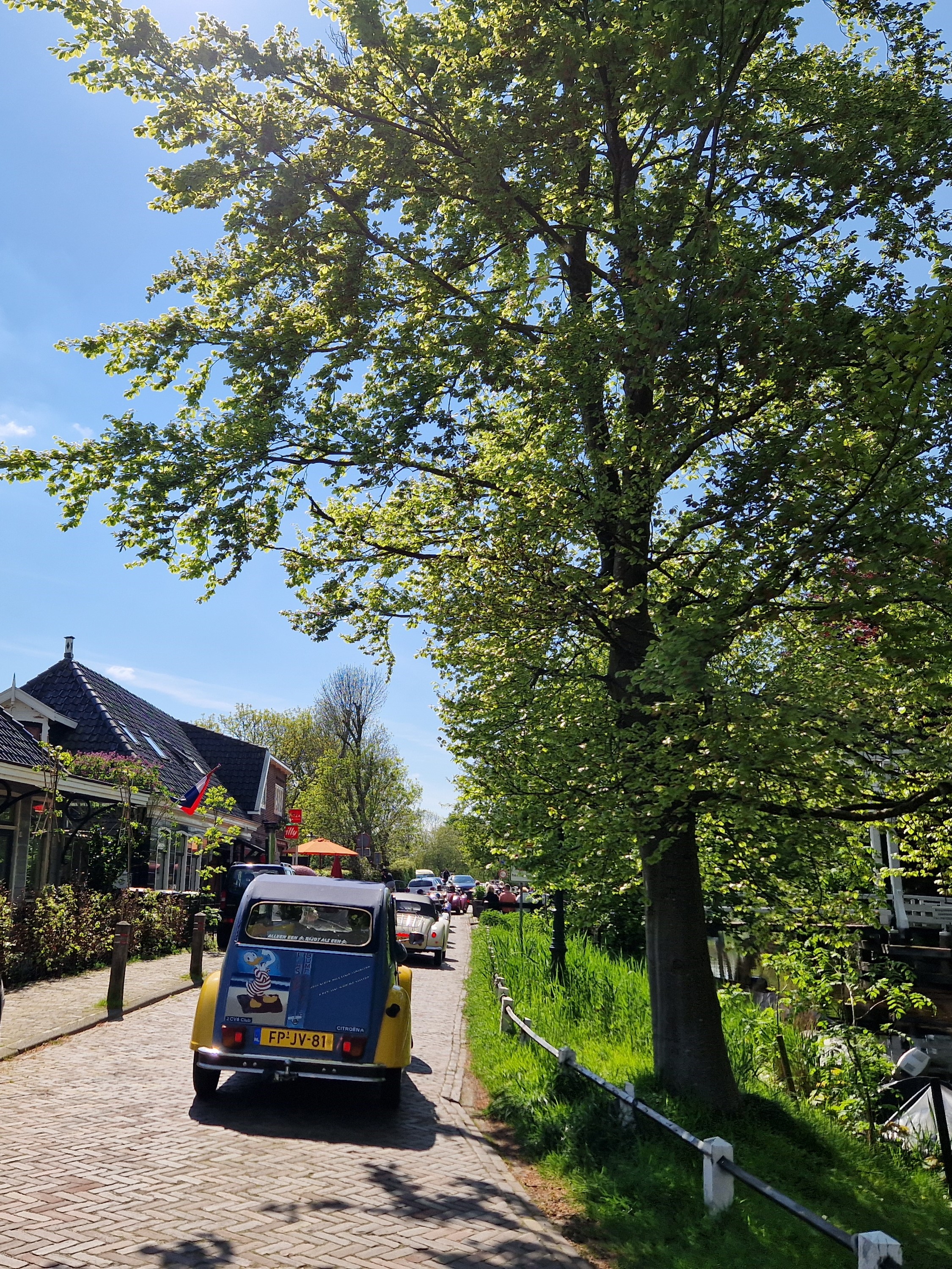 Daar gaan we! Langs de Zaans-groene huisjes en ’t Reght Huys van Westzaan. Het is 5 mei, overal hangt de vlag uit, overal stoppen mensen om onze optocht te filmen of te fotograferen. Kinderen zwaaien, wij toeteren terug. Het is tenslotte feest. Het moet ook een grappig gezicht en gehoor zijn, al die autootjes op basis van een 2CV, al die ronkende eendenmotortjes. Ze horen ons van verre aankomen.