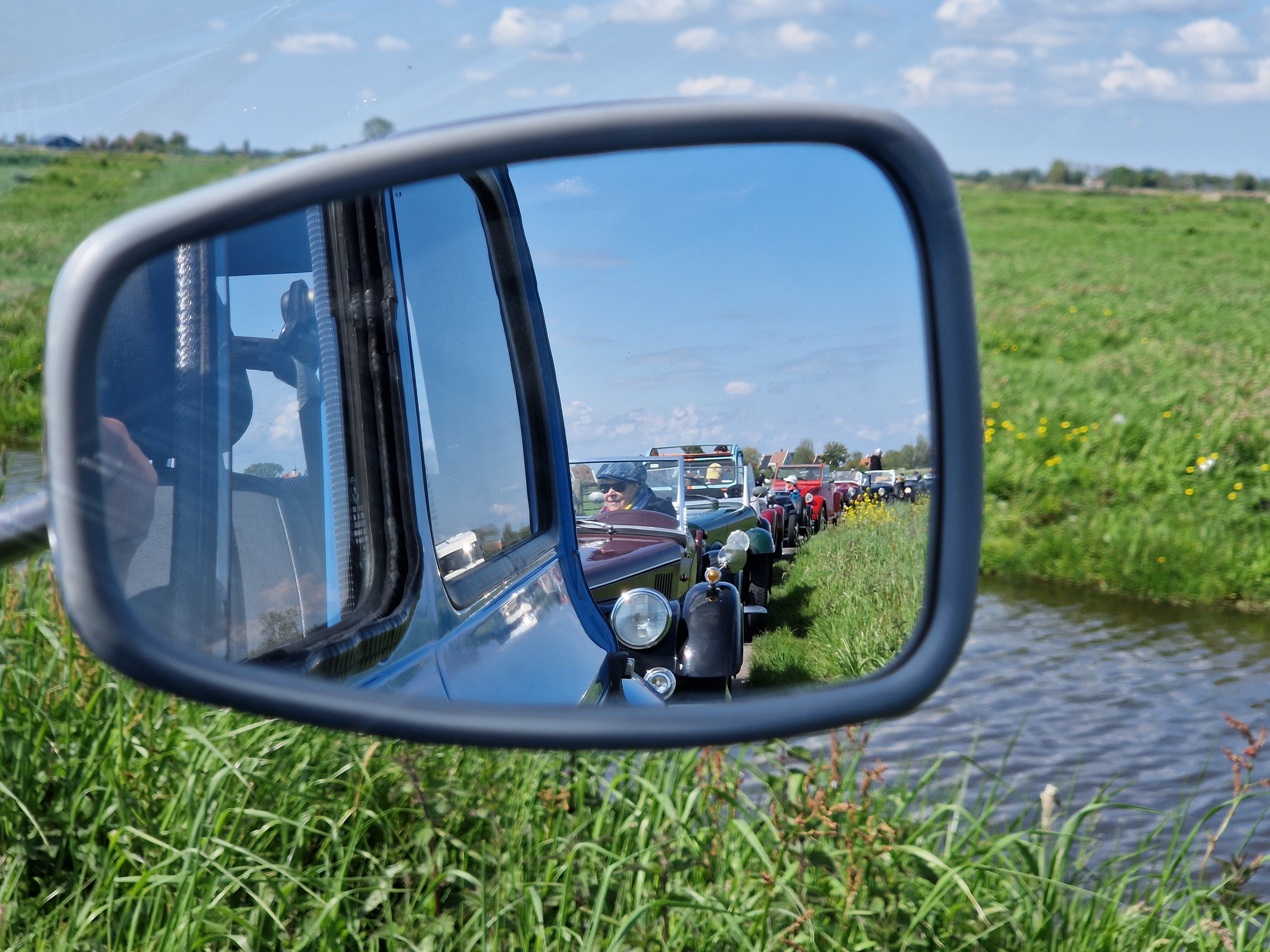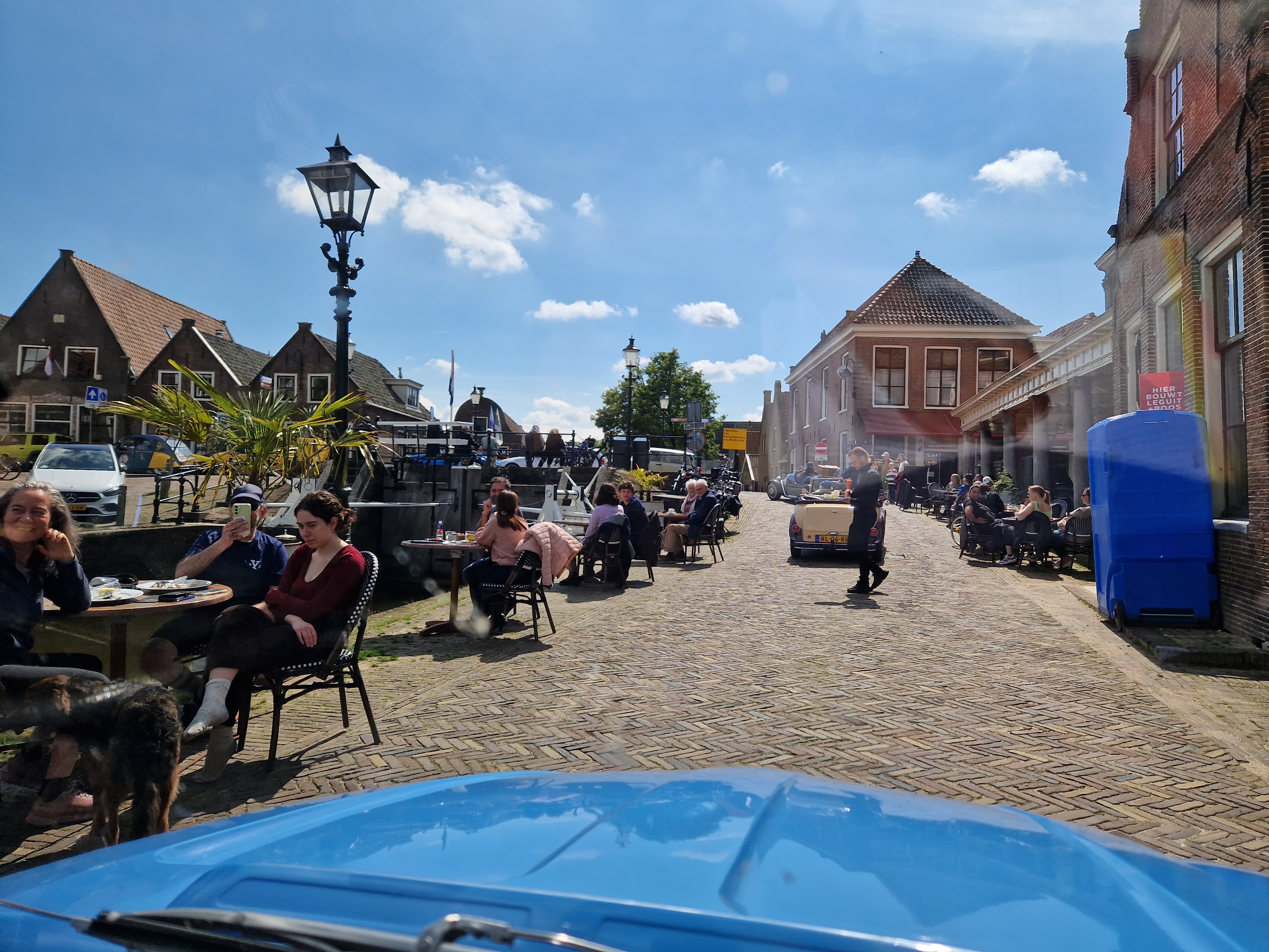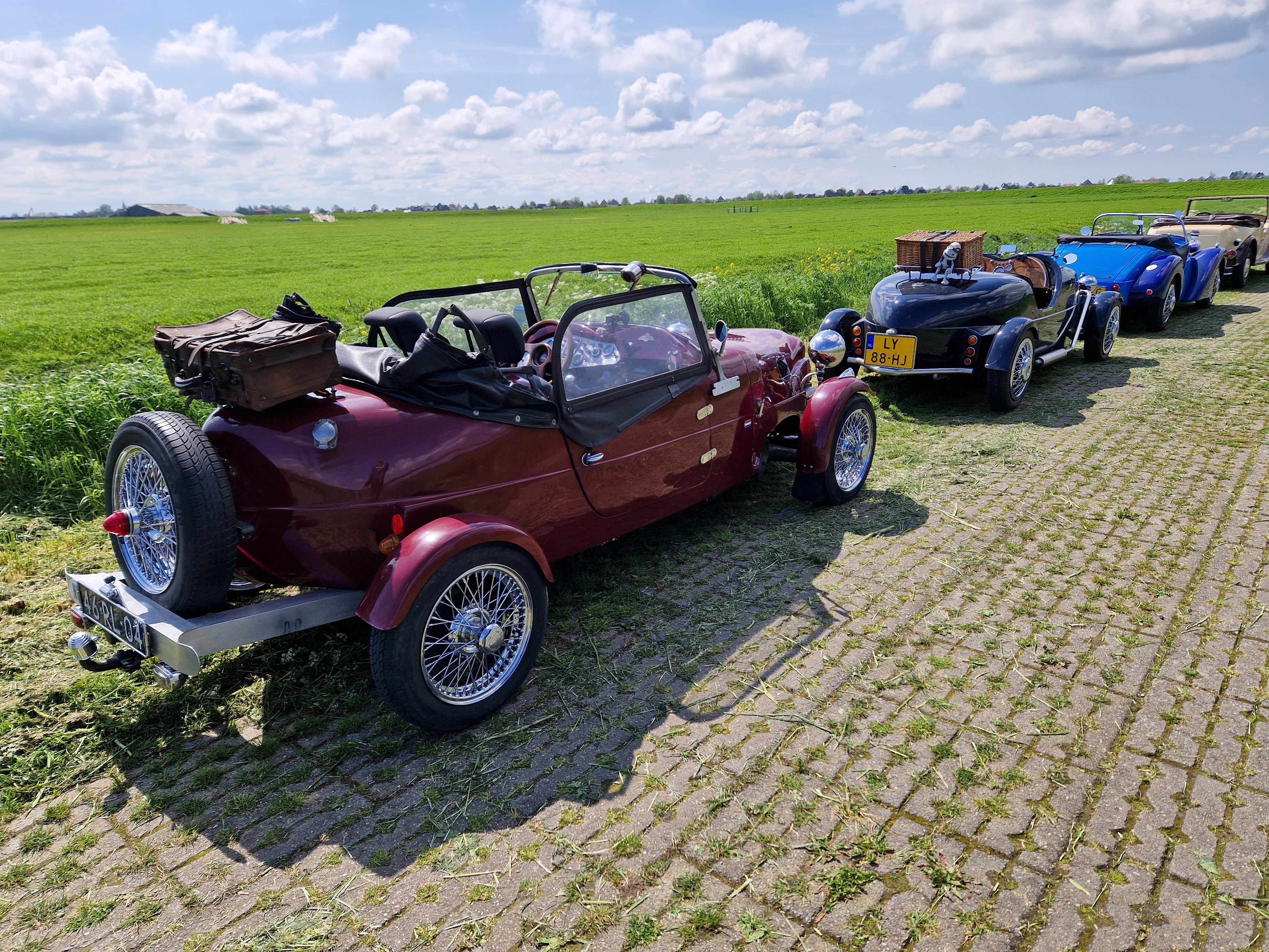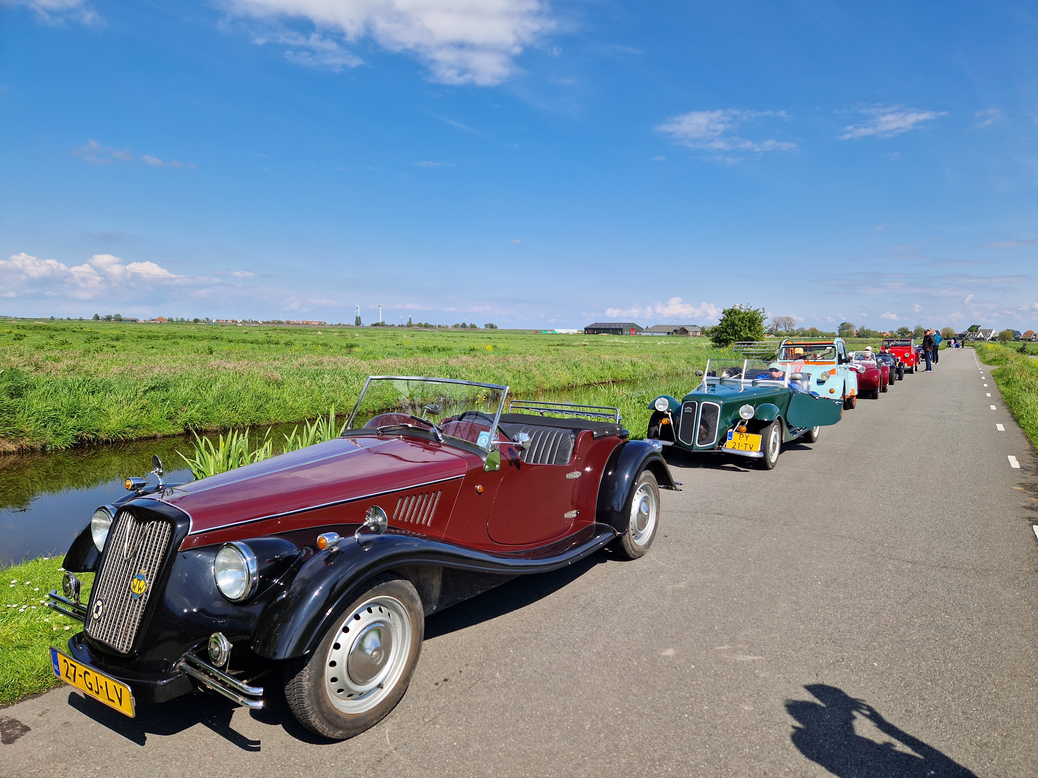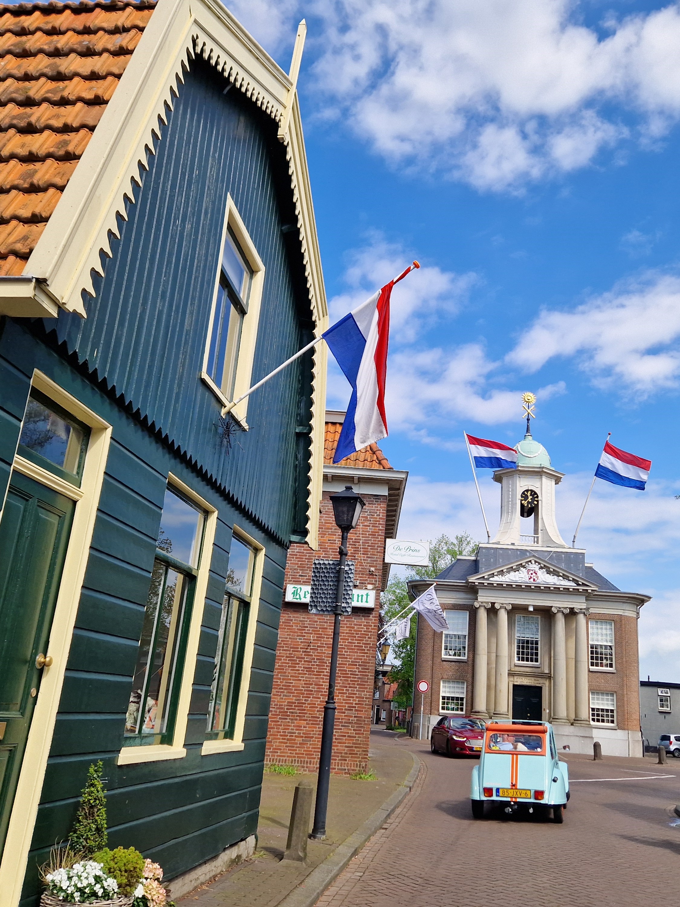 Daar gaan we! Langs de Zaans-groene huisjes en ’t Reght Huys van Westzaan. Het is 5 mei, overal hangt de vlag uit, overal stoppen mensen om onze optocht te filmen of te fotograferen. Kinderen zwaaien, wij toeteren terug. Het is tenslotte feest. Het moet ook een grappig gezicht en gehoor zijn, al die autootjes op basis van een 2CV, al die ronkende eendenmotortjes. Ze horen ons van verre aankomen.