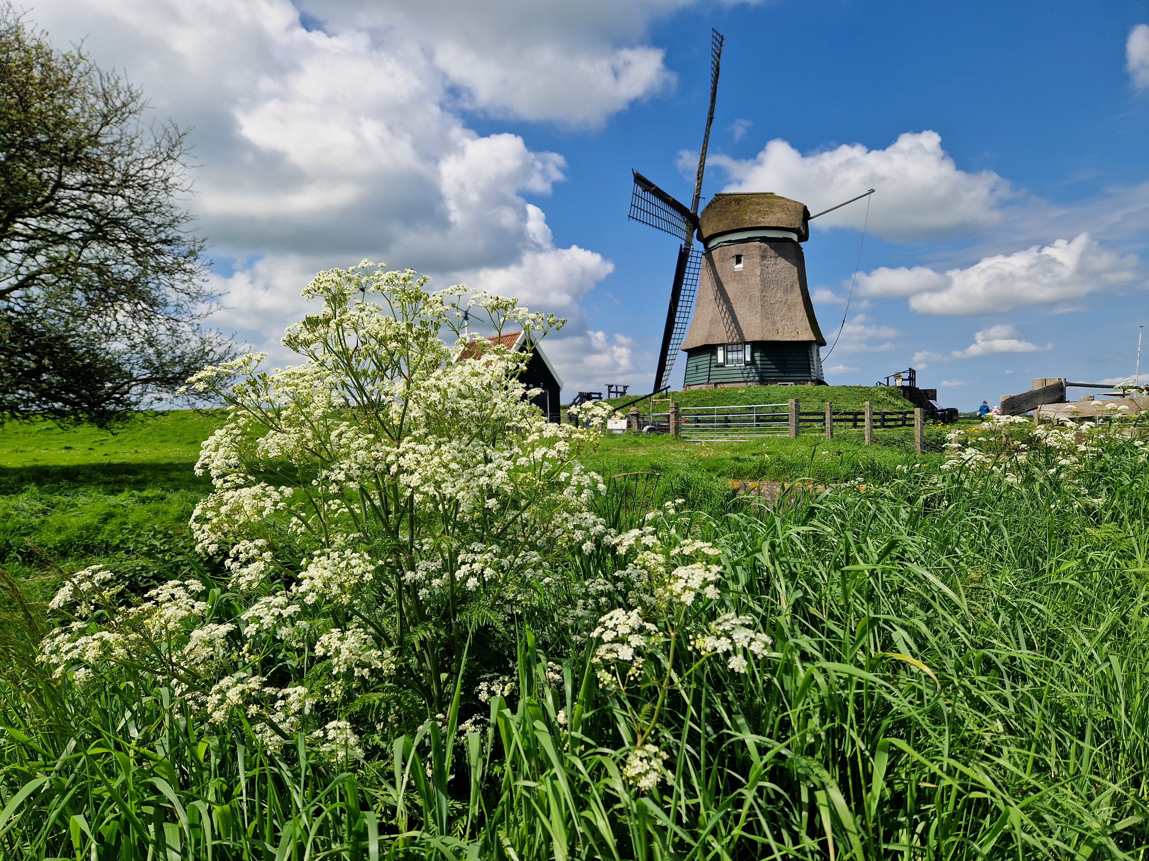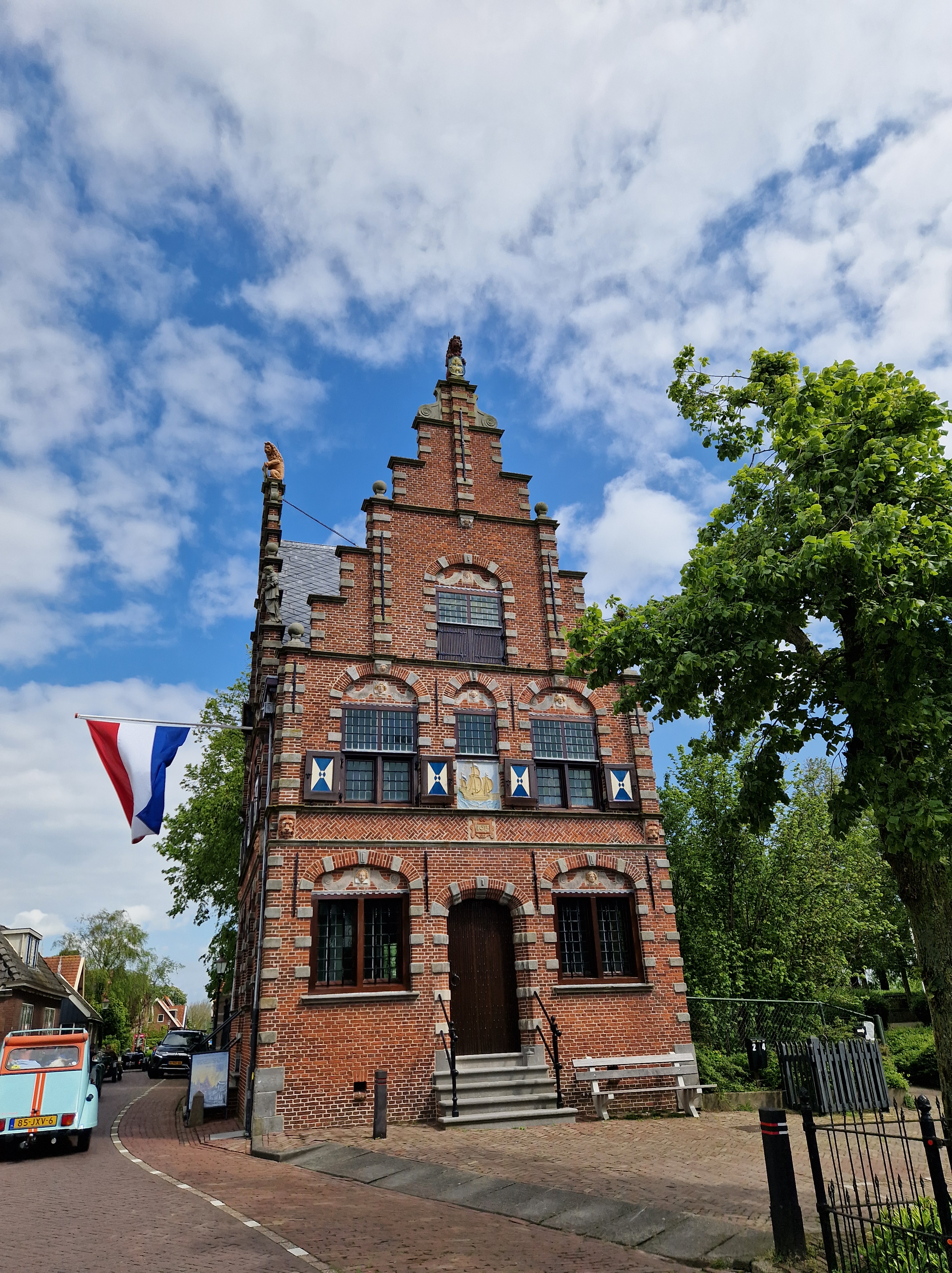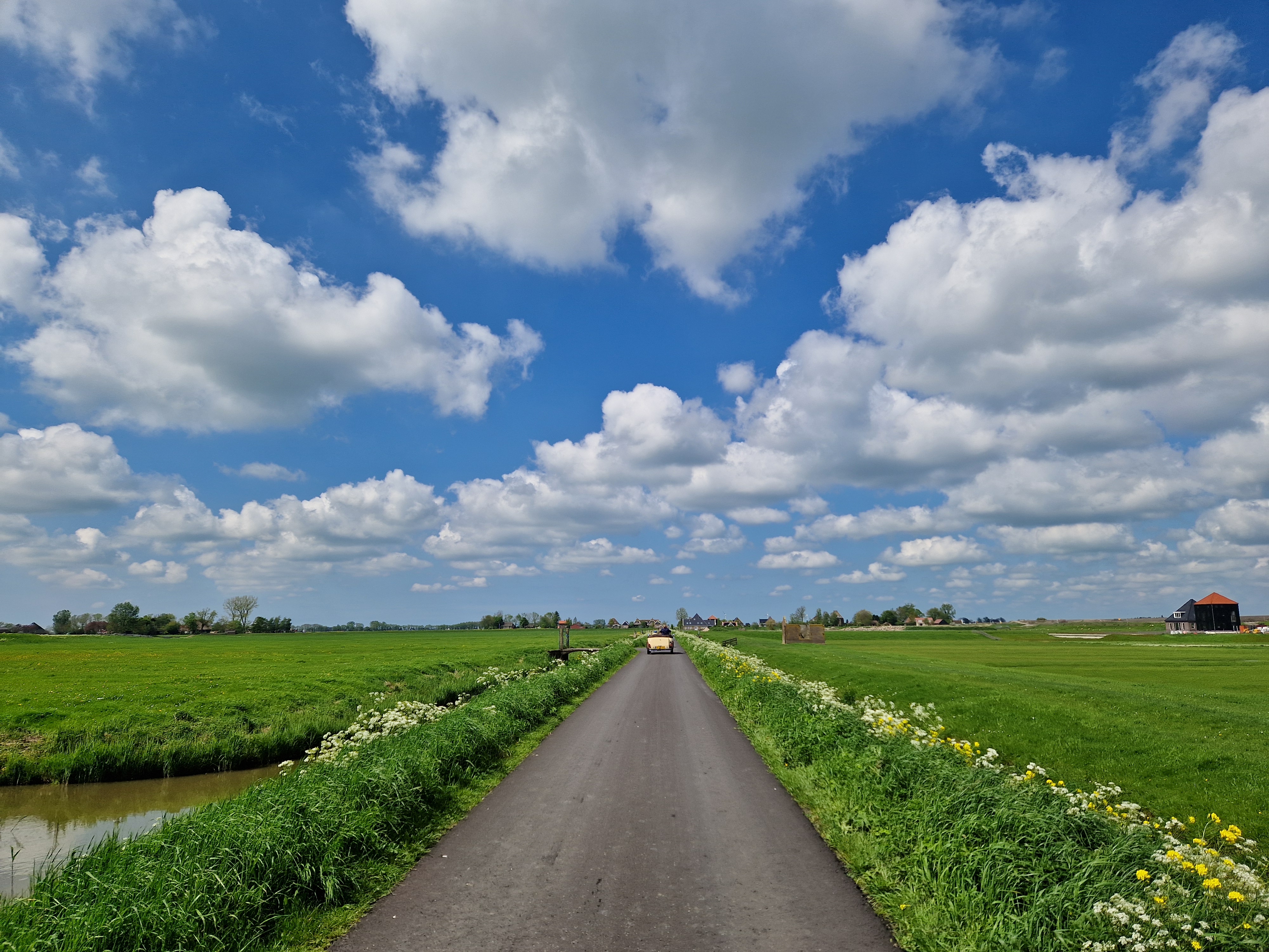 We passeren het Raadhuisje van Graft. Daarna over de Glob-, Meer-, Molen- Schermer-, Drechterlandse-, Huigen- en Oostdijk. Misschien ben ik er een paar vergeten, de Schermer bestaat tenslotte grotendeels uit dijken. Wij zitten op bekend terrein, de zuiderlingen onder ons in hun open karretjes zullen de harde wind, die voor ons heel gewoon is, wel vervloeken.