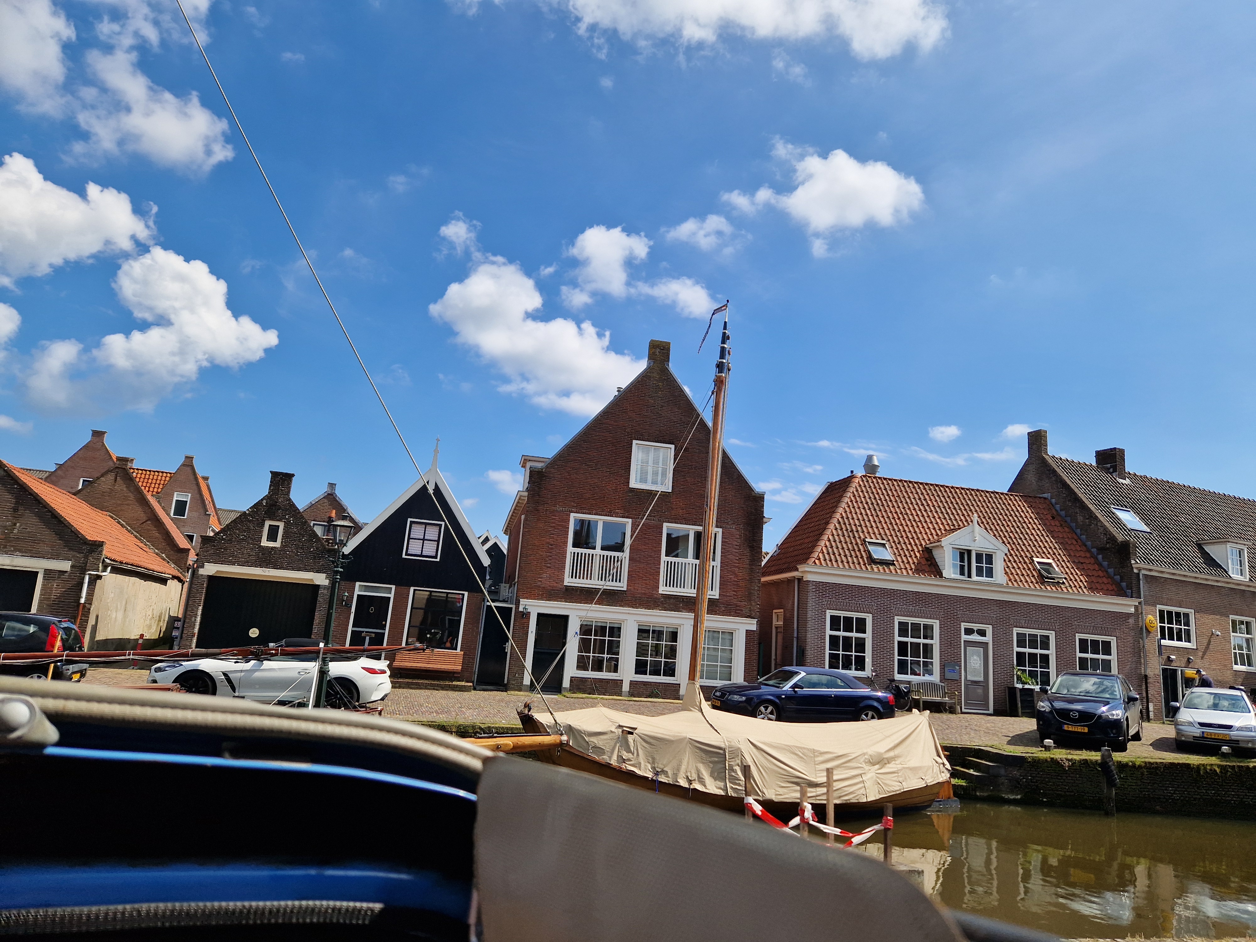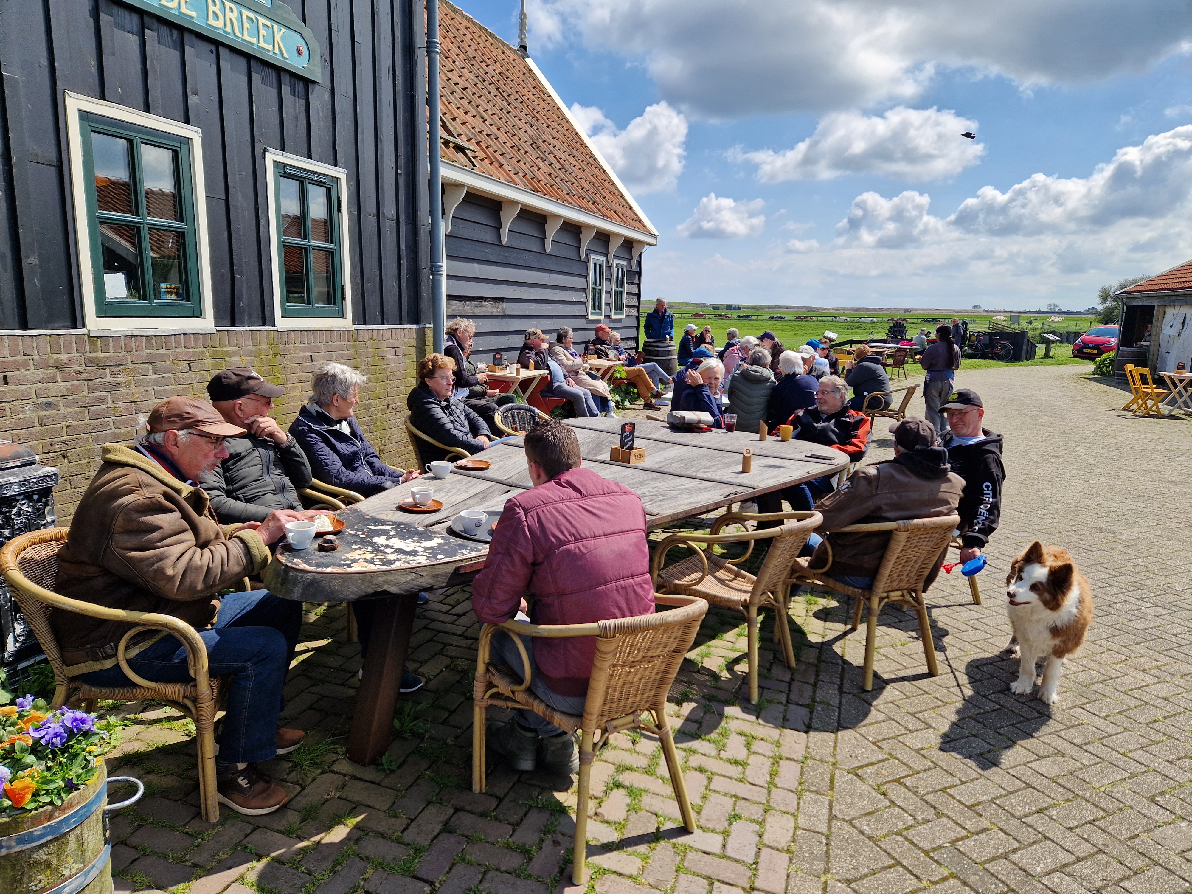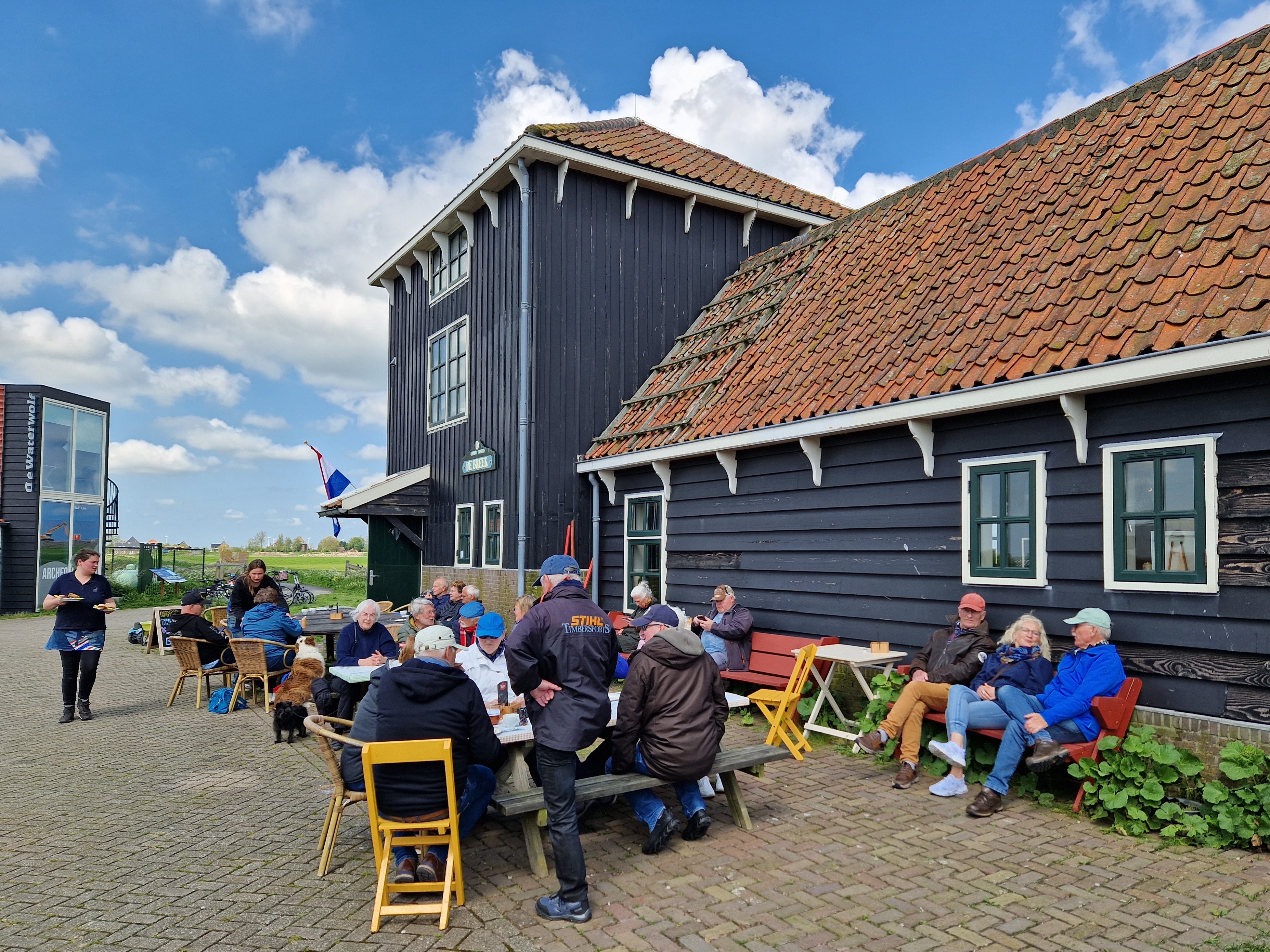Na de koffie, de praatjes en de nodige foto’s husselt de file een beetje en gaan we weer van start. Fort Edam is nummer (5). Dwars langs de haven van Monnickendam (6), zwaaiend naar de terrasjesmensen. En als er iemand pech heeft, staat de hele groep stil in de verzopen bermen van Waterland.