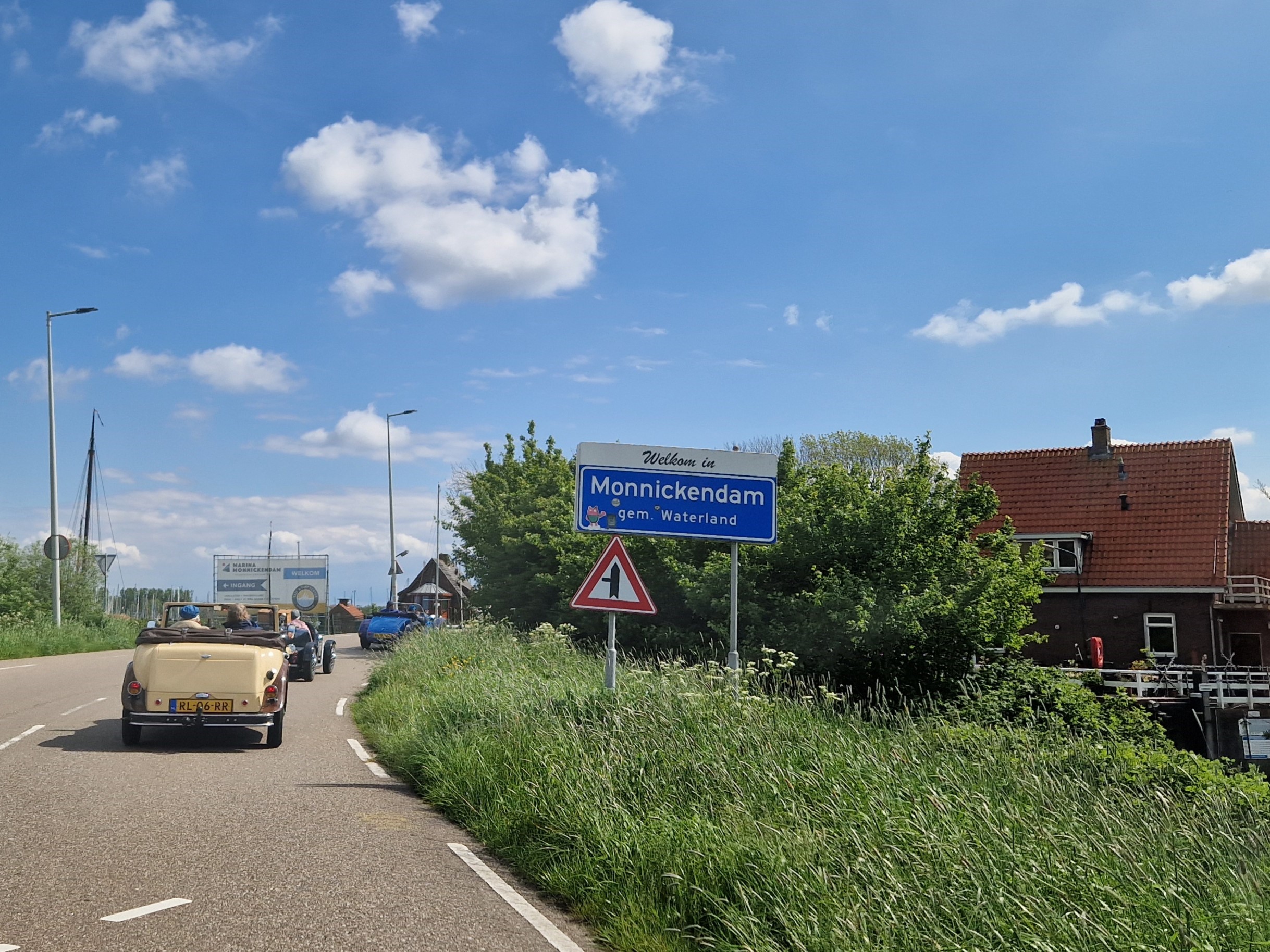 Langs de watertoren en de Forbofabriek, Westknollendam (2) en Fort Marken-Binnen. De groep valt door de rotondes en stoplichten wat uiteen zodat op de Zuiddijk halt wordt gehouden om de rij weer compleet te krijgen. Een tegemoet komende club antieke brommers, Kreidlers, Zundapps, Puchs walmt evenzo vrolijk met de duimpjes omhoog langs.