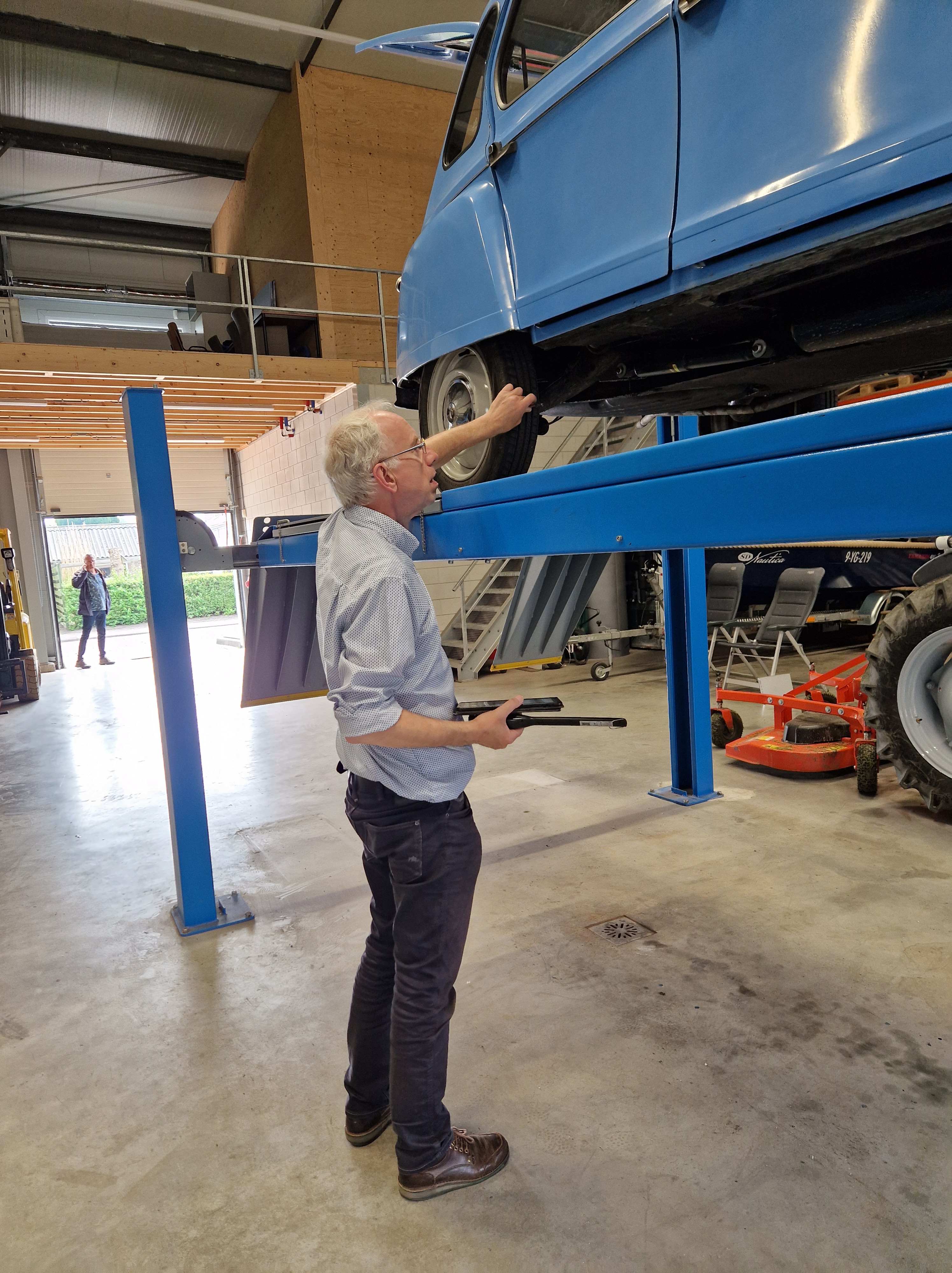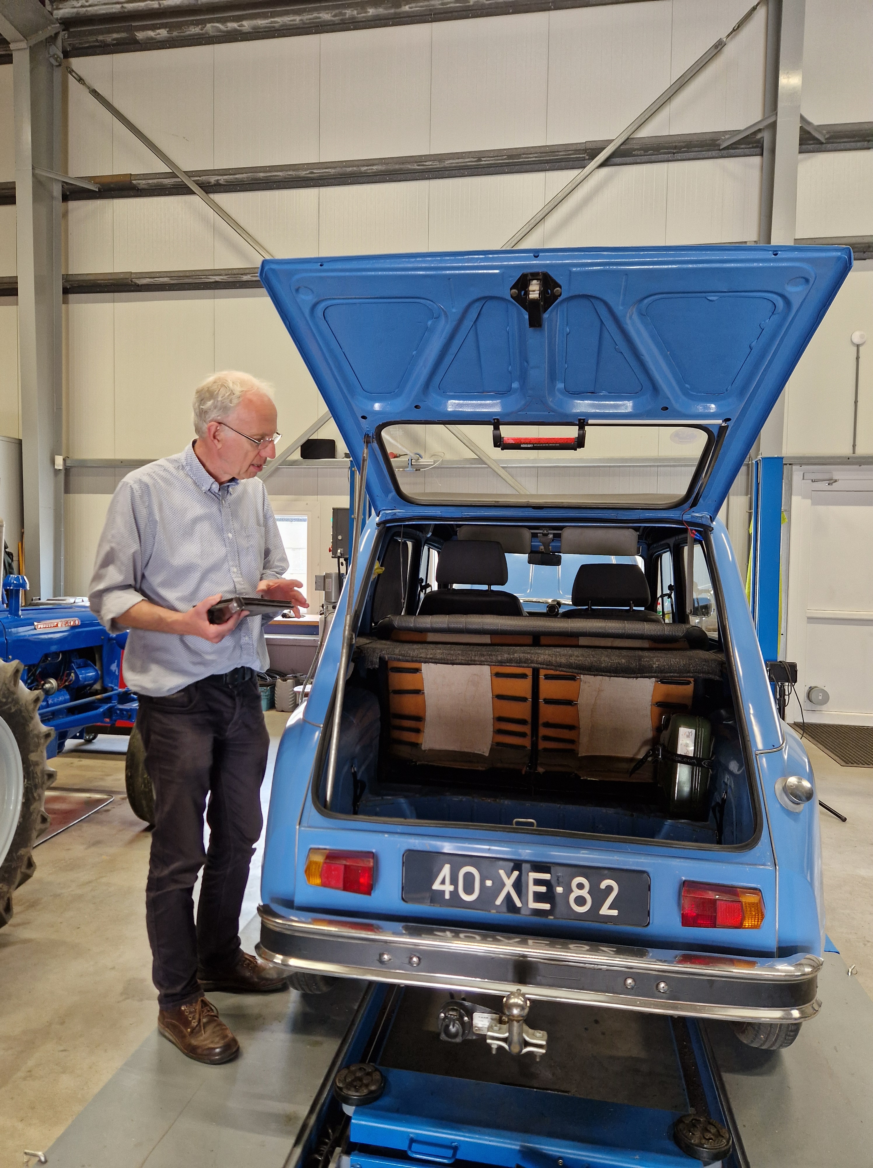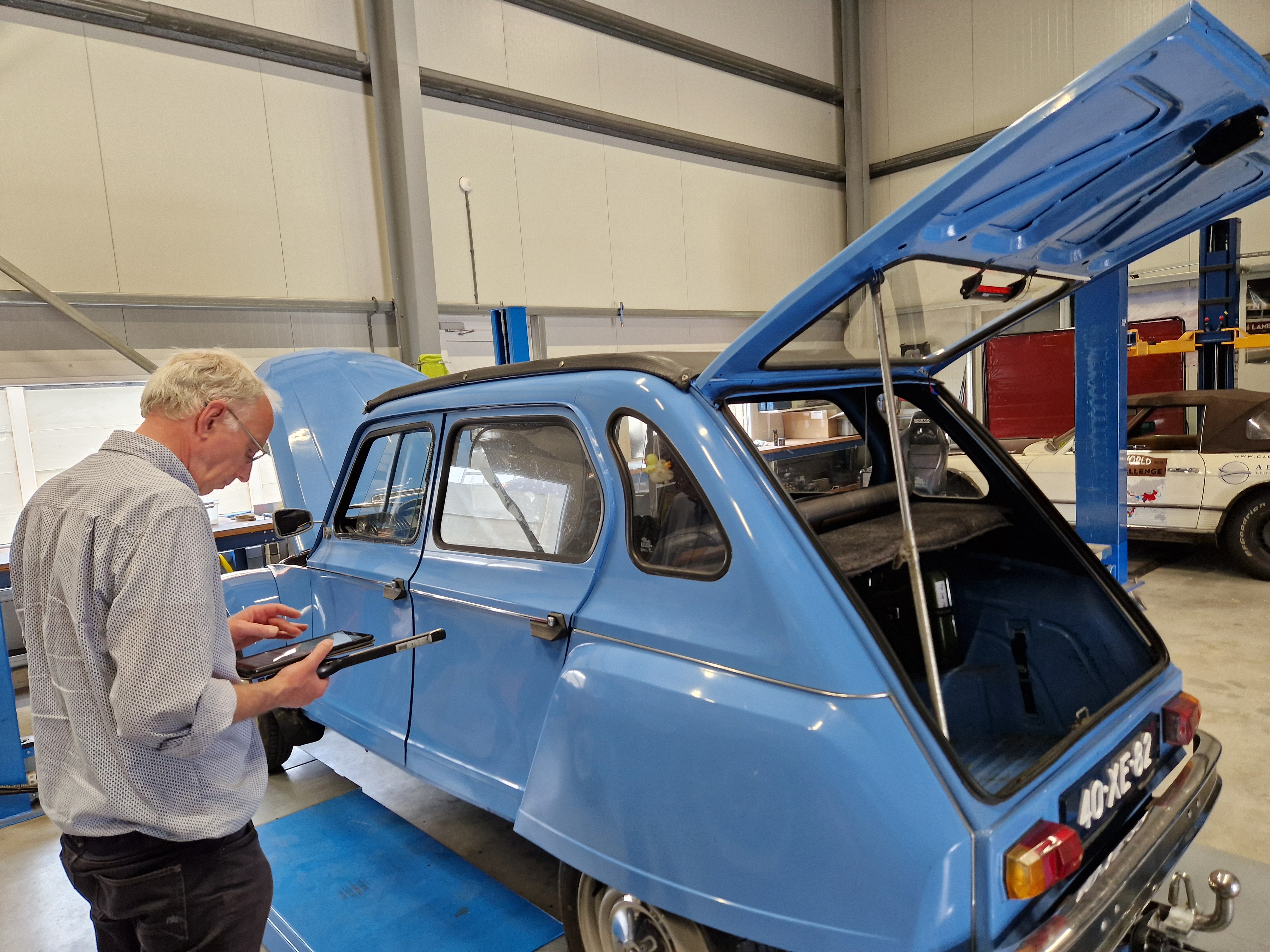 Vandaag is het zover. De rode eend met karakteristiek geel dak van Bertus, medeclublid uit het dorp, staat al te trappelen. Alle details worden bekeken en onder de loep gelegd. De 5e deur, vergrote achterklep, is een aanwinst. Dan mag de brug omhoog. Met een lampje wordt de onderkant geïnspecteerd, met een tooltje wordt het profiel van de banden gemeten. Secuur worden alle gegevens ingeklopt op de tablet.