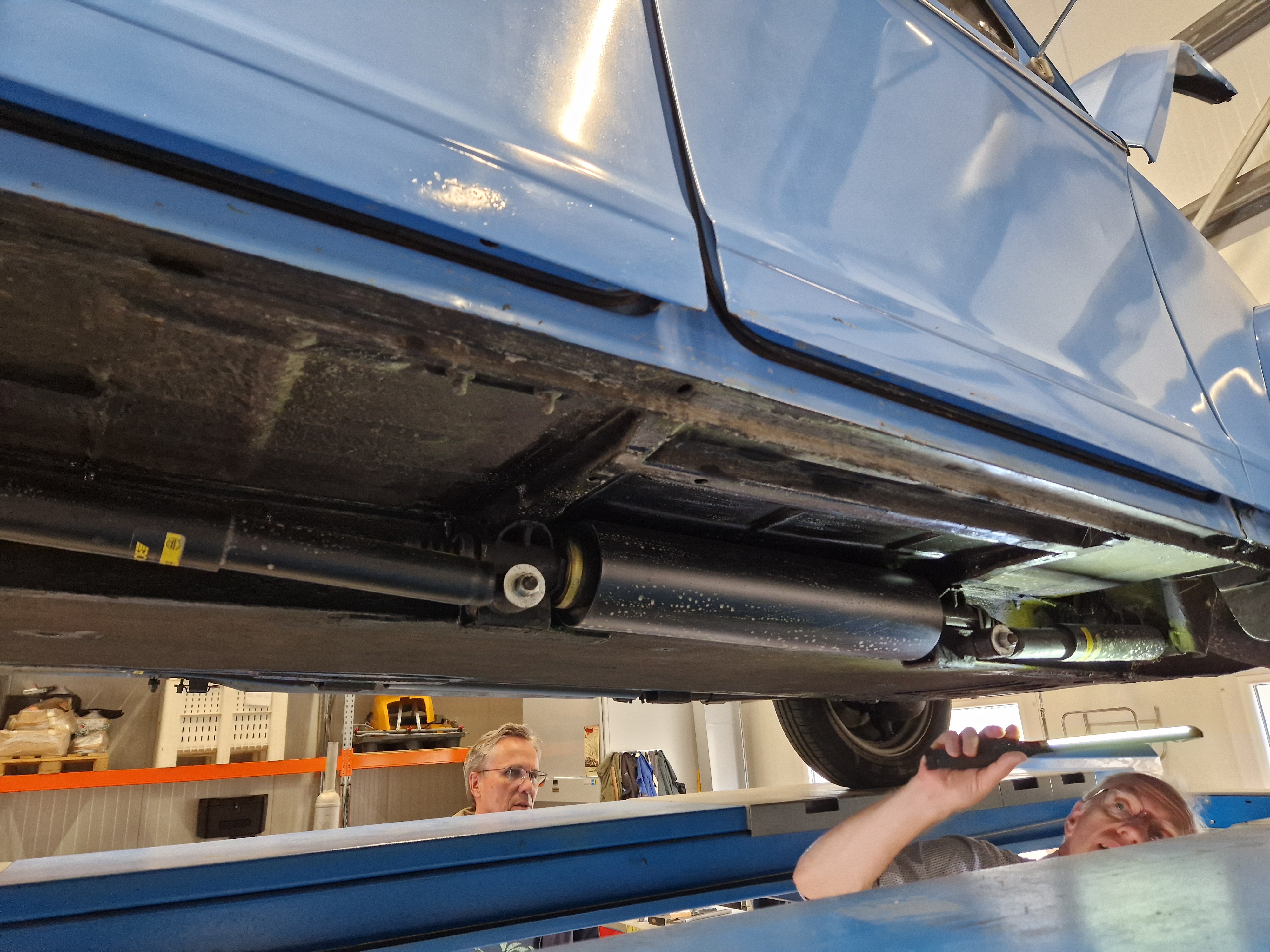 Als de brug weer gedaald is en Dyaantje eraf gerold mag onze Snoek de troon betreden. Dat is wel een ander karretje, maar de procedure is niet heel anders. Lampie hier, prikken daar, koekeloeren onder de nieuwe 5 cm dikke vloerbedekking hoe de bodemplaat eruit ziet. Als de brug omhoog staat, worden er onder de bodem een paar rabberige plekken ontdekt die enige aandacht behoeven. Bij een spatbord ontbreekt een bout. Oeps. Het valt allemaal op te lossen.
