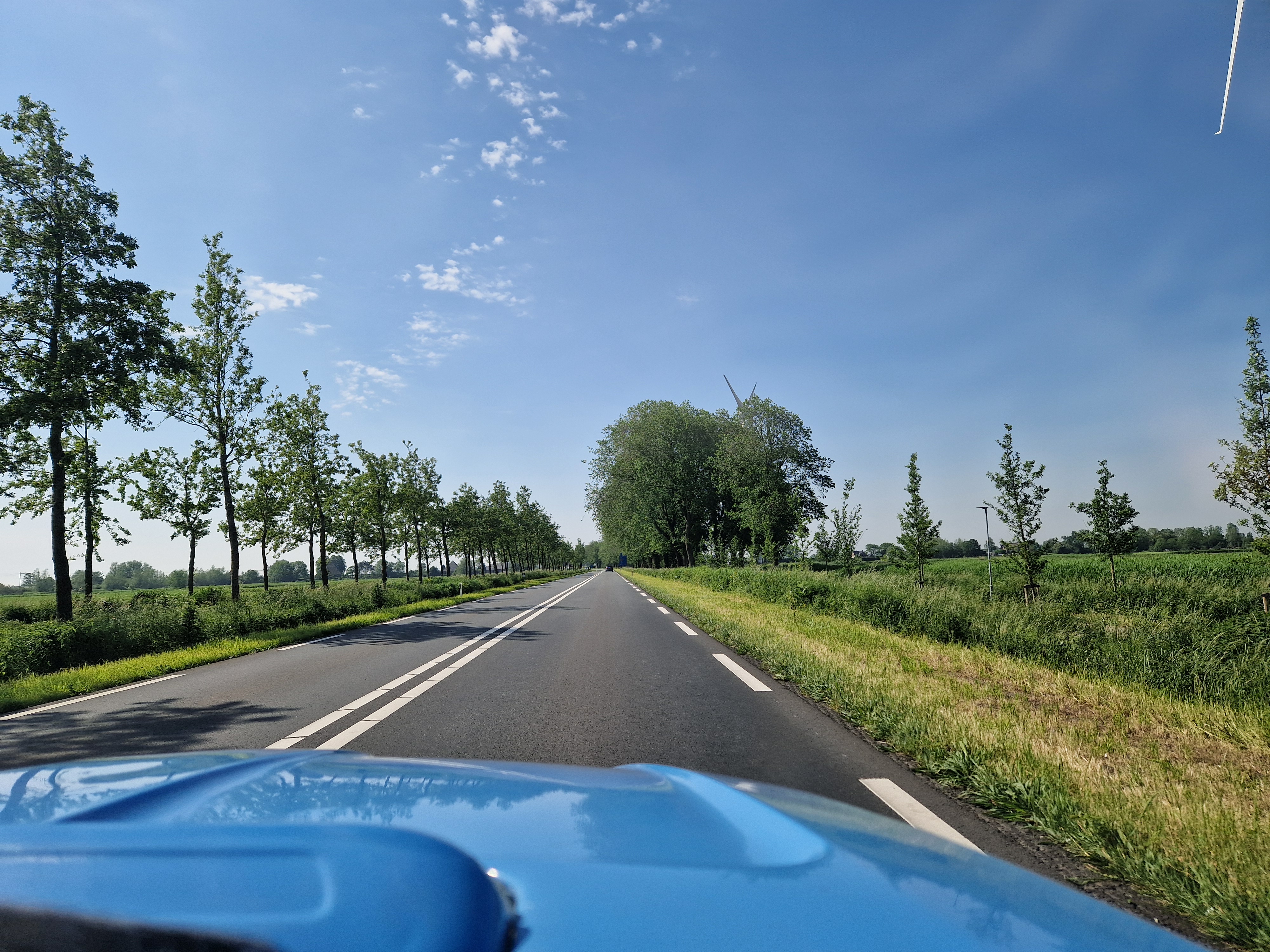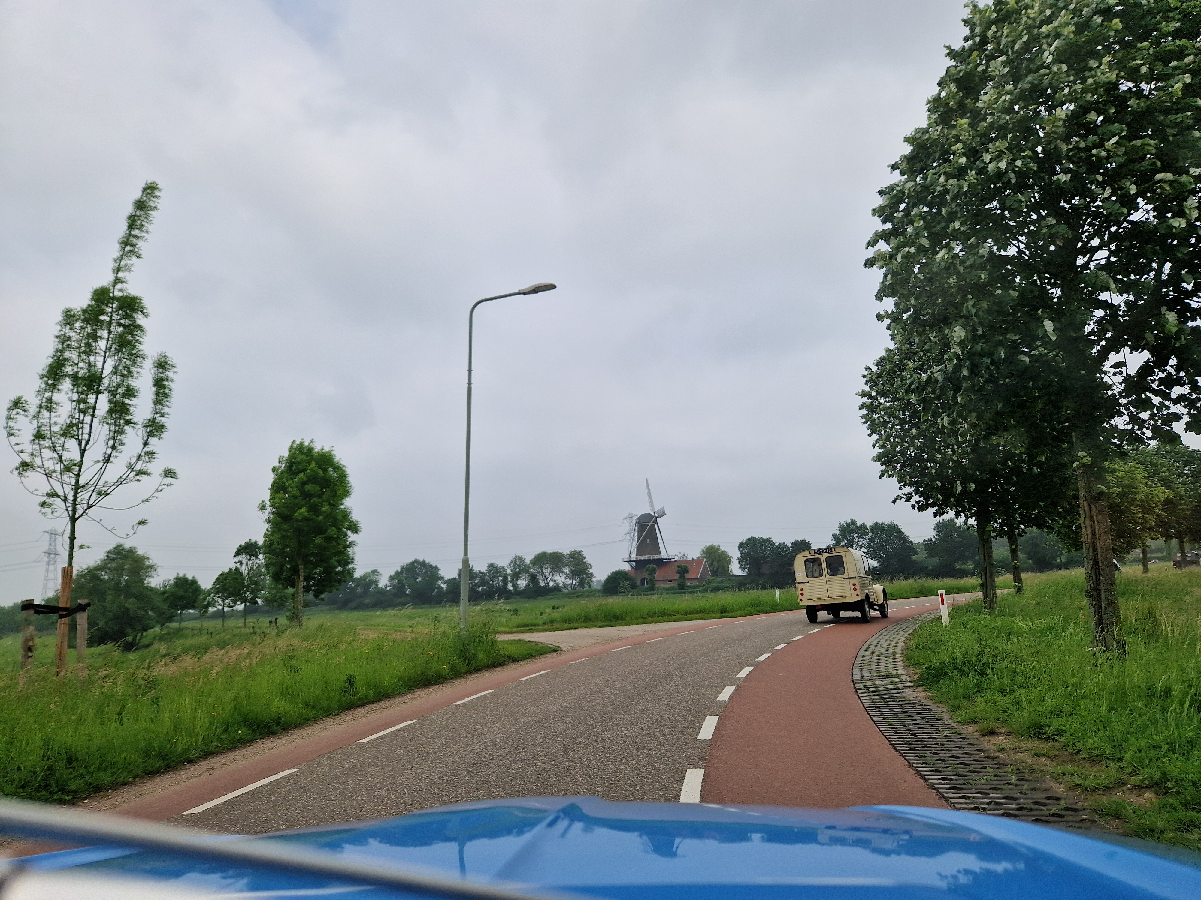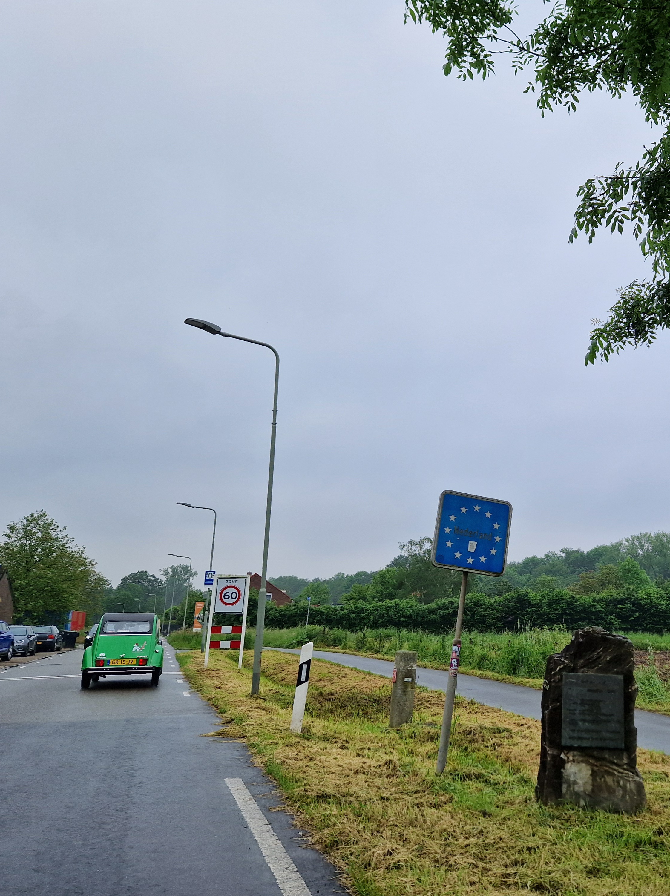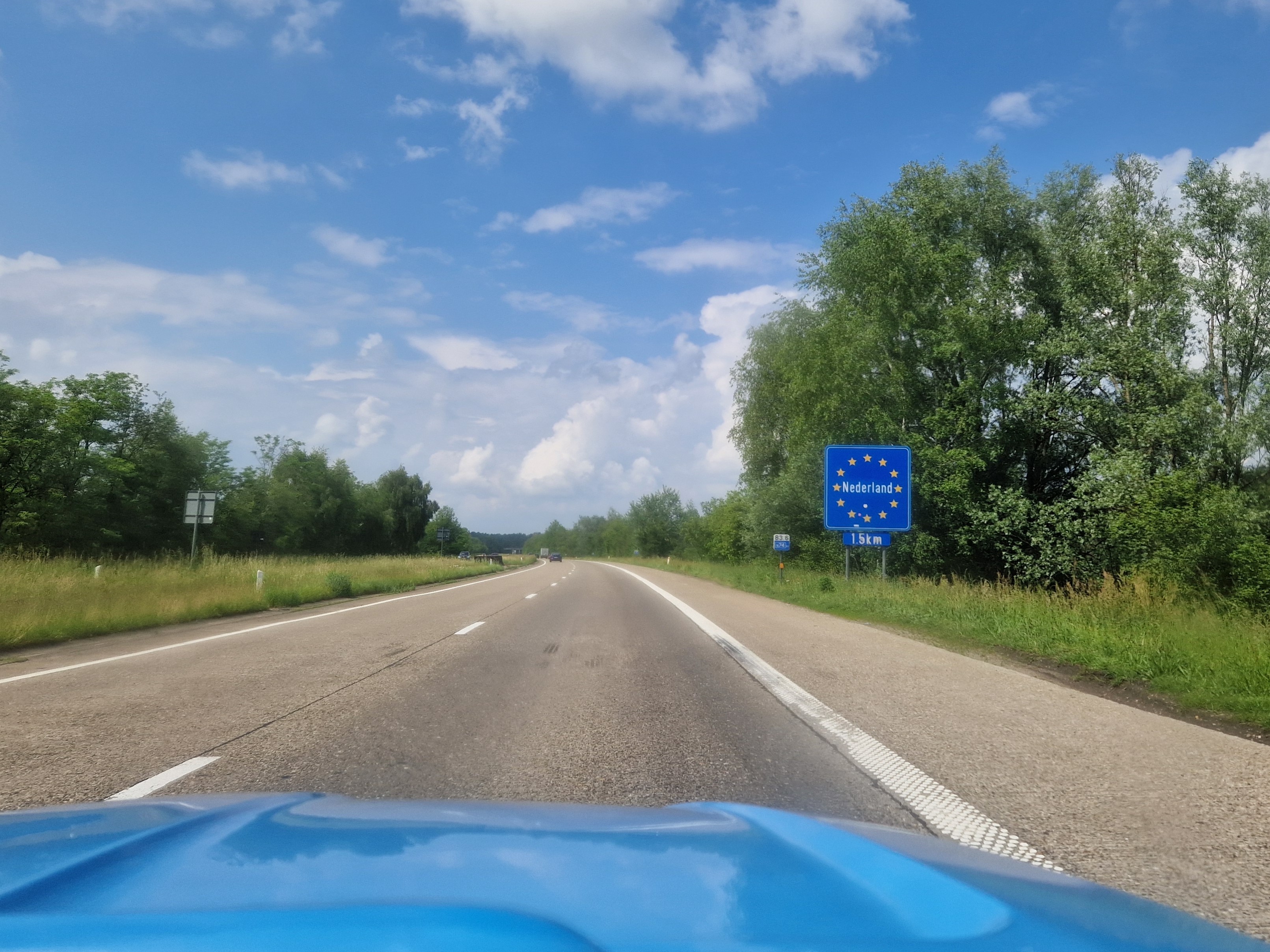 Na een onvrijwillige dieseldouche door een BMW die bij het optrekken zijn brandstof recht in ons gezicht niest (we volgen zijn spoor al vele kilometers en evenzovele stoplichten lang) bereiken we Nederland. Het dieselspoor zit steevast voor ons. Verder. Steeds verder. Pas bij Veldhoven lijkt het spoor op te drogen en kijk, daar staat Petje-met-Peuk(!) op de vluchtstrook van een viaduct. We toeteren hem, met enig leedvermaak, goeiedag. Nog 200 km te gaan…