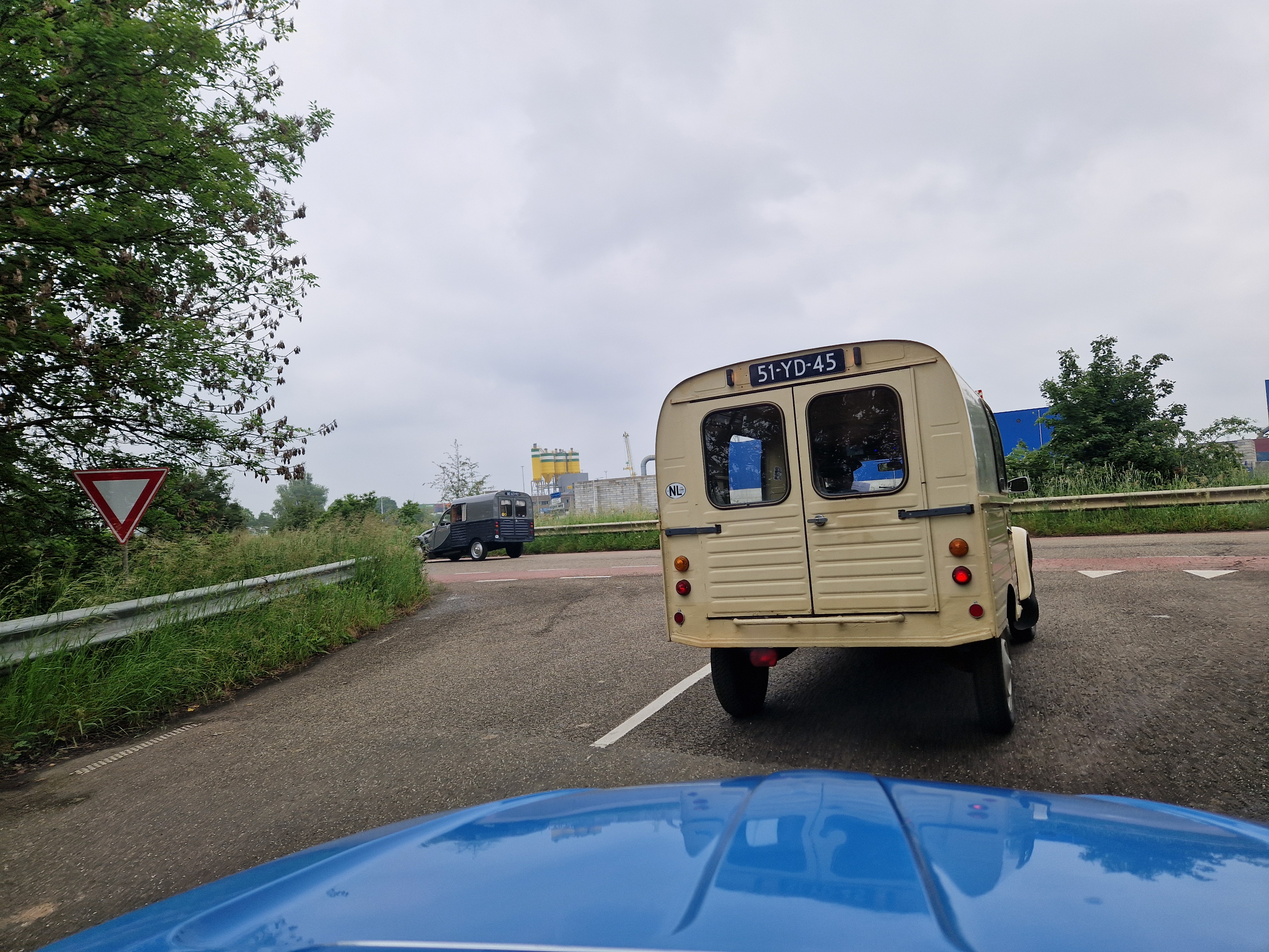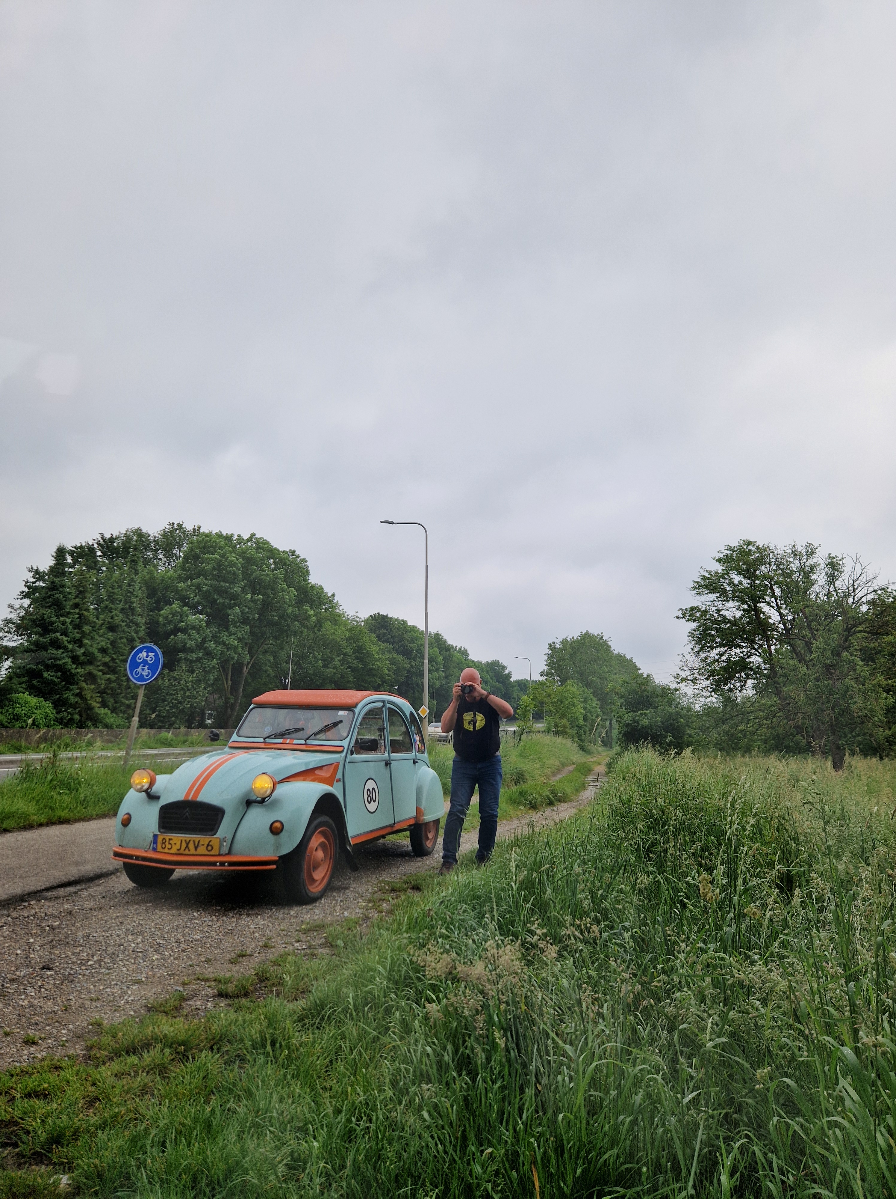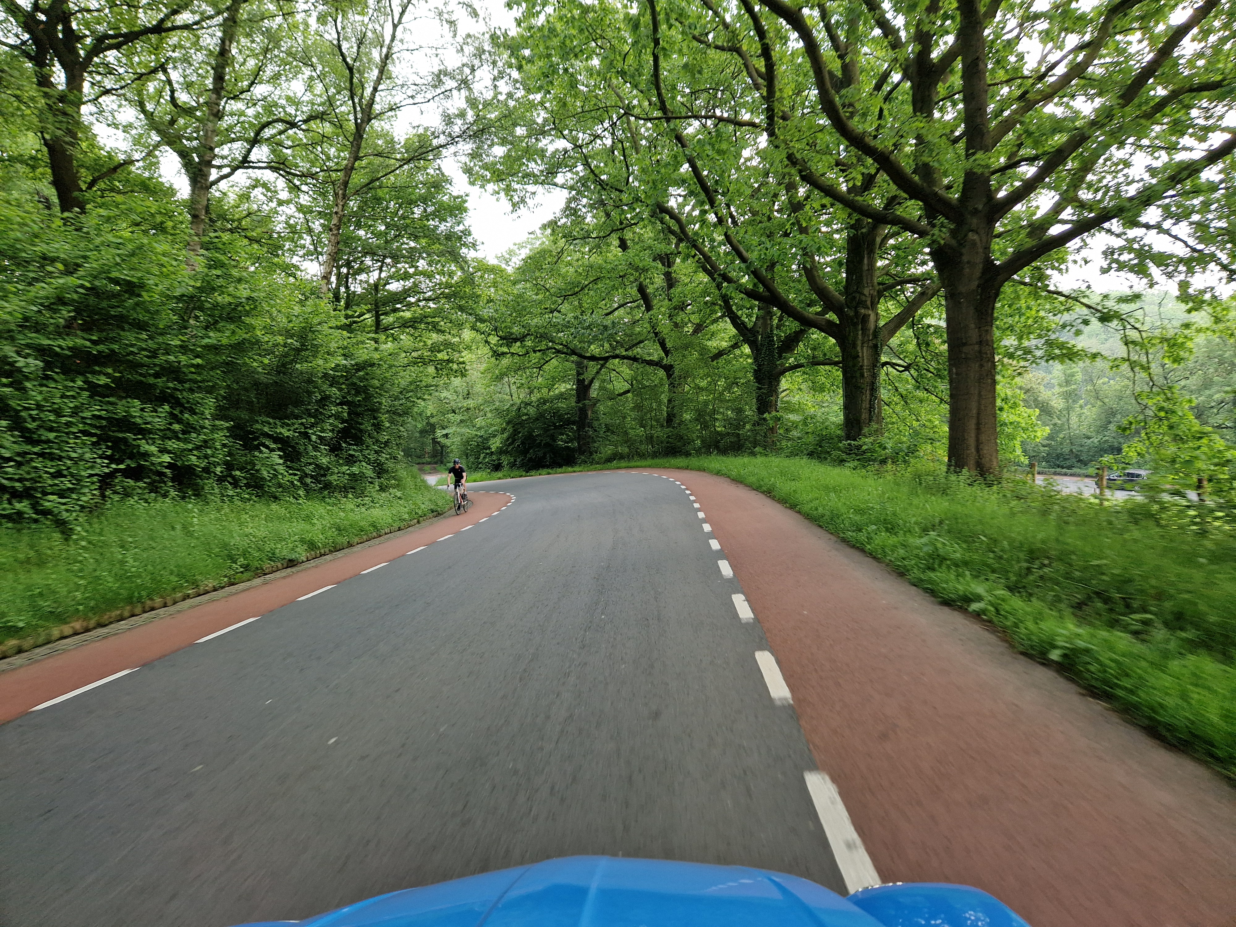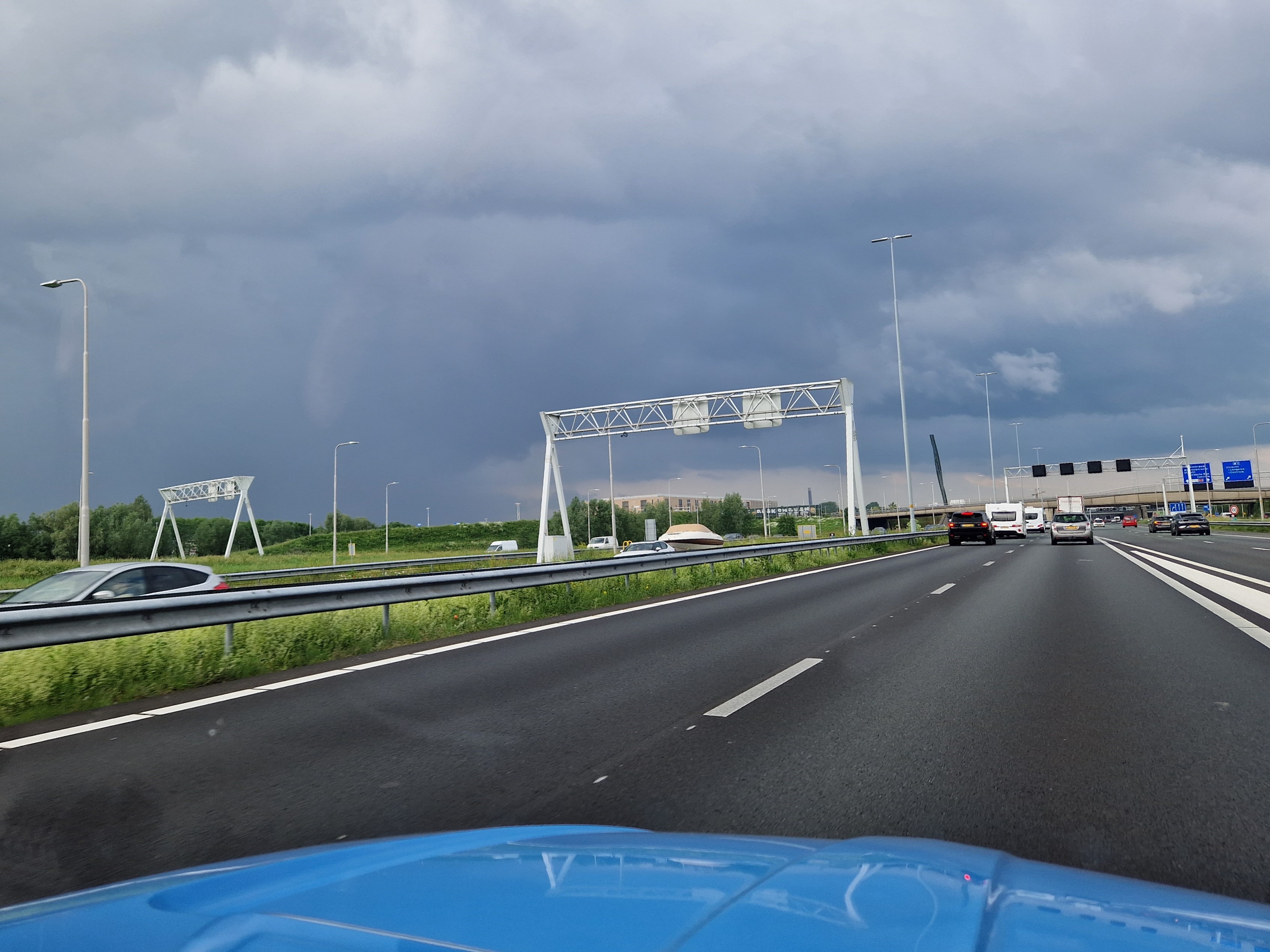 Na een onvrijwillige dieseldouche door een BMW die bij het optrekken zijn brandstof recht in ons gezicht niest (we volgen zijn spoor al vele kilometers en evenzovele stoplichten lang) bereiken we Nederland. Het dieselspoor zit steevast voor ons. Verder. Steeds verder. Pas bij Veldhoven lijkt het spoor op te drogen en kijk, daar staat Petje-met-Peuk(!) op de vluchtstrook van een viaduct. We toeteren hem, met enig leedvermaak, goeiedag. Nog 200 km te gaan…