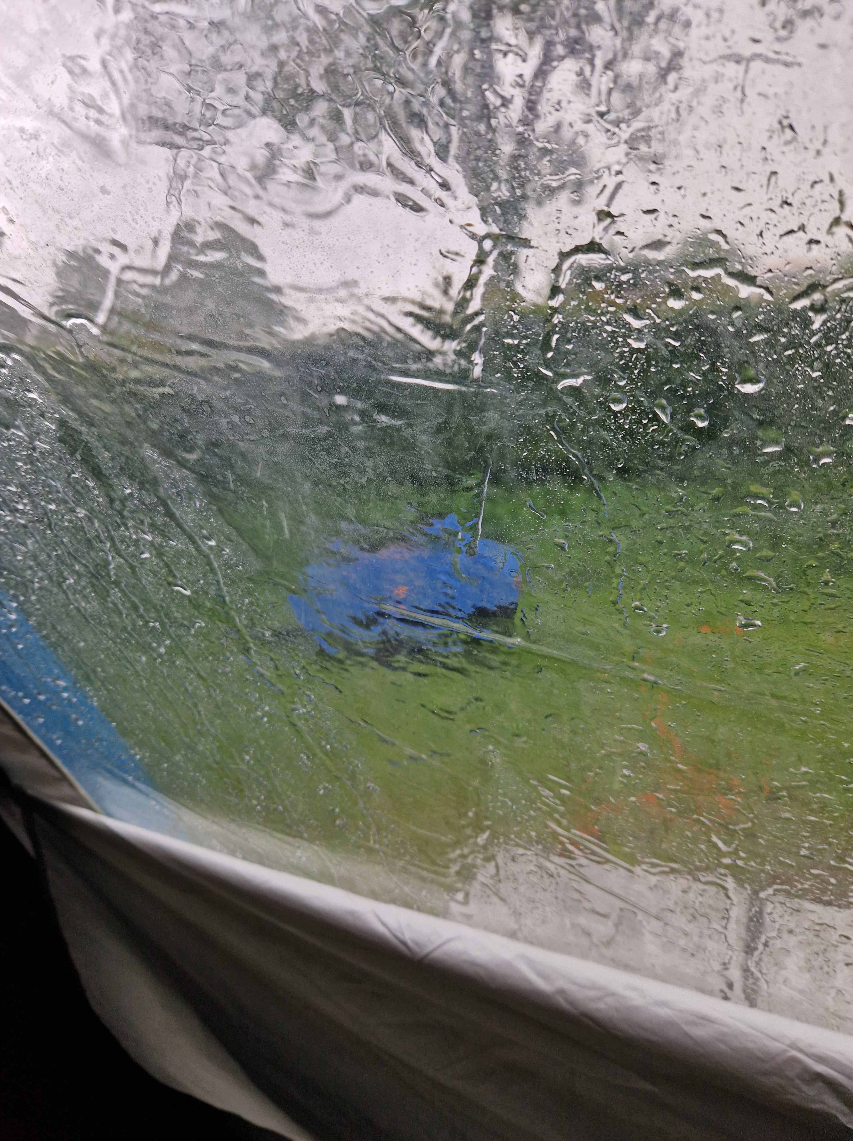 In een half uurtje staat ook onze tent, ingericht en wel. Het begint te rommelen, de spetters stellen niet zoveel voor. Als het tenslotte echt pikdonker wordt, ga ik snel even naar de wc. Te laat… Keurig gepland door buienradar dondert -letterlijk- om kwart voor 5 de hemel naar beneden. Rennend en slippend op de terugweg ben in no time doorweekt. Emmers water worden een klein halfuur lang over de tent leeg gekiept.