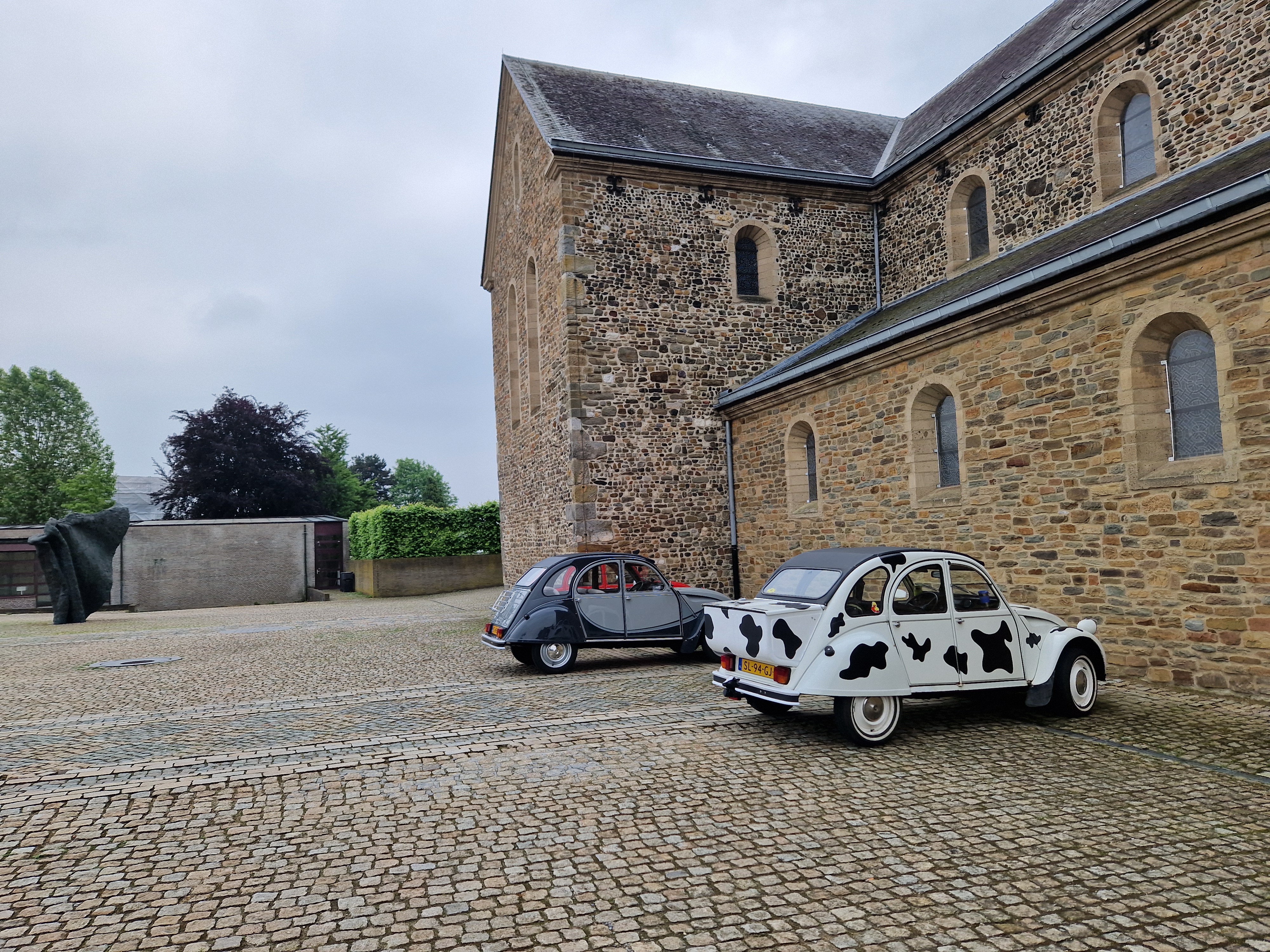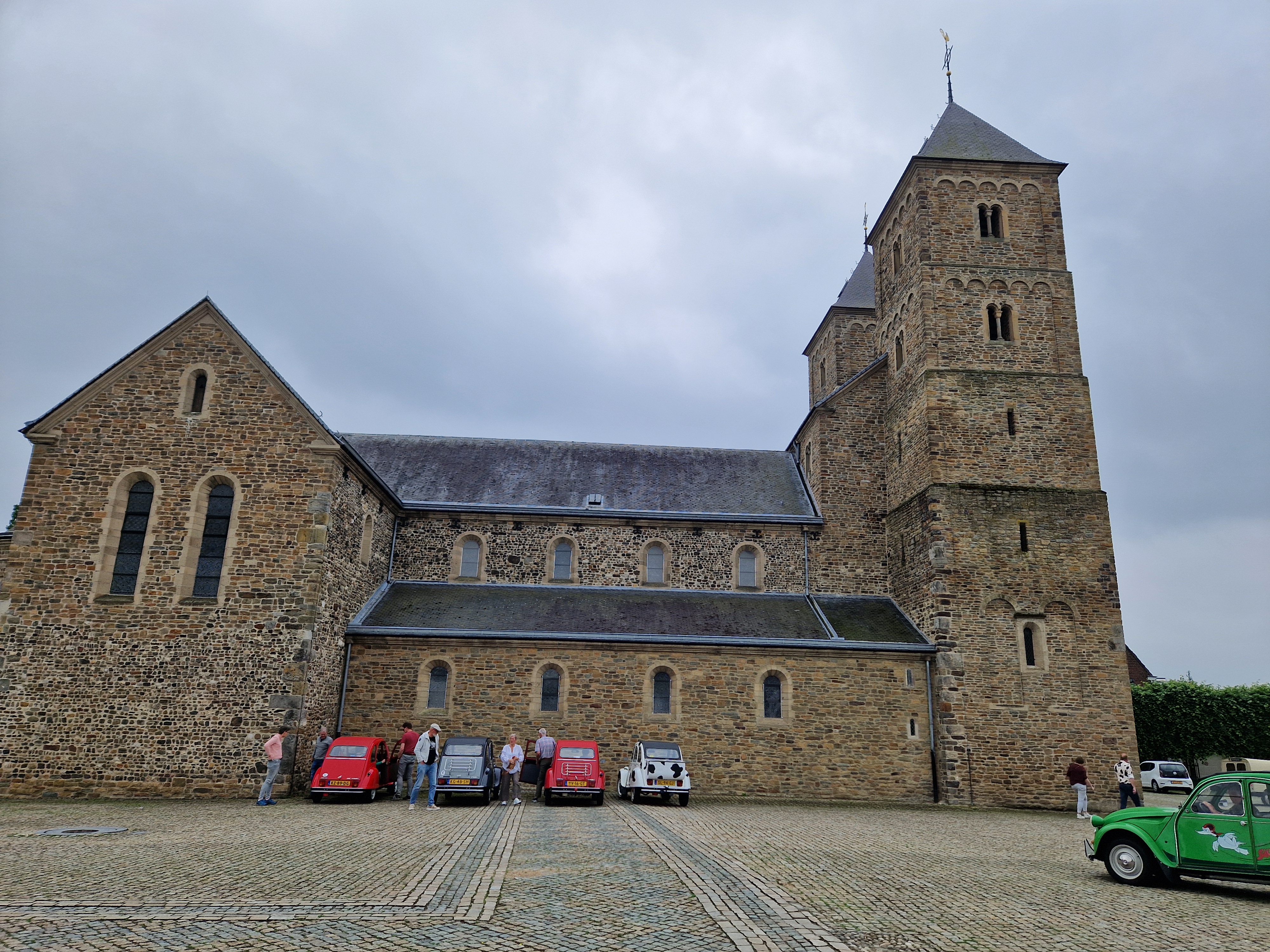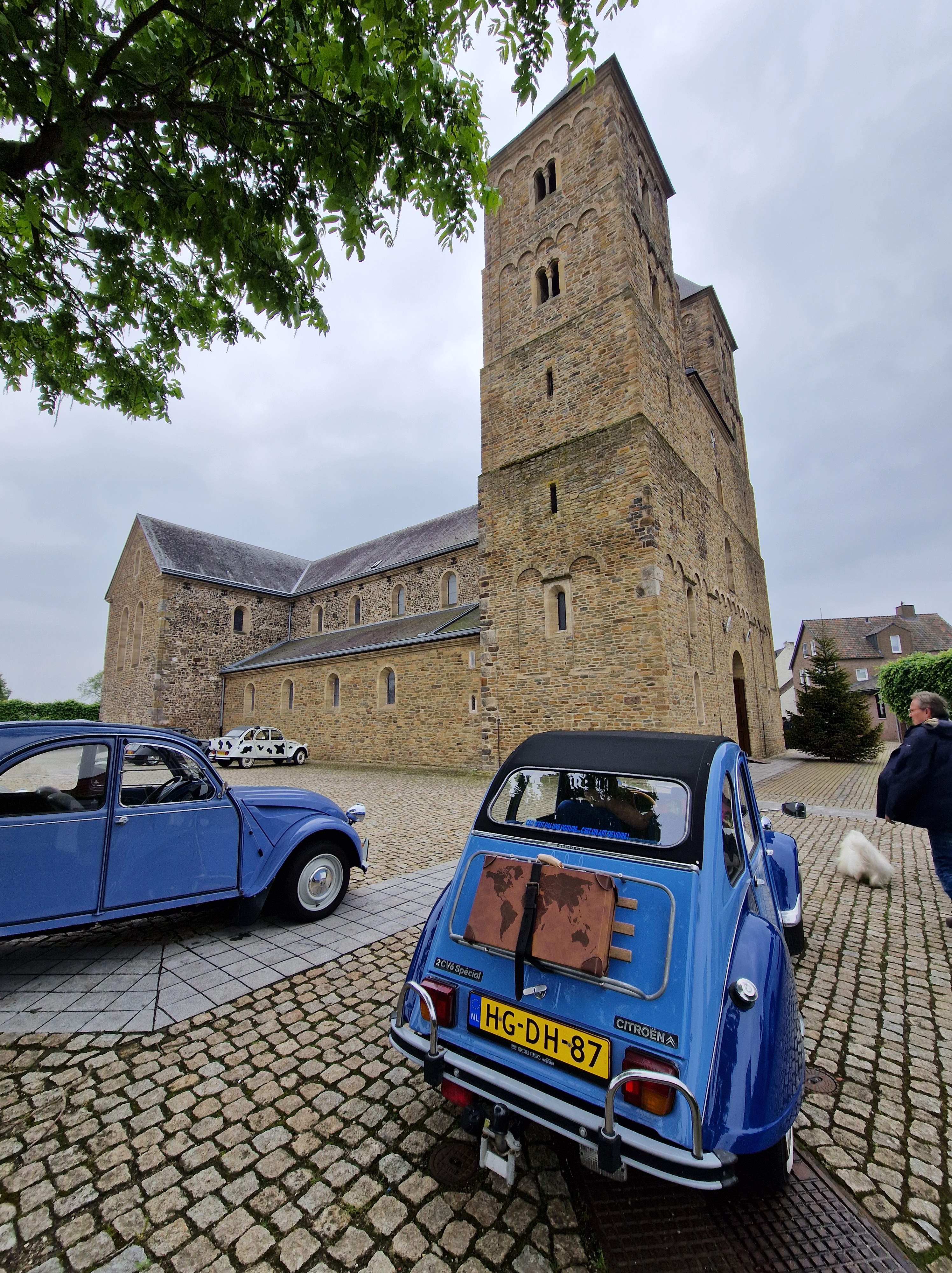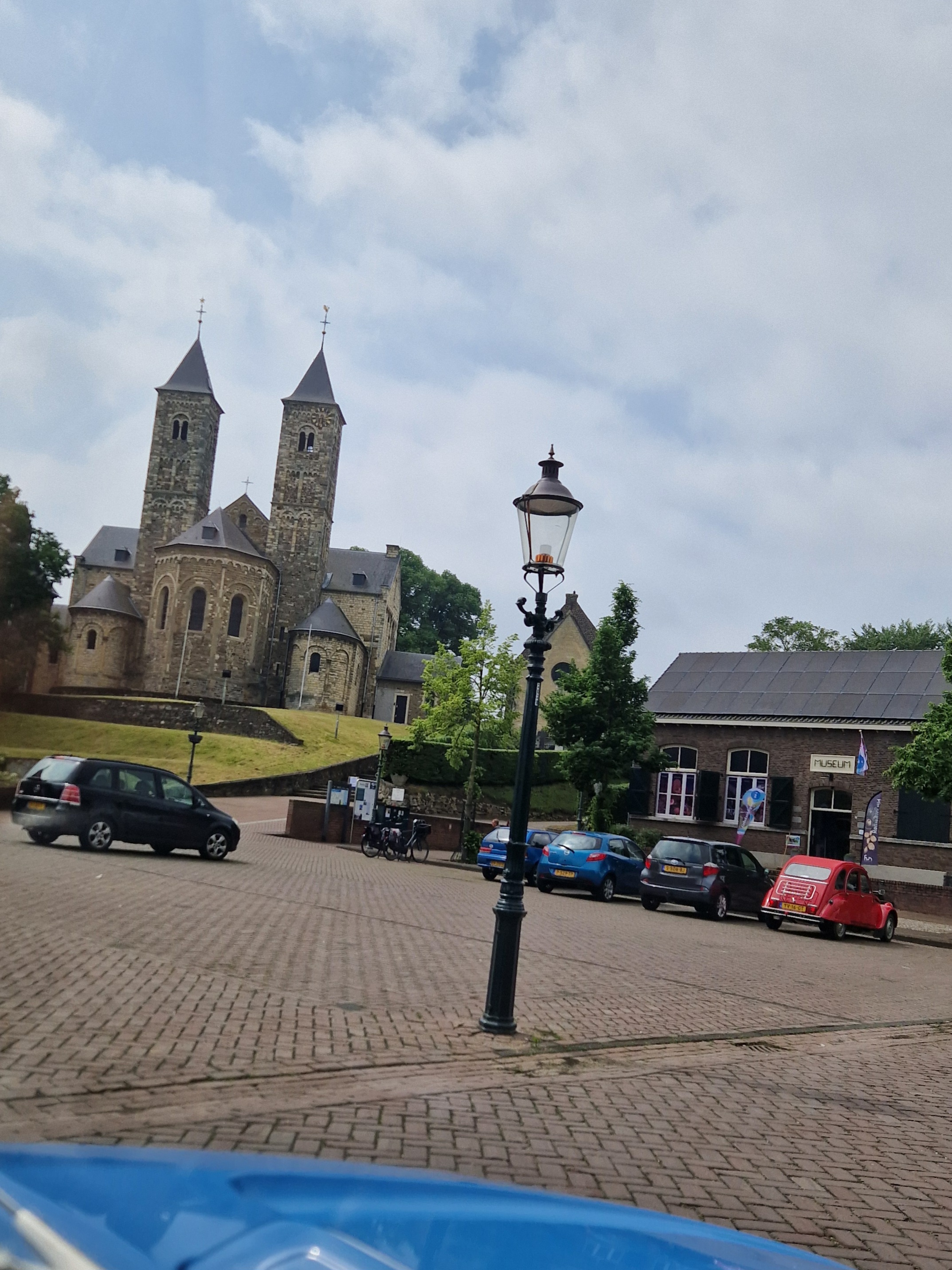 Dan gaan we op pad. In Duitsland stopt een meute eenden om te tanken, wij gaan er niet voor in de rij staan. We rijden van het meest westelijke stukje Duitsland terug naar het smalste deel van Nederland. Nederland op zijn smalst is 4,8 km breed. In Susteren stoppen we bij de Sint Amelbergabasiliek, de oudste basiliek van Nederland, waar je in het voorportaal een kaarsje kunt opsteken. Het is tenslotte Pinksteren. Verder is de kerk gesloten. Het is een aardig plein waar we in alle rust wat eten.