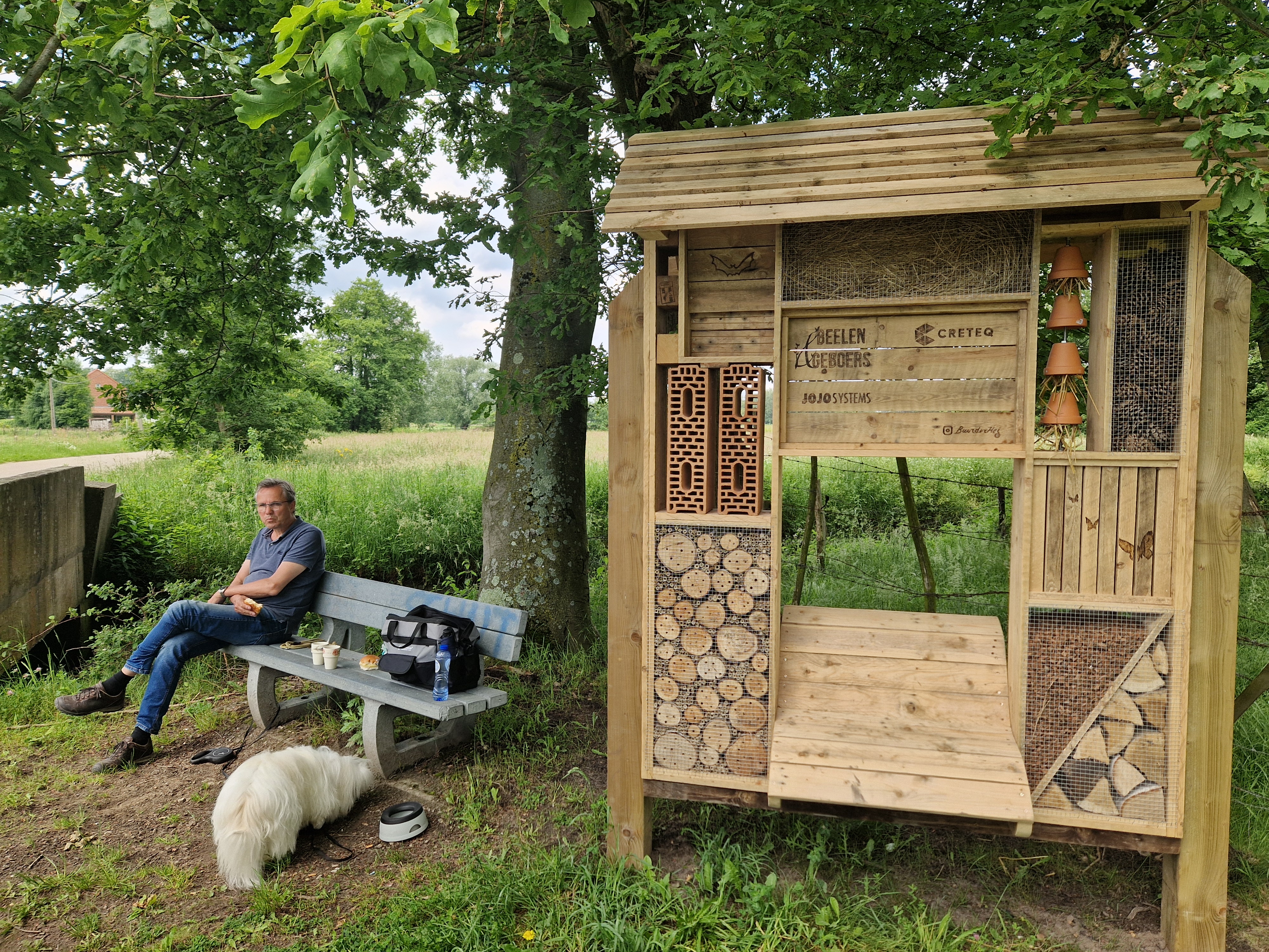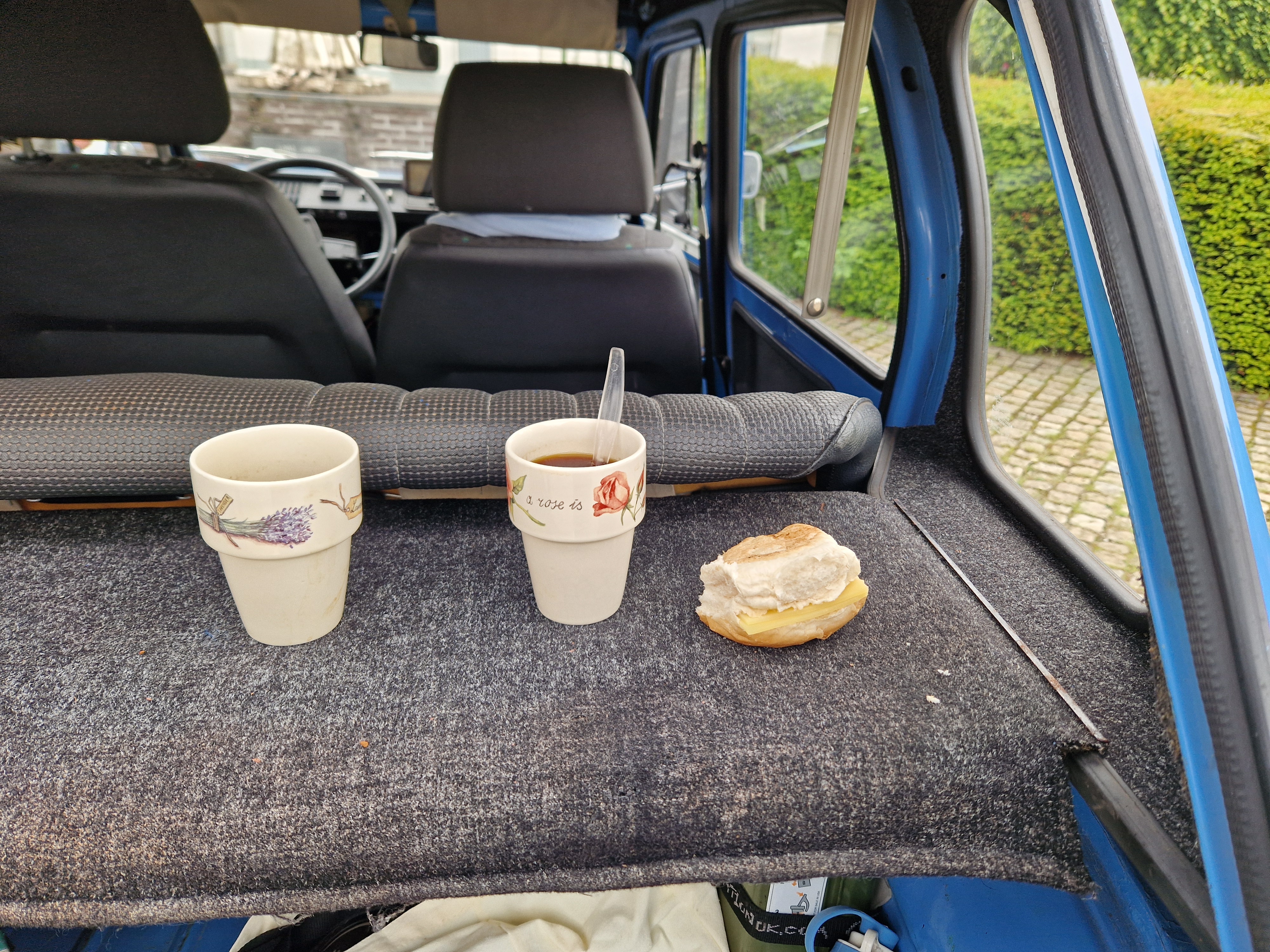 Tom voert ons met een vreemde tour door niet zo pittoreske nieuwbouwwijken en nog minder schilderachtige industrieterreinen van Bilzen naar een grappig bankje aan een kabbelende beek. Koffie, eitje, broodje en snelste weg naar huis opzoeken.