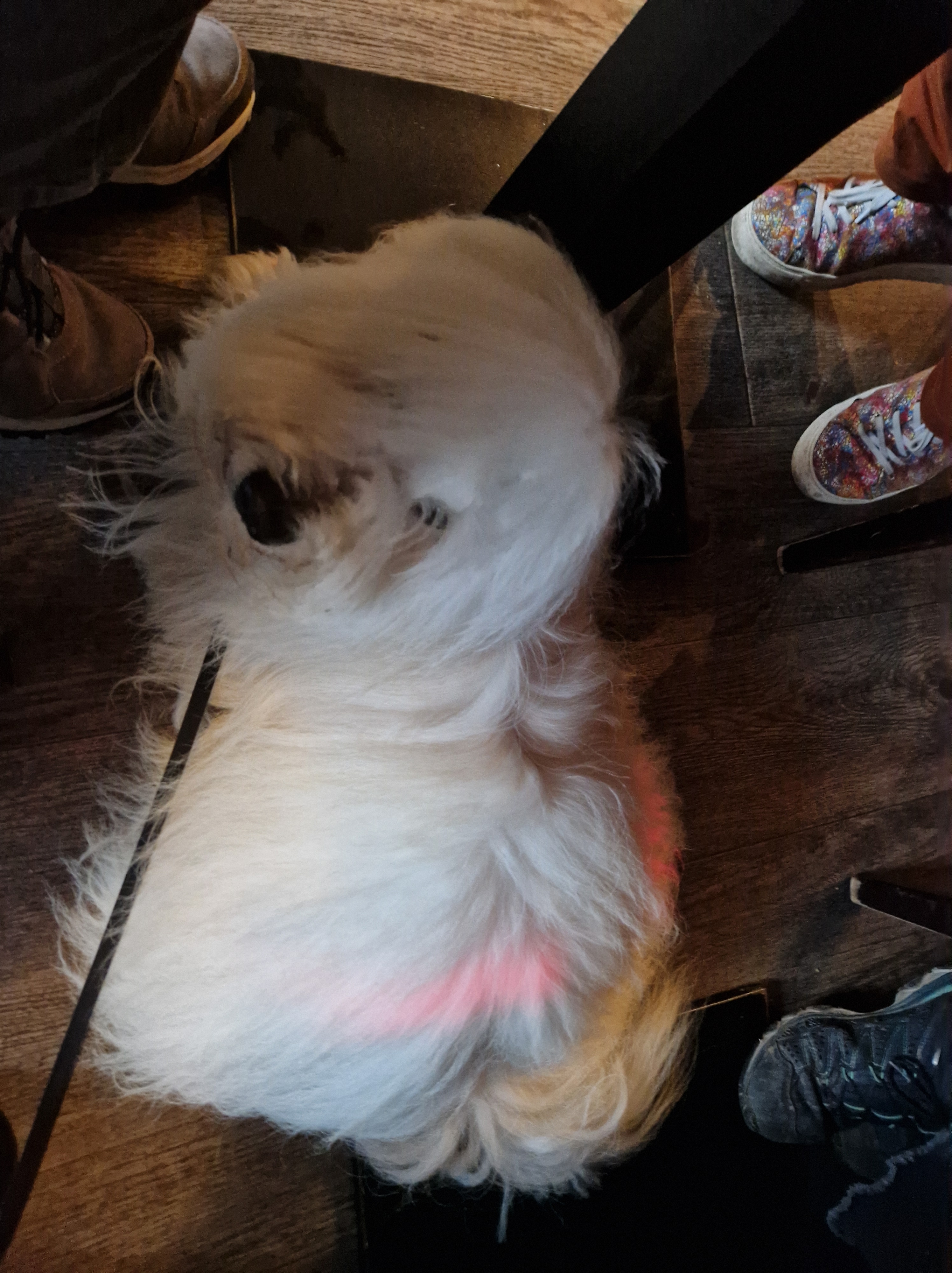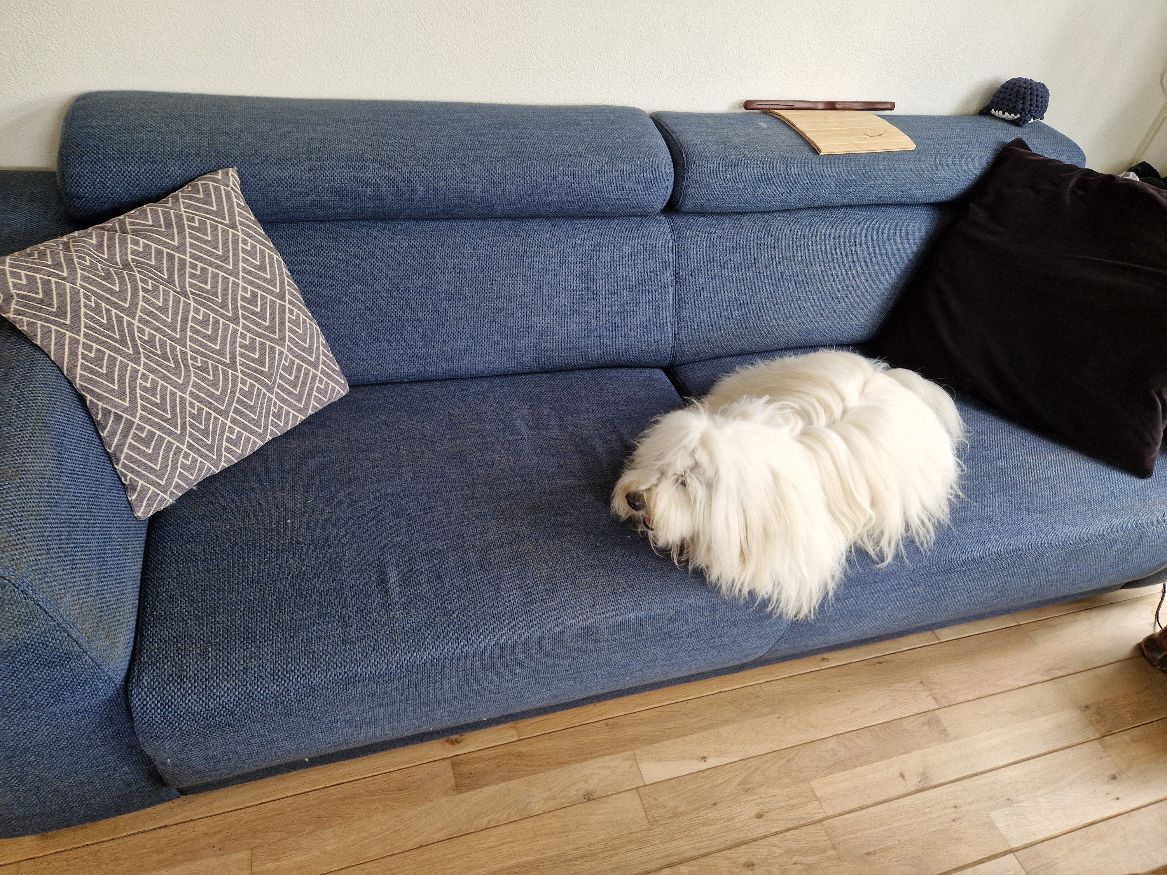 Laaaange rit. Boos weer boven Utrecht, een stortbui is net overgetrokken. En dan staat de file niet dáár, noch op de A7, maar bij de ingang van ons dorp waar blijkbaar een ongeluk op de rotonde is gebeurd. Rondje extra van de zaak en 5 minuten later ligt Ravi prinsheerlijk met een kluiffie op “zijn” bank!