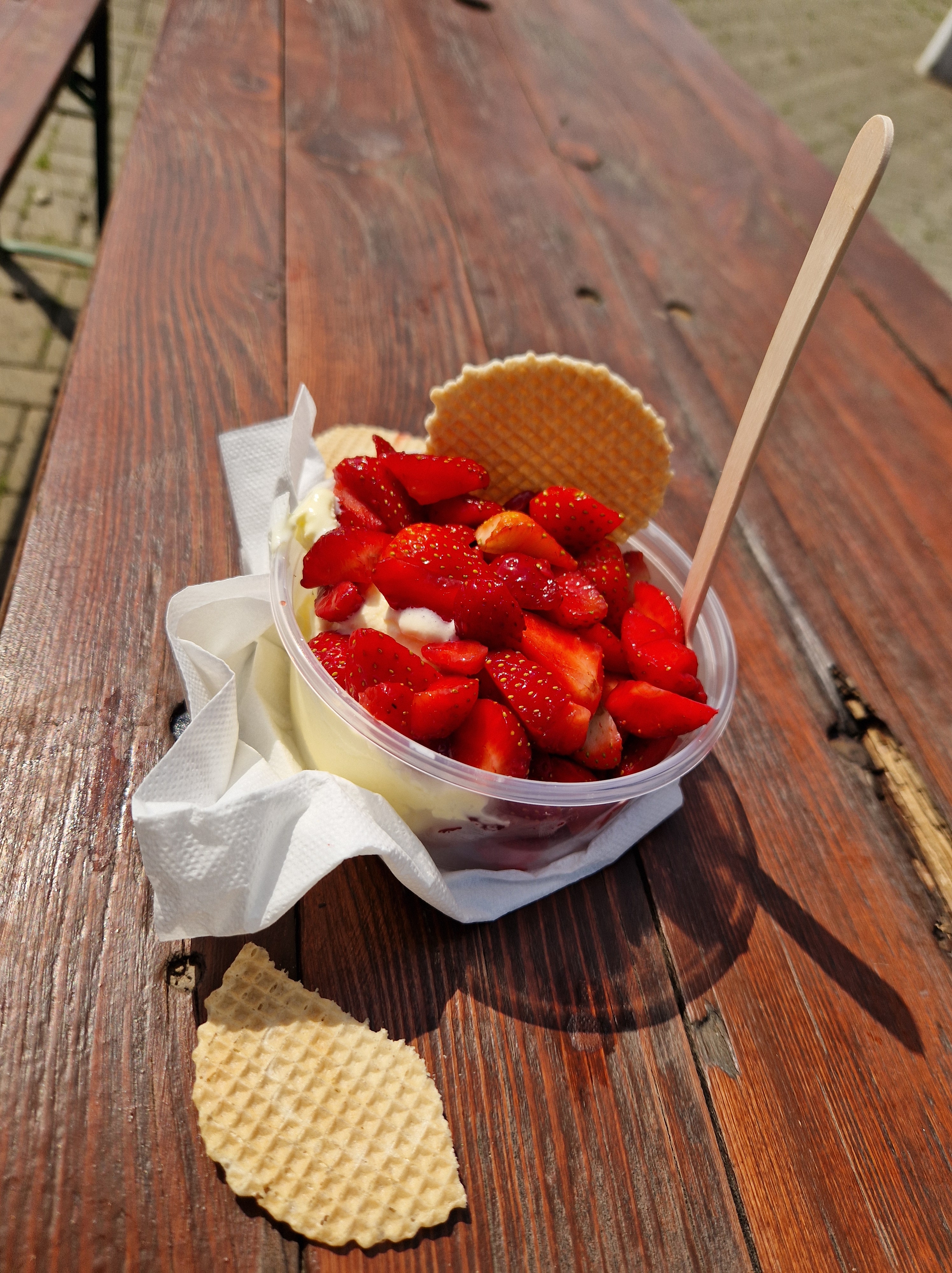 Maandagmorgen. Zon komt door, het is een stuk warmer dan gisteren. We rekken de vakantie een beetje op het terras van de camping waarna we de weg afdalen naar IJsboer Wingbergerhoeve. Dan is het toch echt tijd om afscheid te nemen. Zij steken direct door naar boven, wij rollen het dak half op en dalen af naar België om daar te tanken.