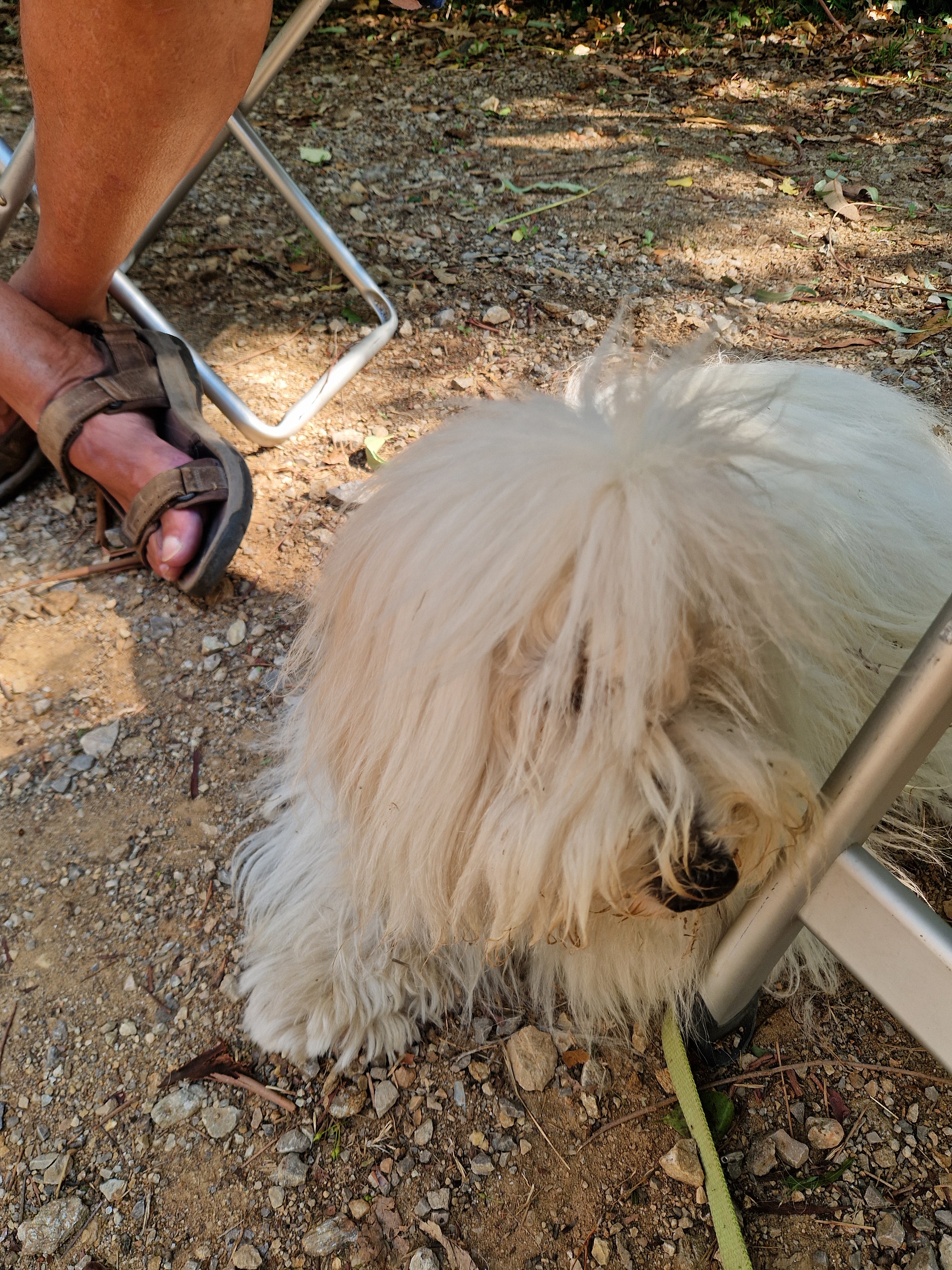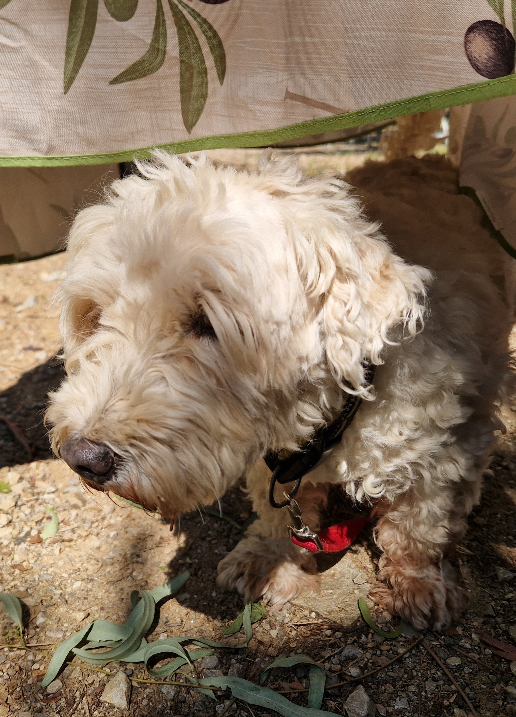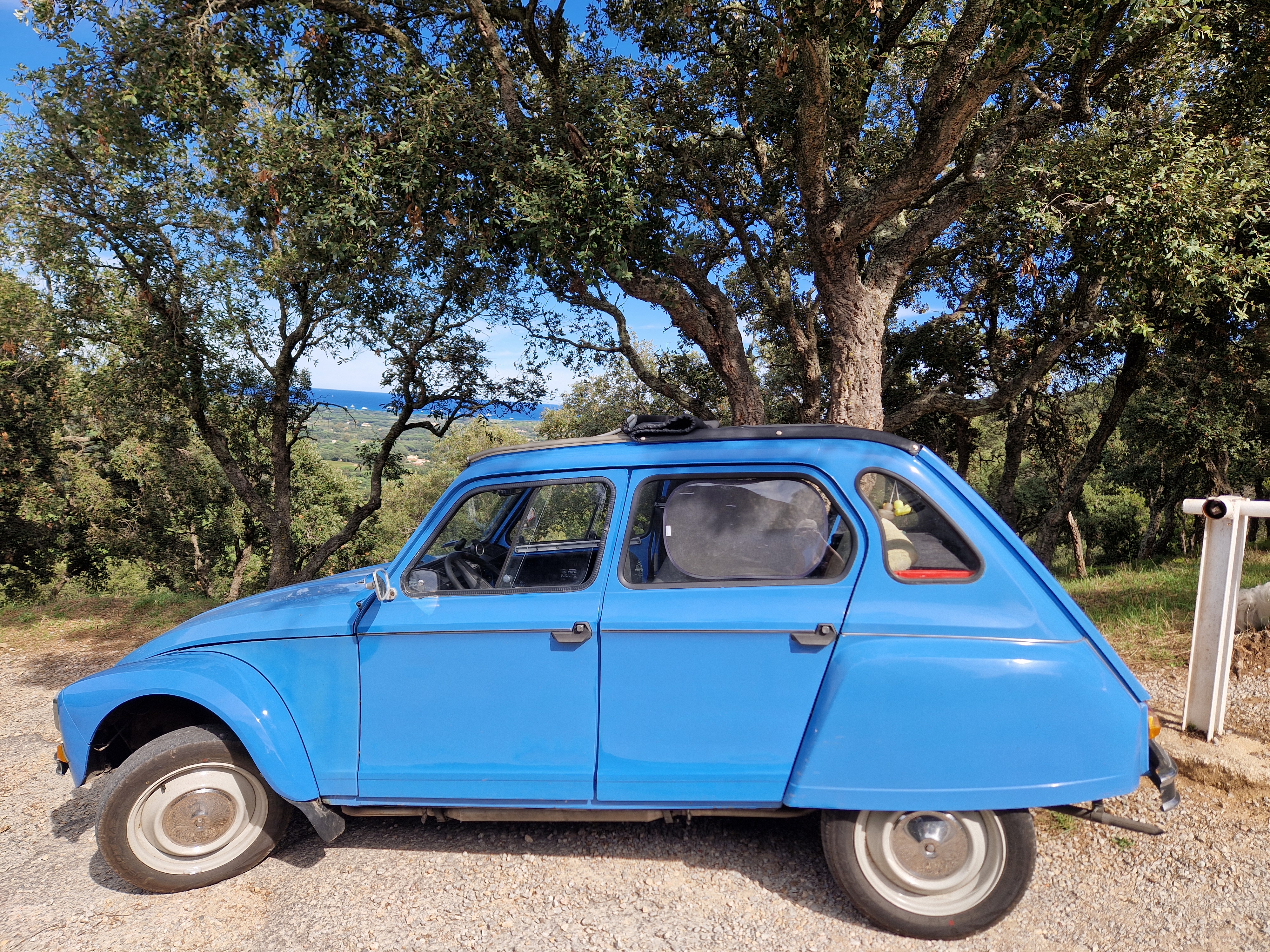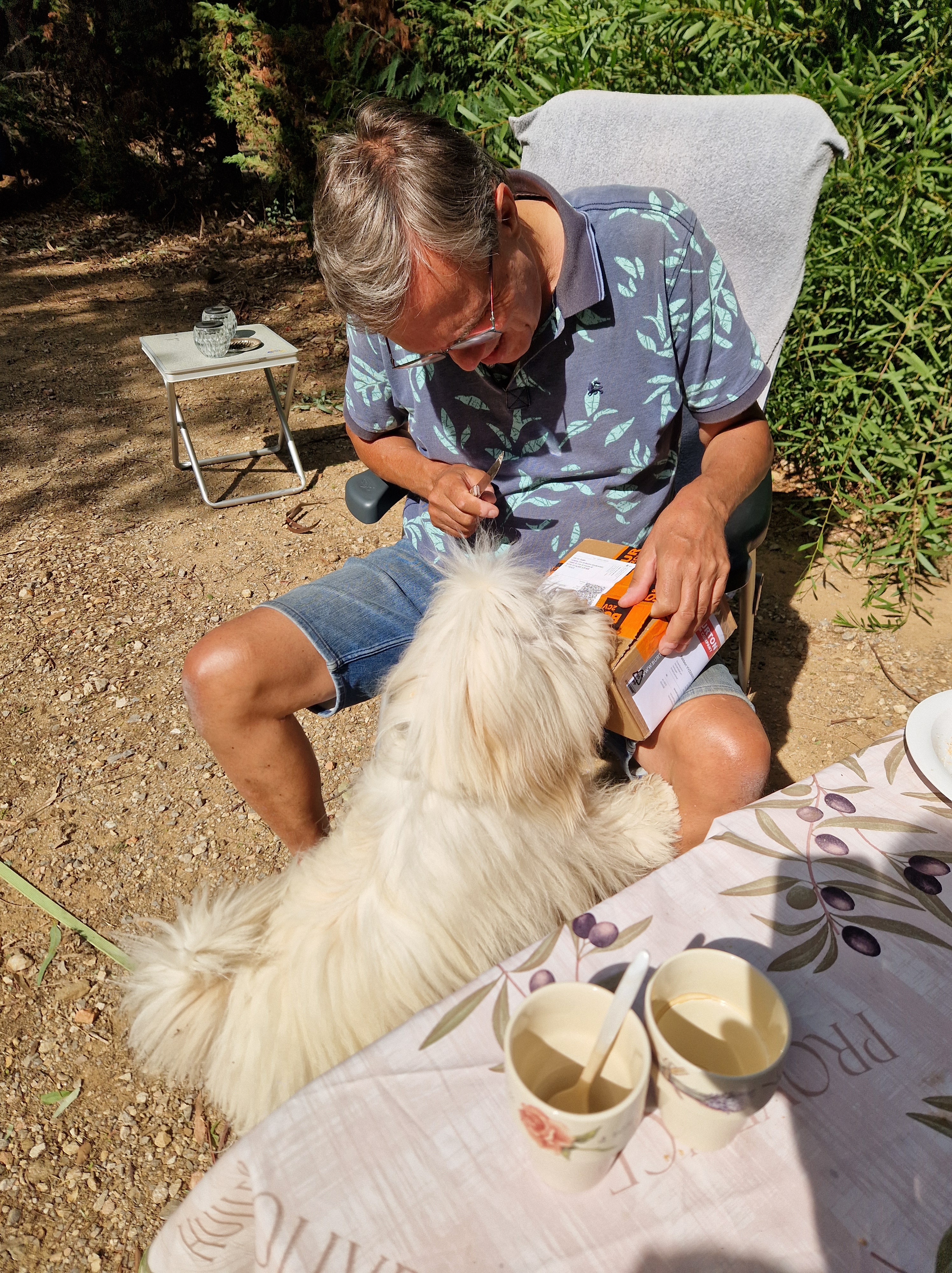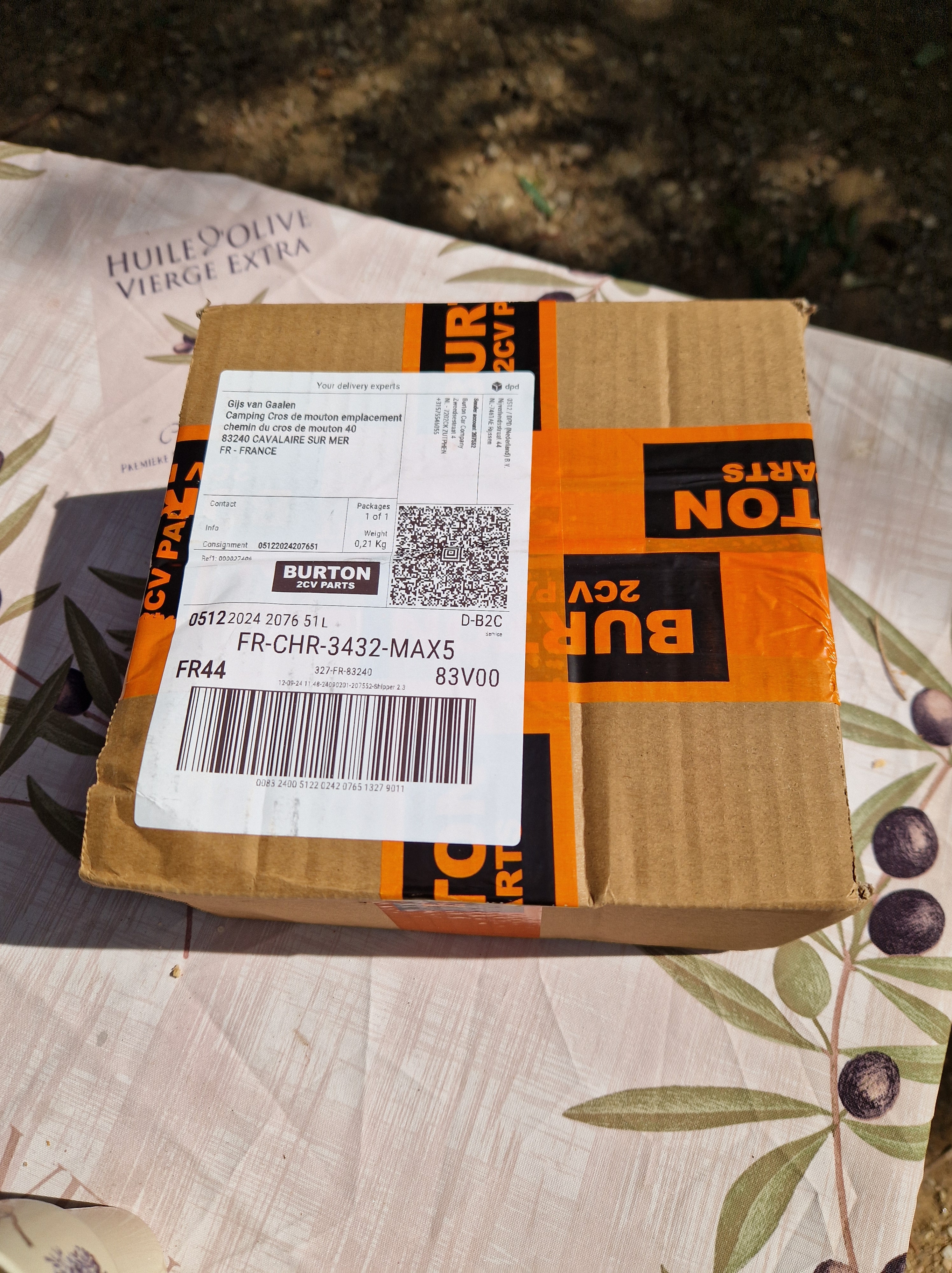 Dyaantje maakt teveel kabaal, waarschijnlijk door een versleten versnellingsbaksteun. Gijs is de afgelopen dagen bezig geweest te proberen het onderdeel te krijgen, we willen er zelfs voor naar de Mehariclub Cassis rijden, hier 100 km vandaan. Die kunnen ons helaas pas volgende week aan het ding helpen. We bellen met Burton in Zutphen. Als zij het dingetje opsturen is het hier uiterlijk…? We gaan het meemaken. Tadaa! Nog voor 12en is eindelijk het pakketje geleverd. Ravi is als altijd nieuwsgierig: zou er iets lekkers in zitten? Sorry beest, niet eetbaar.