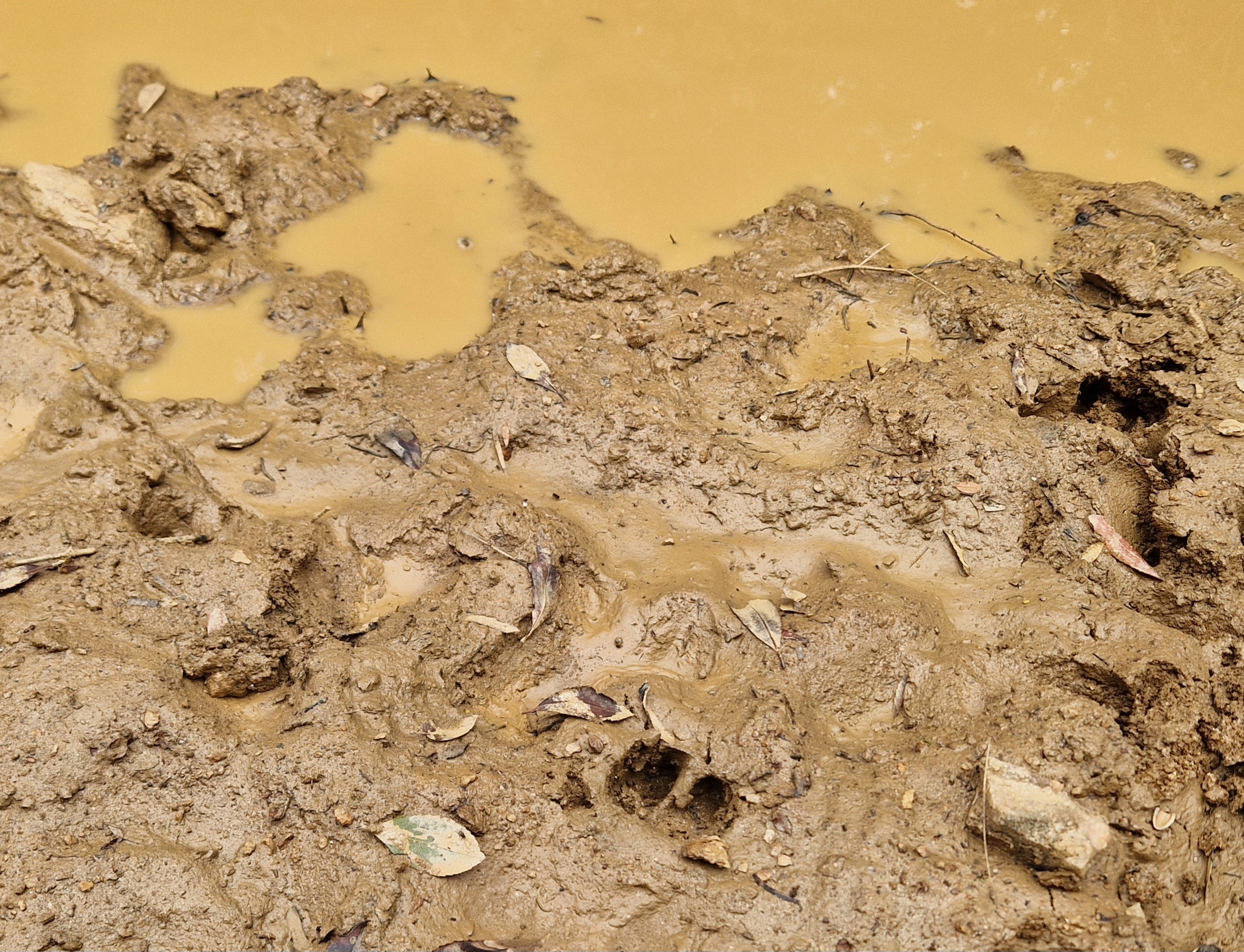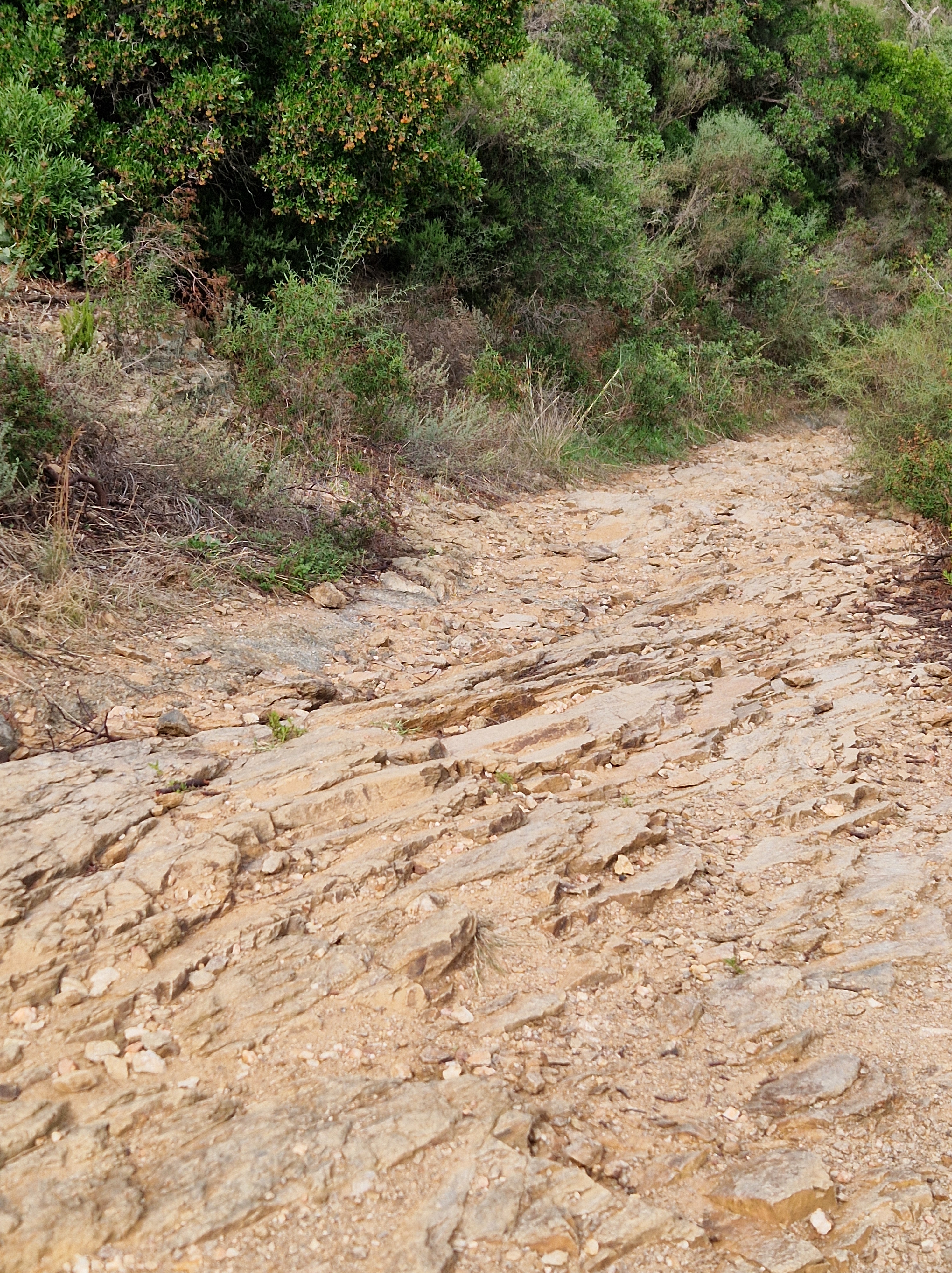 Zelden heb ik mij zo vergist. Het pad gaat loodrecht omhoog, met diep uitgesleten rotsspleten in het fonkelende gesteente. En zoals altijd: wat je naar boven klimt, moet je aan de andere kant weer afdalen langs net zo’n slechte weg. Er lijkt geen end aan te komen. Ik heb een paar foto’s gemaakt van wat ik dacht dat de ergste stukken waren, daarna had ik mijn volle aandacht nodig voor mijn voeten en de stekeltakken die in m’n gezicht zwiepten. Ravi huppelt gezellig mee, bij een zwijnenpoeltje hebben we moeite hem ervan te weerhouden in de oranje klei te gaan baggeren. Al met al hebben we net-aan 4 km gelopen, het leken er veel meer.