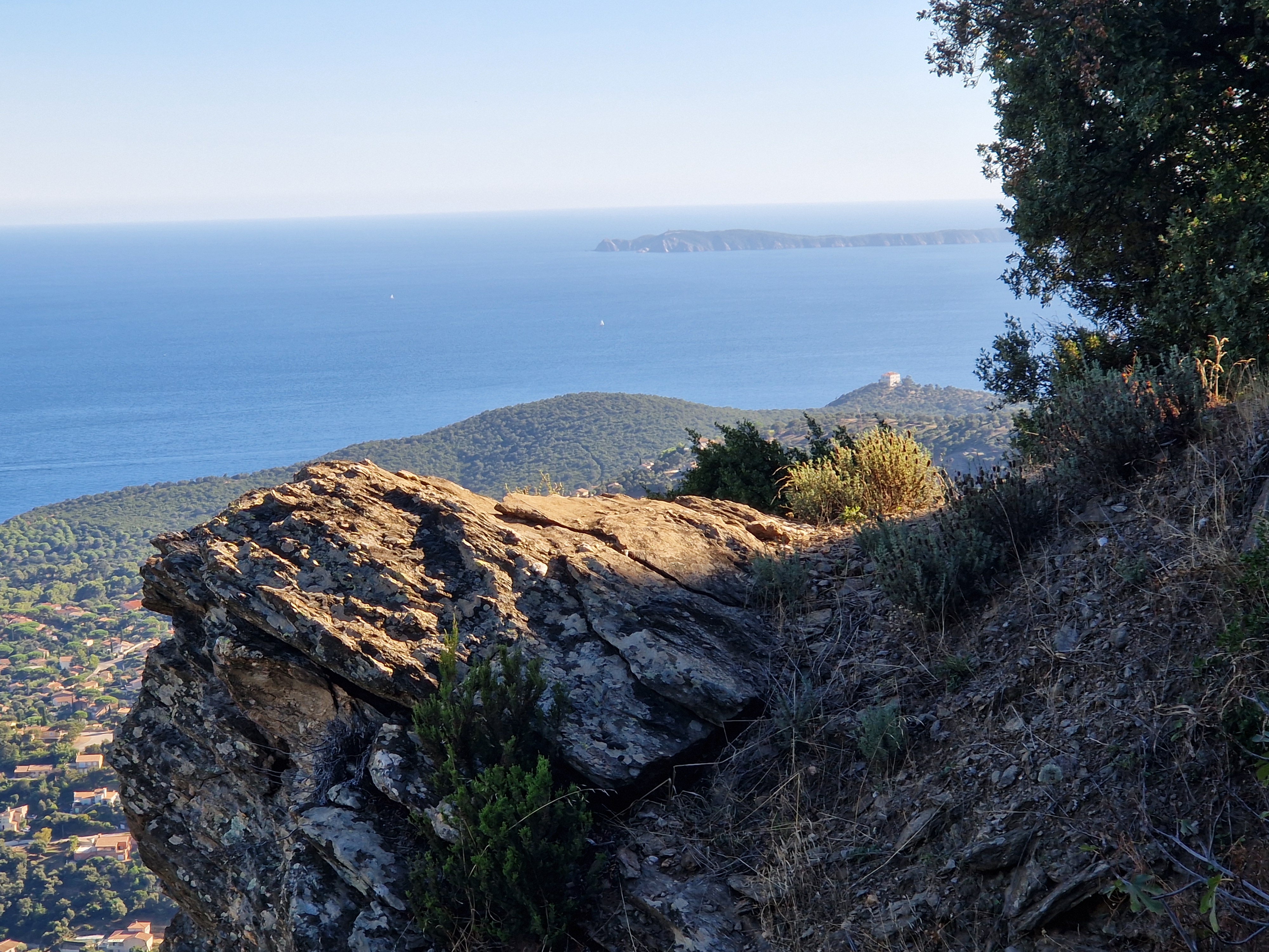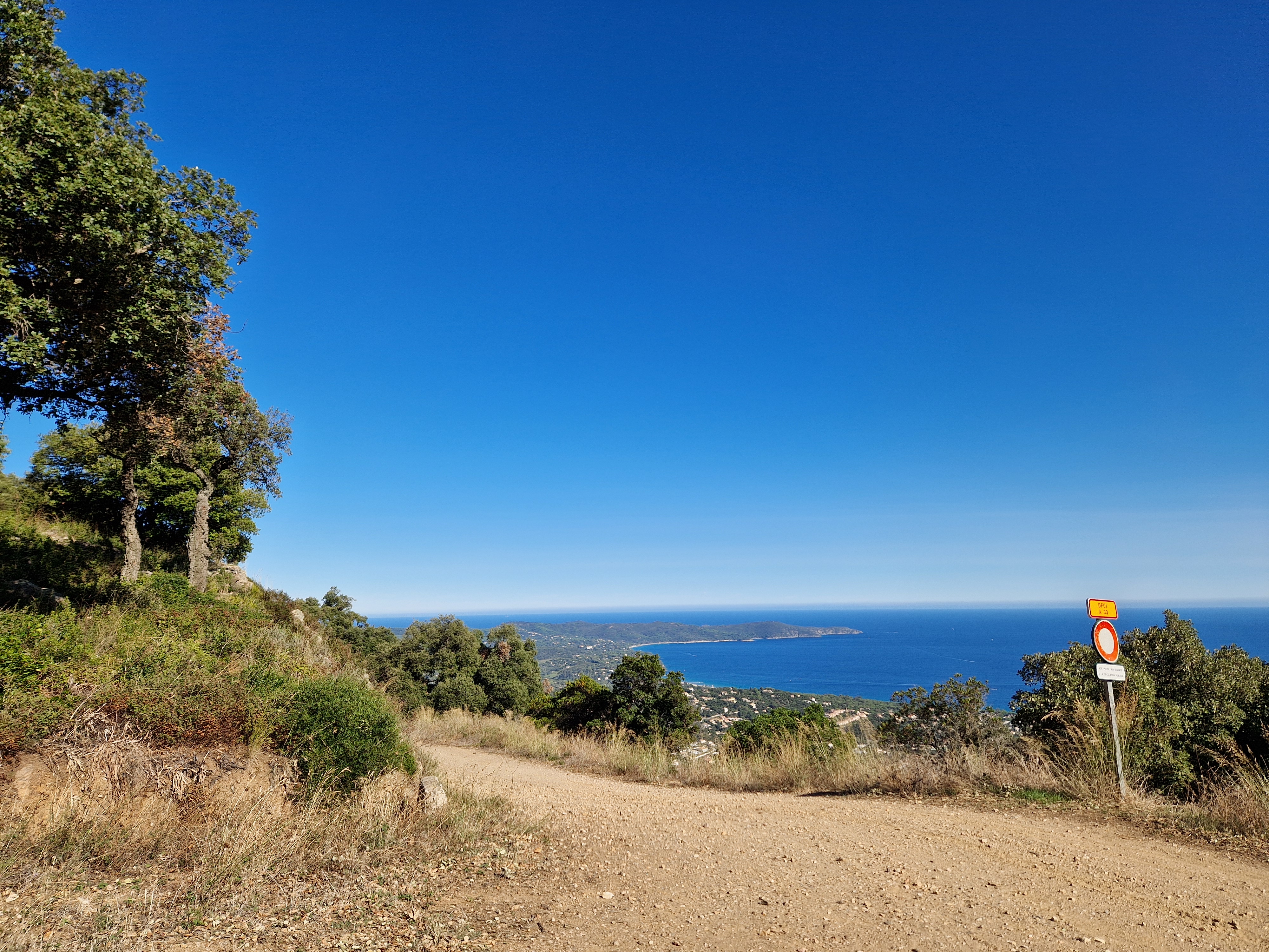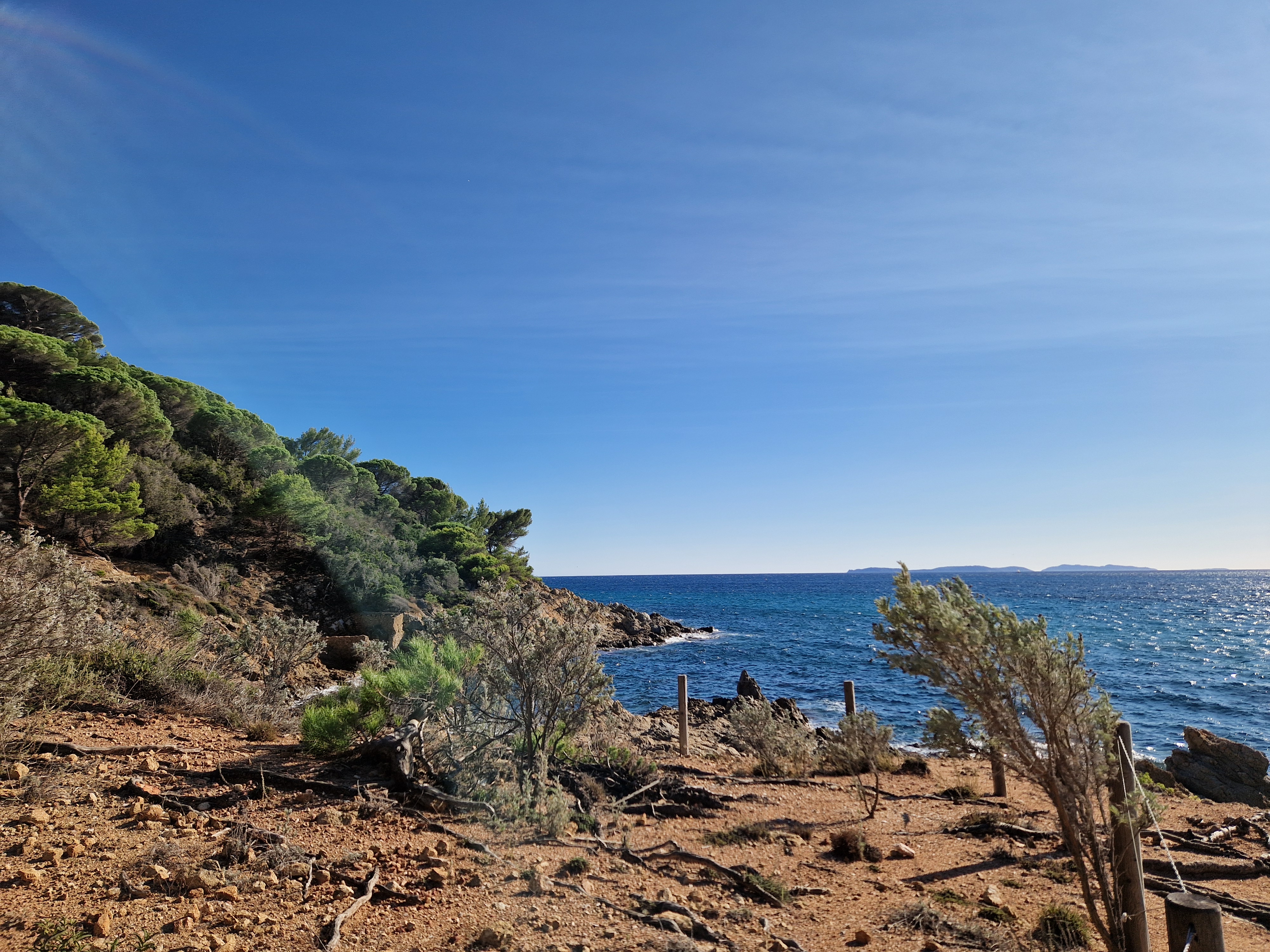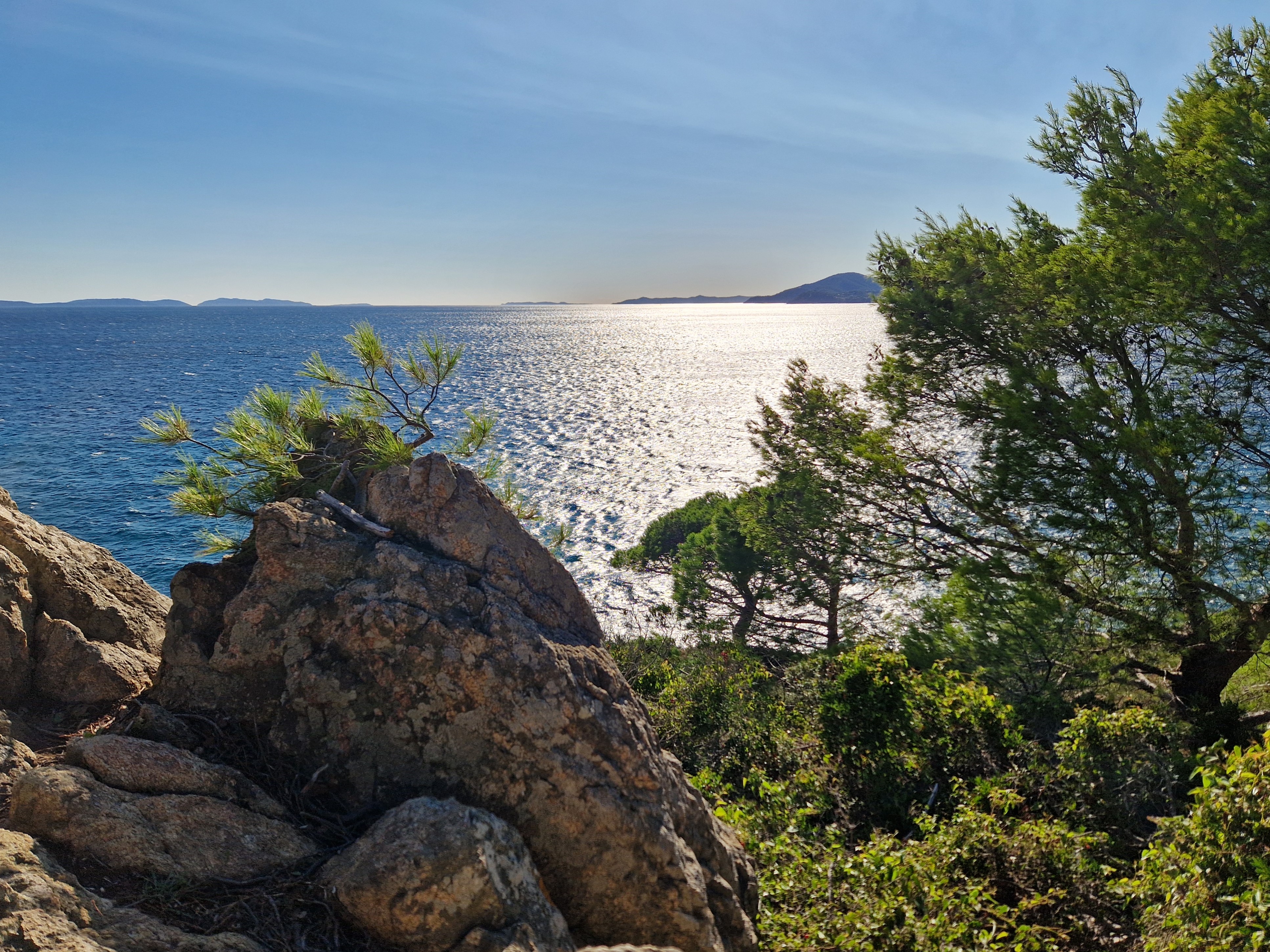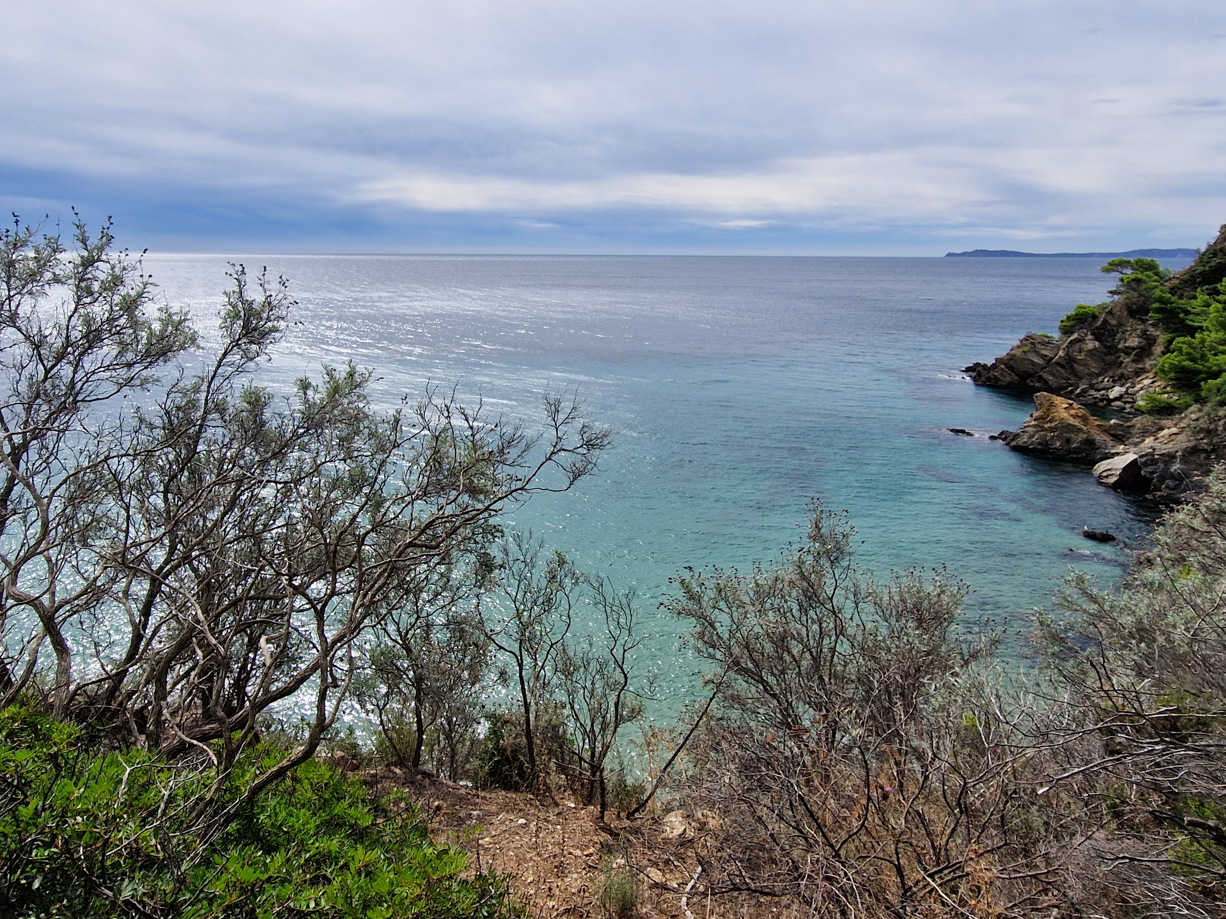 Om echt te kunnen wandelen rijden we door naar Gigaro. Hier waait het eveneens behoorlijk; mijn telefoon slaat op tilt van een weldadige overdaad aan blauw. We vinden een nieuwe doorsteek dat ons rondje met meer dan de helft inkort: bij de liggende boomstam recht omhoog naar het grote achterpad. Mijn voeten en ik halen opgelucht adem. We sluiten deze gekke dag af met crèpes, met uitzicht op de baai waar we een paar uur eerder liepen. De zon gaat vroeg onder.