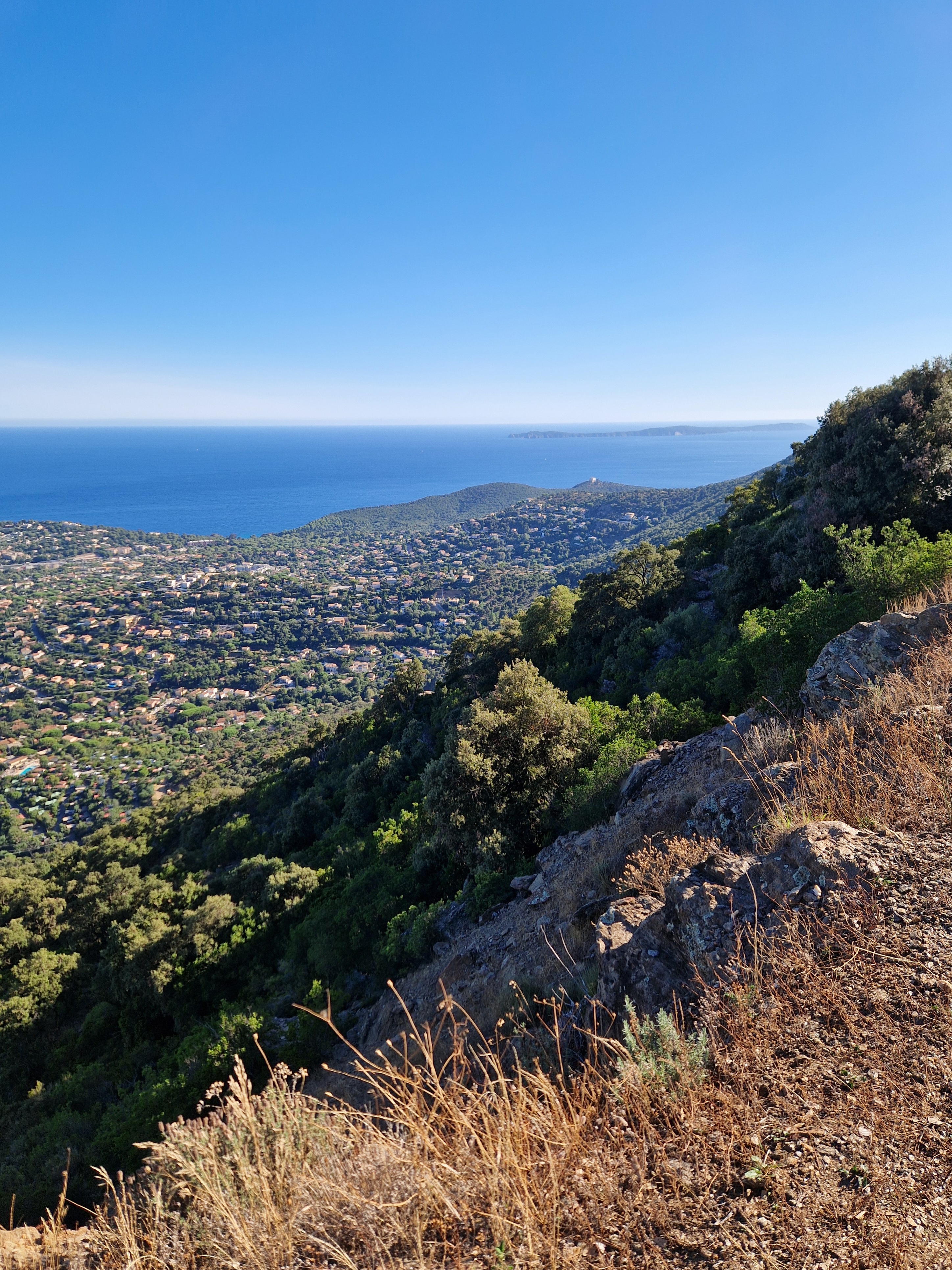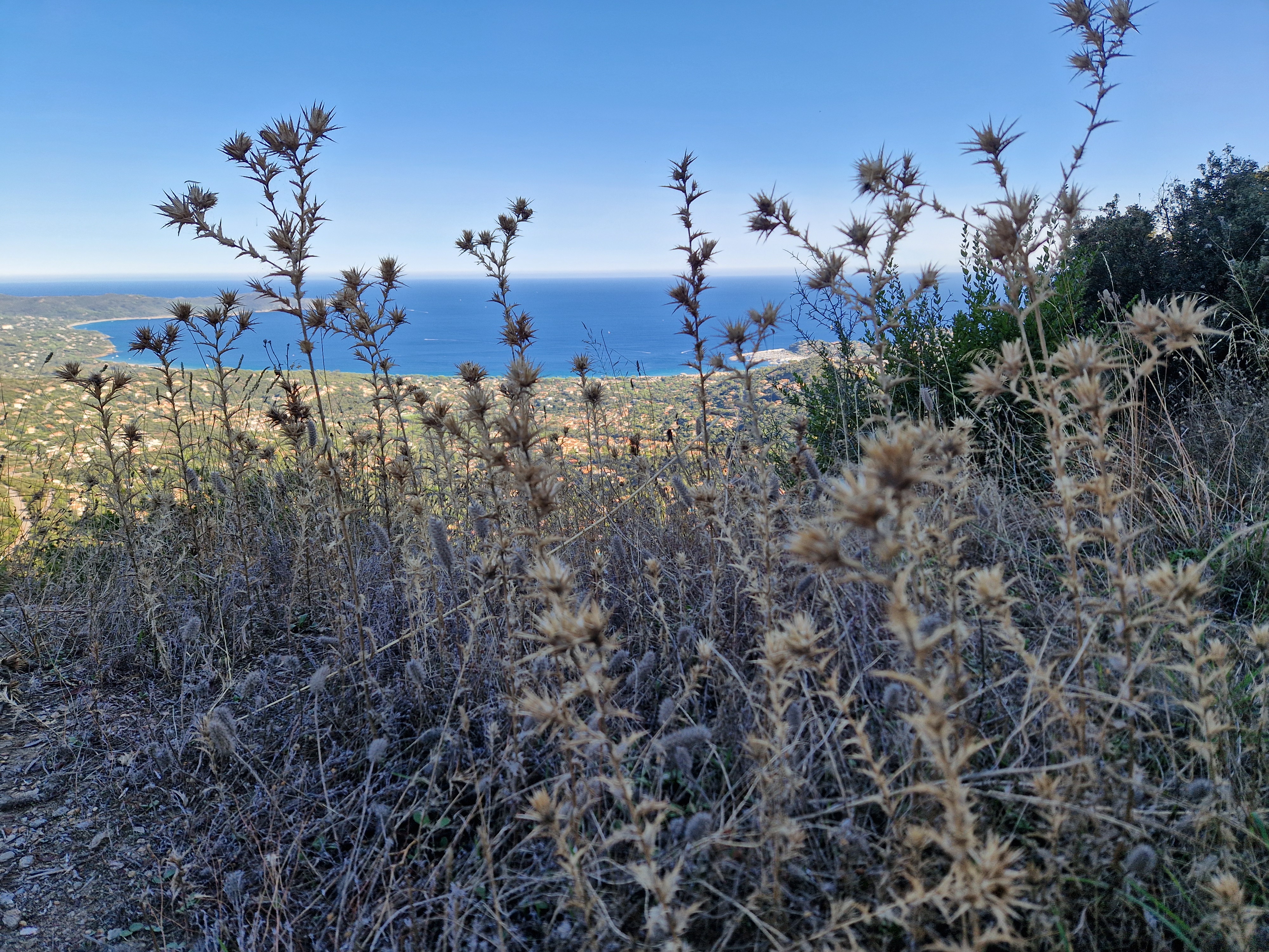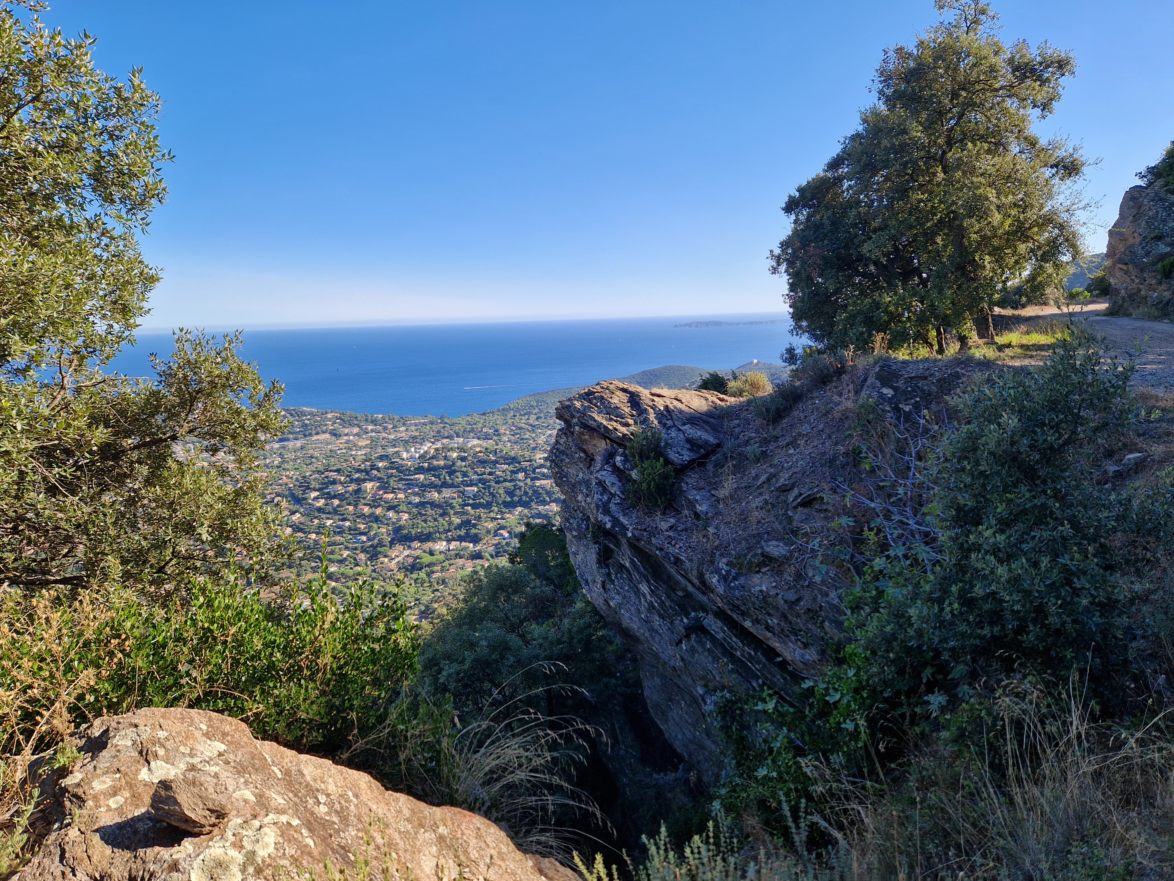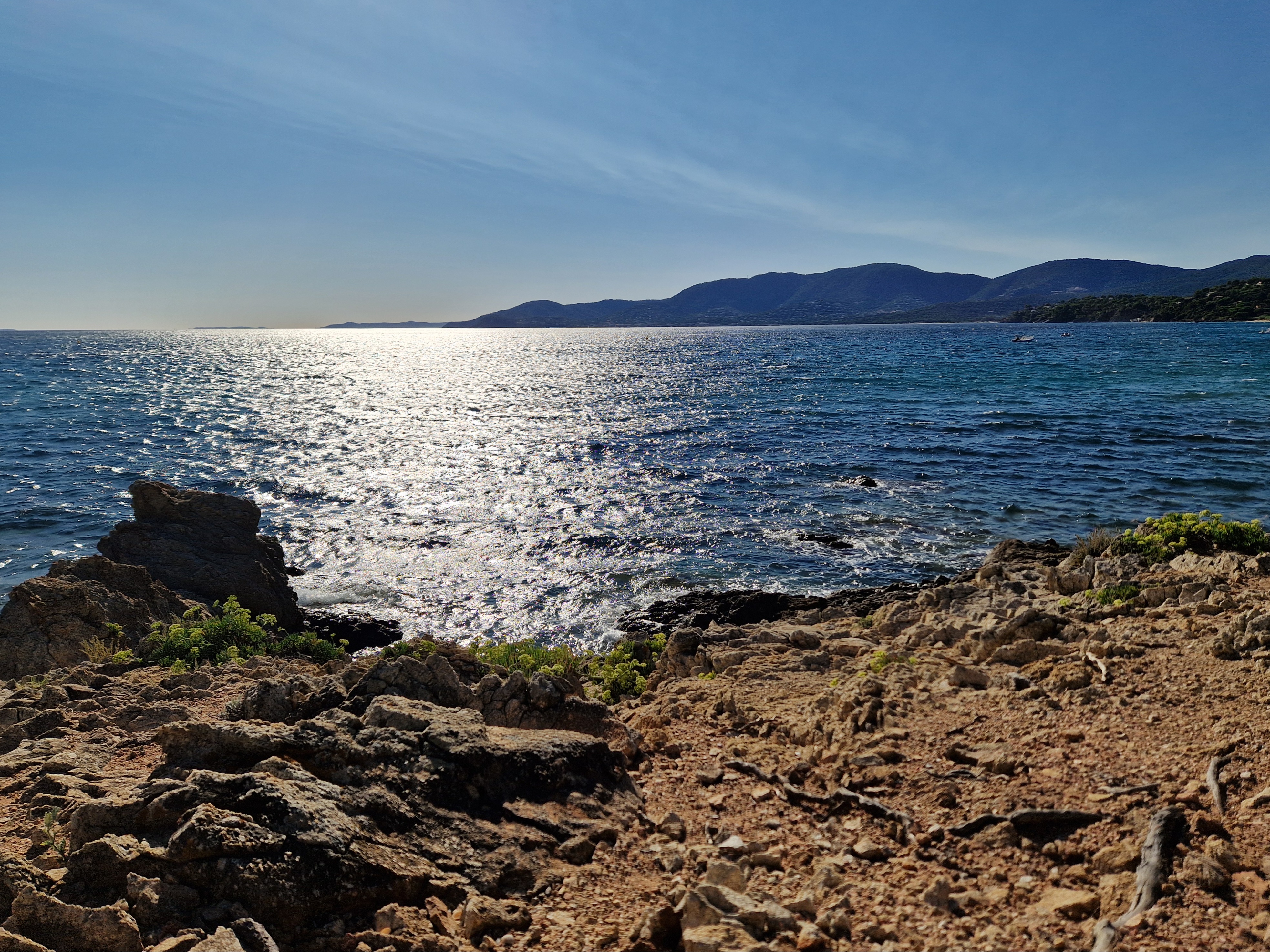 Om echt te kunnen wandelen rijden we door naar Gigaro. Hier waait het eveneens behoorlijk; mijn telefoon slaat op tilt van een weldadige overdaad aan blauw. We vinden een nieuwe doorsteek dat ons rondje met meer dan de helft inkort: bij de liggende boomstam recht omhoog naar het grote achterpad. Mijn voeten en ik halen opgelucht adem. We sluiten deze gekke dag af met crèpes, met uitzicht op de baai waar we een paar uur eerder liepen. De zon gaat vroeg onder.