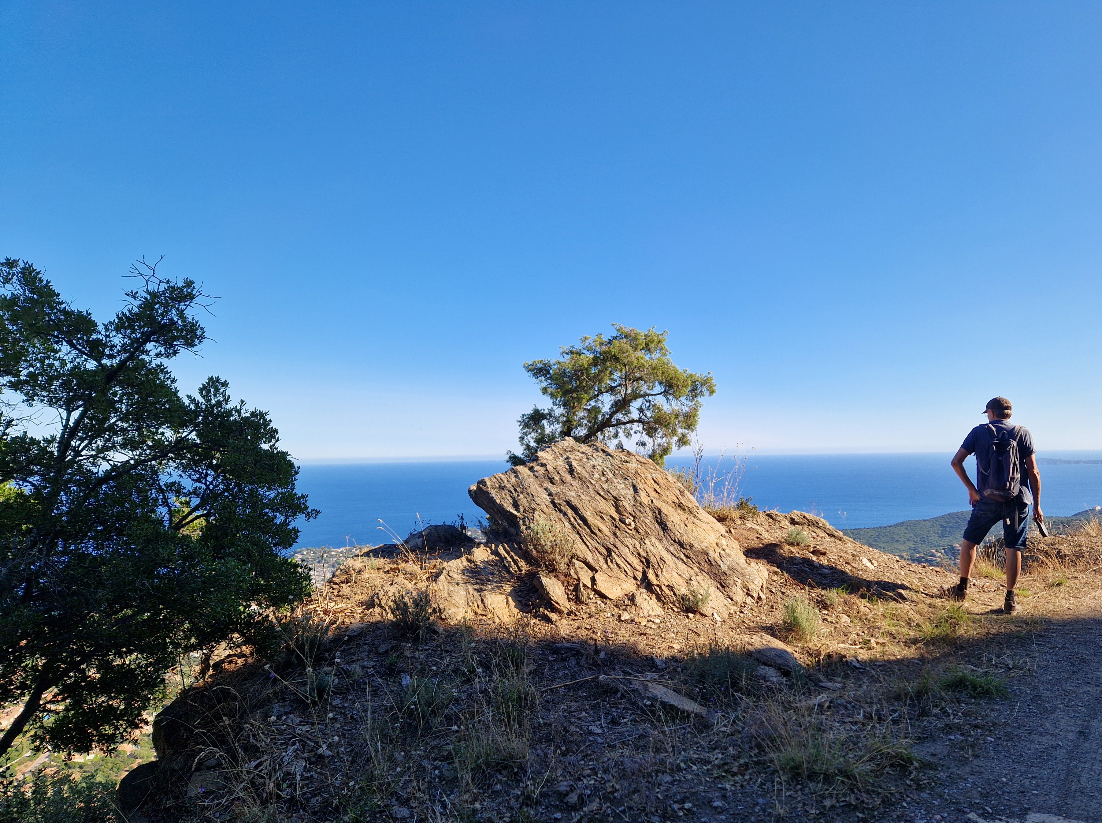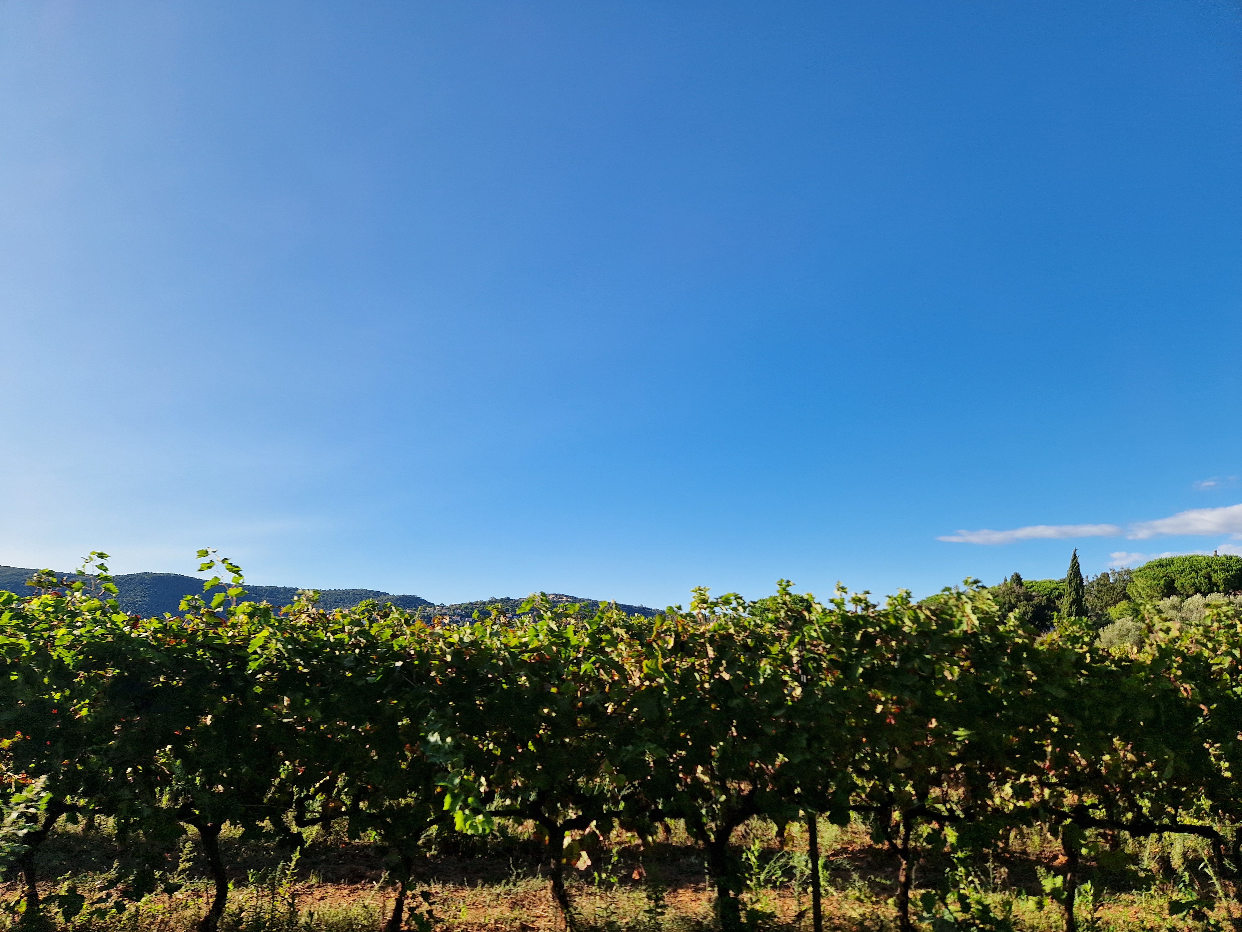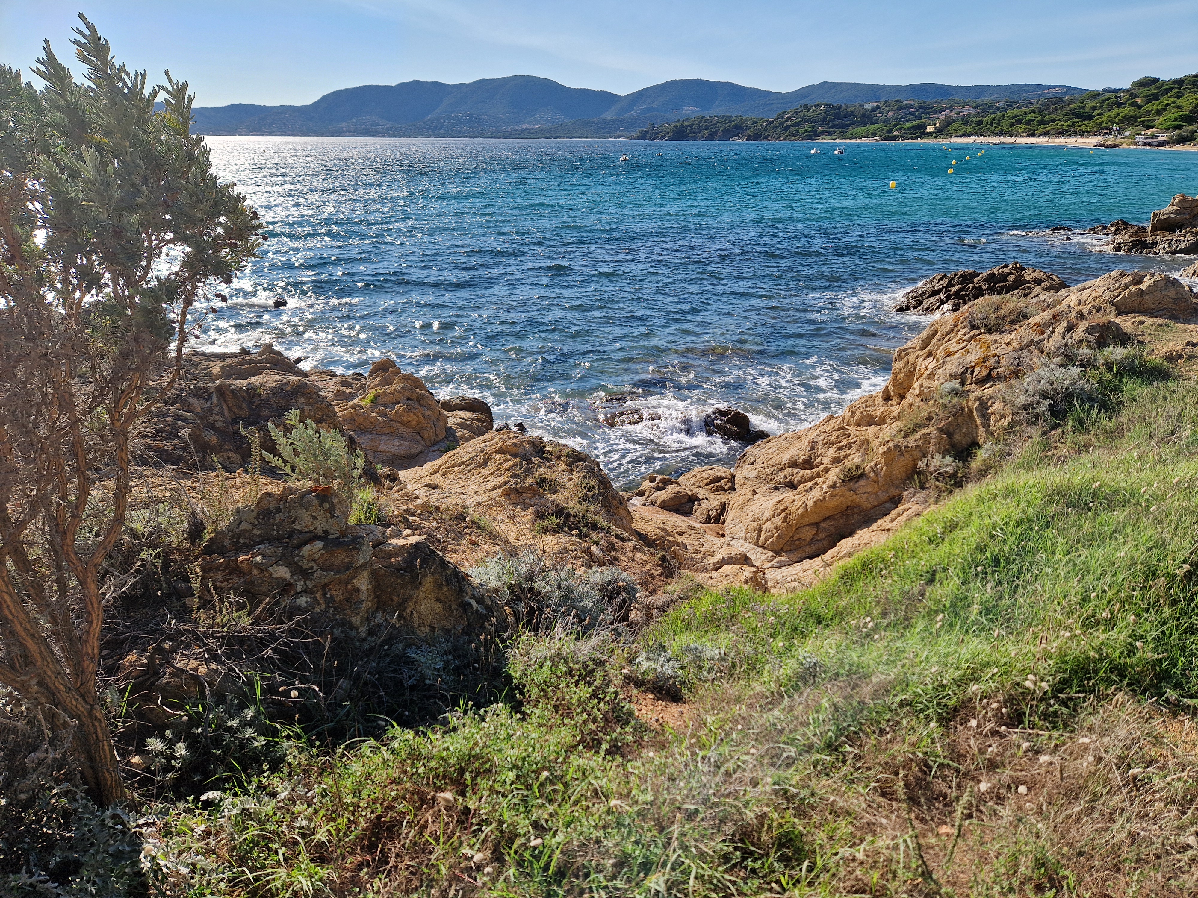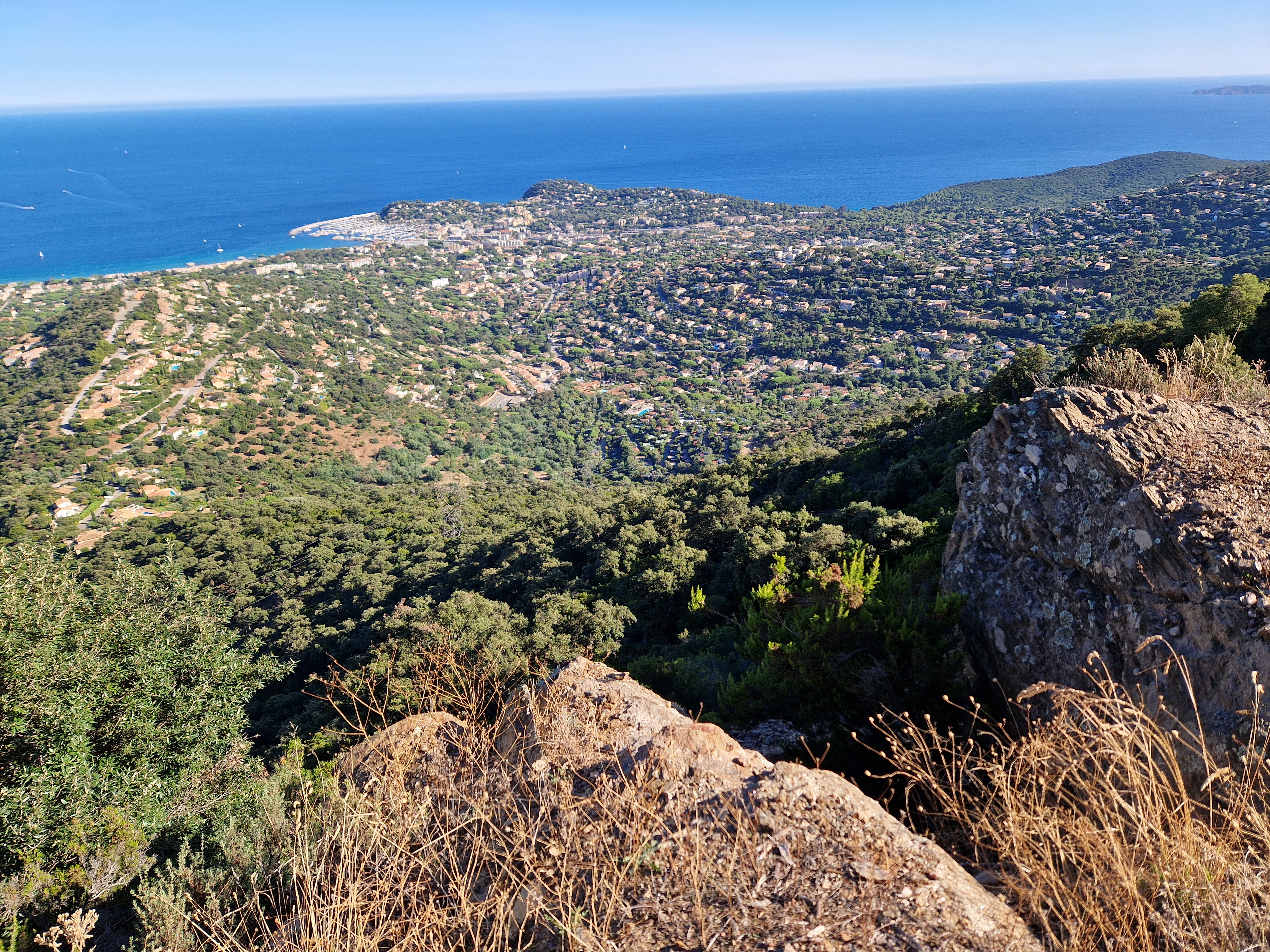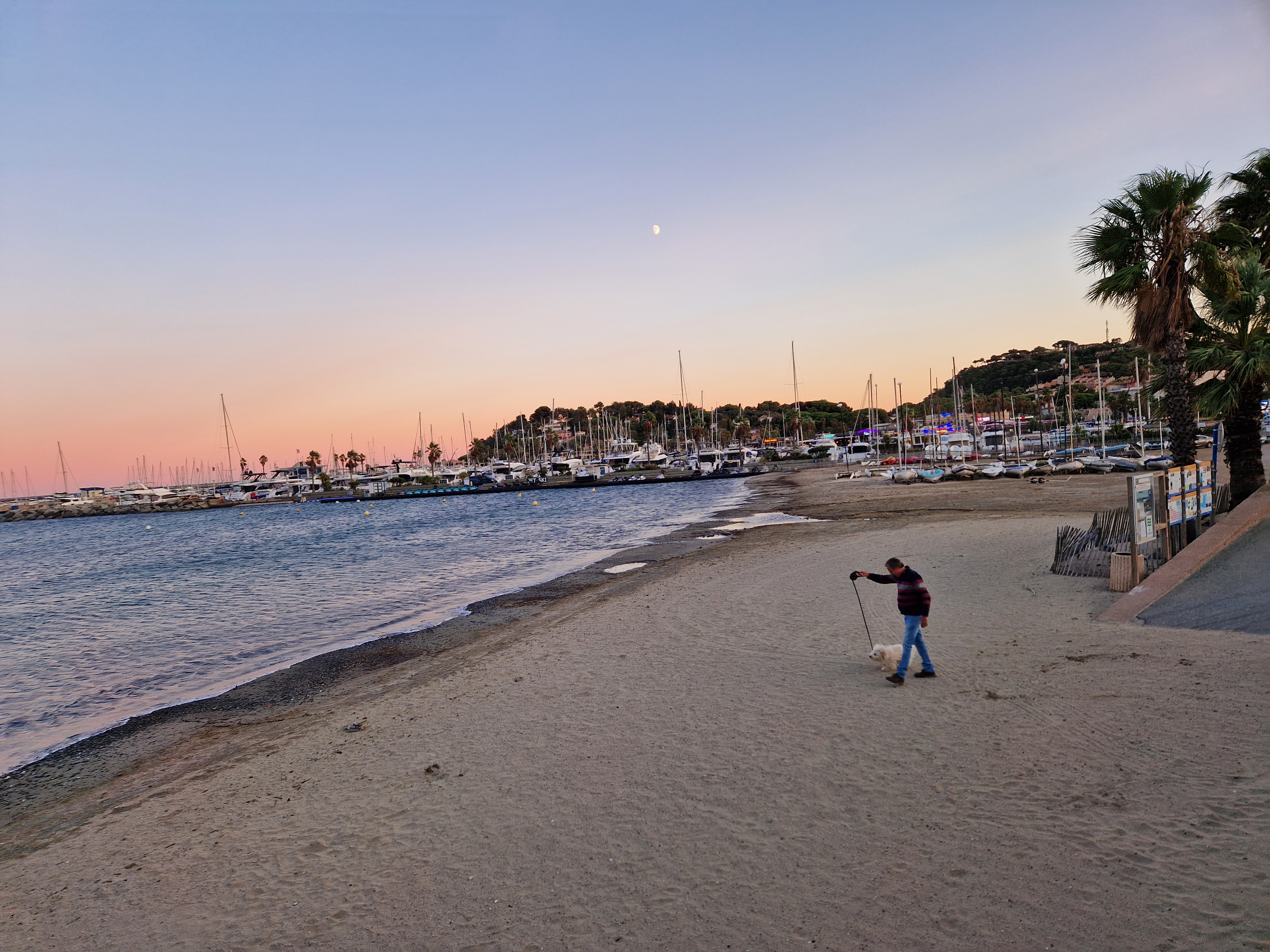Om echt te kunnen wandelen rijden we door naar Gigaro. Hier waait het eveneens behoorlijk; mijn telefoon slaat op tilt van een weldadige overdaad aan blauw. We vinden een nieuwe doorsteek dat ons rondje met meer dan de helft inkort: bij de liggende boomstam recht omhoog naar het grote achterpad. Mijn voeten en ik halen opgelucht adem. We sluiten deze gekke dag af met crèpes, met uitzicht op de baai waar we een paar uur eerder liepen. De zon gaat vroeg onder.
