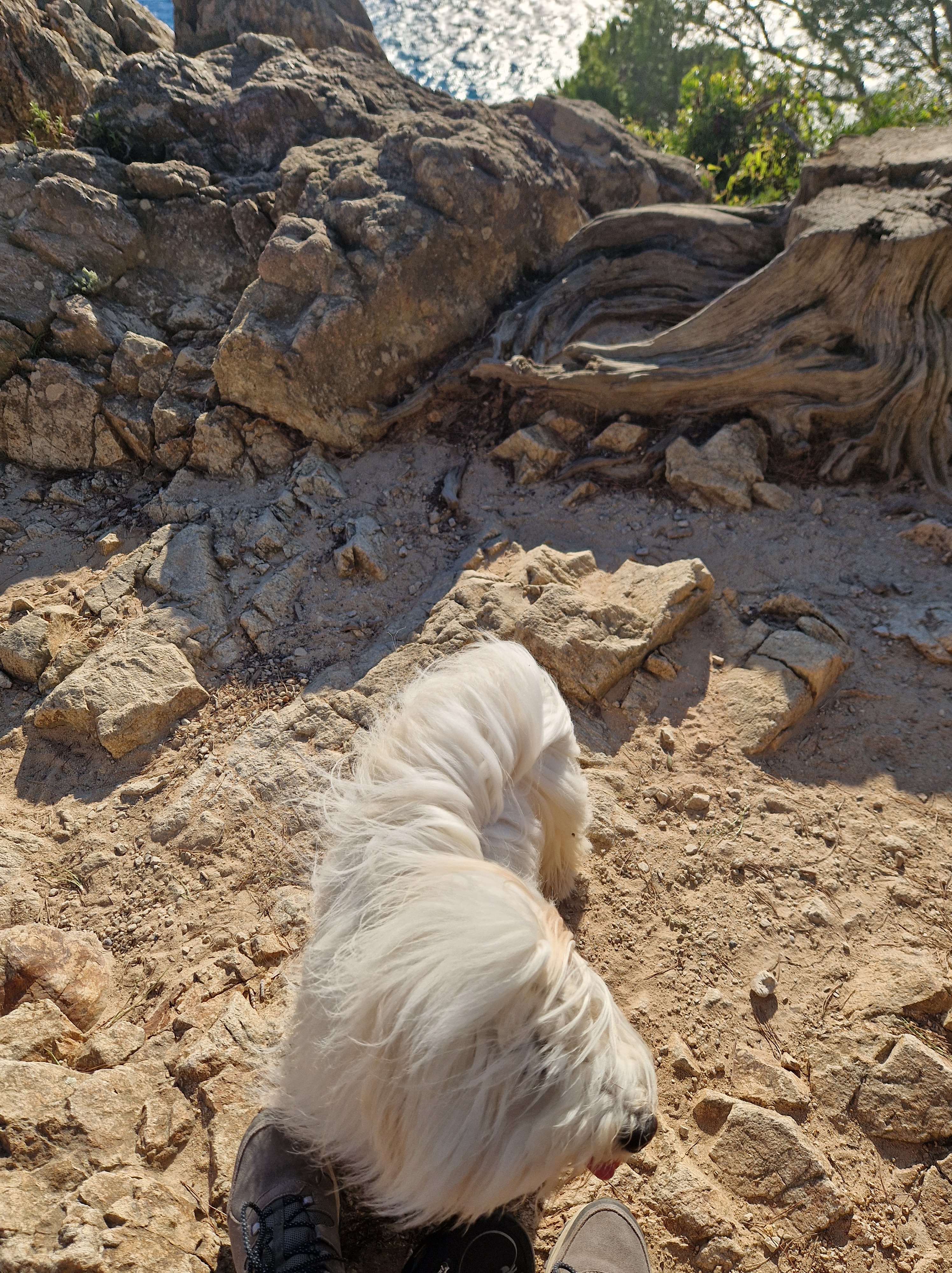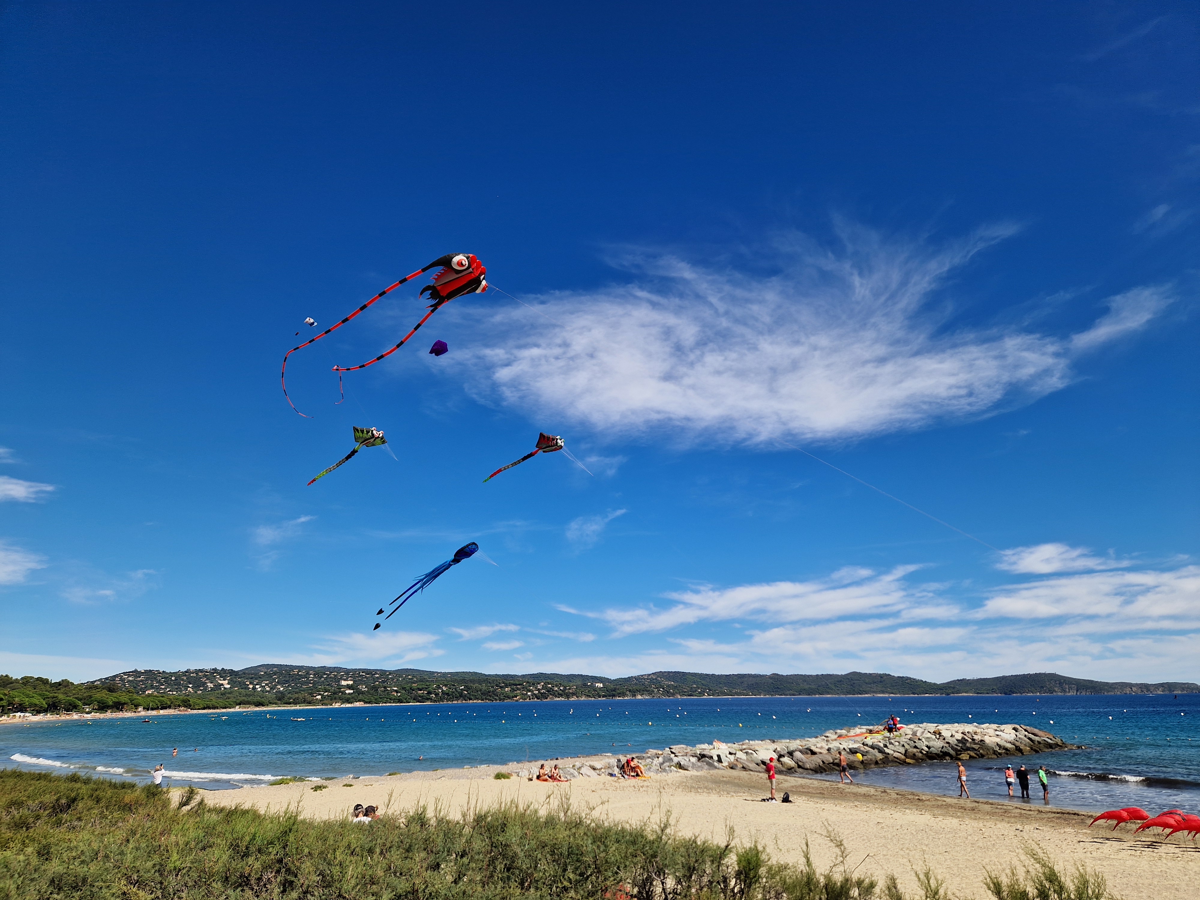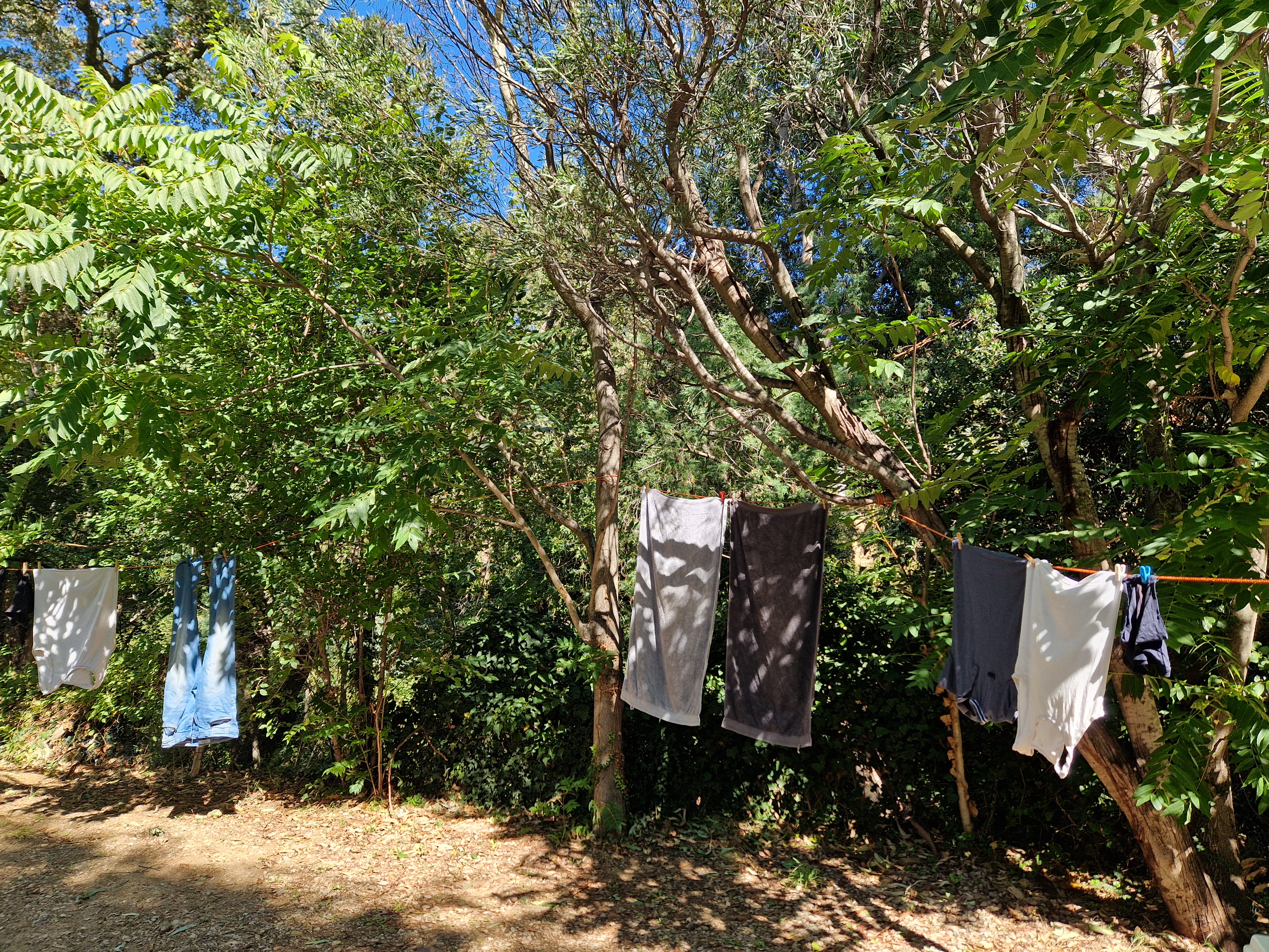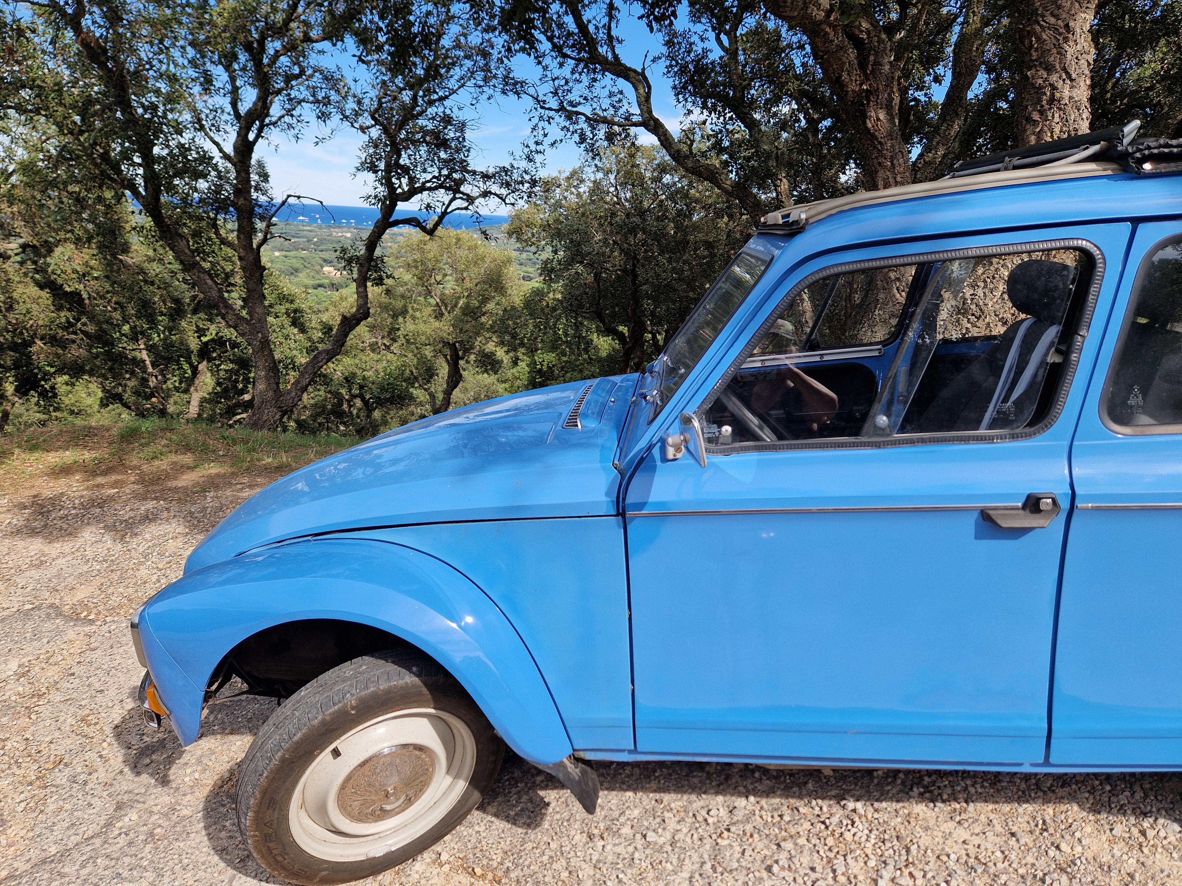 Om echt te kunnen wandelen rijden we door naar Gigaro. Hier waait het eveneens behoorlijk; mijn telefoon slaat op tilt van een weldadige overdaad aan blauw. We vinden een nieuwe doorsteek dat ons rondje met meer dan de helft inkort: bij de liggende boomstam recht omhoog naar het grote achterpad. Mijn voeten en ik halen opgelucht adem. We sluiten deze gekke dag af met crèpes, met uitzicht op de baai waar we een paar uur eerder liepen. De zon gaat vroeg onder.
