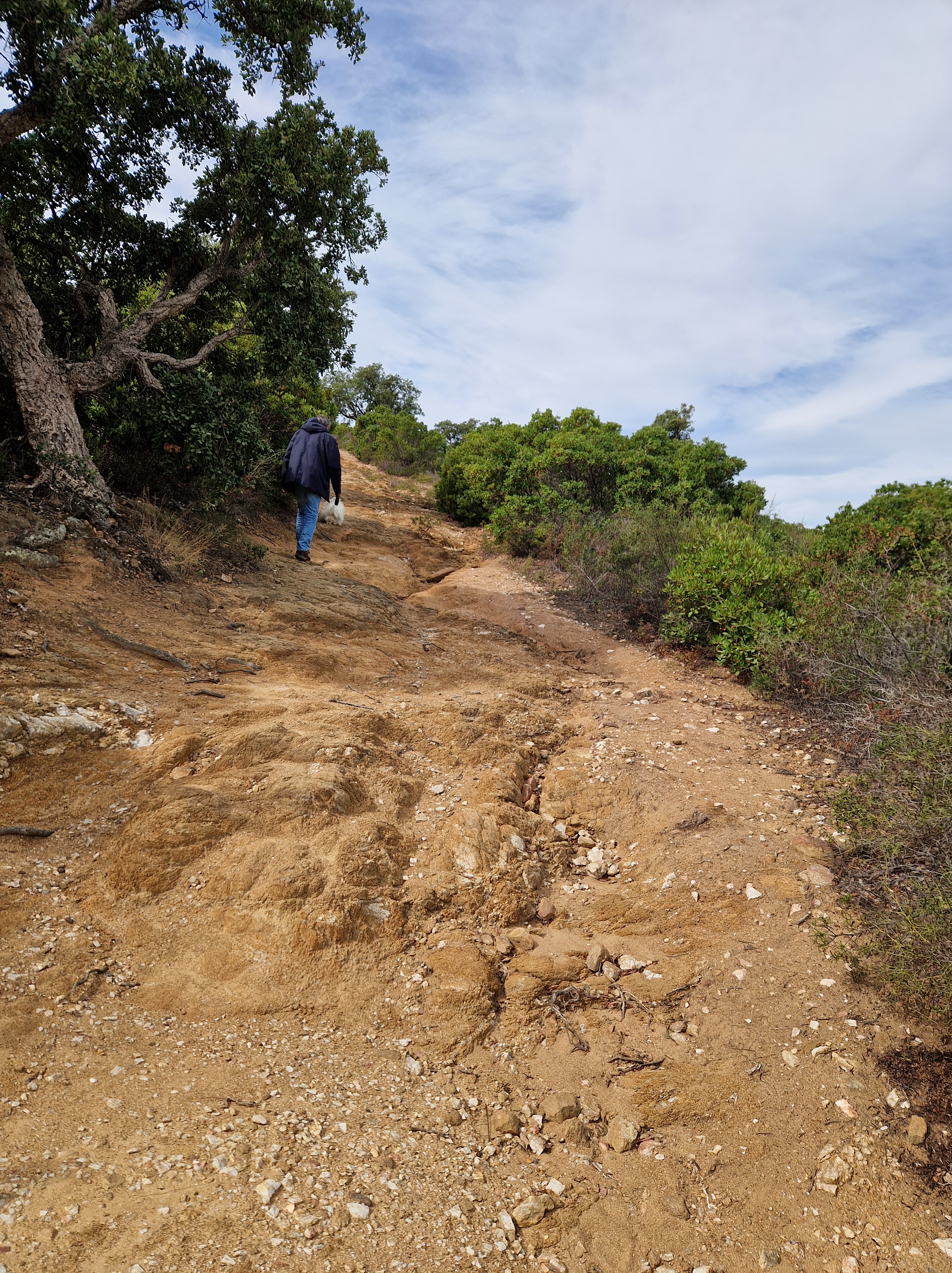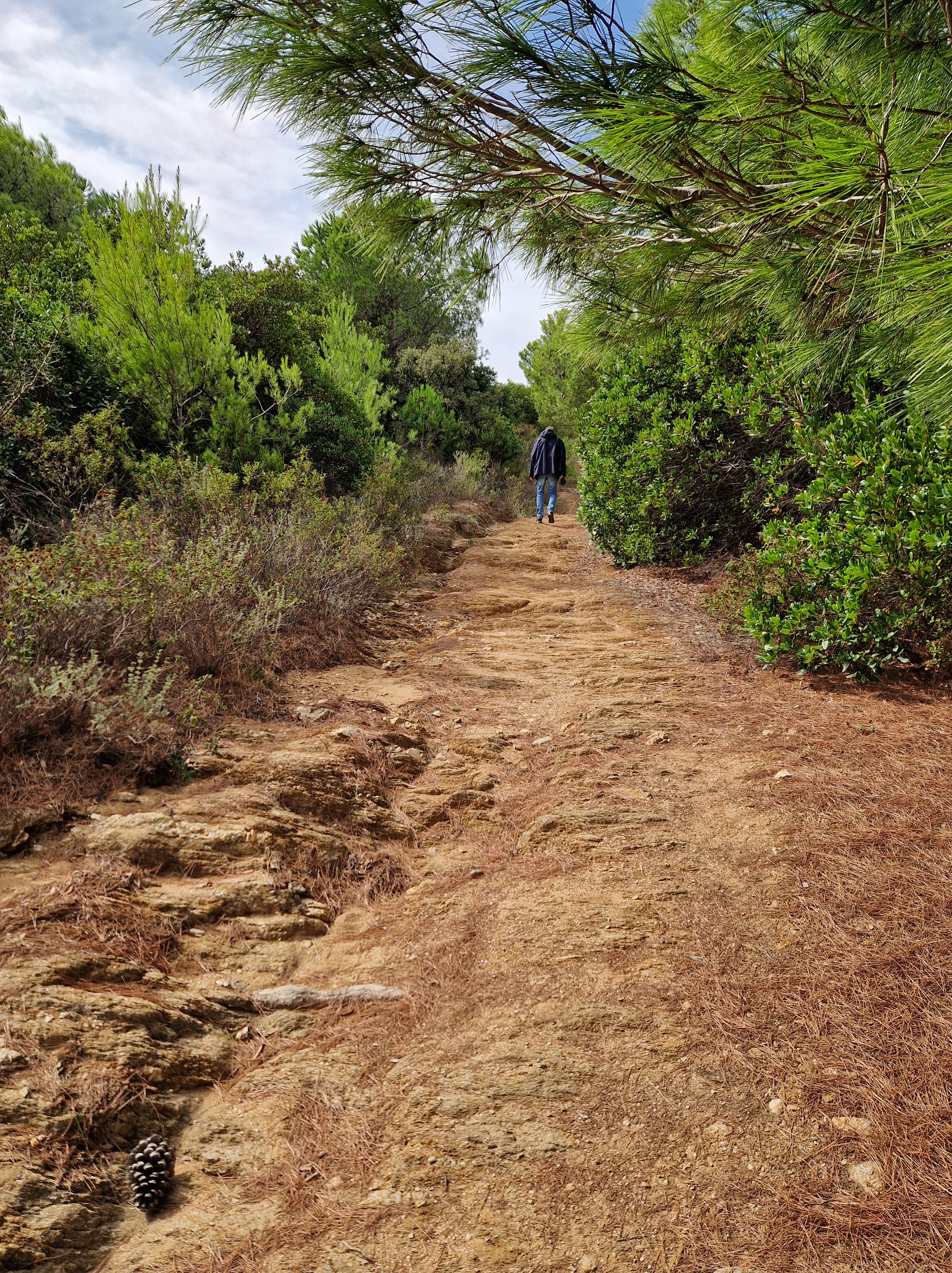 Lange mouwen, lange broek en dikke sokken aan, jas aan en wandelschoenen opgediept: we gaan het zieke zweet eruit werken. Ik had de Sentier de Fenouillet bedacht, starten bij Plage Bonporteau. Dat was aardig vlak in mijn herinnering…