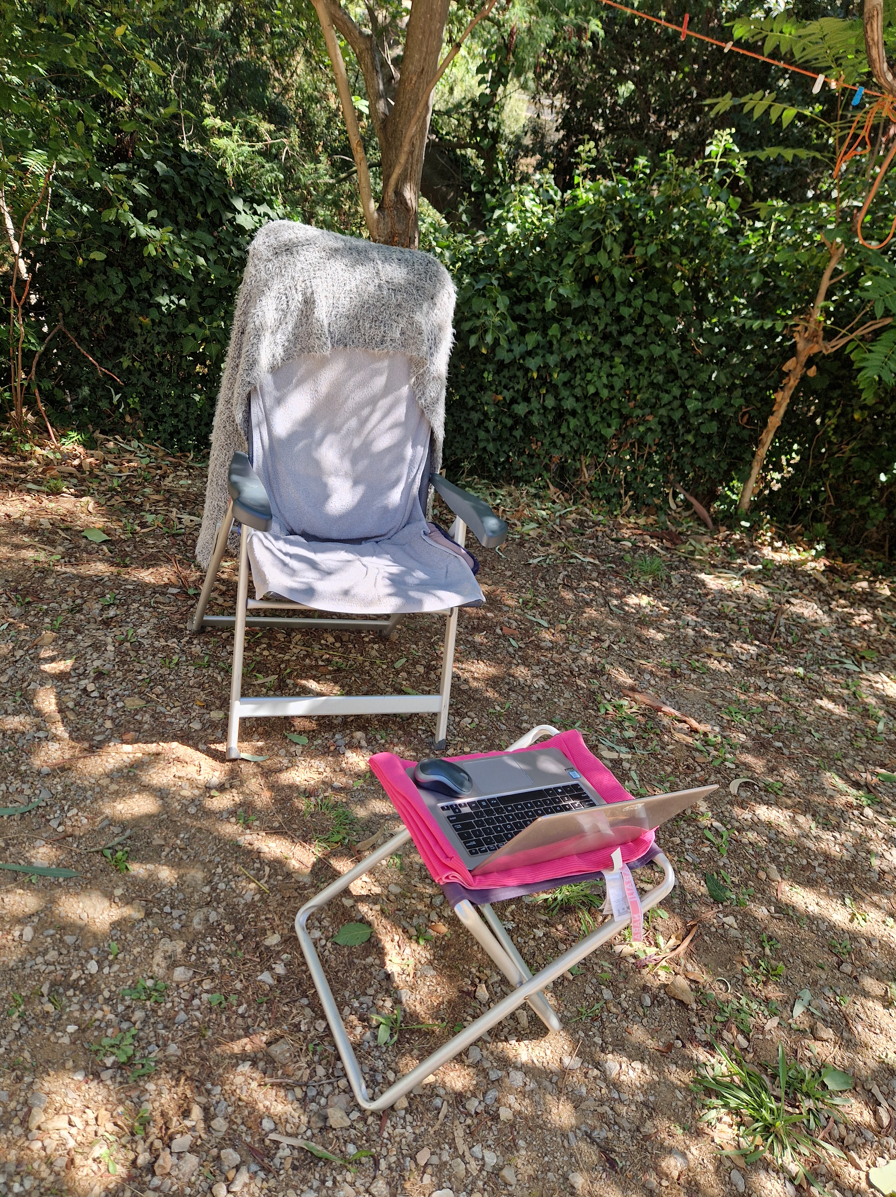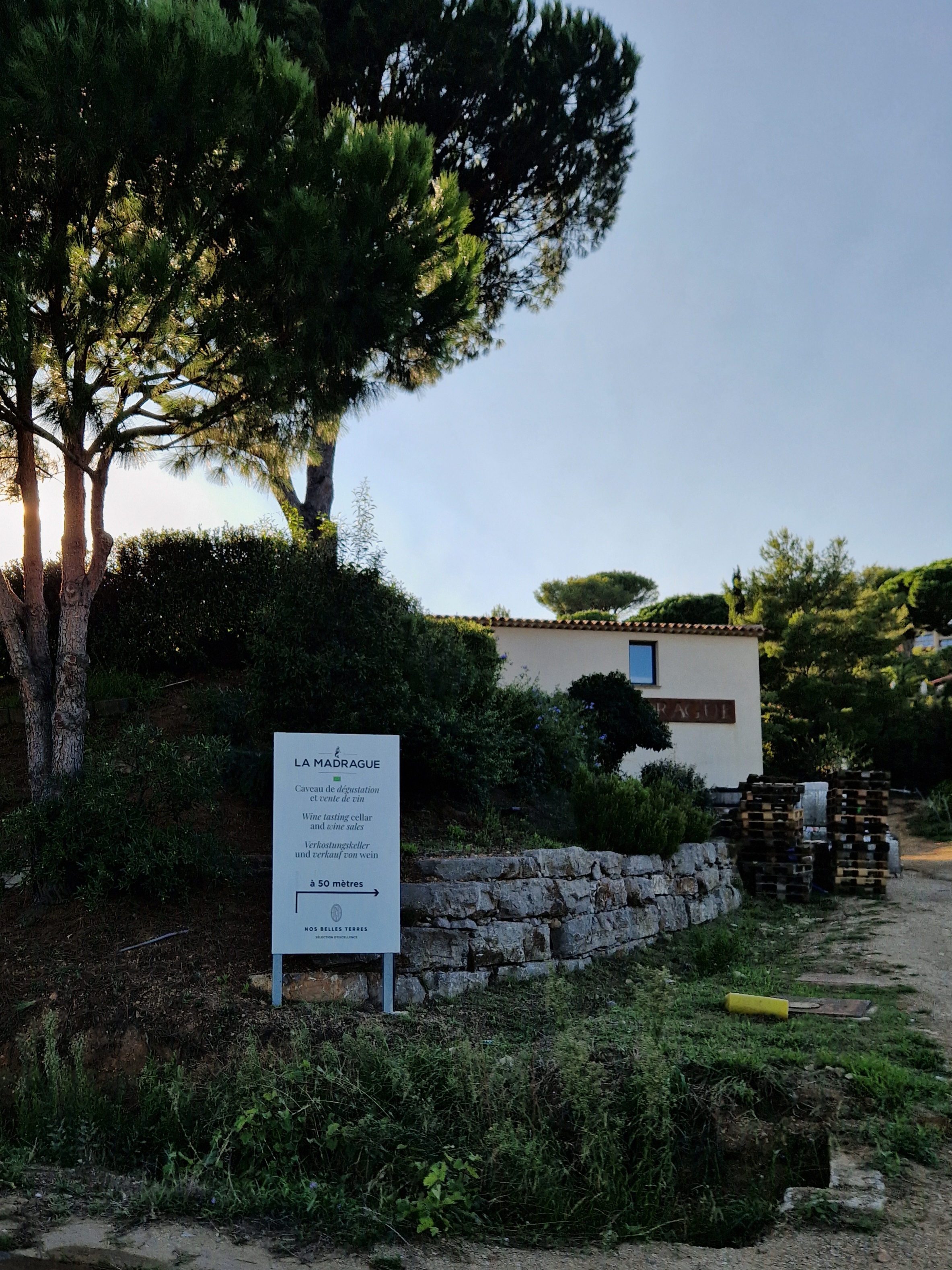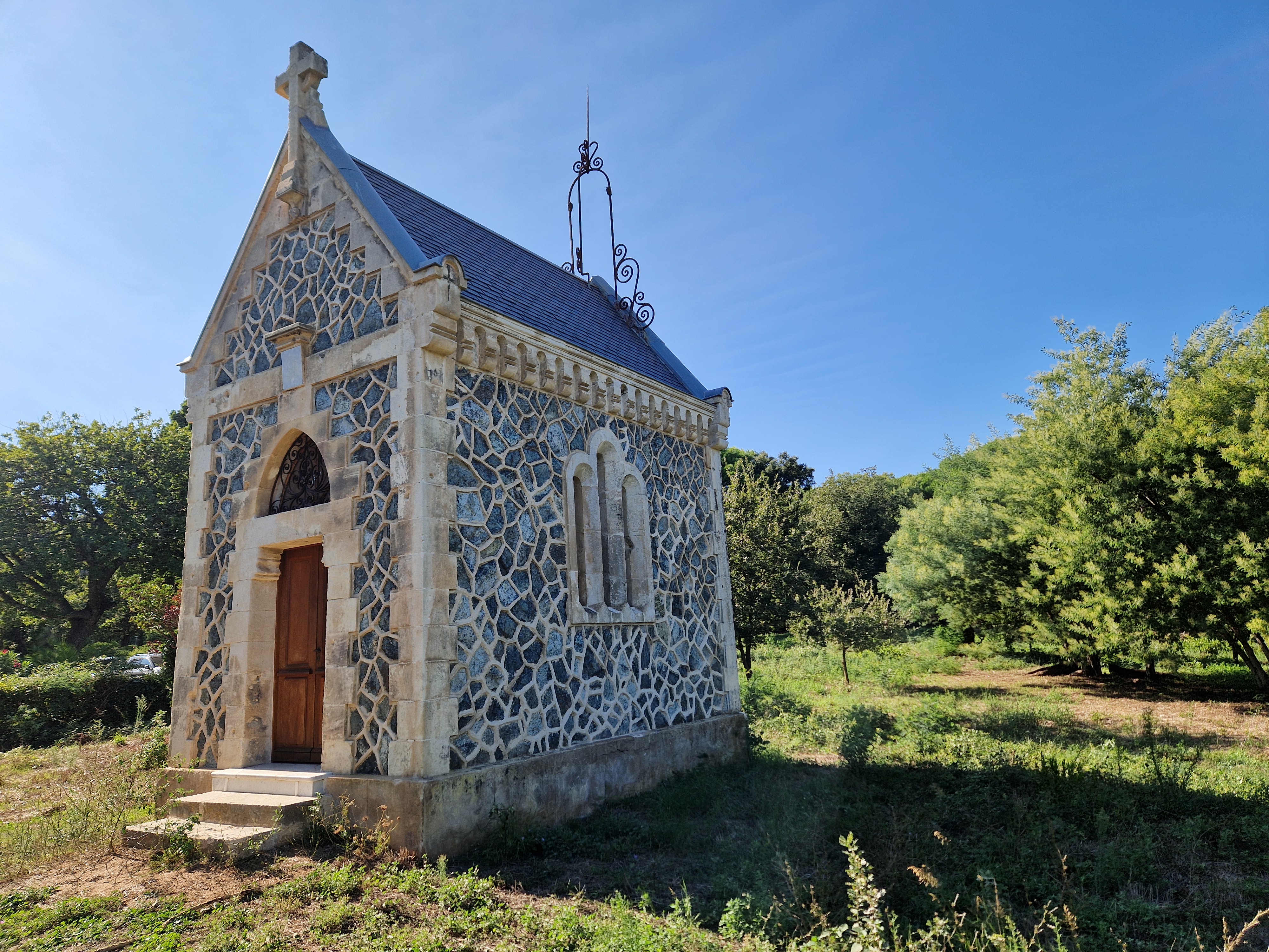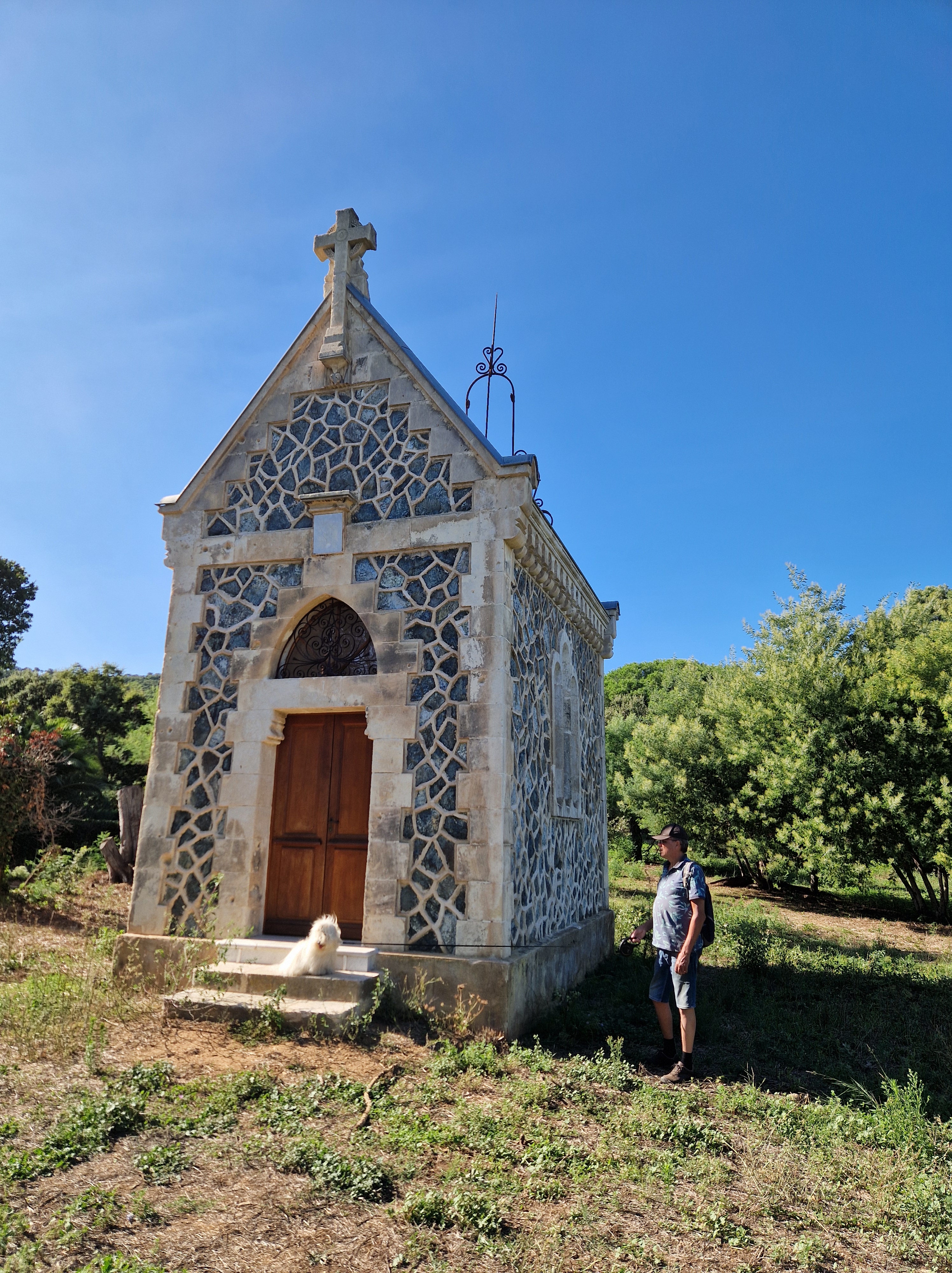 De zon doet hard zijn best, die wind is evenwel ijzig. Een eenzame parasol van het terras hangt tientallen meters verderop treurig in een boom. Het is een goeie dag voor het zwembad en de was. Als die droog is, wil Gijs ineens lopen. Ik heb ’n particulier kapelletje op mijn lijstje staan, Chapelle de Pardigon. Het is een klein dingetje en we kunnen niet naar binnen maar het ziet er fraai uit, met die blauwige natuurstenen lijkt het haast gemozaïekt.