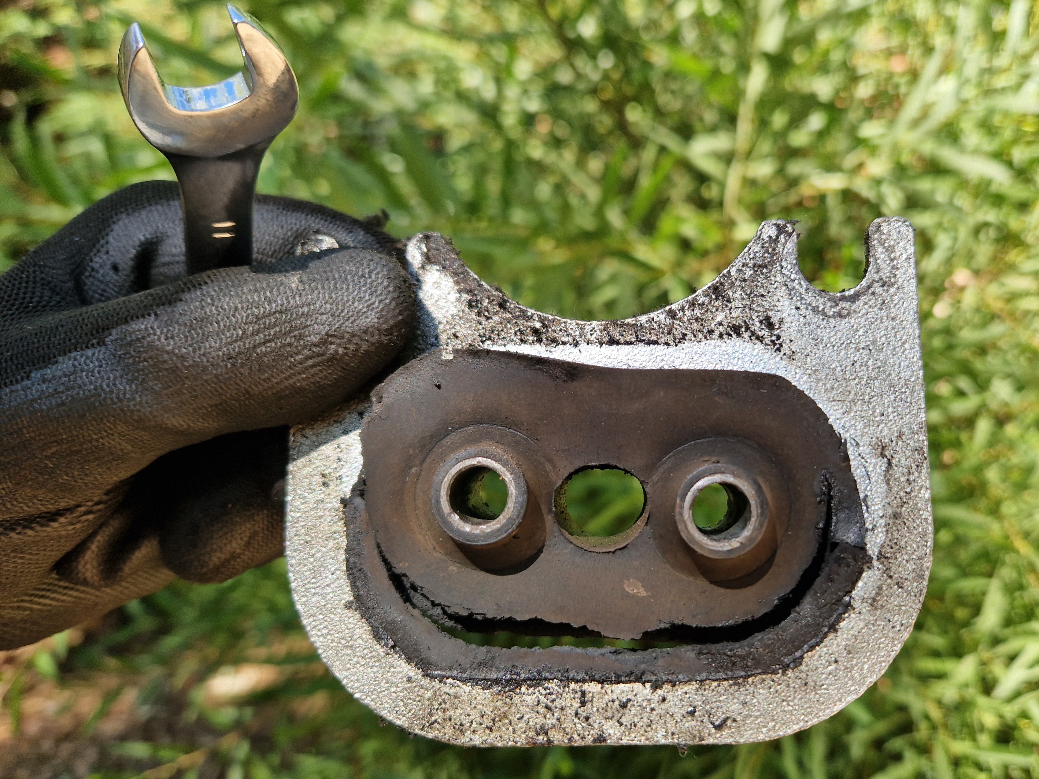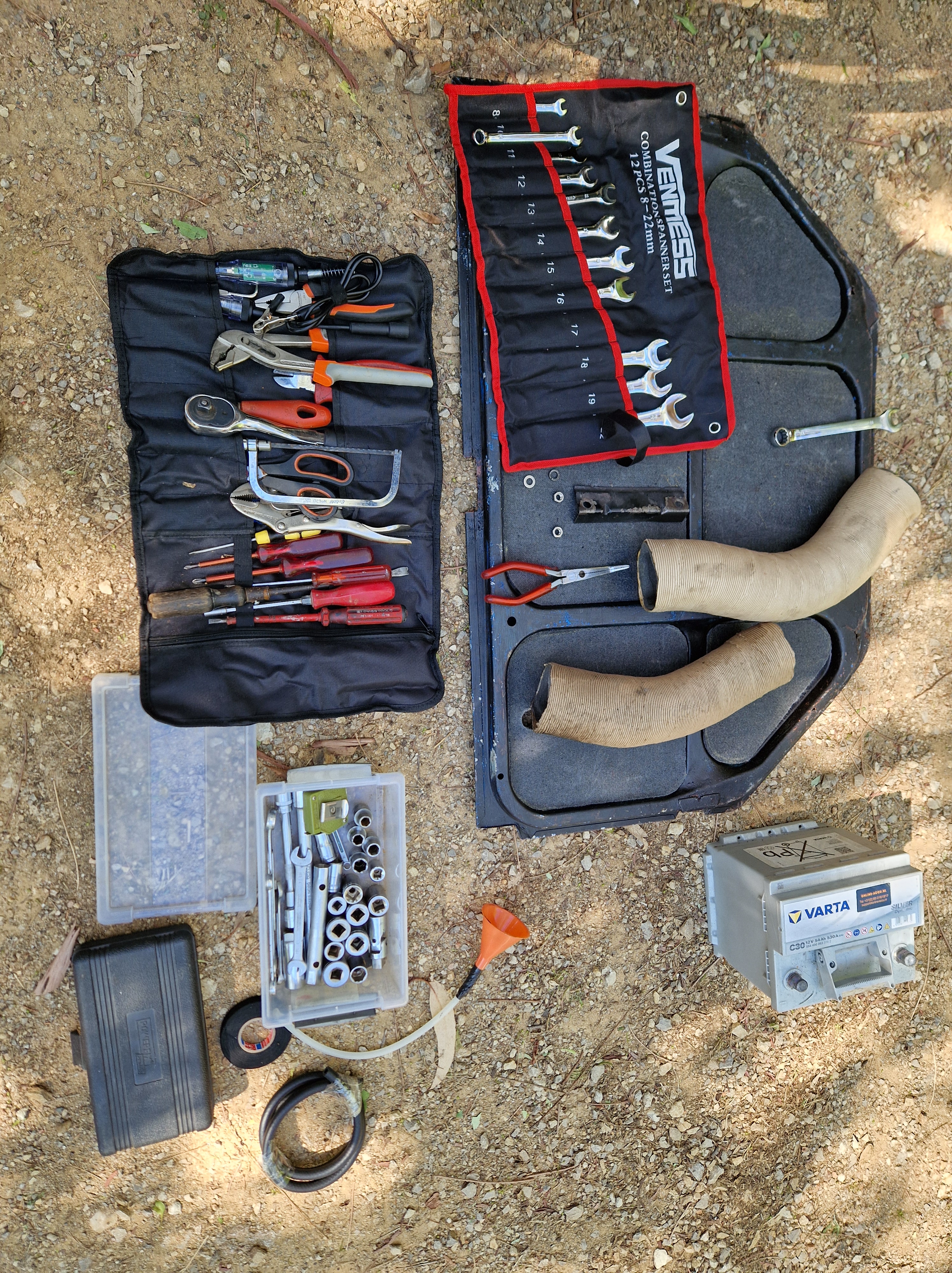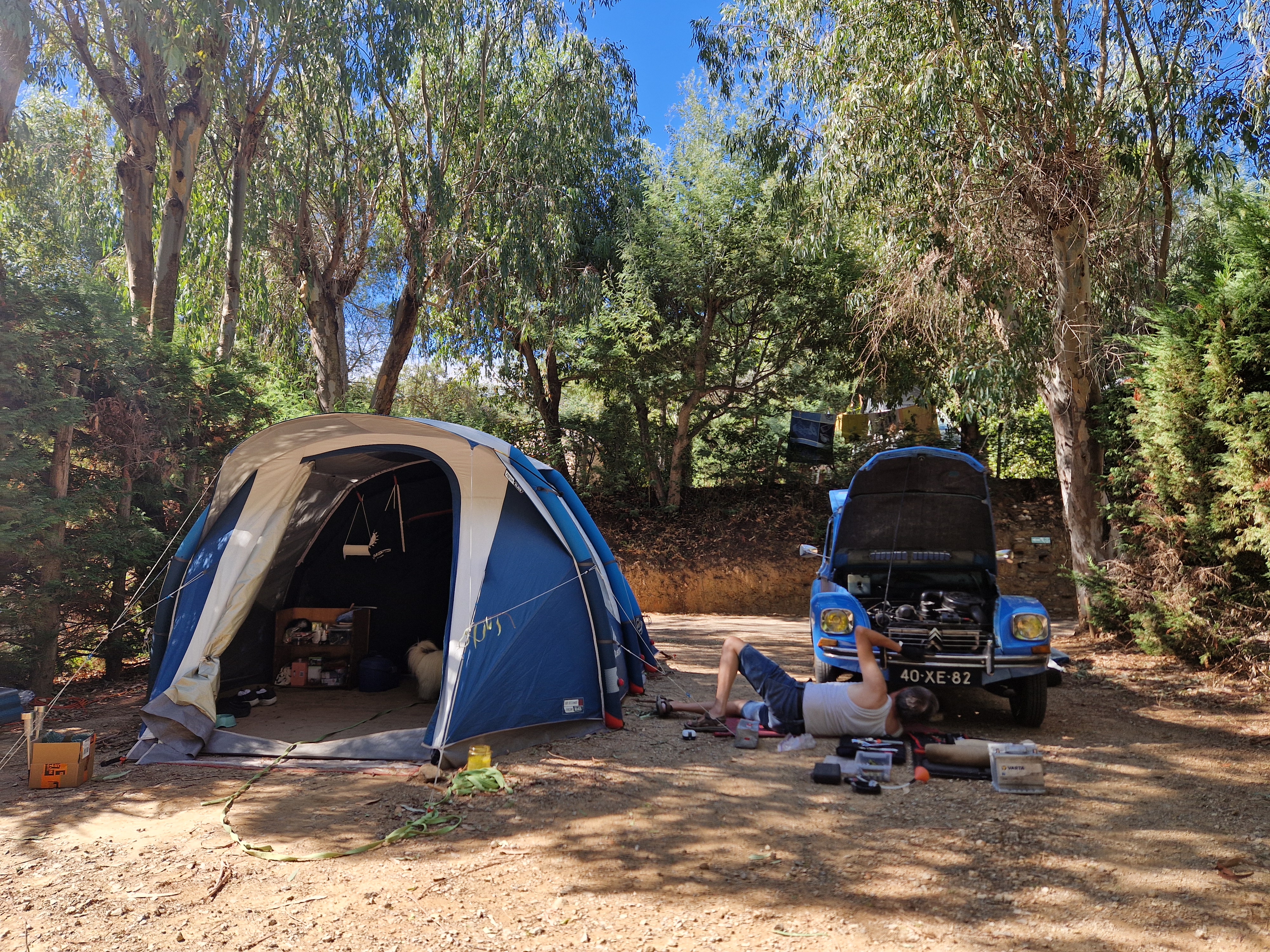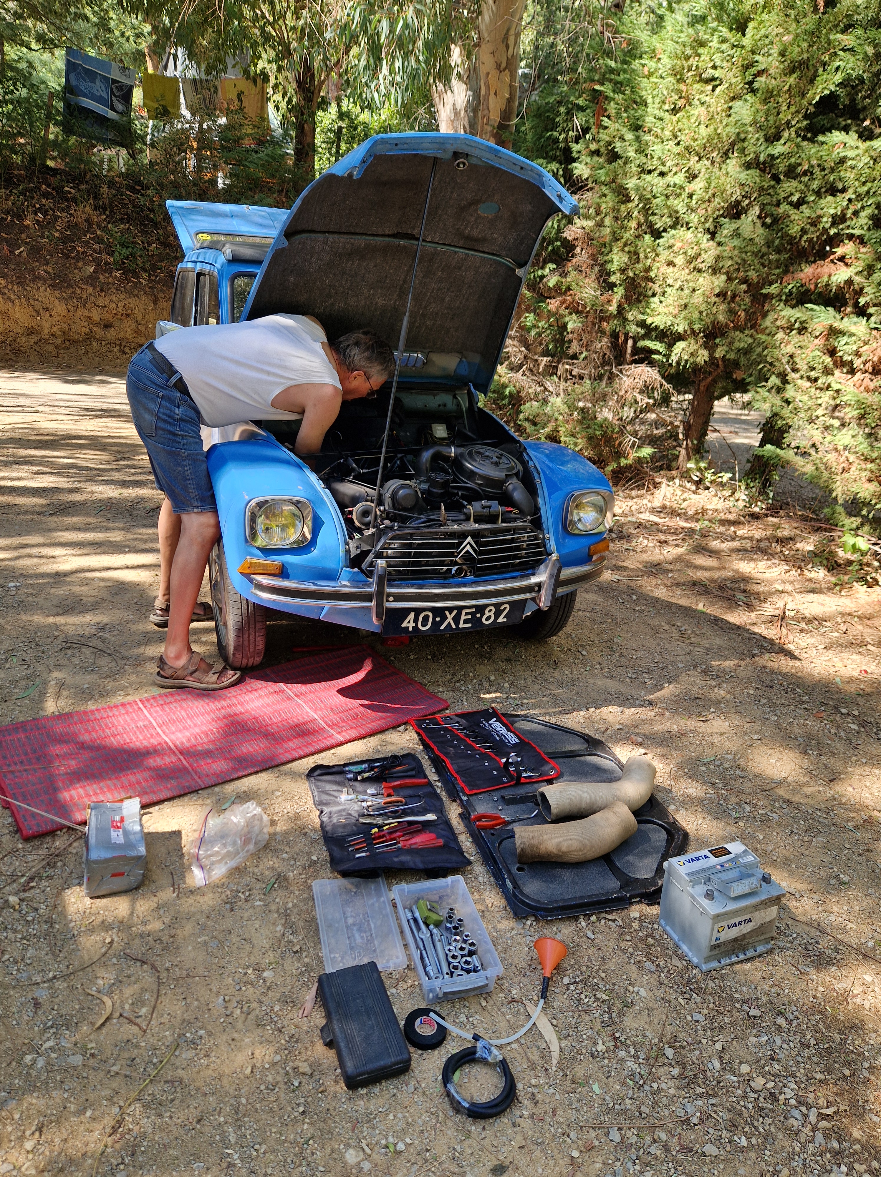 Gijs duikt onder de auto. Er is niets leuker dan knutselen aan je karretje op de camping. Zie je wel dat al dat gereedschap van pas komt. Met enig geweld komt de steun los, aan het gesmolten en gesleten rubber is goed te zien wat het ding te lijden heeft gehad van de bloedhete ritten boven zinderend asfalt. Geen wonder dat ons bij aanvang zo timide ezeltje zo ging bokken na verloop van tijd.