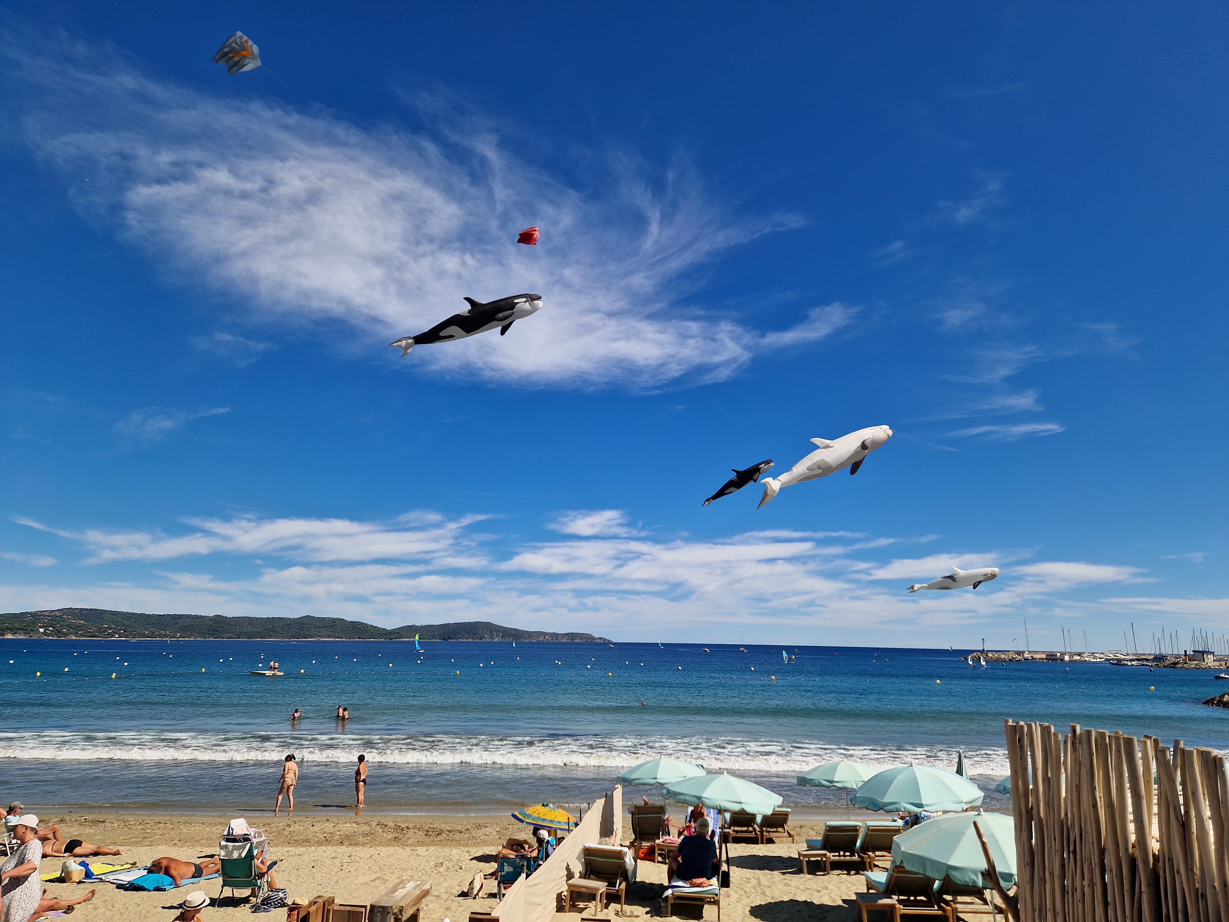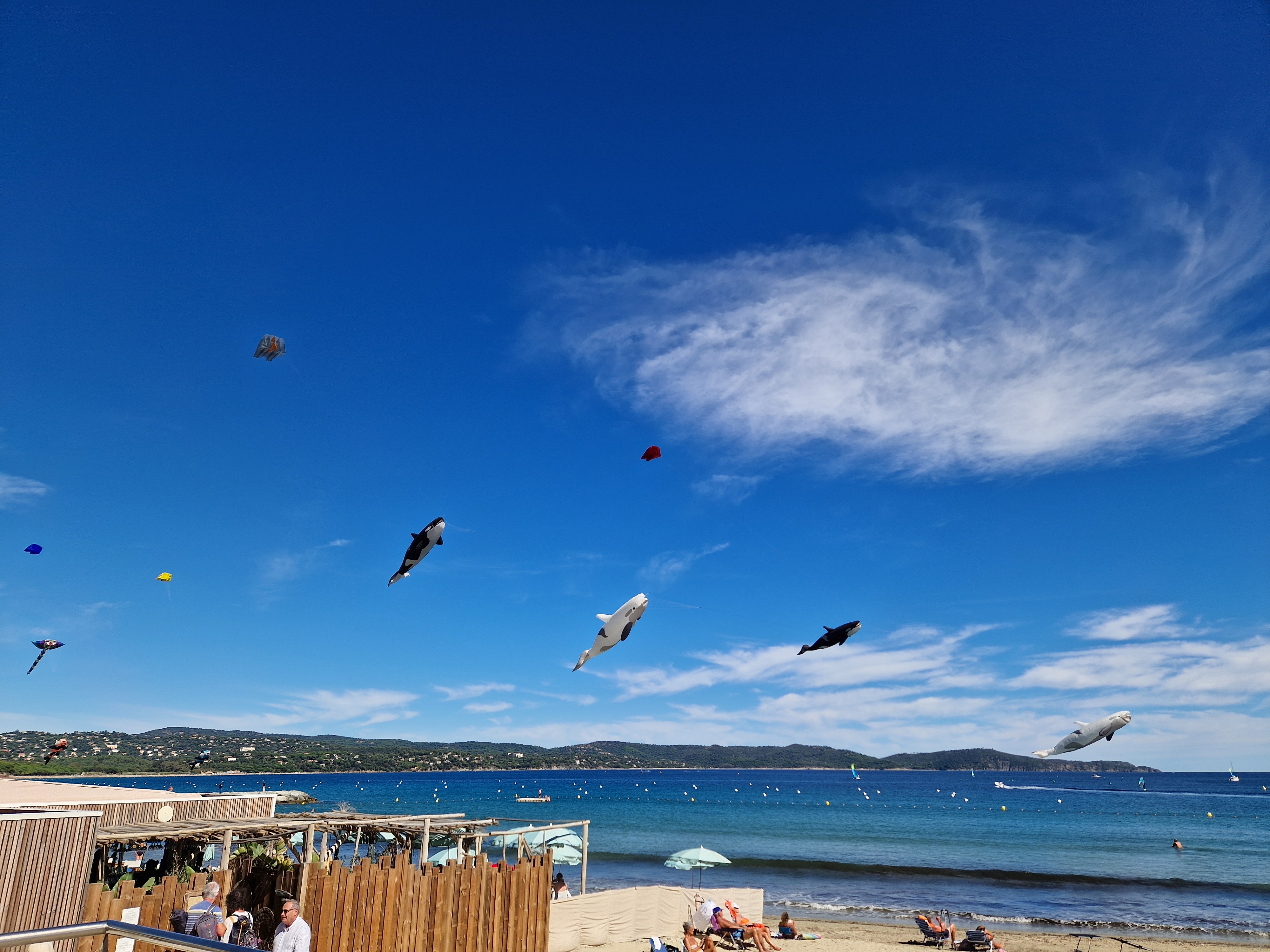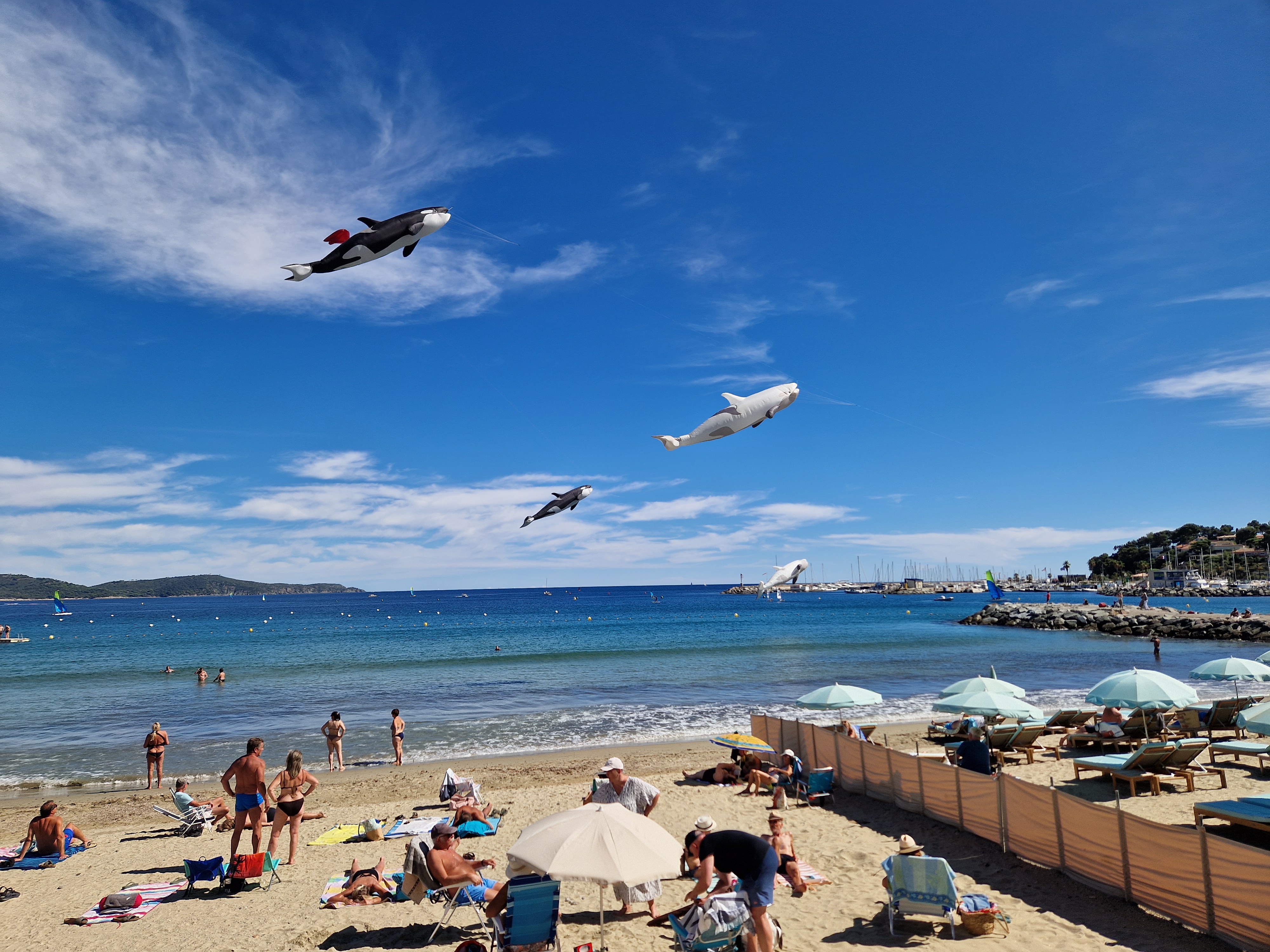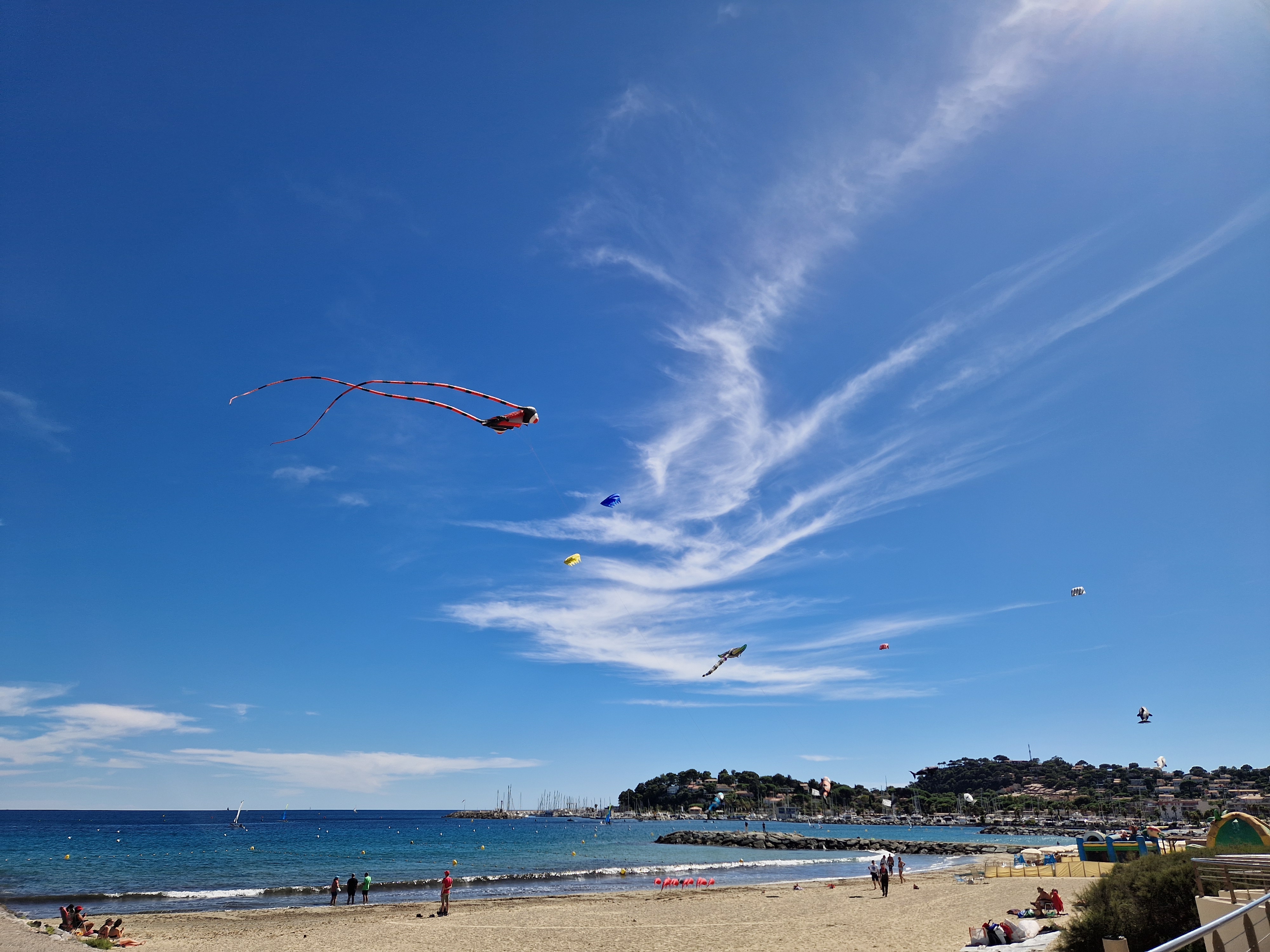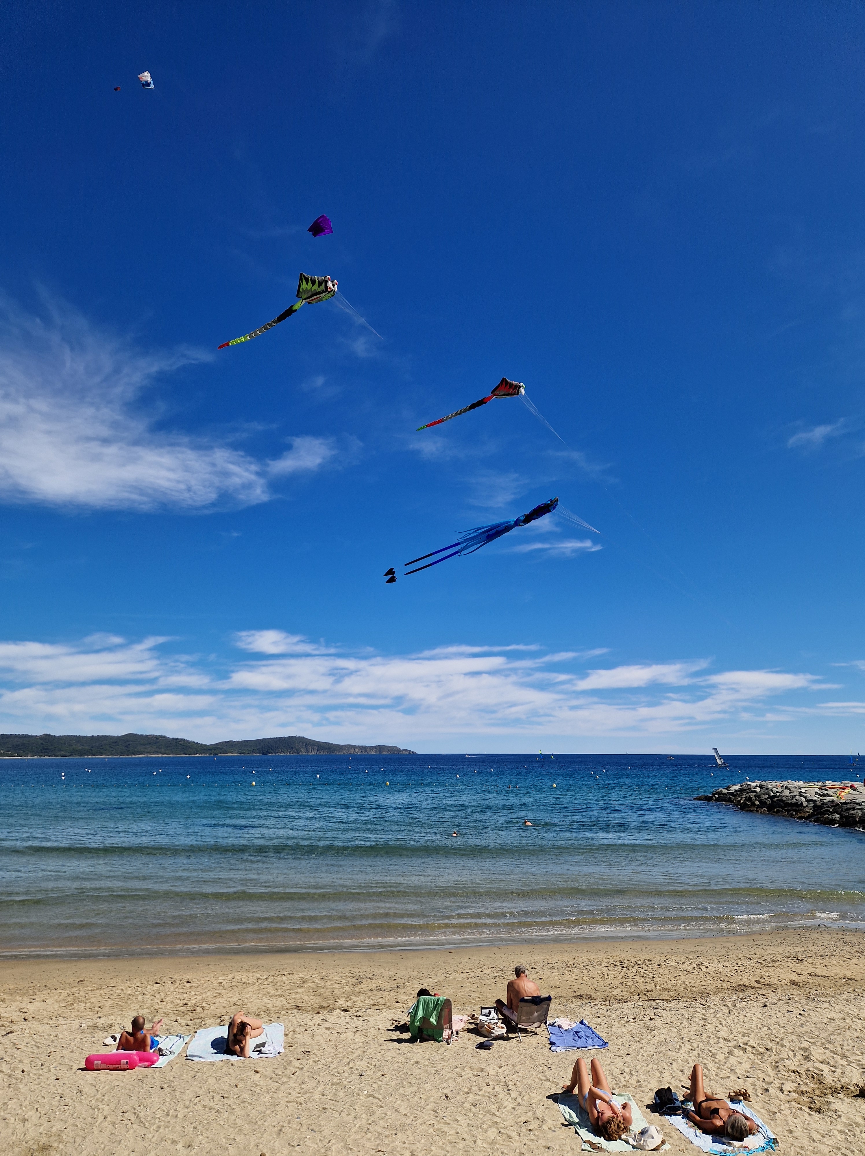 Na een stokbroodje gaan we het uitproberen. Beneden bij de boulevard hangt er van alles in de lucht, dat gaan we eerst bekijken. En niet alleen bekijken: op de boulevard moeten we ons een weg banen door de aftershaves en Douglas-uitverkopen terwijl vanaf het strand de vette kokoswalm van Nivea en Ambre Solaire ons in het gezicht slaat van de glimmende lijven, gebronsd tot zwartgeblakerd, die liggen te braden op het zand. De windveren wedijveren met de vrolijk vliegende vissen. Het lijkt wel zomer.