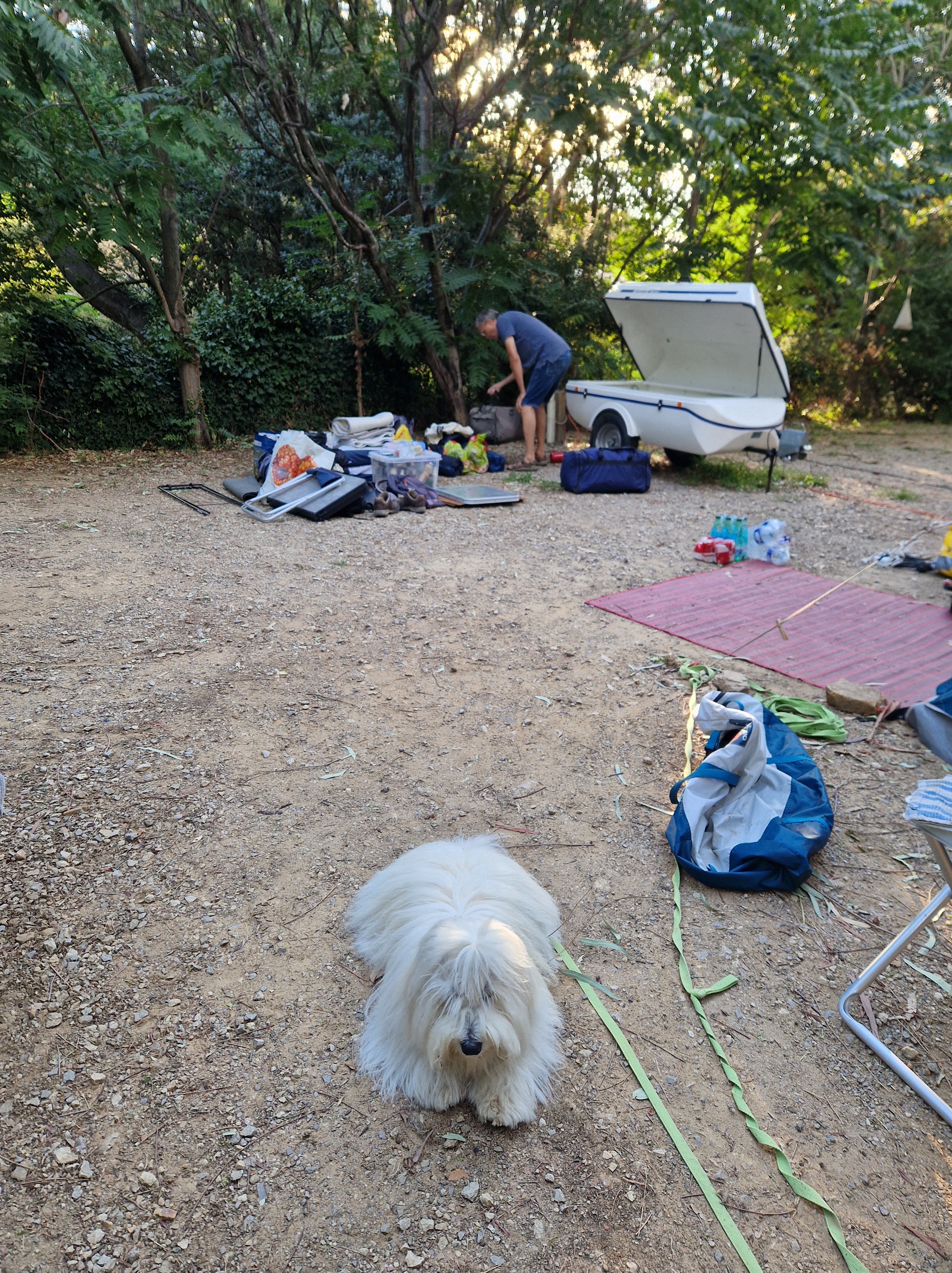 Eenmaal op de camping, ja, terug op La Grenouille in Goudargues, stribbelt het plastic zeiltje hard tegen in de wind. Niettemin is na anderhalf uur het hele hebben en houen weer op zijn plek geïnstalleerd. We staan, weliswaar loeischeef met veel boomstronken maar goed op de zon, het watertje kabbelt gezellig achter de tent en de klokken luiden boven ons hoofd. Terug van even weggeweest. We hebben misschien weinig fantasie en de plannen waren écht totaal anders maar de météo stuurt ons terug hierheen. Ook goed! De Pyreneeën, Sisteron en de Morvan blijven voor volgend jaar op het lijstje staan, die lopen niet weg.