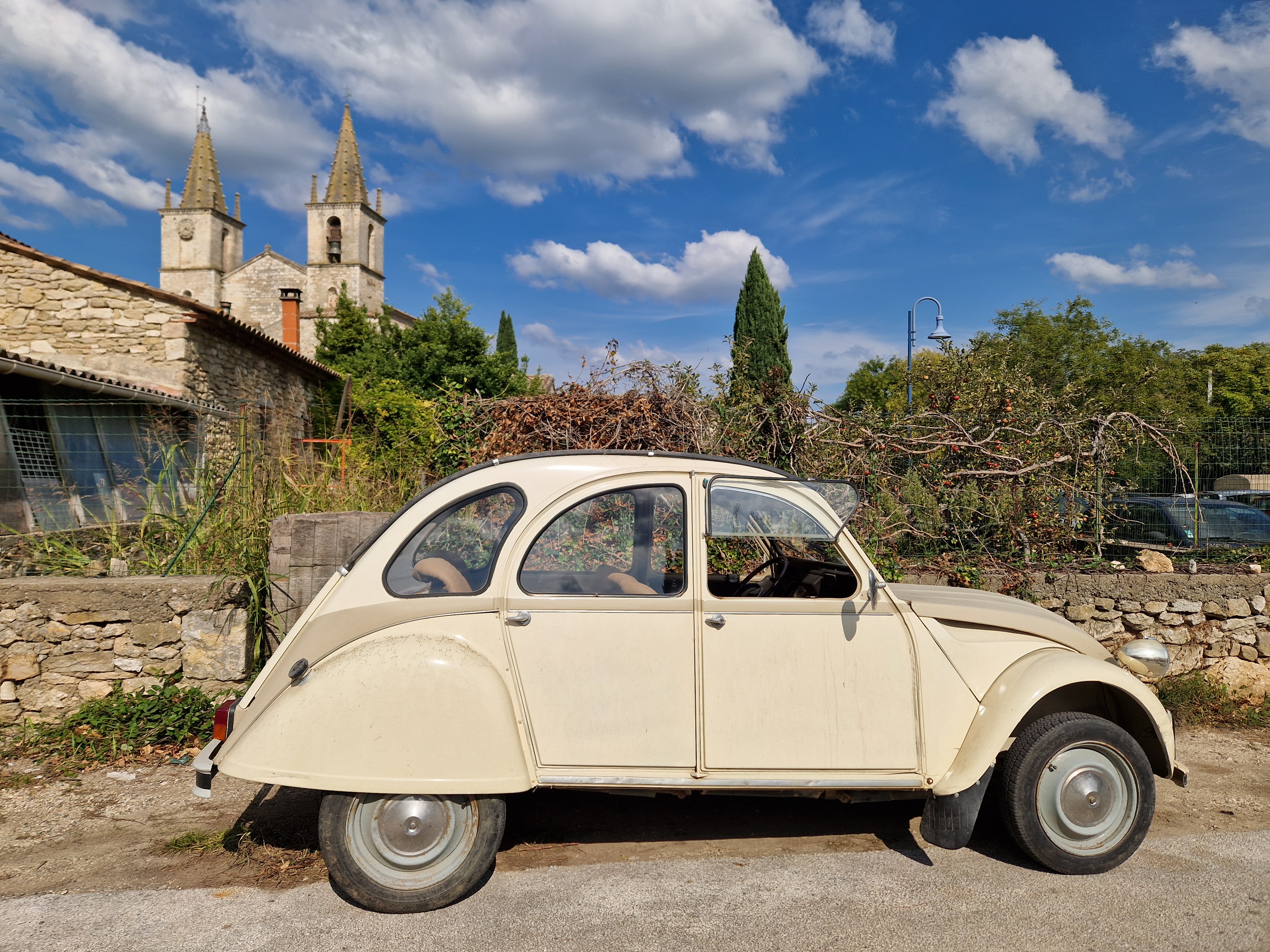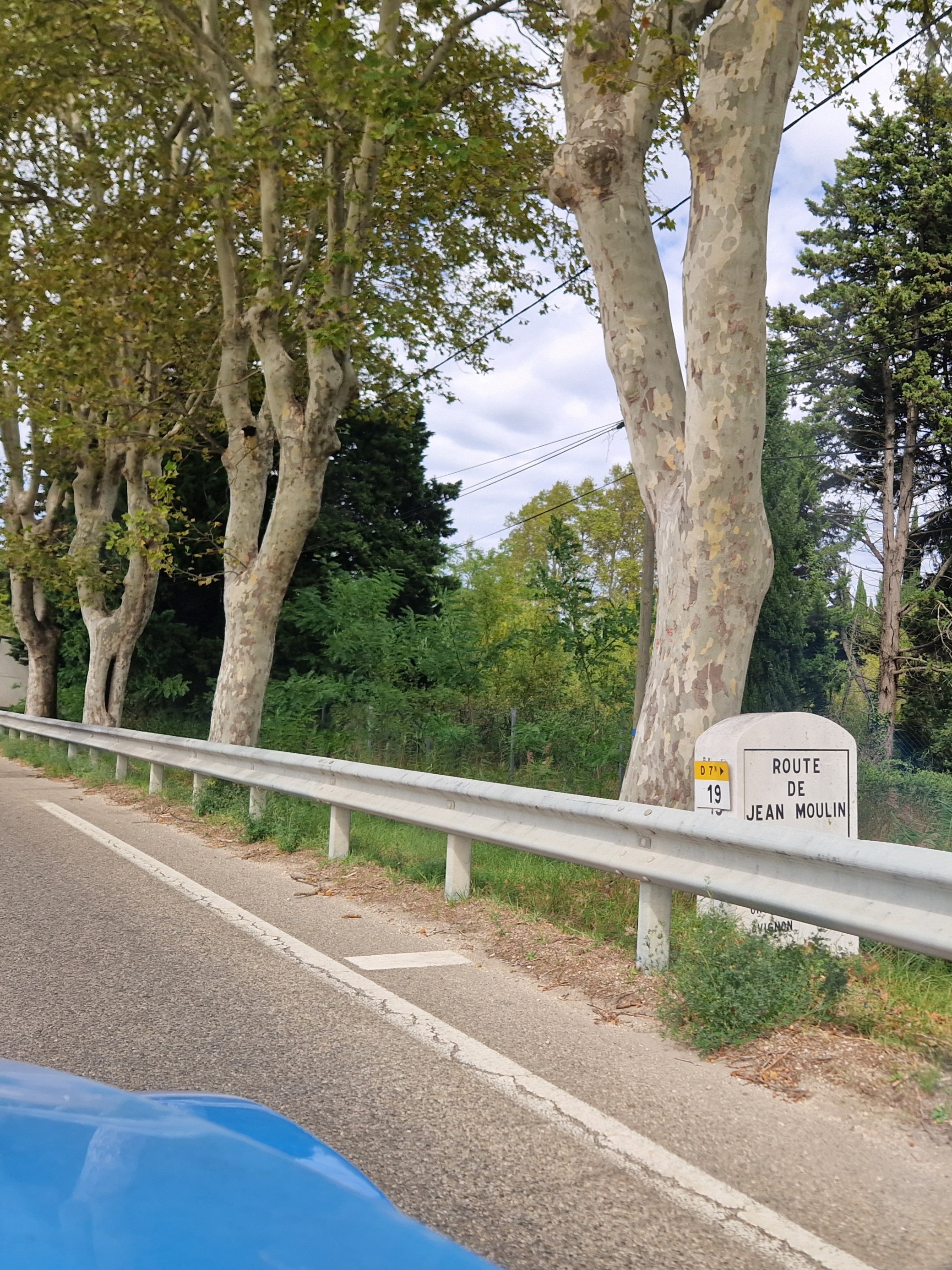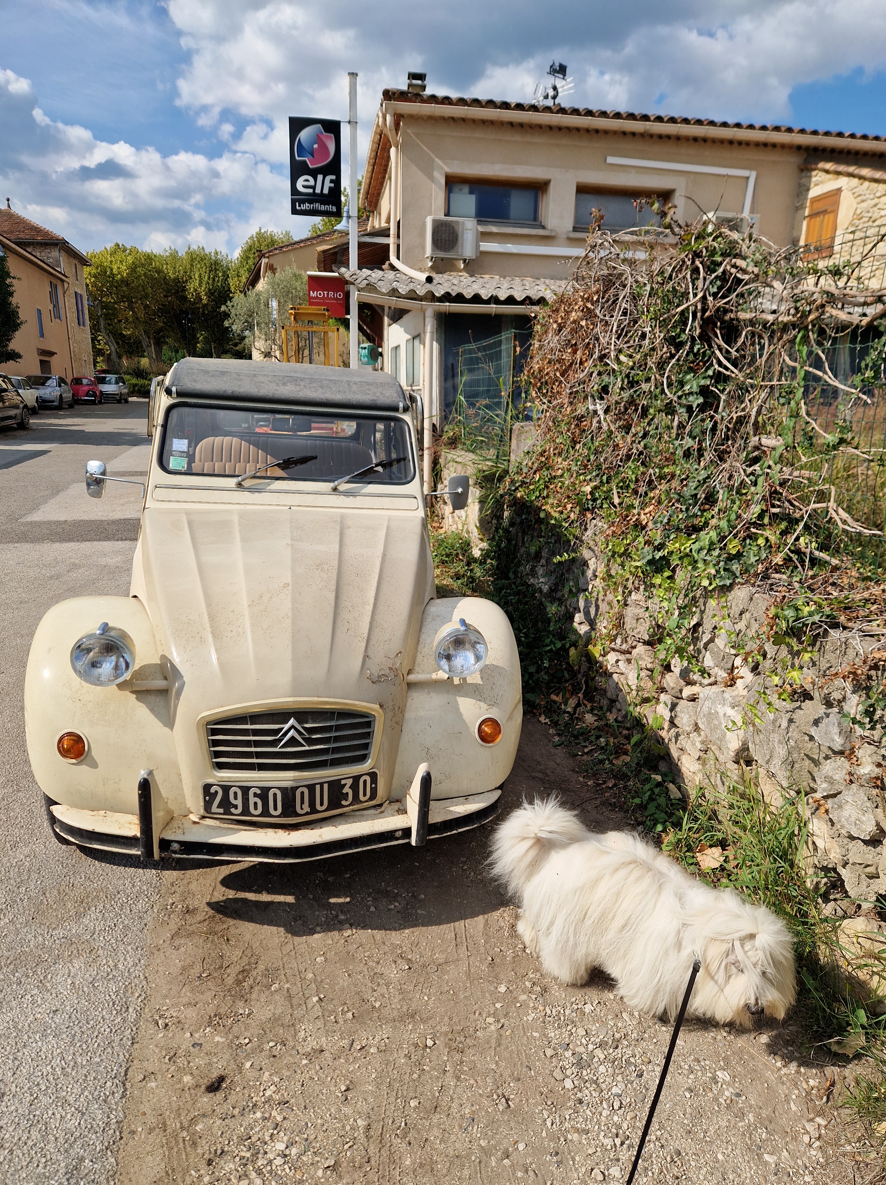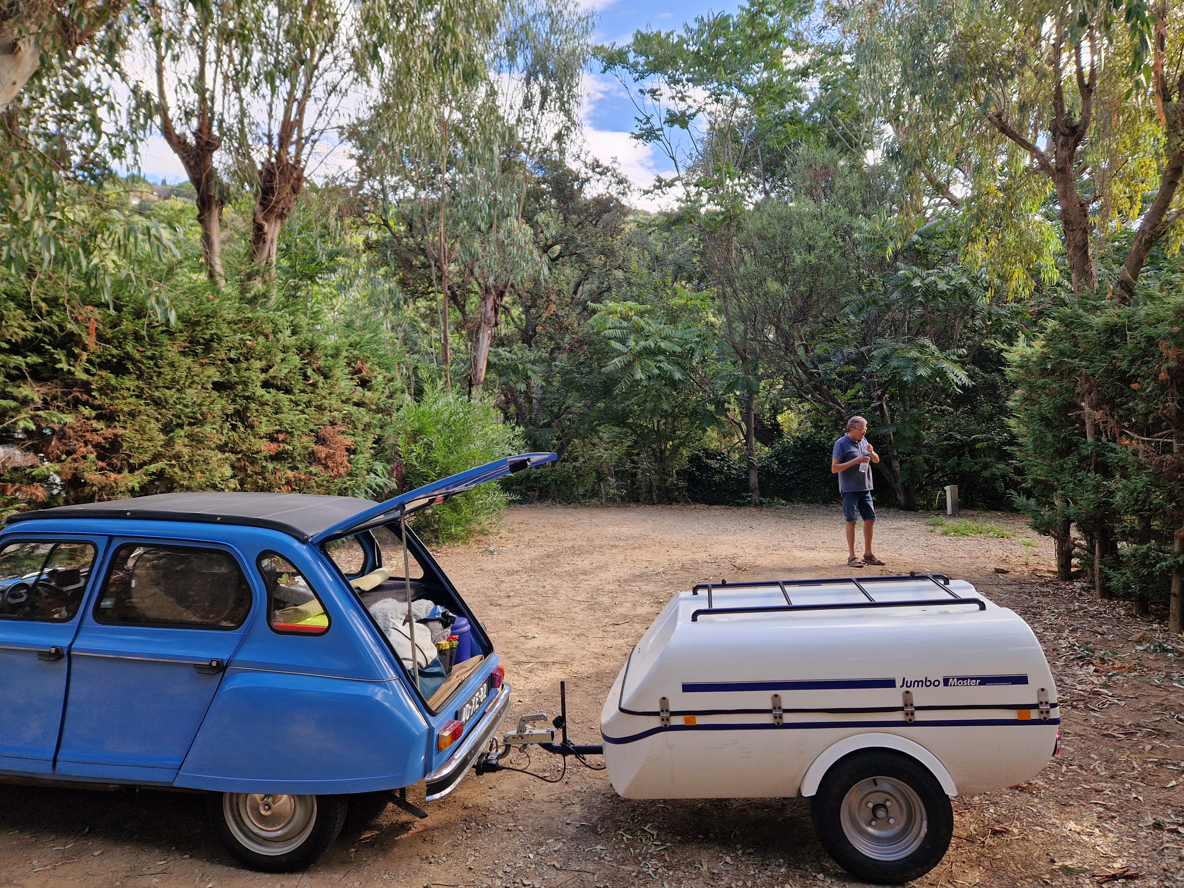 We hebben vanuit Cavalaire naar de volgende camping een gekke rit uitgezet, benieuwd wat ons vandaag te wachten staat. Via Le Lavandou en Toulon en dan bij Hyères naar boven. Ergens in een dorpje foutparkeren en terwijl Gijs brood haalt sta ik nieuwsgierigen te woord: “Ja, we zijn hiermee helemaal uit Nederland gekomen.” Die vraag wordt zo vaak gesteld. Een rebbelende meneer, het duurt even voordat ik hem versta, vertelt een heel verhaal. Hij had een gele Dyane uit hetzelfde bouwjaar. We hebben een aanknopingspunt. Een oudere dame vertelt dat ze in 1972 uit Spanje naar Frankrijk is gekomen in een 2CV. Je leert op deze manier wel tellen in het Frans: bouwjaar, leeftijd, kilometers. Als Gijs terugkomt met het brood, komt de man van de gele Dyane aangesneld om trots een foto te laten zien van zijn toenmalige auto. Inderdaad een prachtkarretje. “Blijft mooi hè, maar het is hard werken, rijden in zo’n eend!” zegt de man.