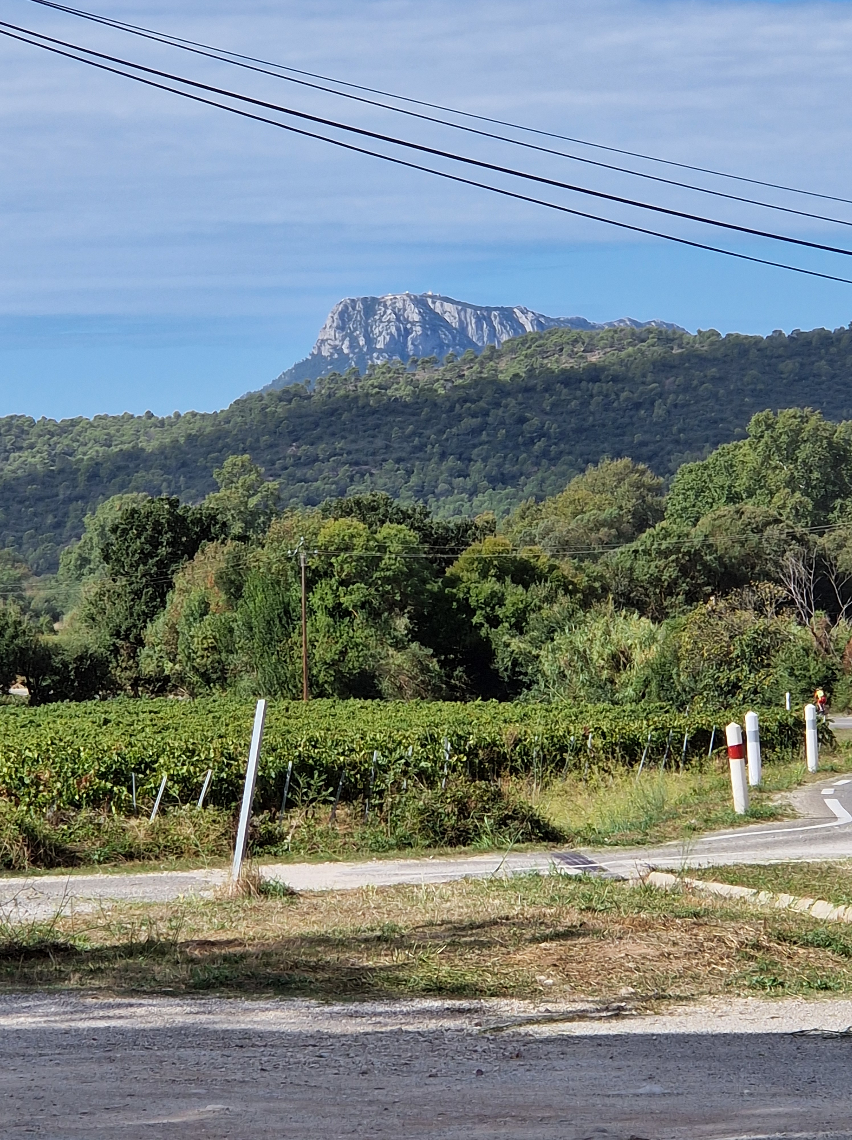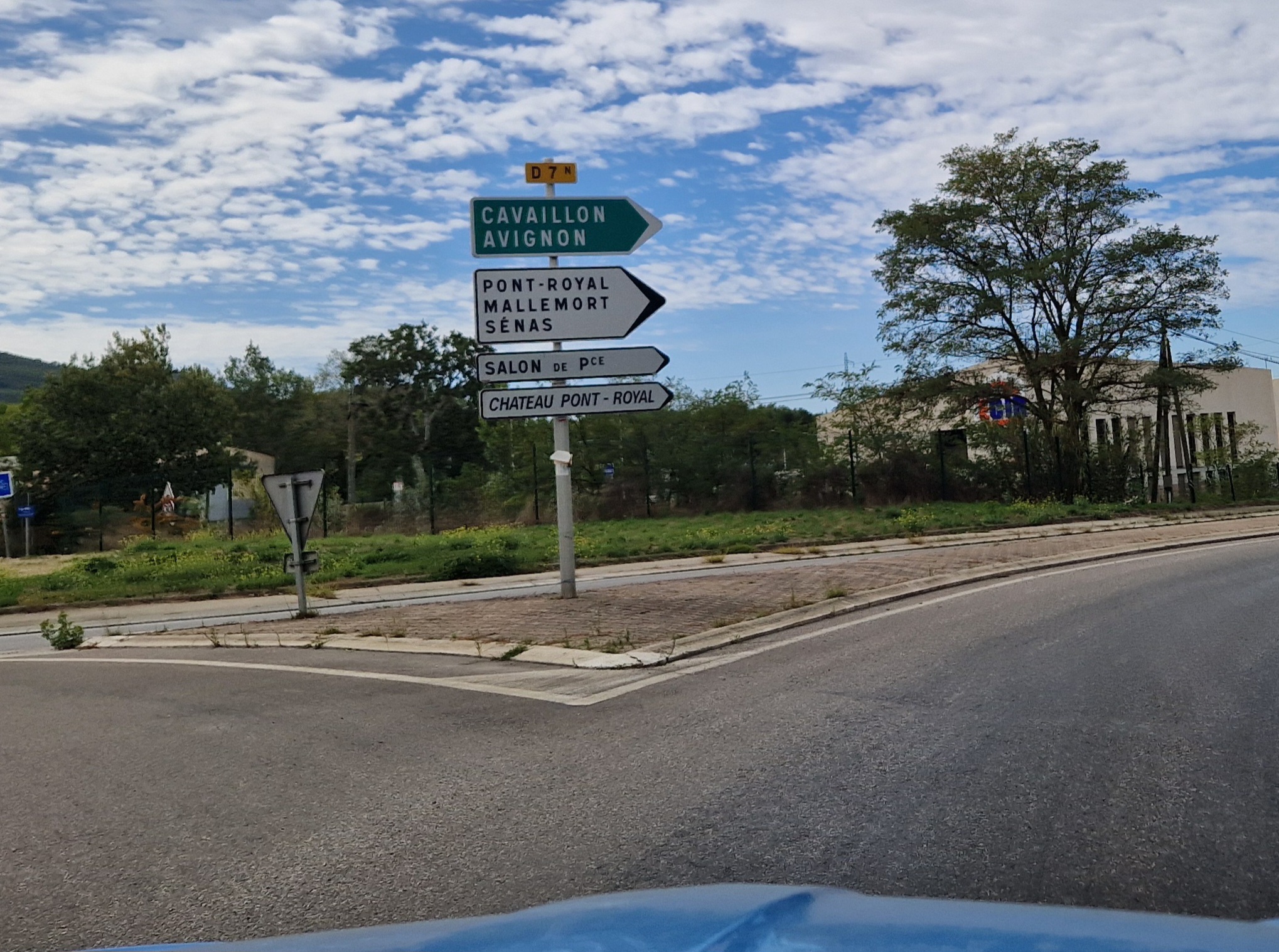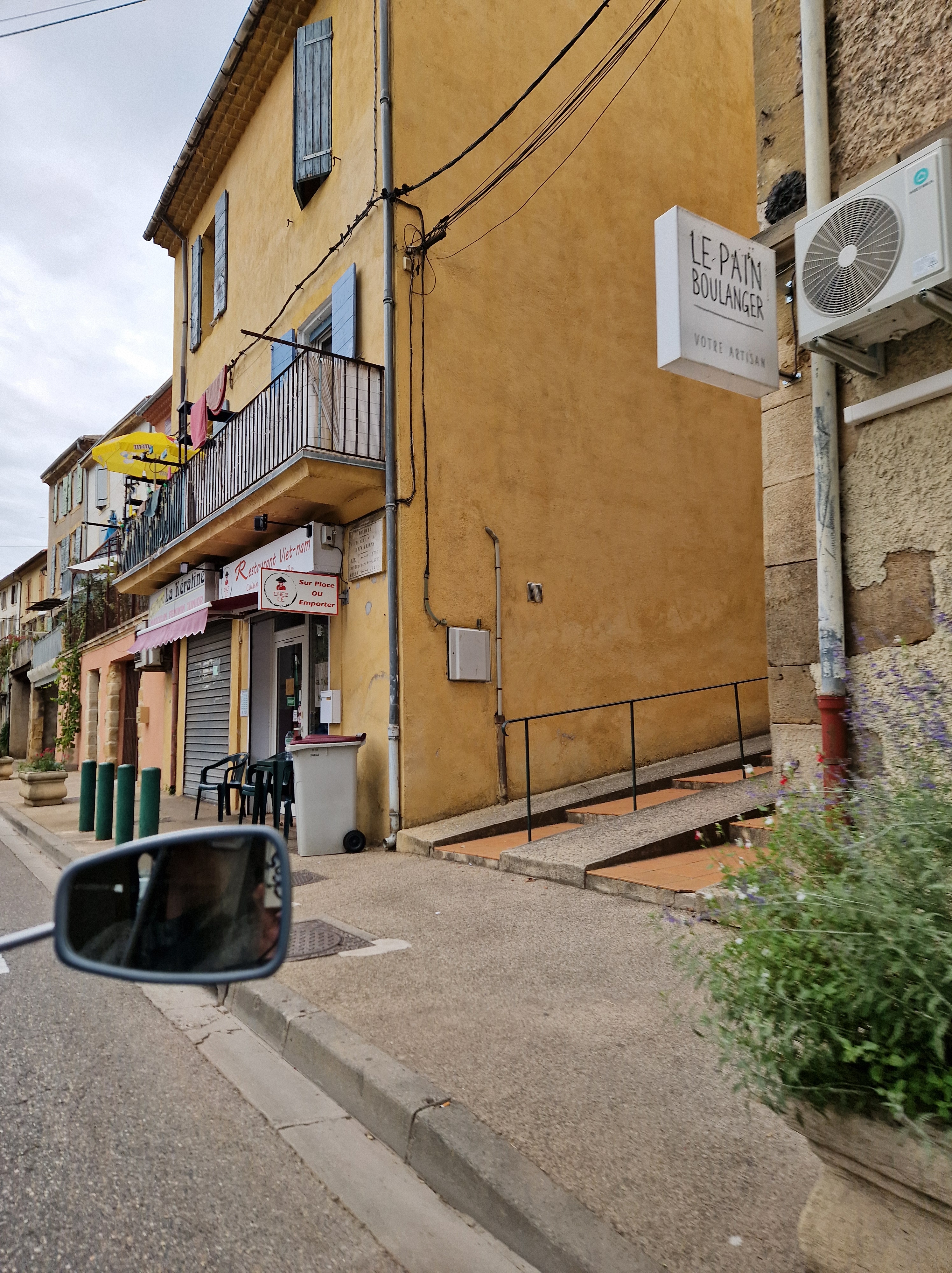 Met uitzicht op de Mont Farron drinken we koffie. Verder omhoog, via de smalle straatjes van Puget Ville en een col door het bos bij Rocbaron naar Brignolles. Verre vergezichten zonder een plek om voor een foto te stoppen. Daarna stukken N7 en D3. We volgen een kanaal terwijl aan onze andere kant de Durance slingert. Komen door allerlei stadjes, hebben uitzicht op de rotspartijen van La Sainte Baume bij St. Maximin de la Ste Baume, tuffen door Tourves en duiken met de neus de mistral in.