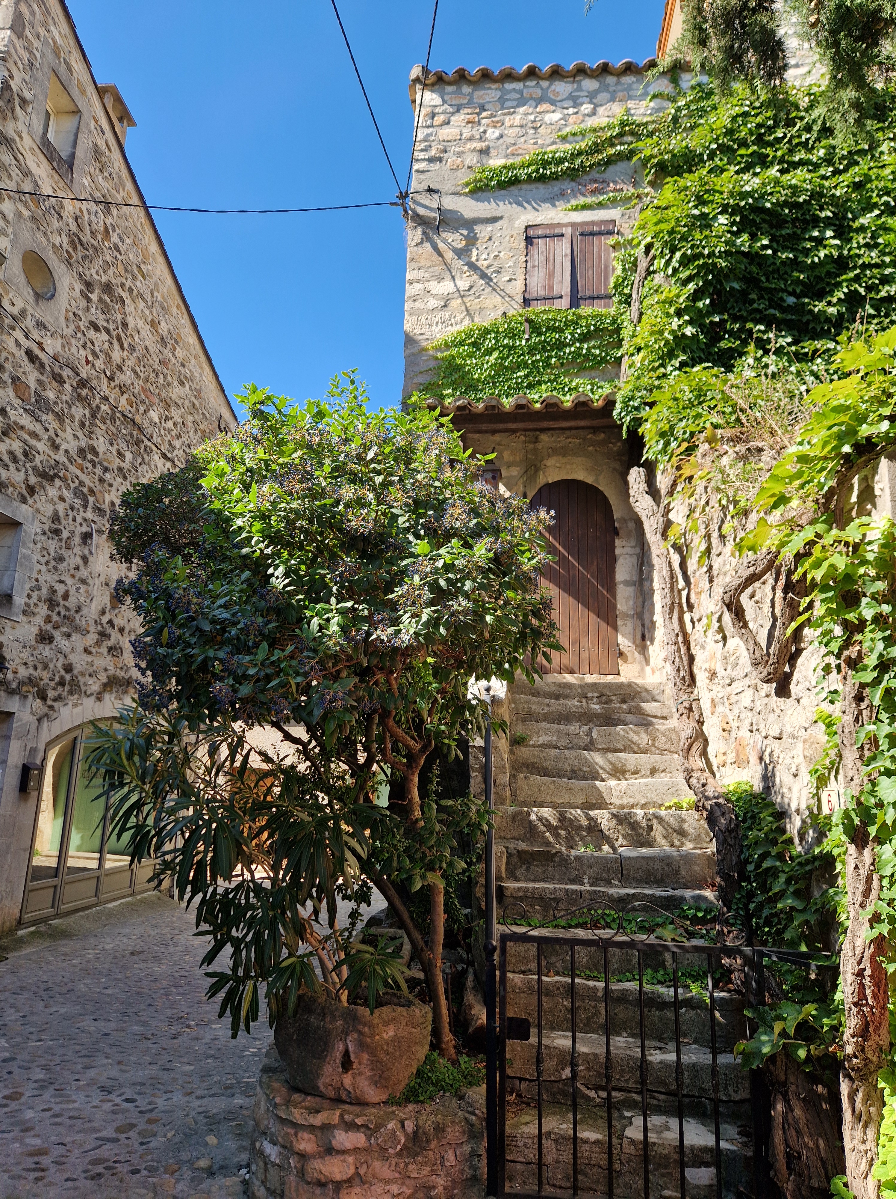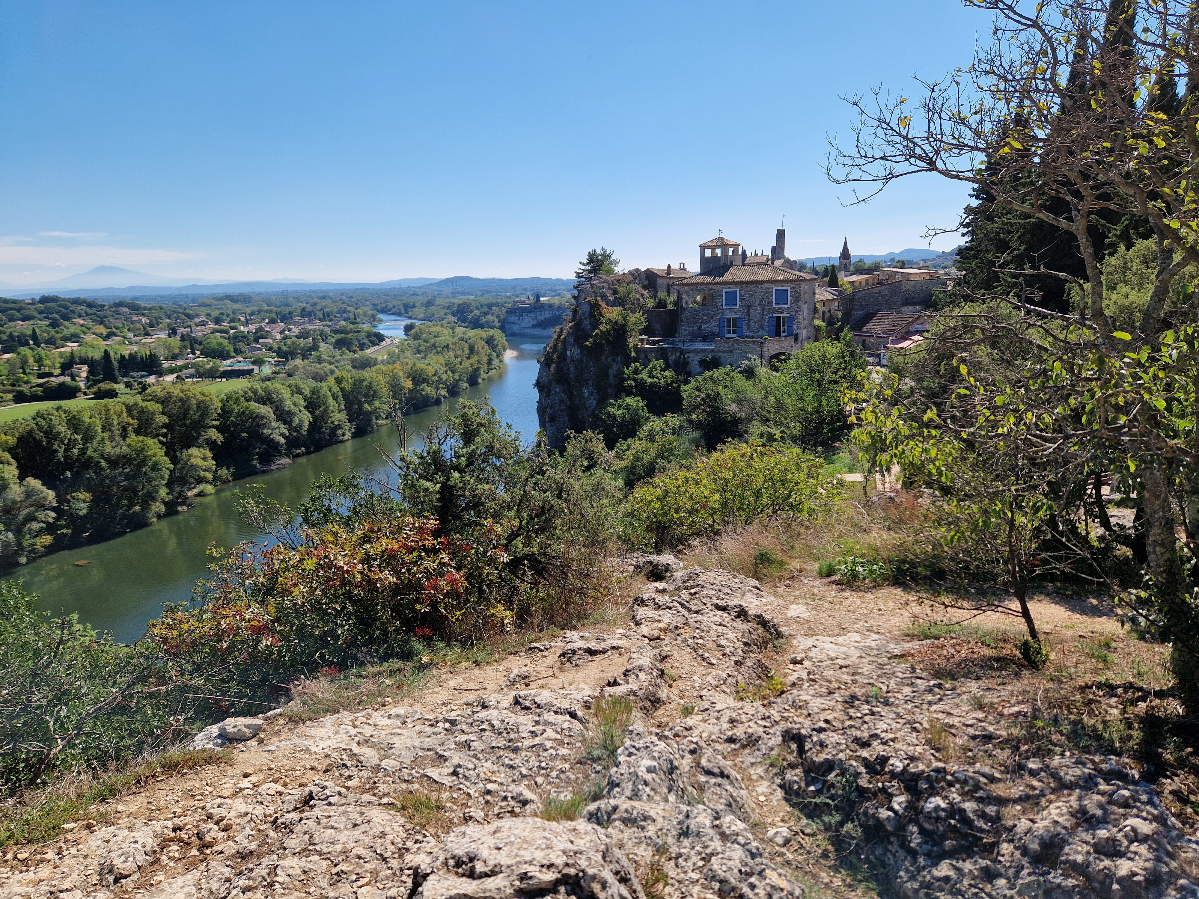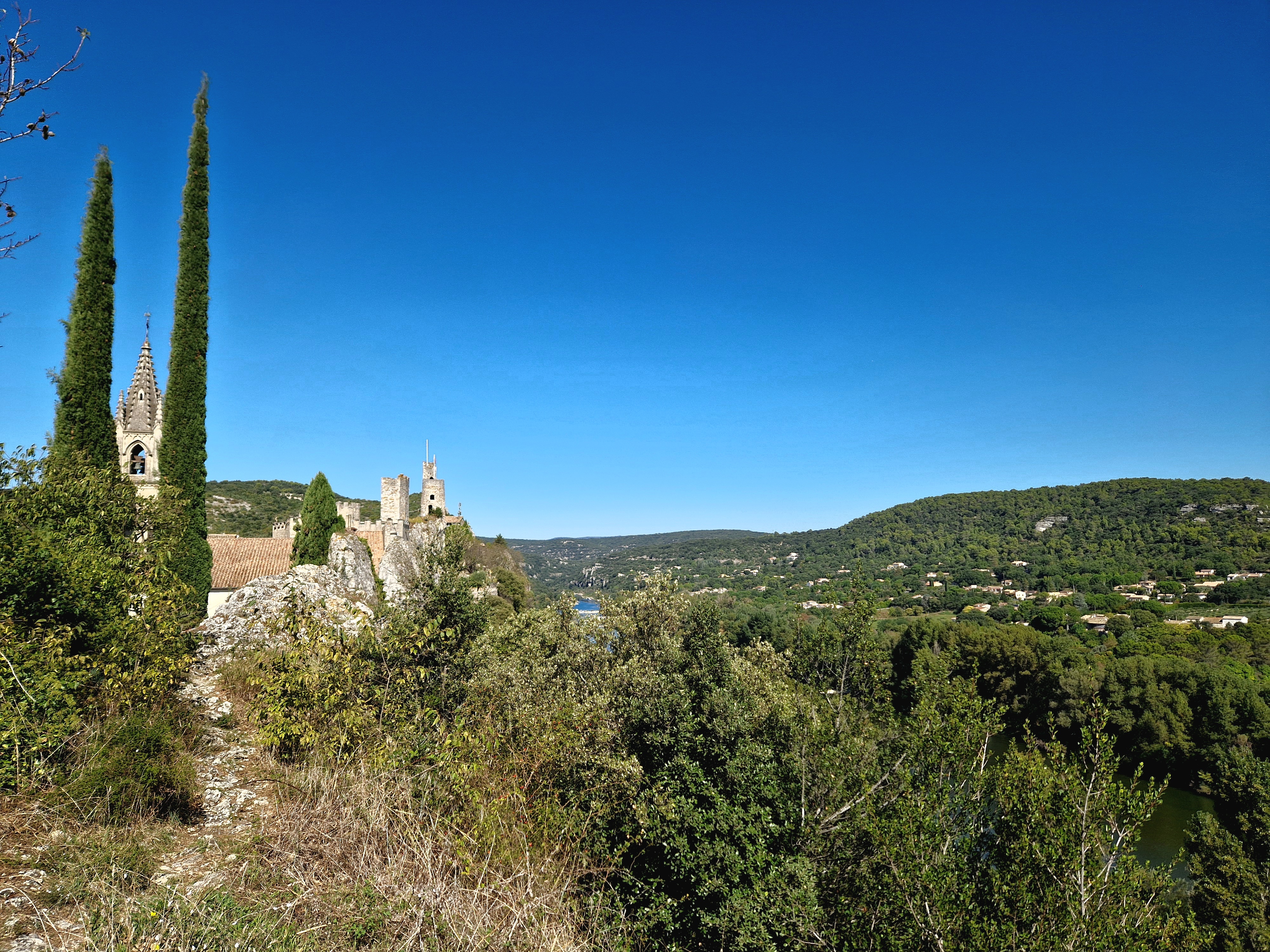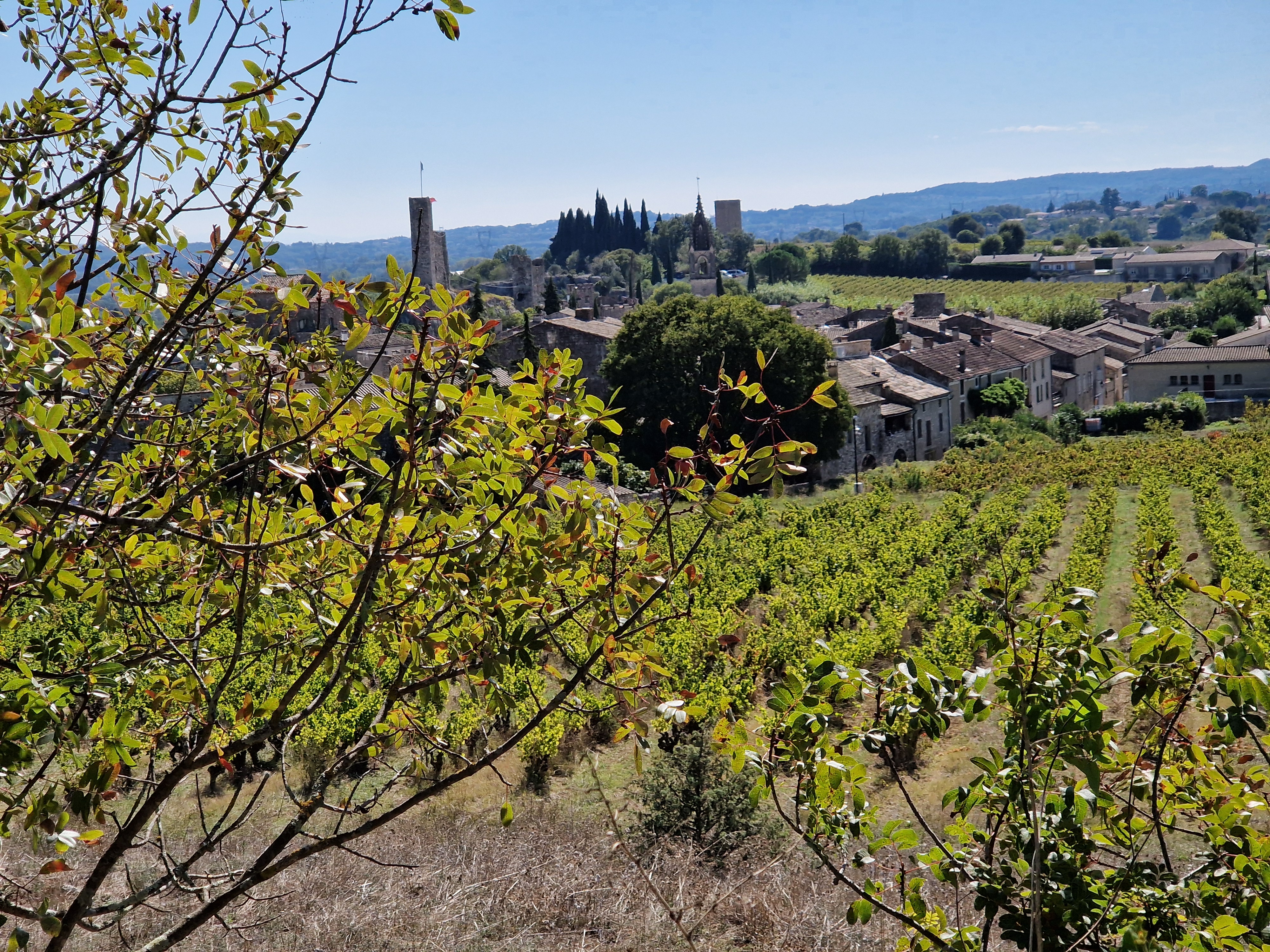 Langs de muren met zicht op de Ardèche klimmen we hoger en hoger tot we op het stadje neer kunnen kijken. Eenmaal beneden zijn we toe aan koffie, met een stukje Fondant aux Marrons, fait maison. Crimineel, wat een stuk. Zelfs met zijn tweeën krijgen we ‘m amper op. Lunchen hoeft niet meer. Tandenpoetsen wel, voor zover er nog glazuur op onze tanden zit. We lopen een ander klein rondje door de straatjes om de kastanjes te laten zakken voordat we een kronkelroute terug uitzetten via St.-Christol-de-Rodières. Lekker slingeren over een soort fietspad waar we gelukkig geen tegenliggers tegenkomen. Dit is leuk, dit is vakantie. Zo hoort het.