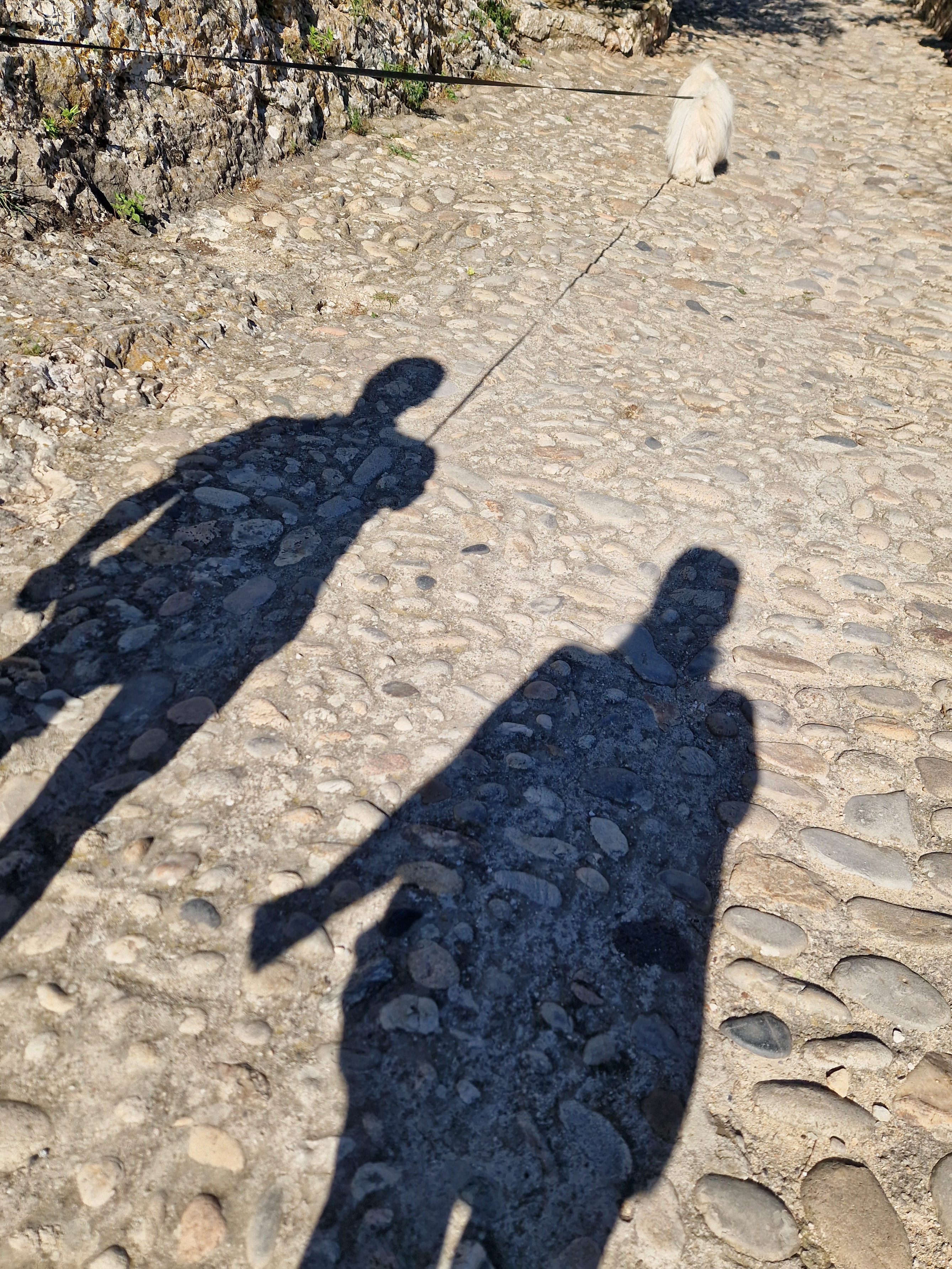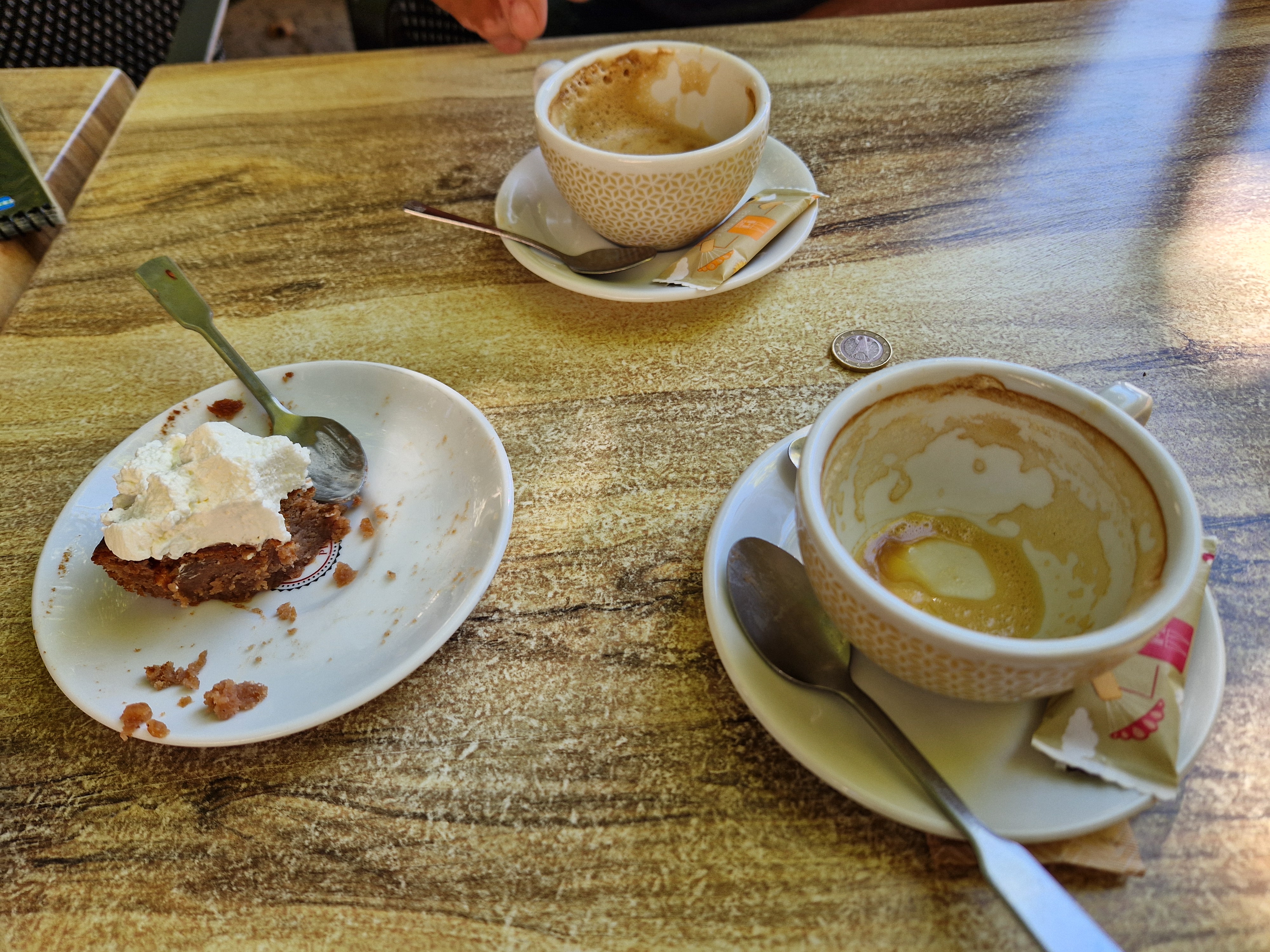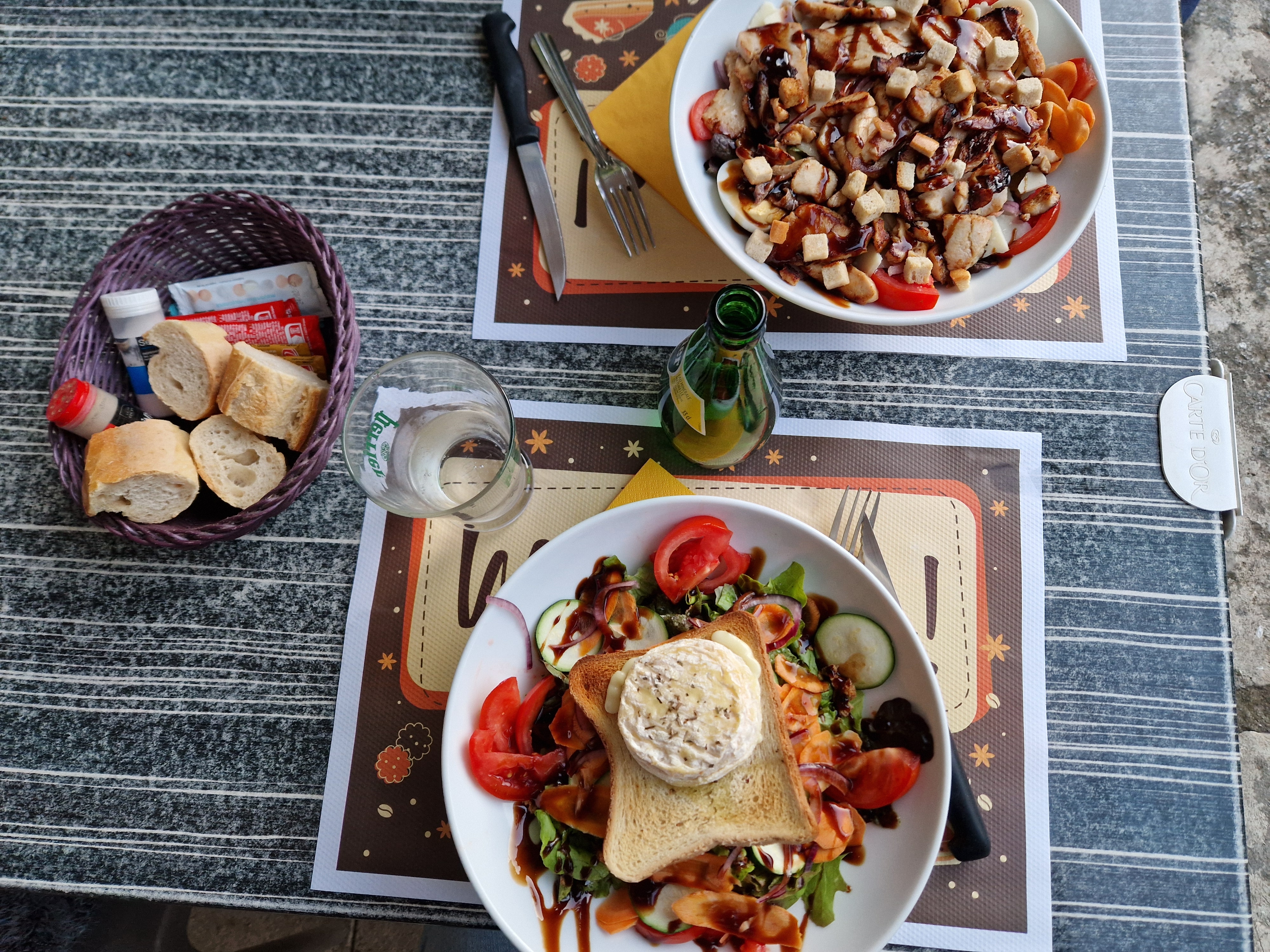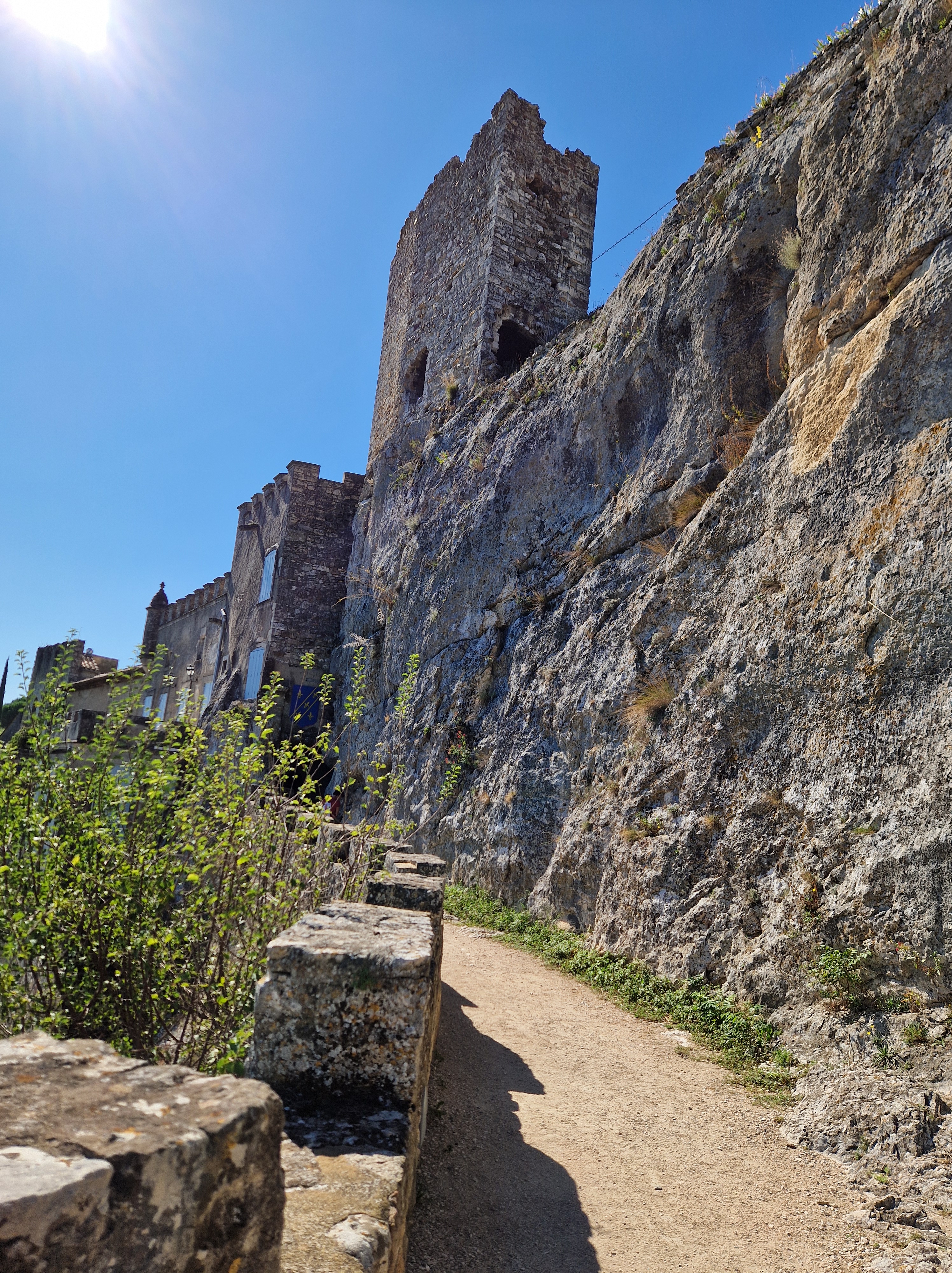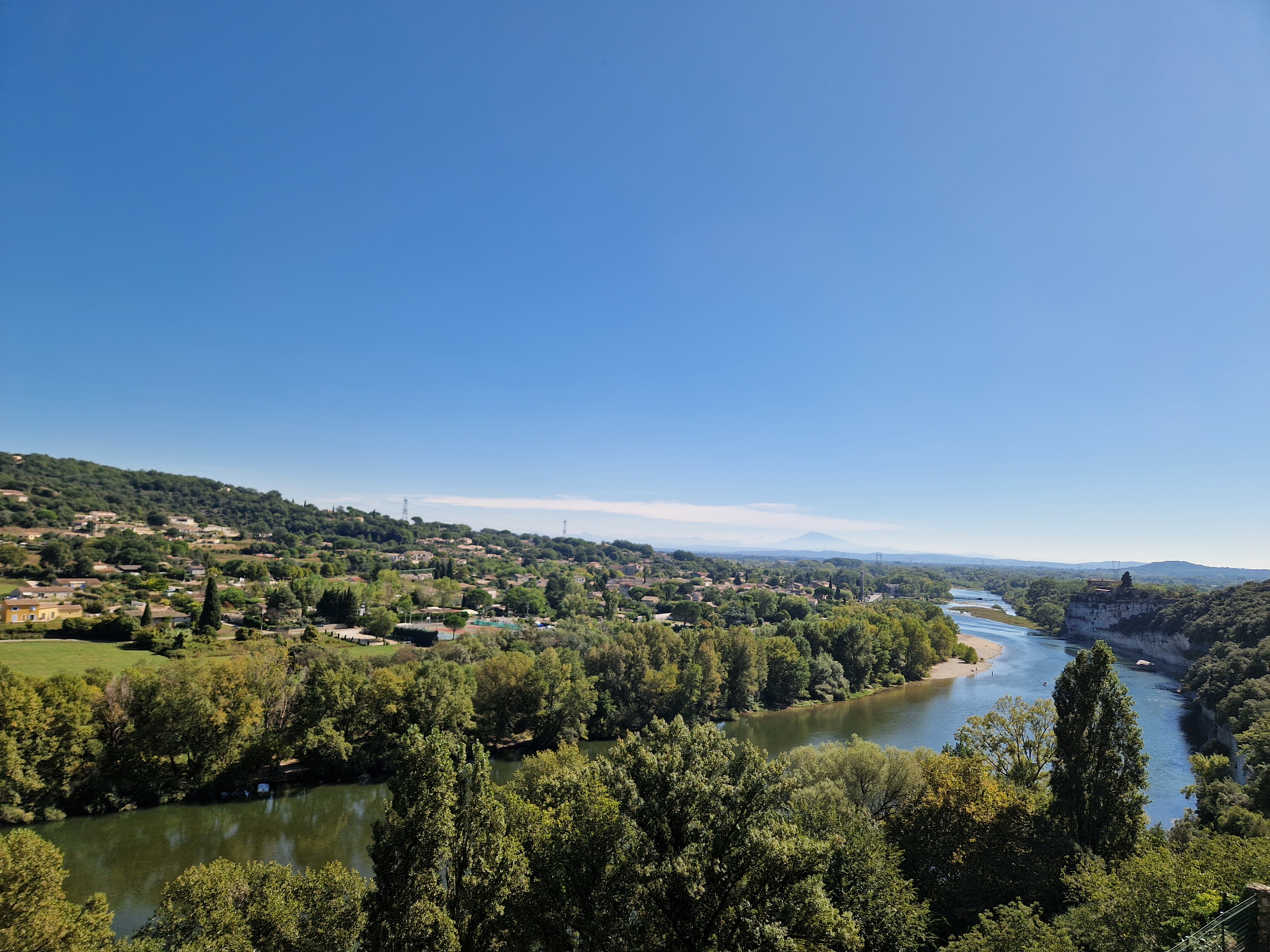 Langs de muren met zicht op de Ardèche klimmen we hoger en hoger tot we op het stadje neer kunnen kijken. Eenmaal beneden zijn we toe aan koffie, met een stukje Fondant aux Marrons, fait maison. Crimineel, wat een stuk. Zelfs met zijn tweeën krijgen we ‘m amper op. Lunchen hoeft niet meer. Tandenpoetsen wel, voor zover er nog glazuur op onze tanden zit. We lopen een ander klein rondje door de straatjes om de kastanjes te laten zakken voordat we een kronkelroute terug uitzetten via St.-Christol-de-Rodières. Lekker slingeren over een soort fietspad waar we gelukkig geen tegenliggers tegenkomen. Dit is leuk, dit is vakantie. Zo hoort het.