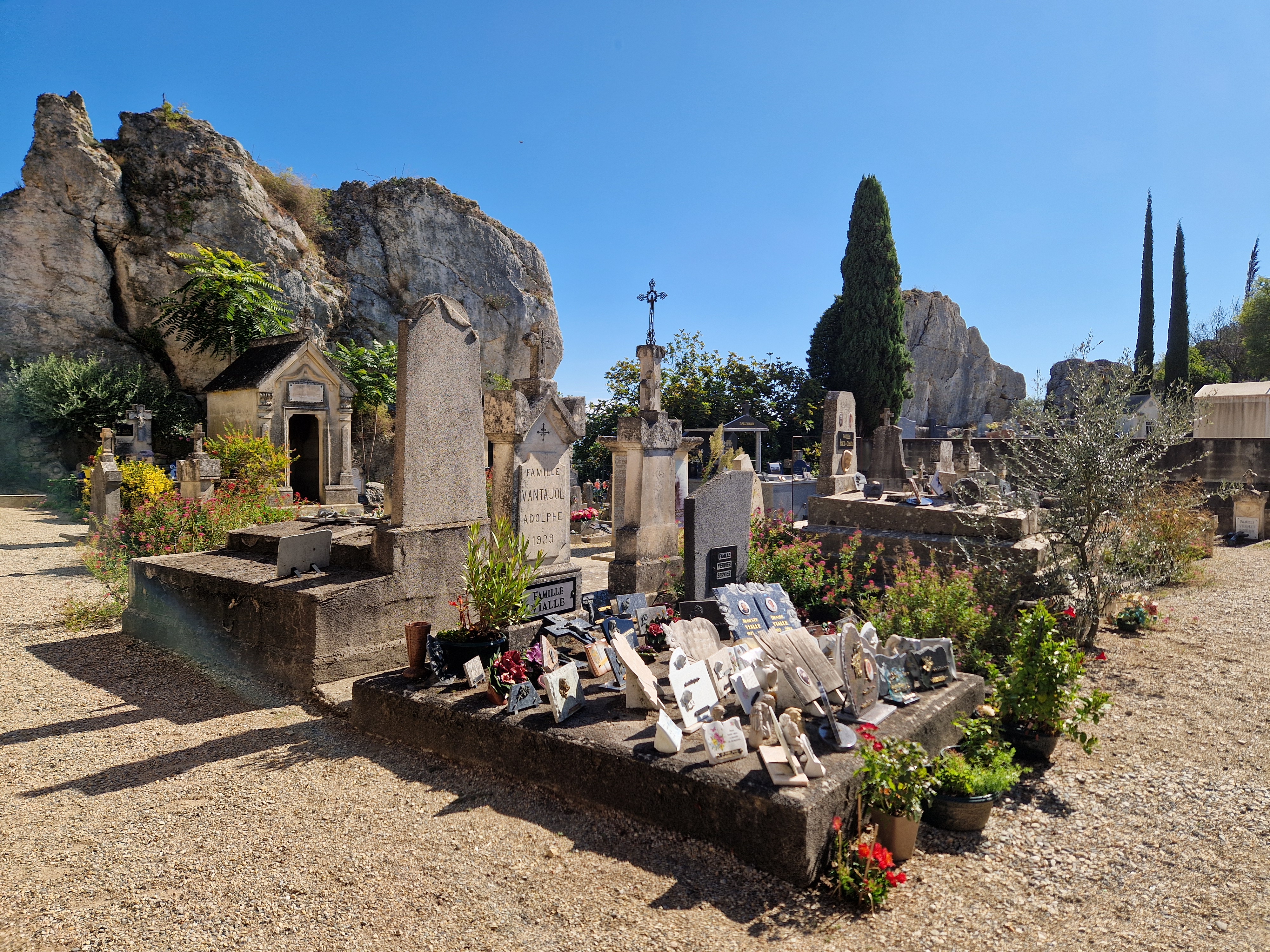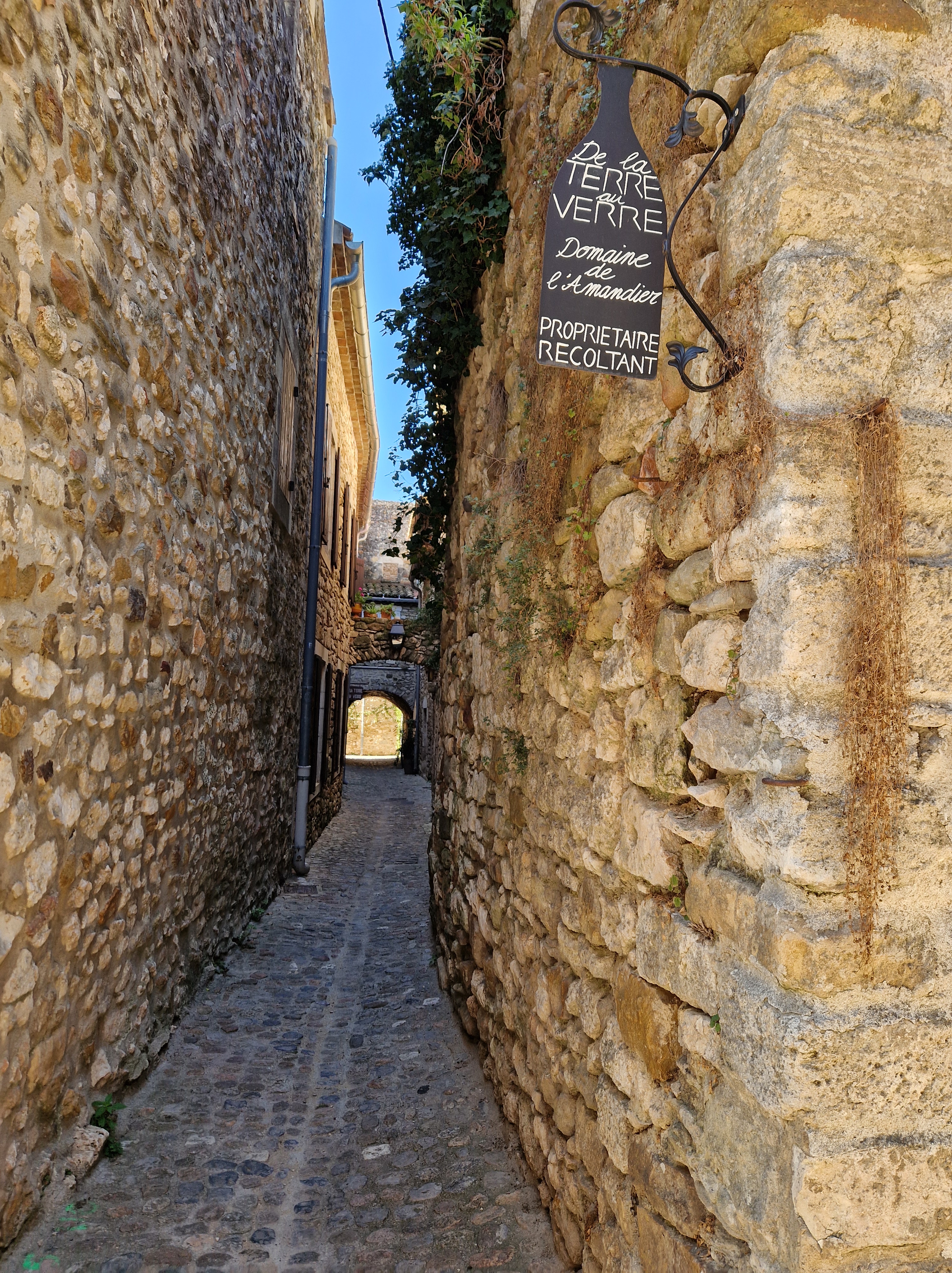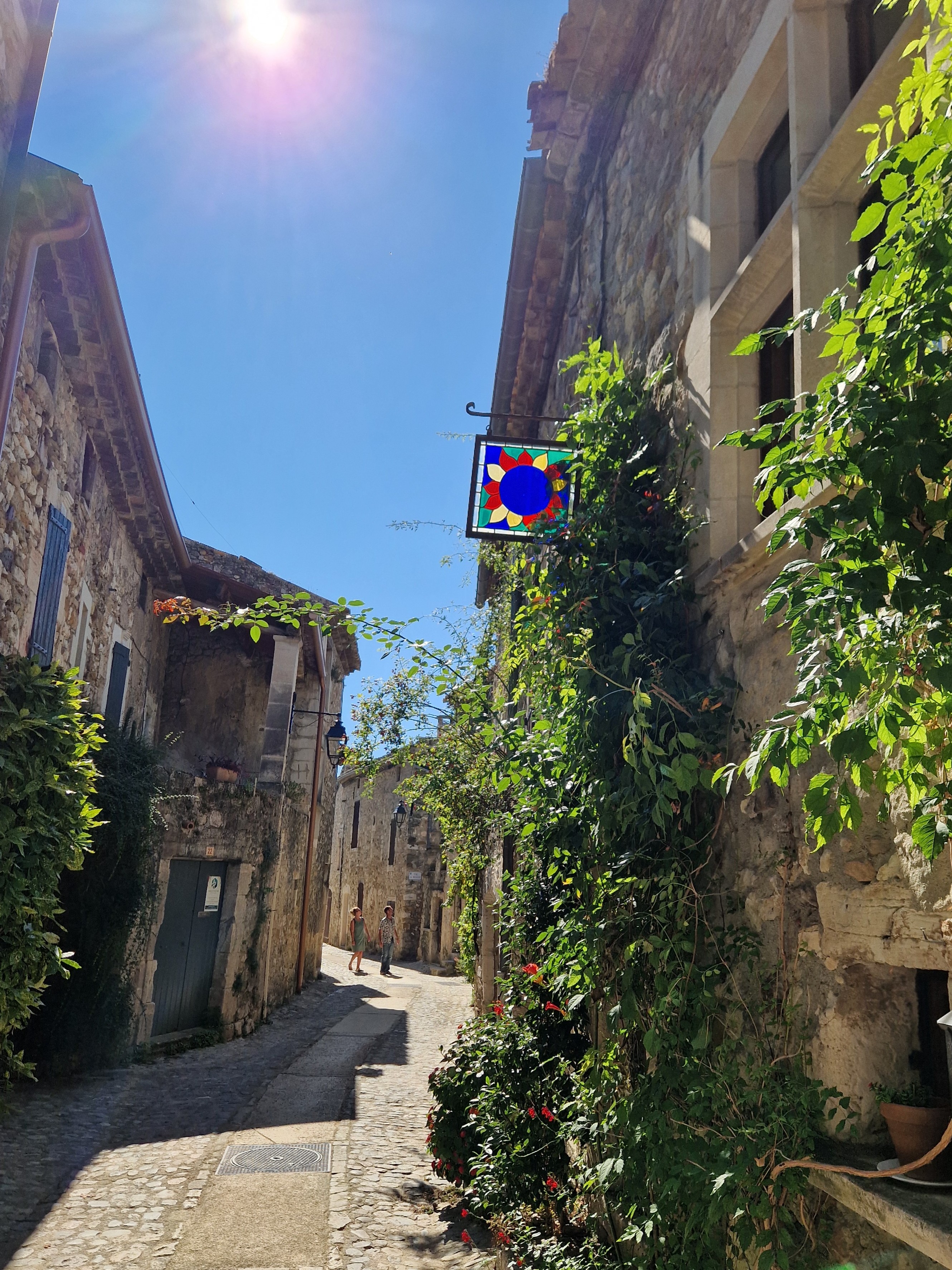 Aiguèze, middeleeuws stadje op een halfuurtje rijden, hebben we al die jaren nooit bezocht. Vooruit met de geit. Als altijd in zulke stadjes komen we om 12 uur aan, precies wanneer alle lollige winkeltjes sluiten. Tant pis, we kwamen voor de doorkijkjes en de uitzichten. Dat is gelukt. Eerst stap ik nieuwsgierig het kerkje in waar een mannenkoor bescheiden door de speakers klinkt. Het kerkhofje ligt knus tegen de rotswand aan, een speeltuintje er recht tegenover: dood en leven gescheiden door een voetpaadje.
