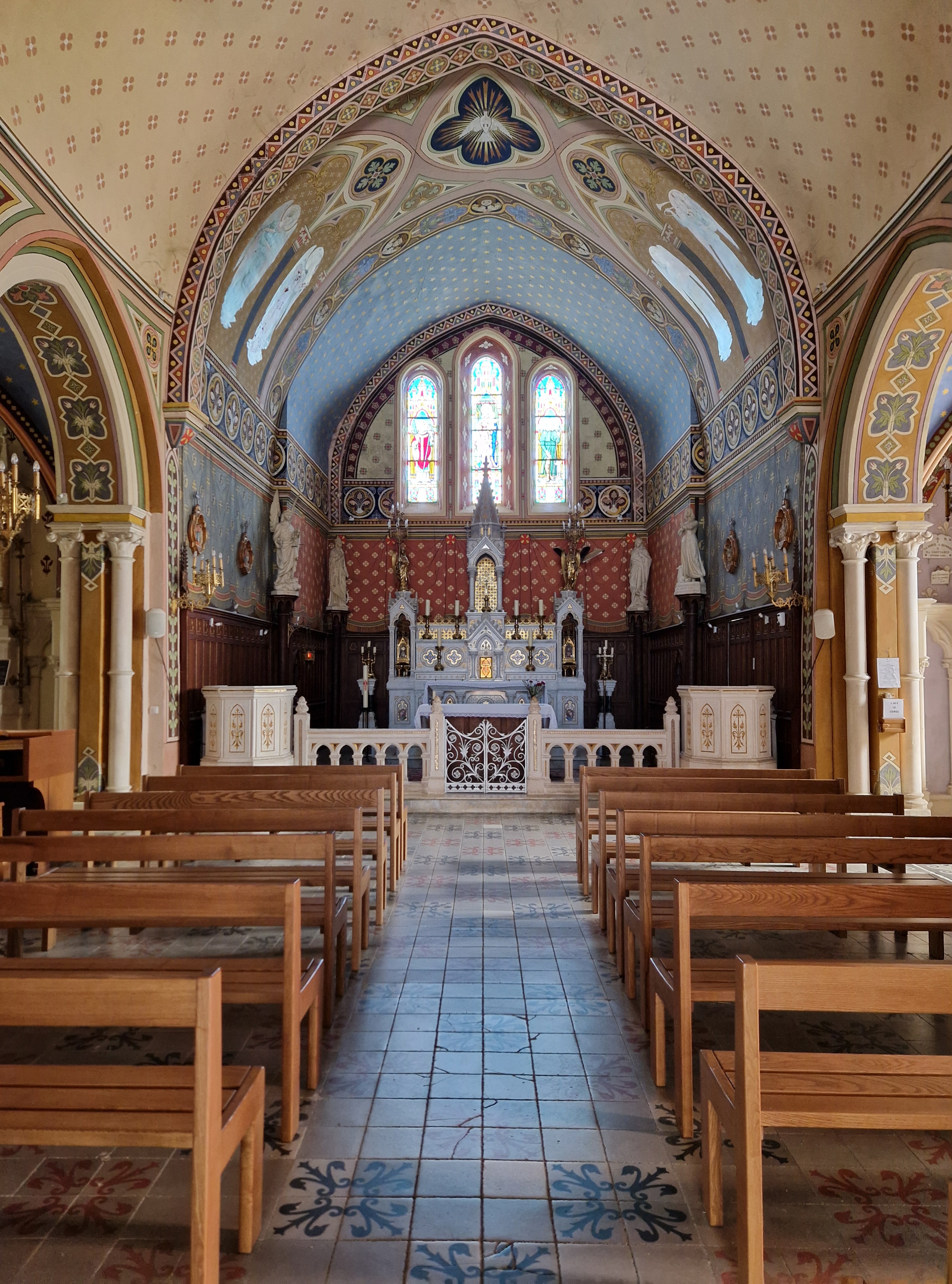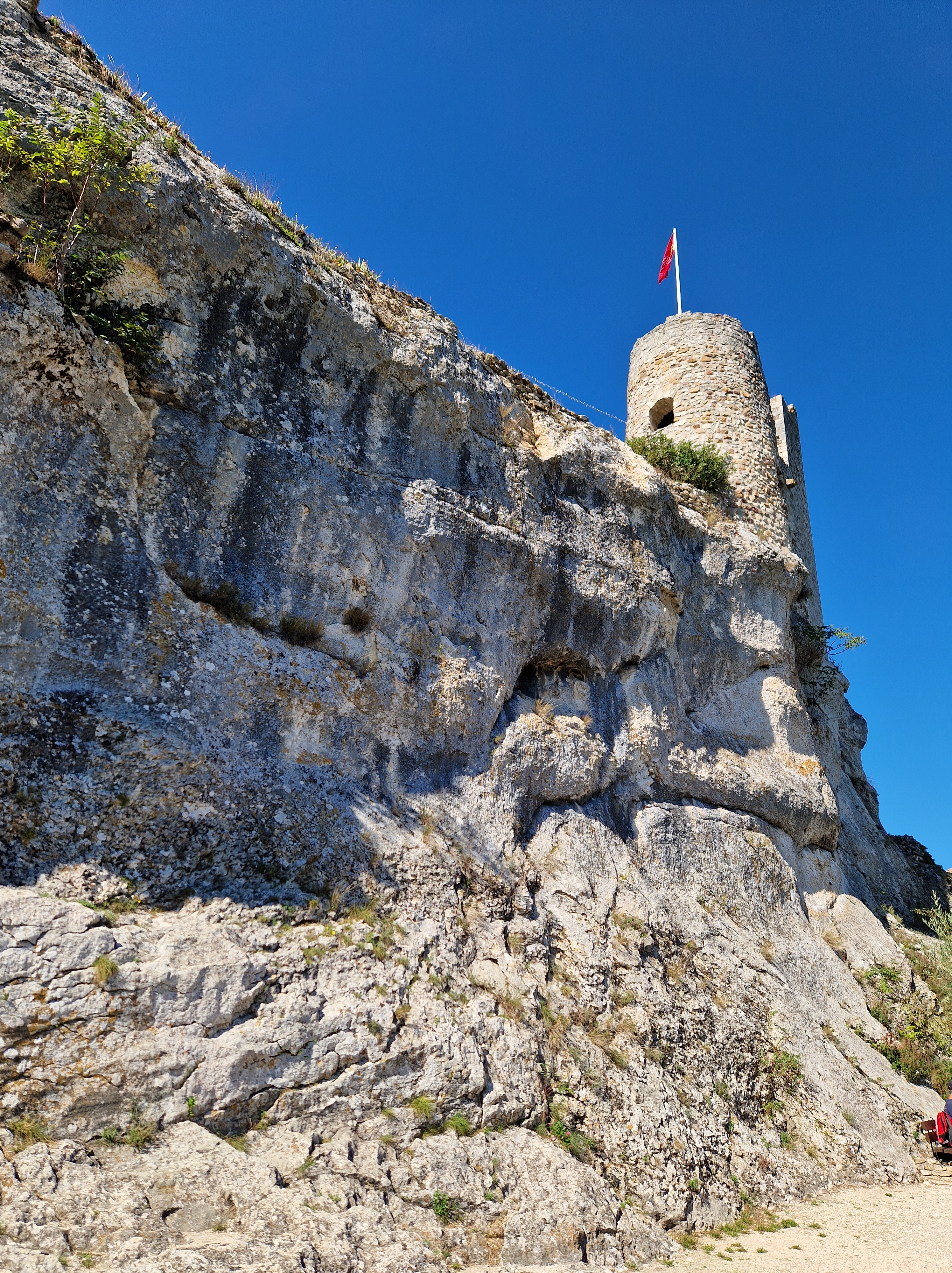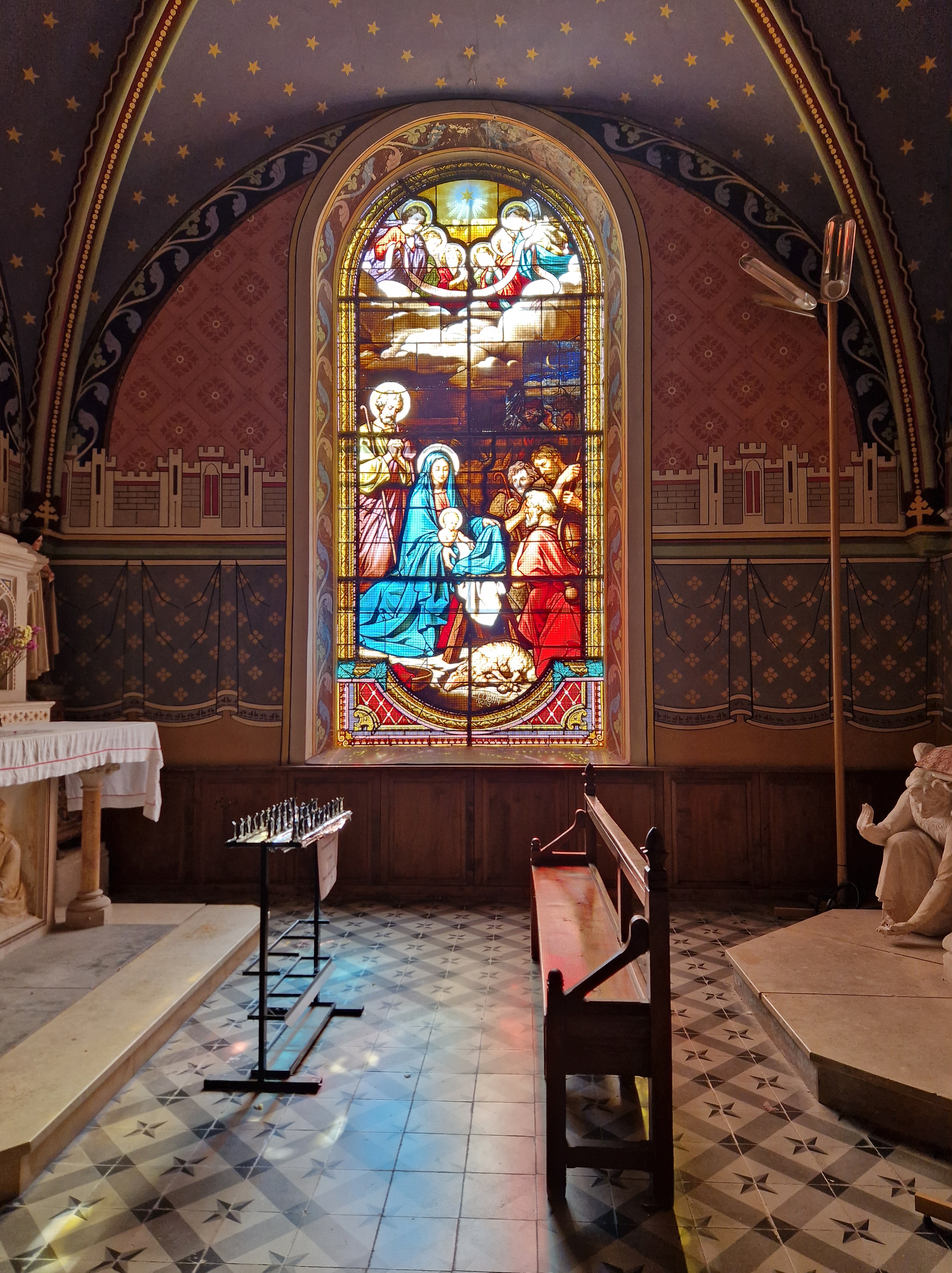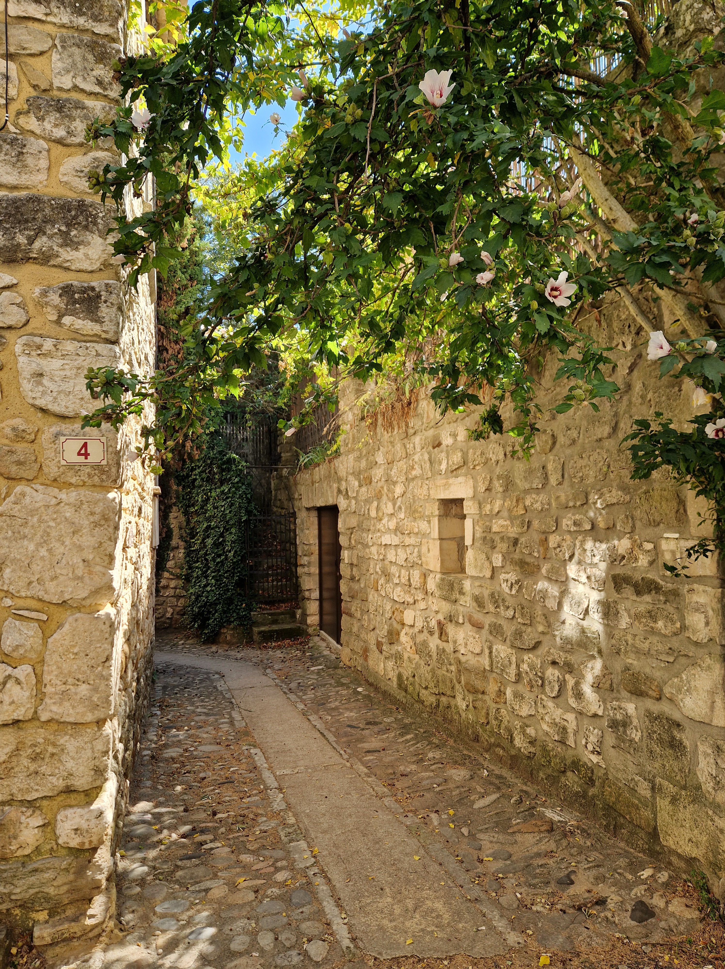 Aiguèze, middeleeuws stadje op een halfuurtje rijden, hebben we al die jaren nooit bezocht. Vooruit met de geit. Als altijd in zulke stadjes komen we om 12 uur aan, precies wanneer alle lollige winkeltjes sluiten. Tant pis, we kwamen voor de doorkijkjes en de uitzichten. Dat is gelukt. Eerst stap ik nieuwsgierig het kerkje in waar een mannenkoor bescheiden door de speakers klinkt. Het kerkhofje ligt knus tegen de rotswand aan, een speeltuintje er recht tegenover: dood en leven gescheiden door een voetpaadje.