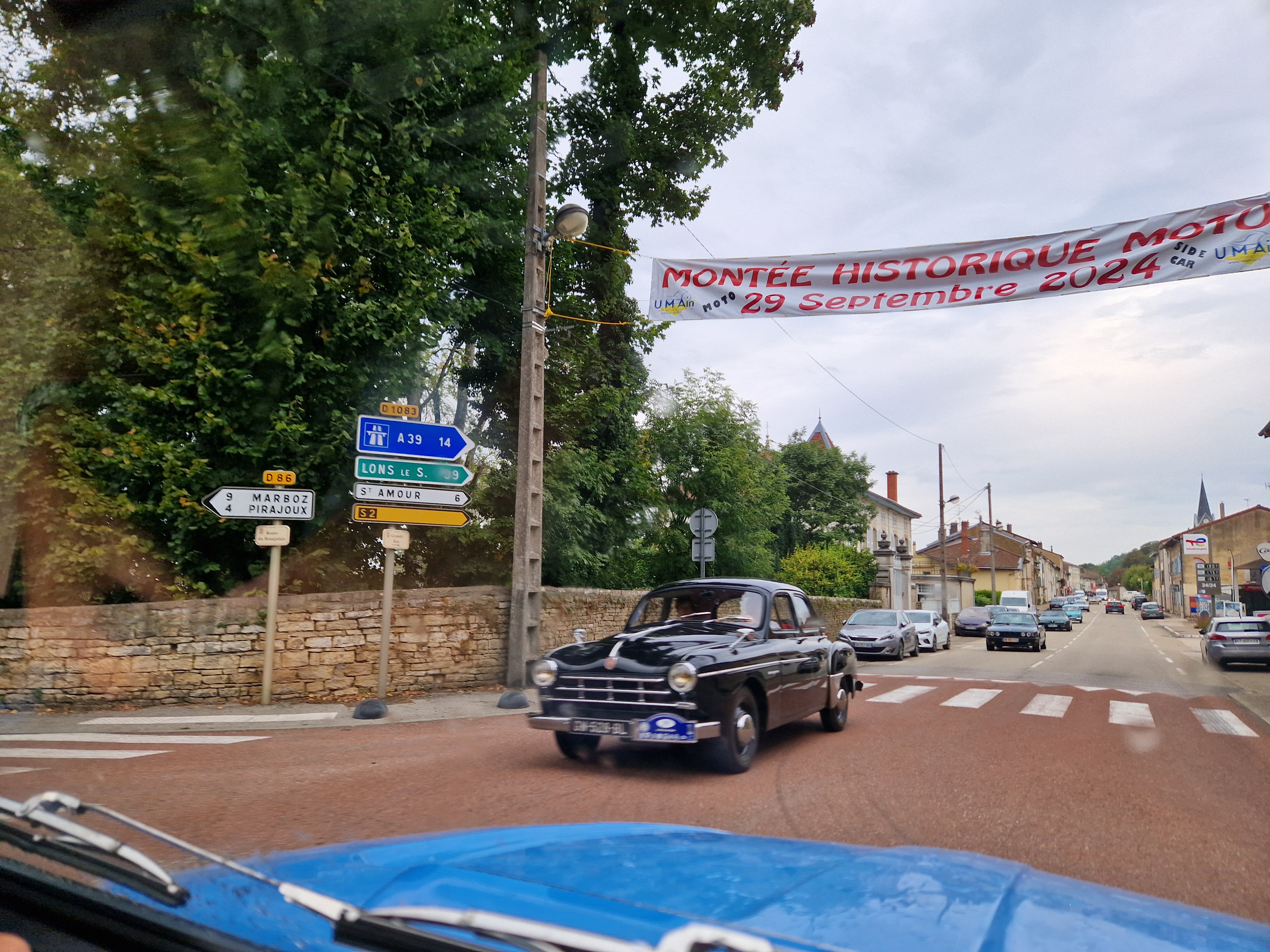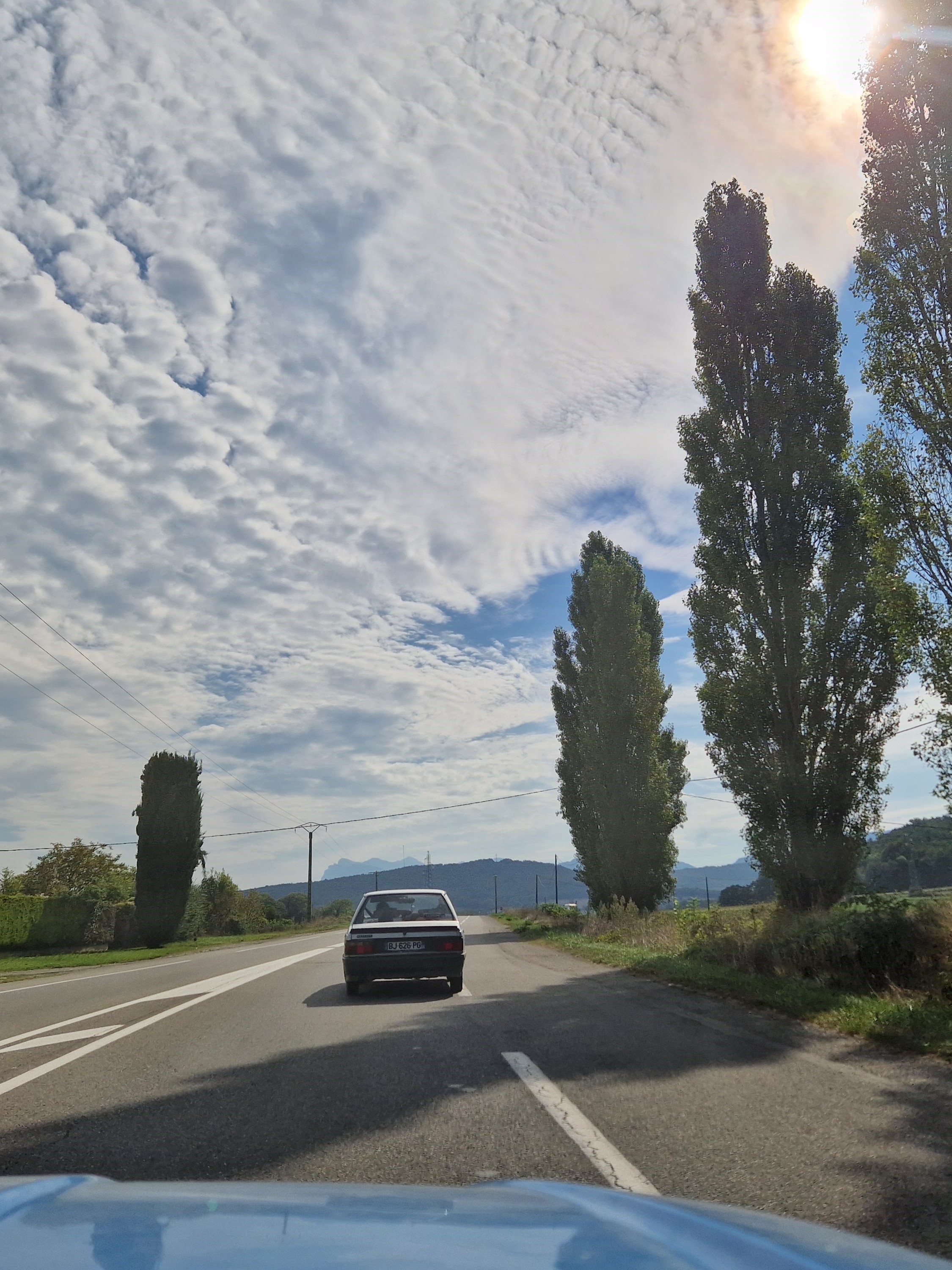 Kijk nou, een rood-witte HY knippert ons tegemoet. En een eend met duimpje uit het raam. Een Dauphientje. Een Peugeot. Eén lange slinger van old- en youngtimertjes, wat is dit een vrolijke club! Ik ben vanzelfsprekend te laat met mijn camera, zo zitten we te zwaaien en te lachen. Wat een enige ontmoeting in dit druilerige weer.