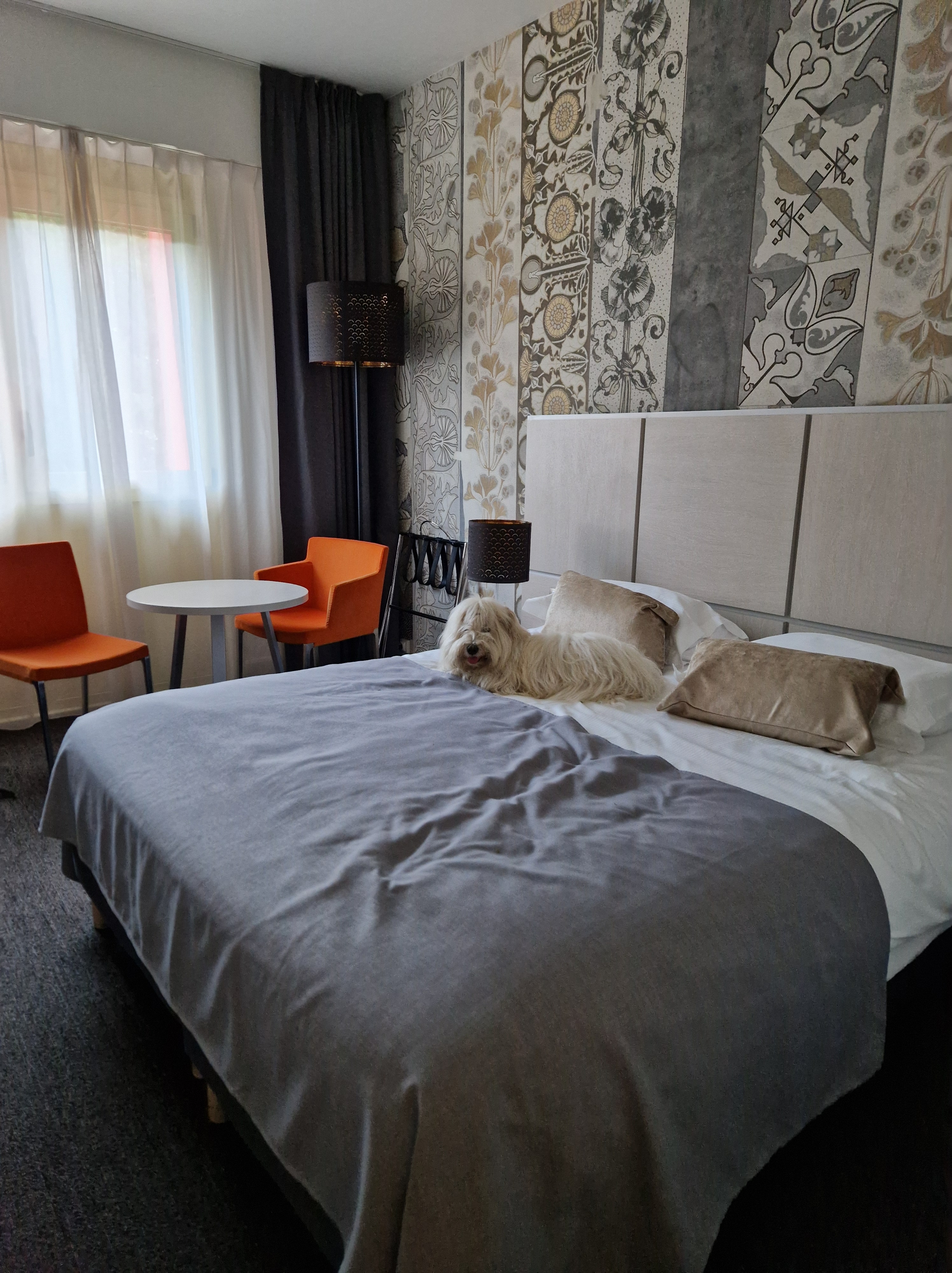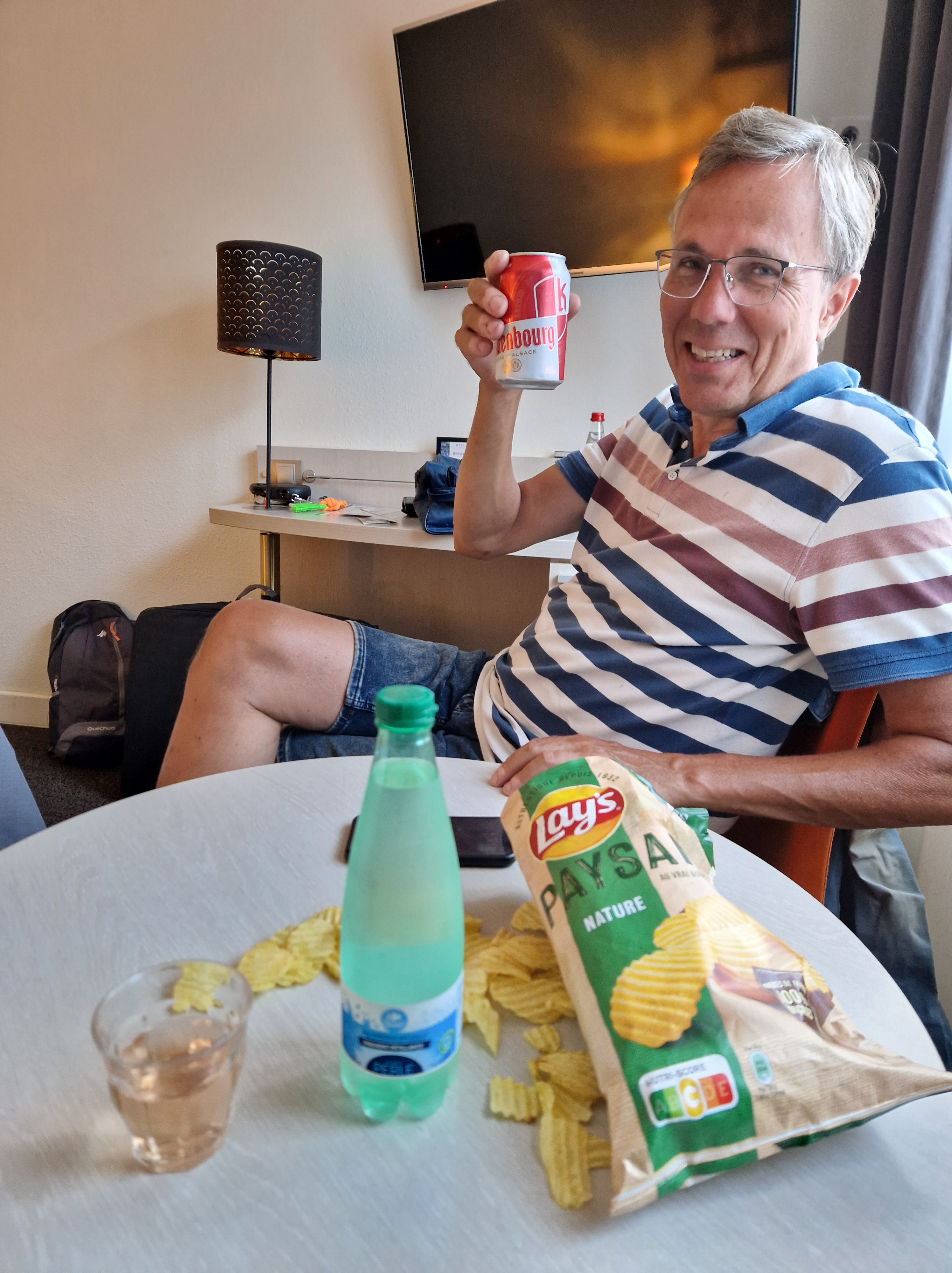 We hebben een Mercurehotel in Bourg en Bresse geboekt. Hond bezet bed, wij puffen uit met een drankje en chips. ‘s Avonds eten we wat in ‘t restaurant. Morgen gaan we naar Metz, kijken wat Tom daarvan vindt…