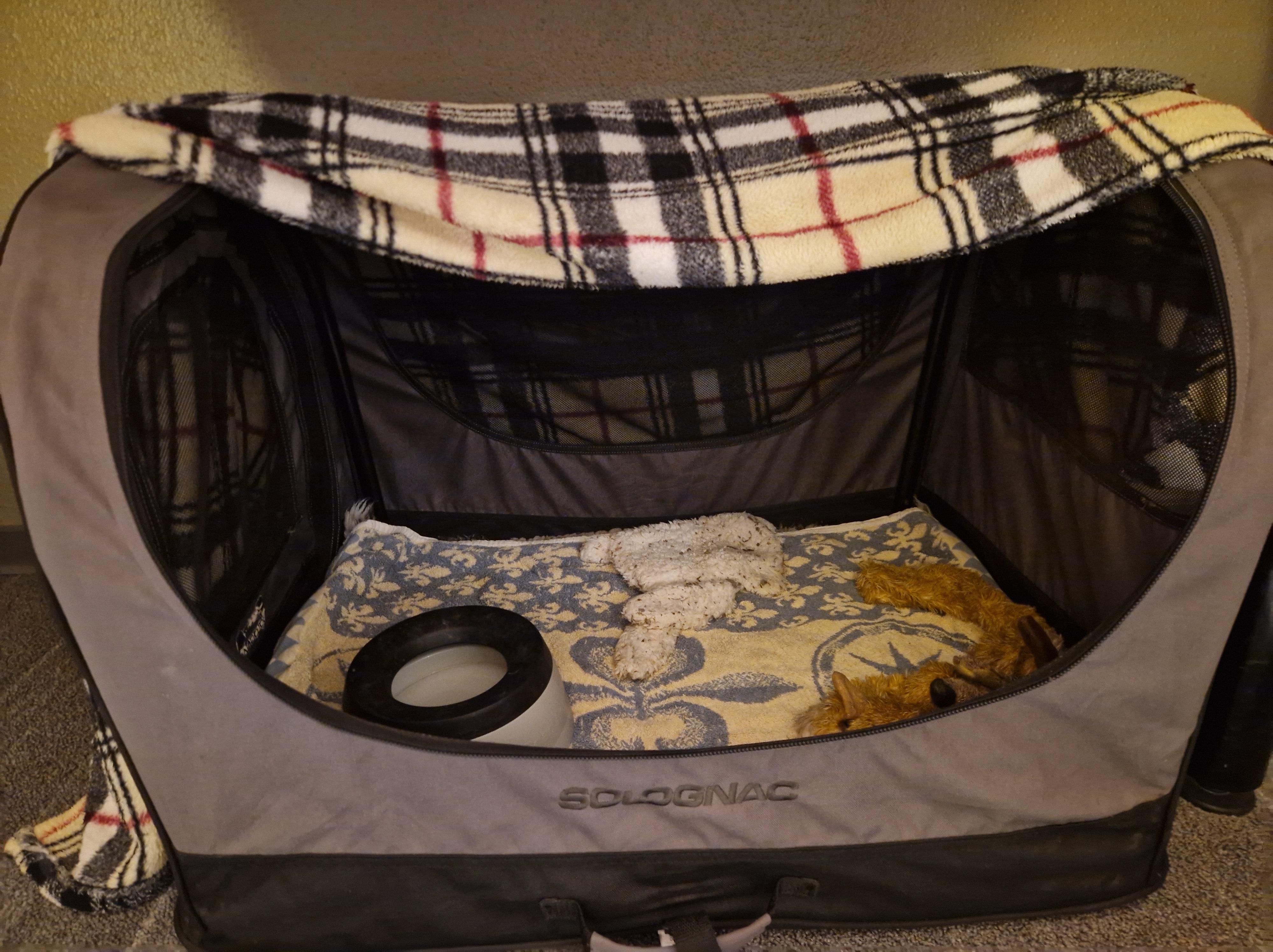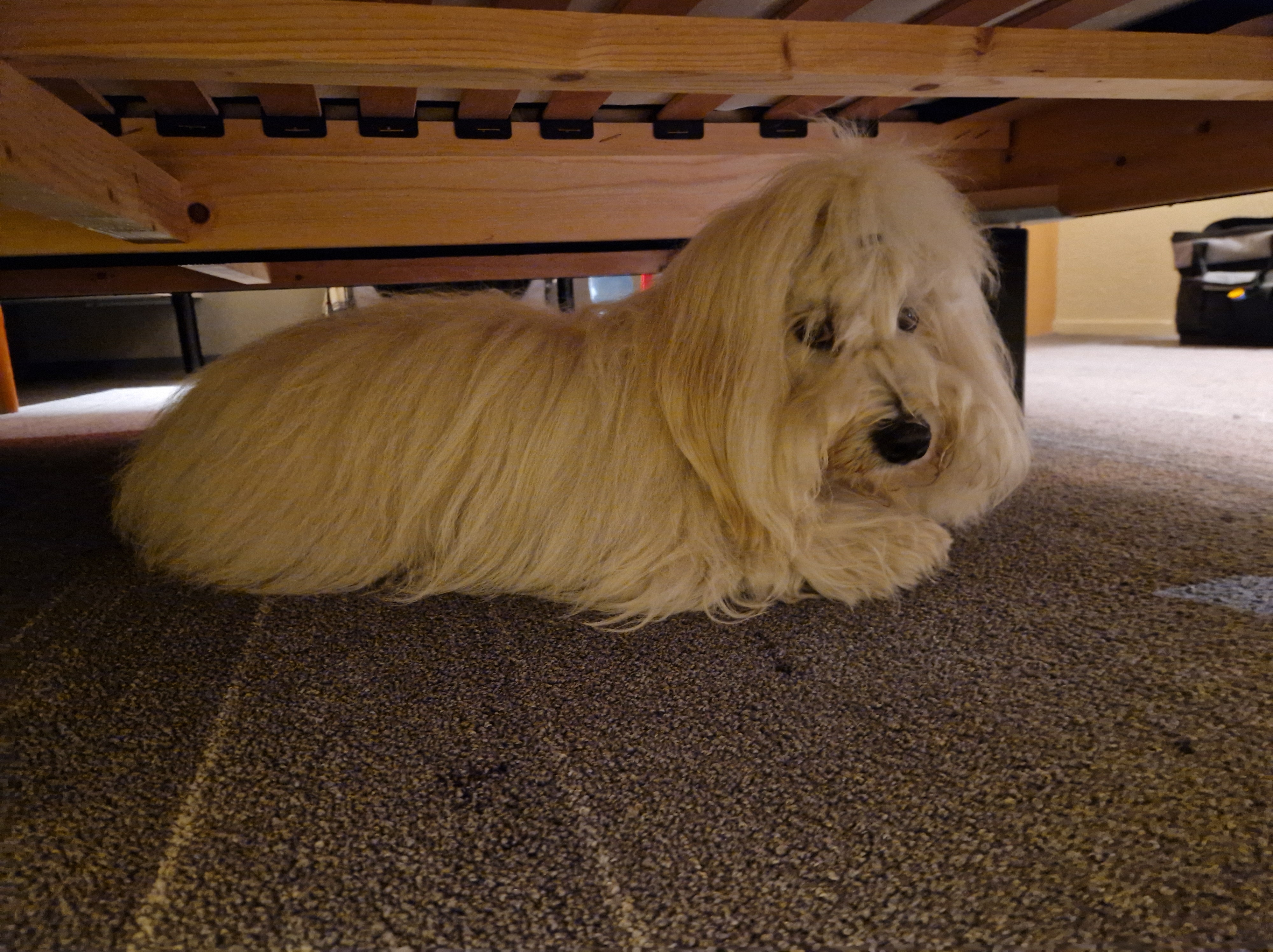Om half 4 zijn we bij onze ouwe trouwe Ibis-koe Woippy. Een grote kamer, de hond dit keer ónder het bed terwijl zijn bench uitnodigend is opgezet. Mafkees.