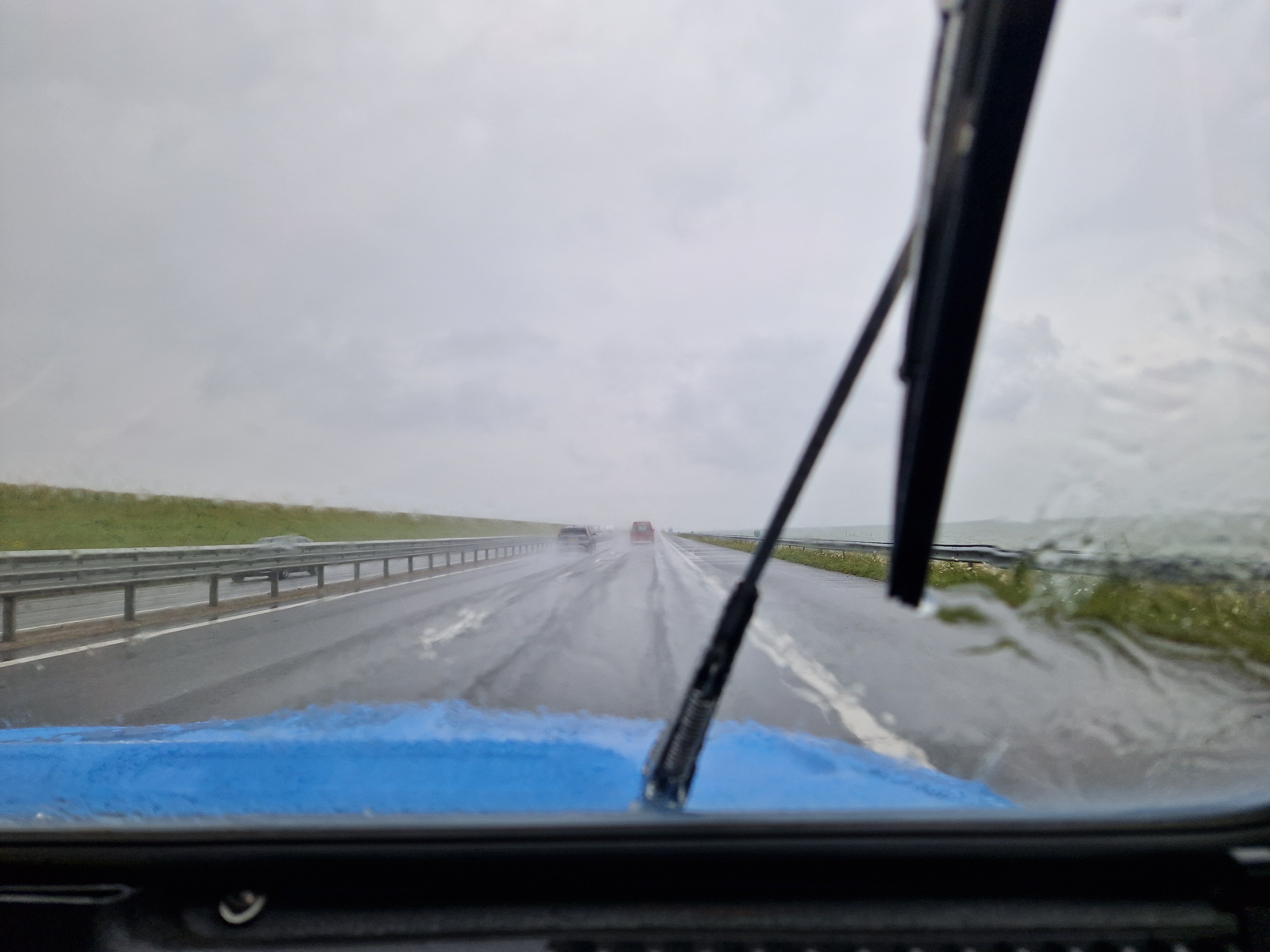 Na vertrek snijden we, geleid door Tom, via allerlei boerenlandwegen de A7-file helemaal af tot voor de sluizen en voegen vlak voor de brug in op de snelweg. Staan we net zo goed stil, maar wel helemaal vooraan. Het IJsselmeer in de stromende regen is dreigend groen met witte schuimkoppen. Vijf kilometer voor het eind van de dijk staat het verkeer weer vast. Bruggetje open, bruggetje dicht (bis).