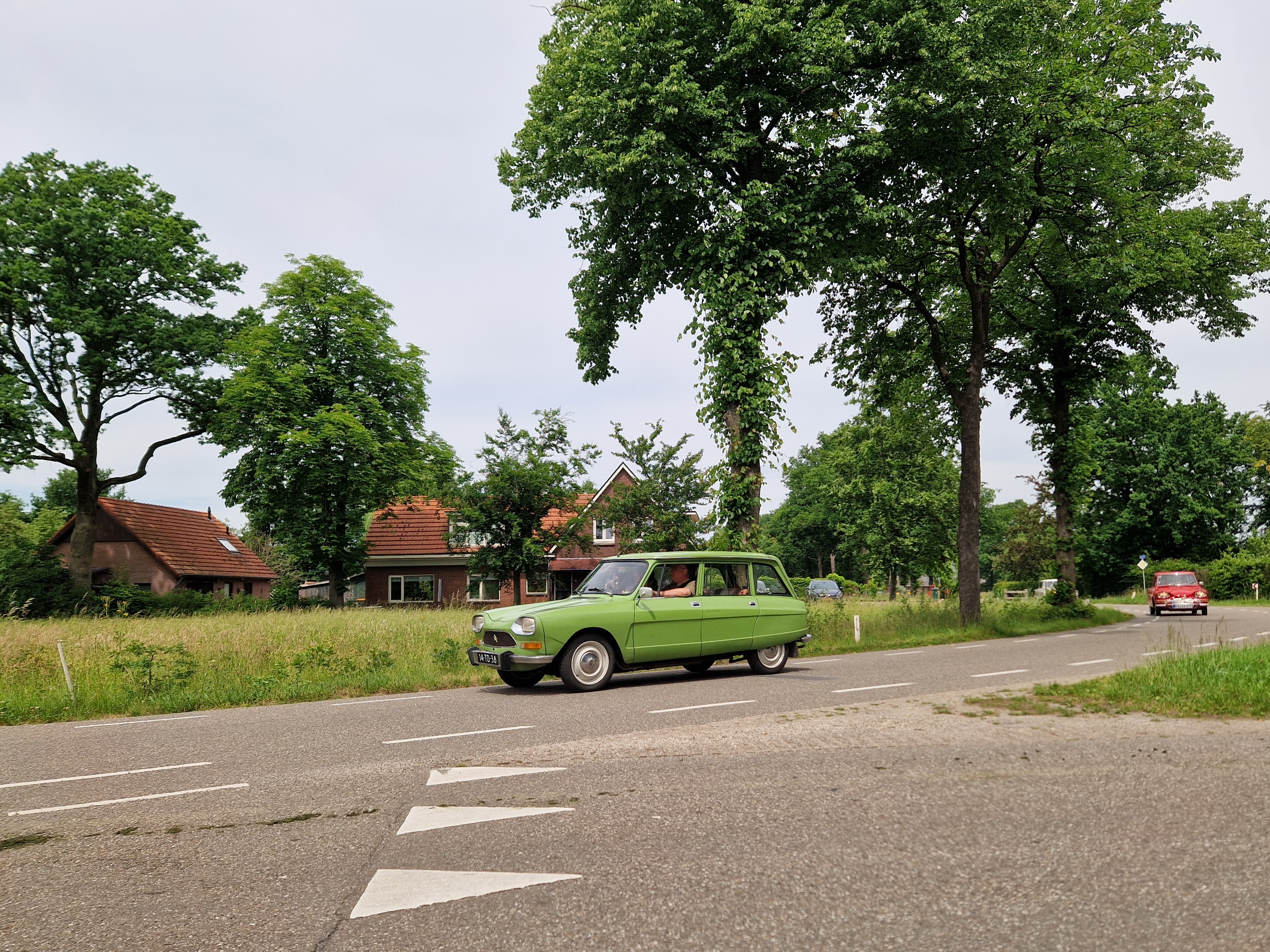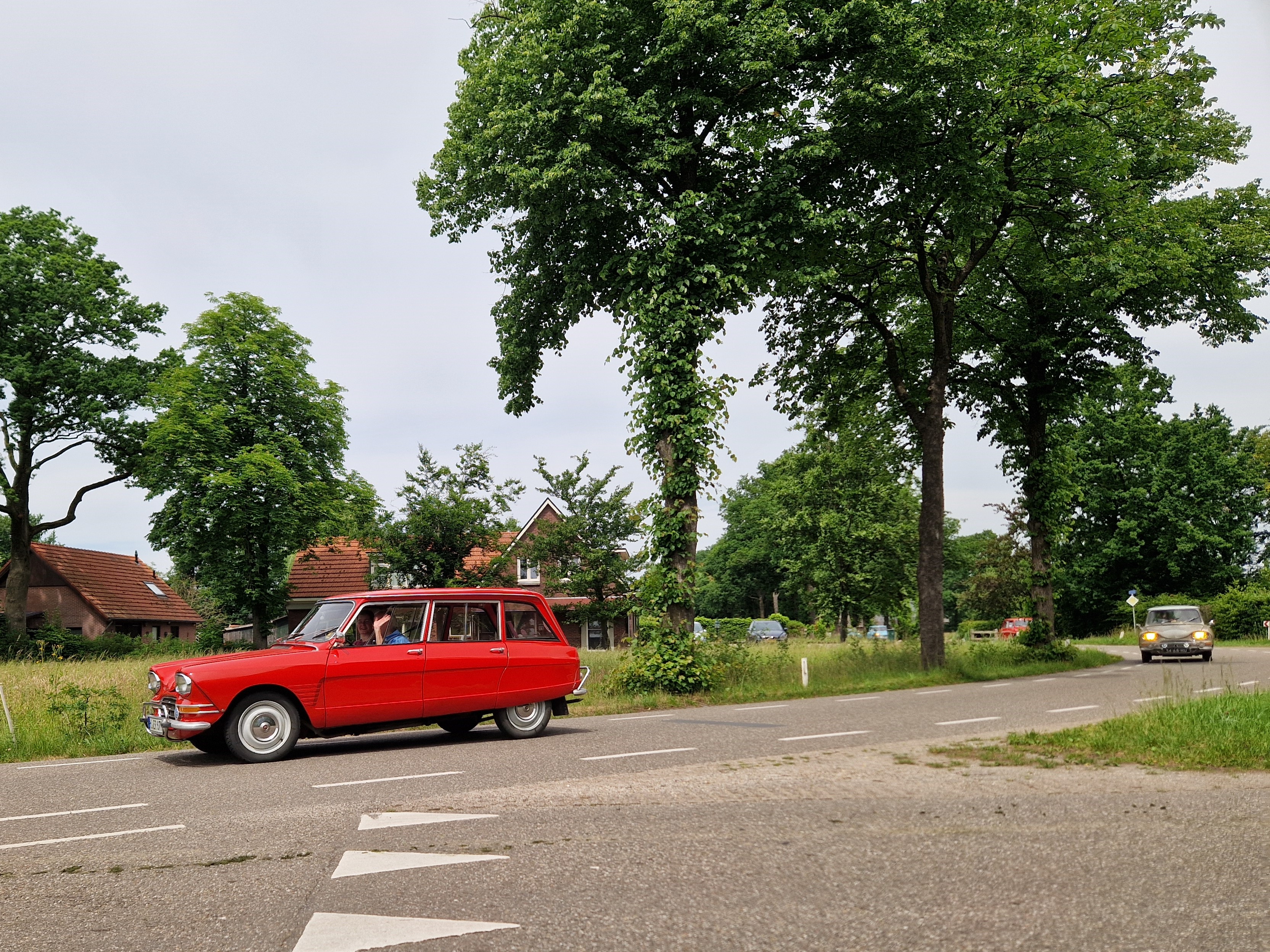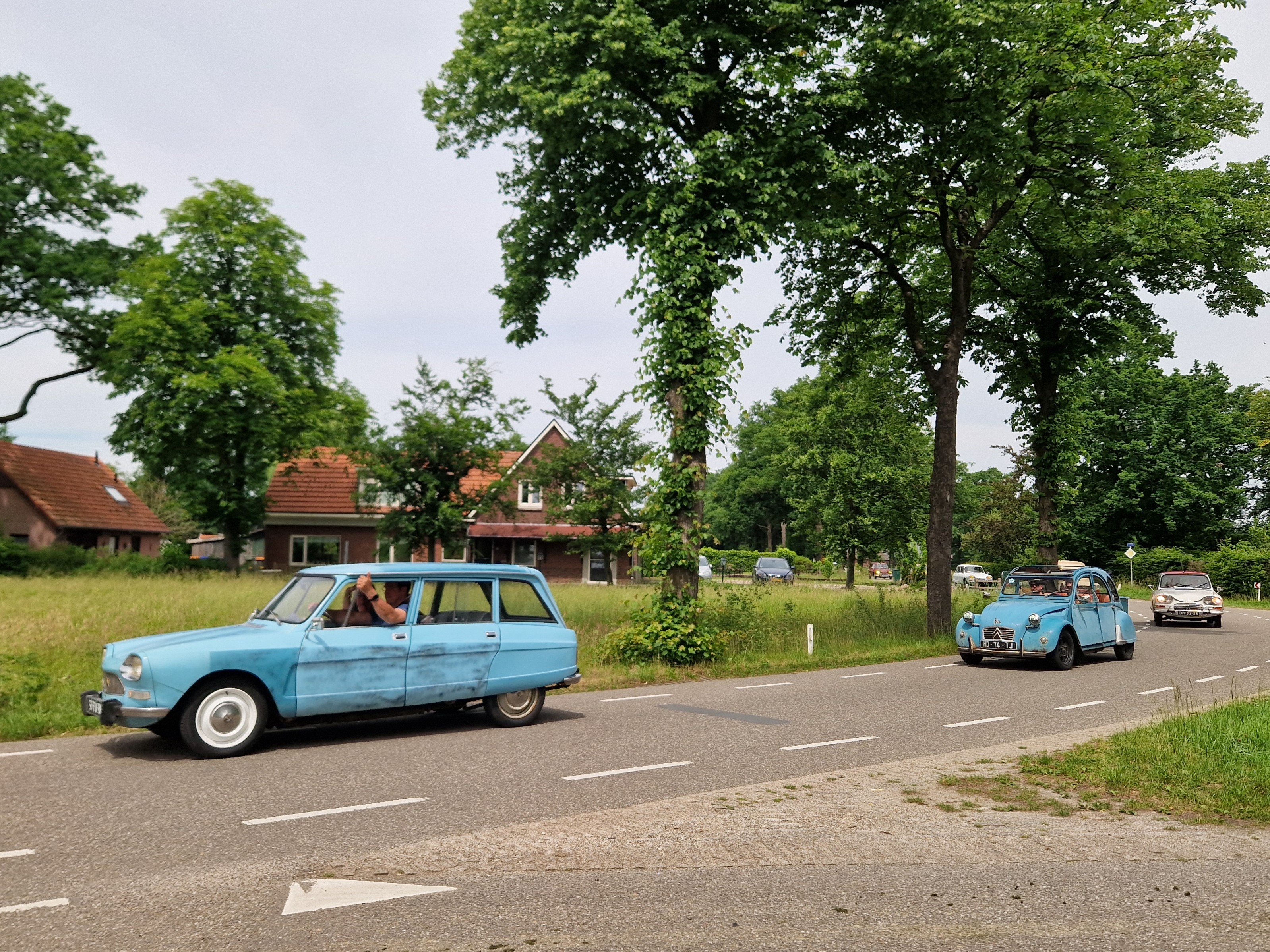 Vlak voor een grensovergang met Duitsland picknicken we. Komen onze bekenden van de Ami Vereniging, die we in april ontmoet hebben, in optocht langs. De witte met rood dak, zijn zoon met de Acadiane waarmee ik heb staan kletsen en nog meer bekende voitures. Er wordt uiteraard enthousiast gezwaaid. Hadden we dat geweten, hadden we lekker met hun meegereden.