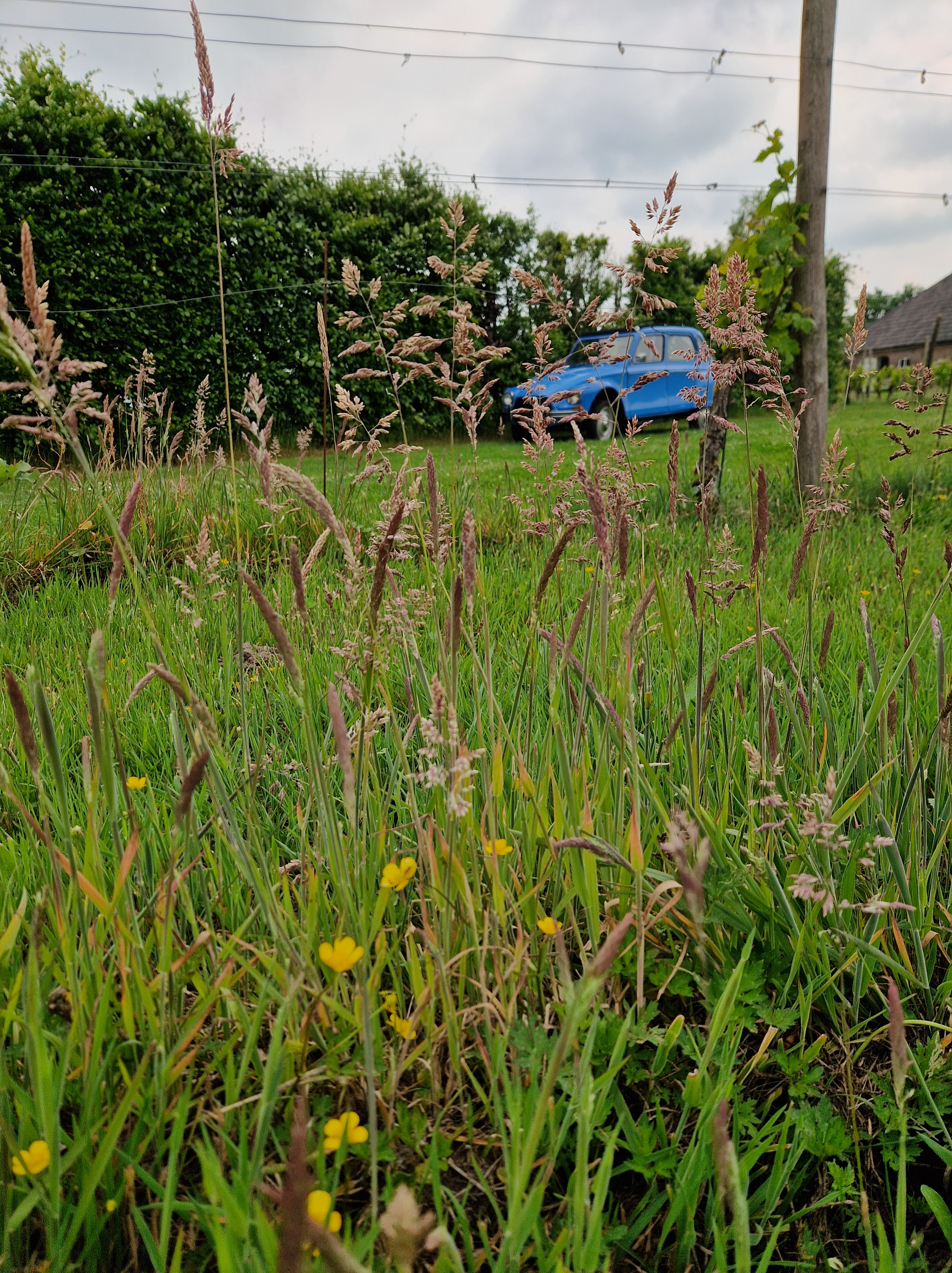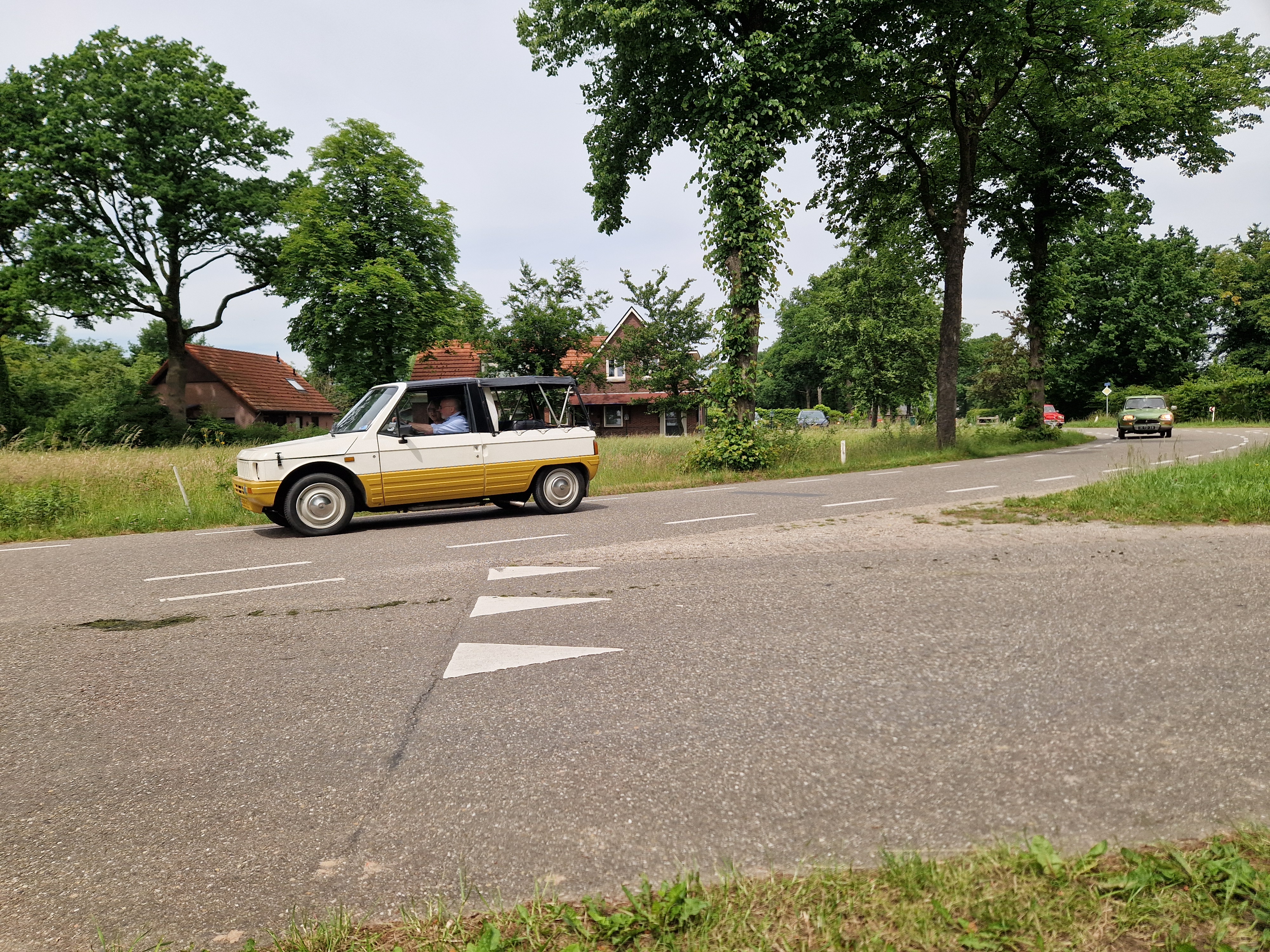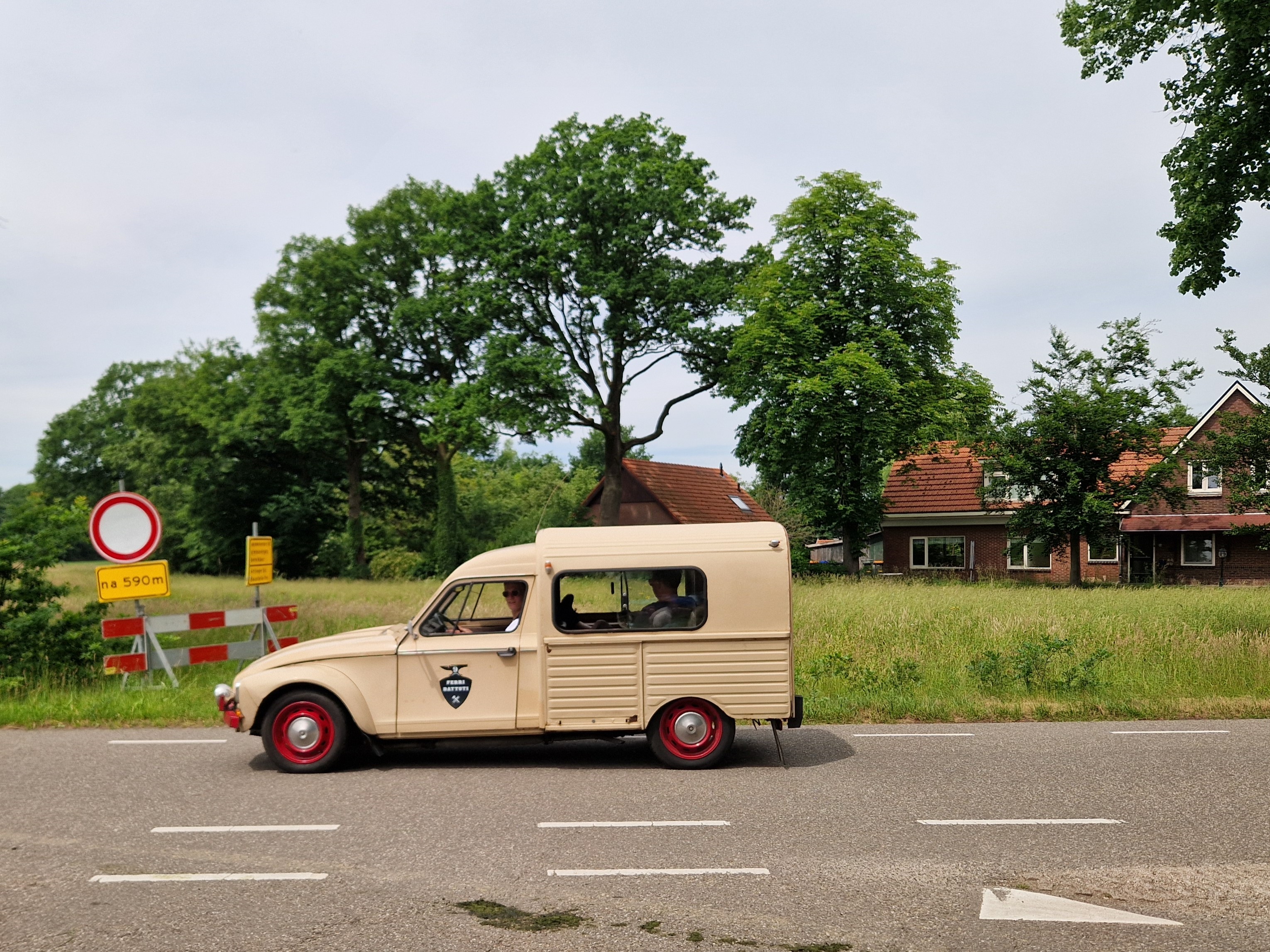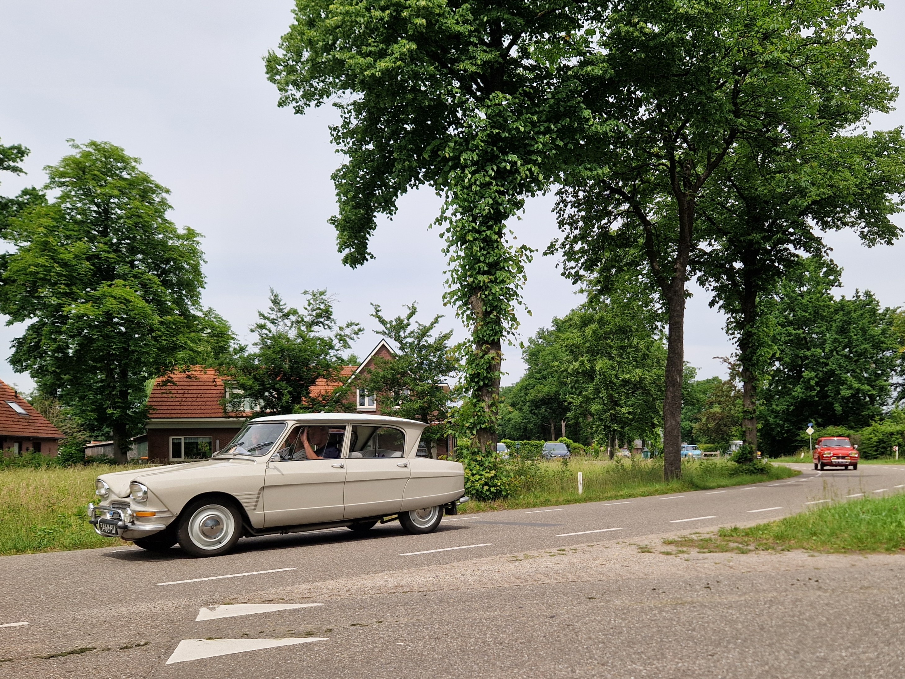 Vlak voor een grensovergang met Duitsland picknicken we. Komen onze bekenden van de Ami Vereniging, die we in april ontmoet hebben, in optocht langs. De witte met rood dak, zijn zoon met de Acadiane waarmee ik heb staan kletsen en nog meer bekende voitures. Er wordt uiteraard enthousiast gezwaaid. Hadden we dat geweten, hadden we lekker met hun meegereden.