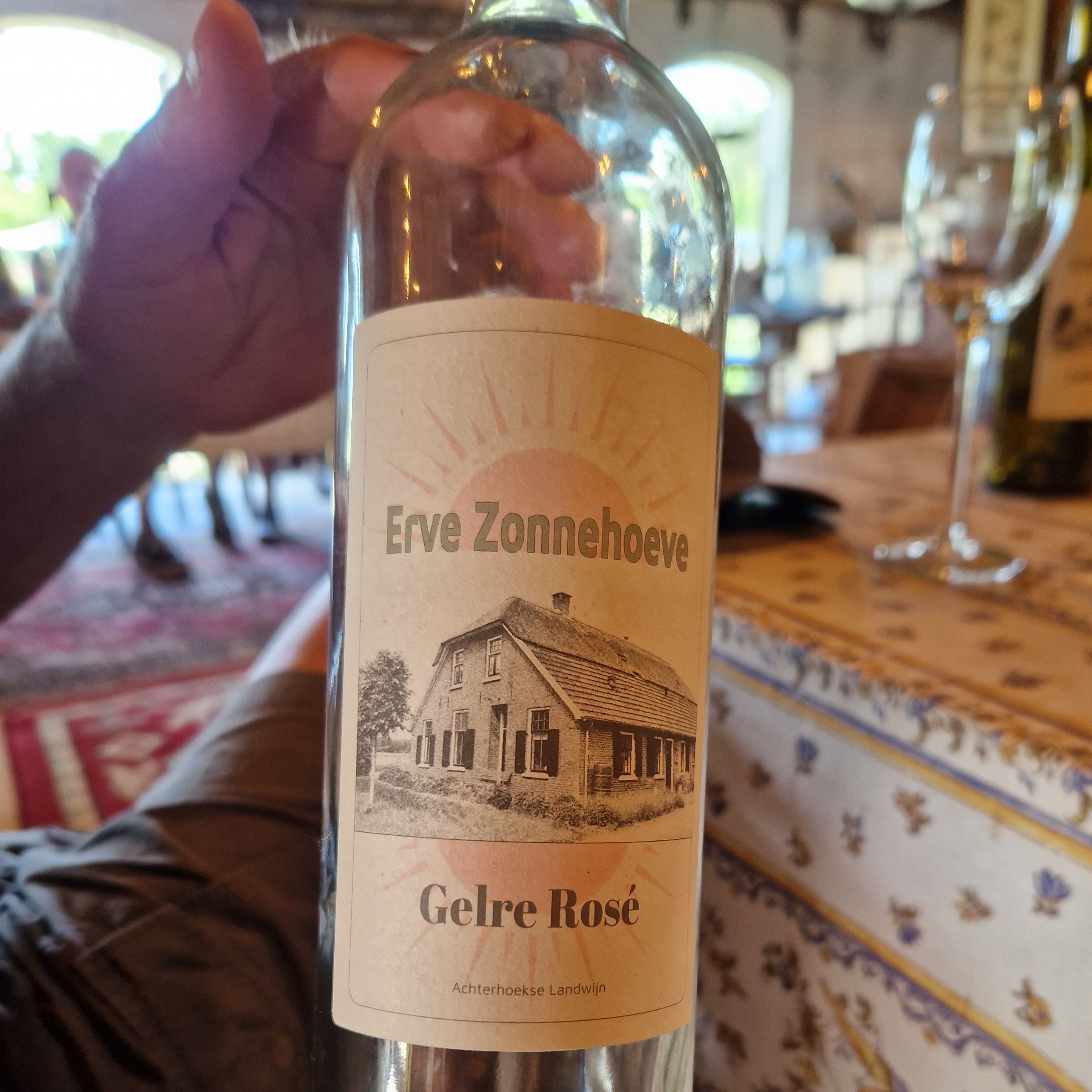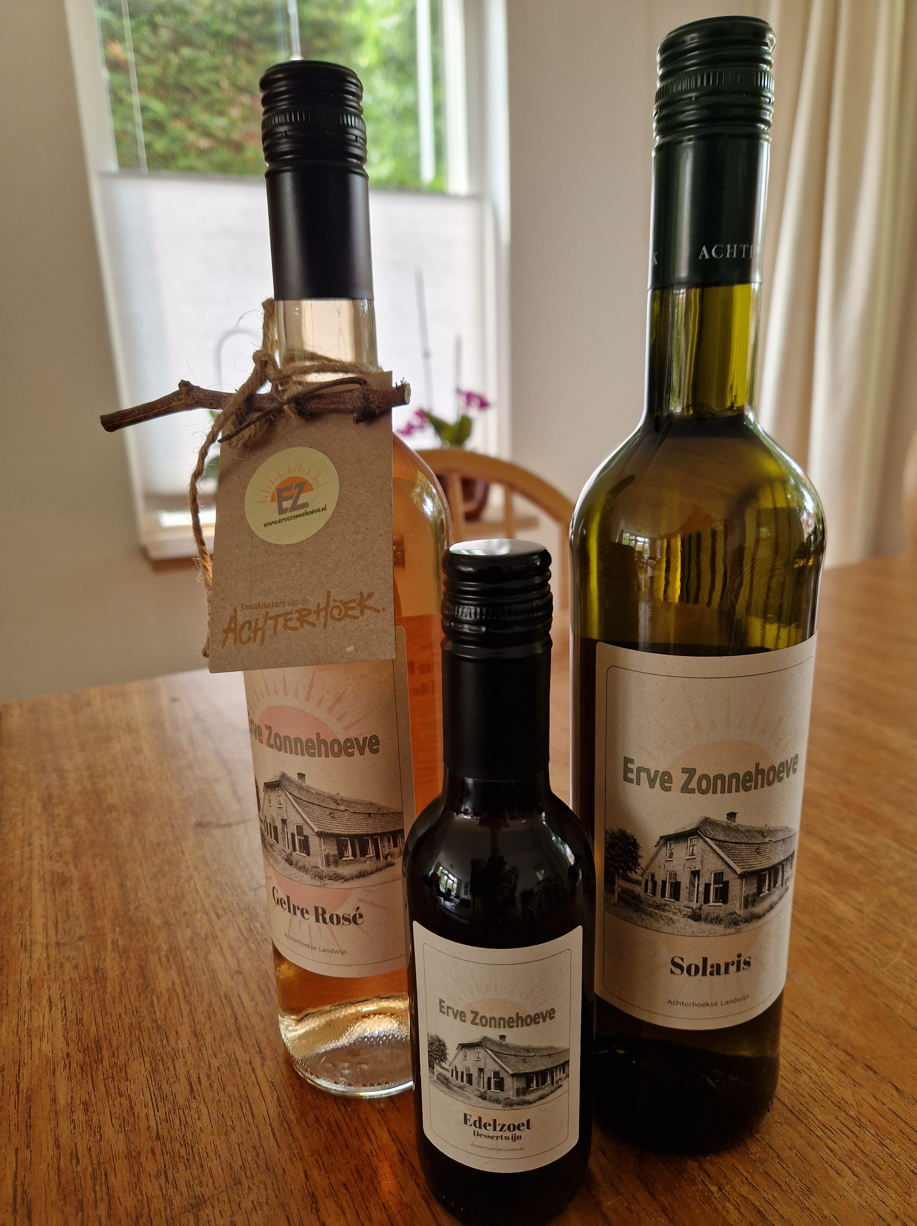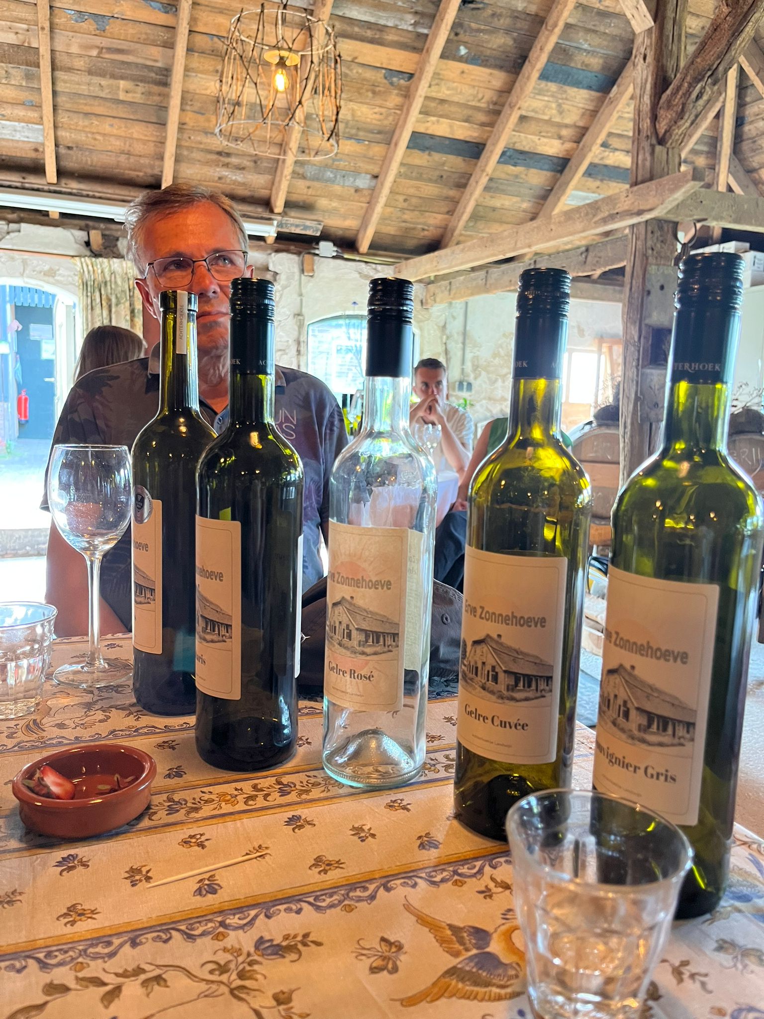 Ik kan het lang niet zo smeuïg navertellen. Er volgt een verhaal over een anti-valse-meeldauw-pap die gemaakt wordt van het alomtegenwoordige Heermoes, de pest als je het in je tuin hebt en het daar niet wilt hebben, dan is het je reinste onkruid. Op Zonnehoeve zijn ze er blij mee. De rest van de uitleg over de wijn, het persen en bottelen is al even boeiend maar ga ik hier niet herhalen. Ik zou zeggen: boek een proeverij met rondleiding, met een glas in de hand tussen de zonnige wijnstokken wandelen. Je ziet per stam de twee hoofdtakken gebogen naar links en rechts en alle uitlopers naar boven, het verhaal van daarnet wordt ineens aanschouwelijk. De rozen aan begin of eind van een rij vraagt Maarten elk jaar voor zijn verjaardag, dat is de vaste rozenplantdag. Verschillende soorten door mekaar, dat maakt niet uit voor dit natuurlijke en decoratieve “alarmsysteem”.