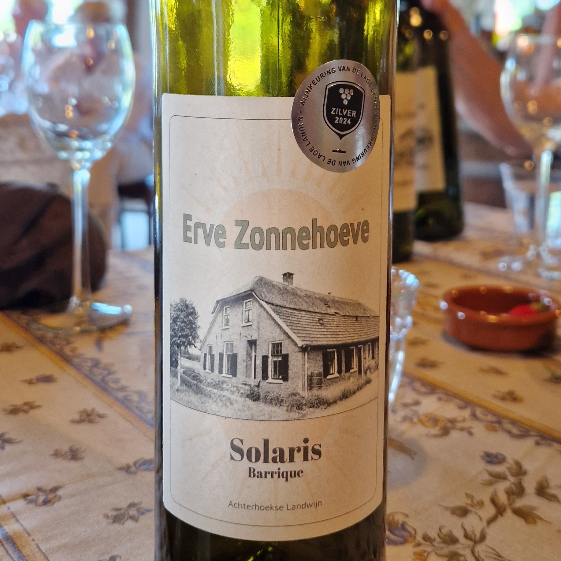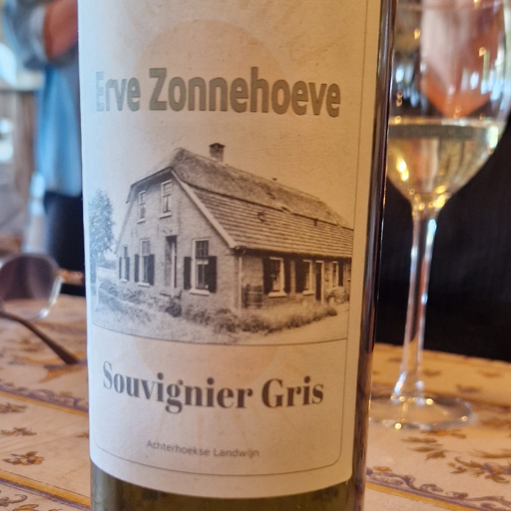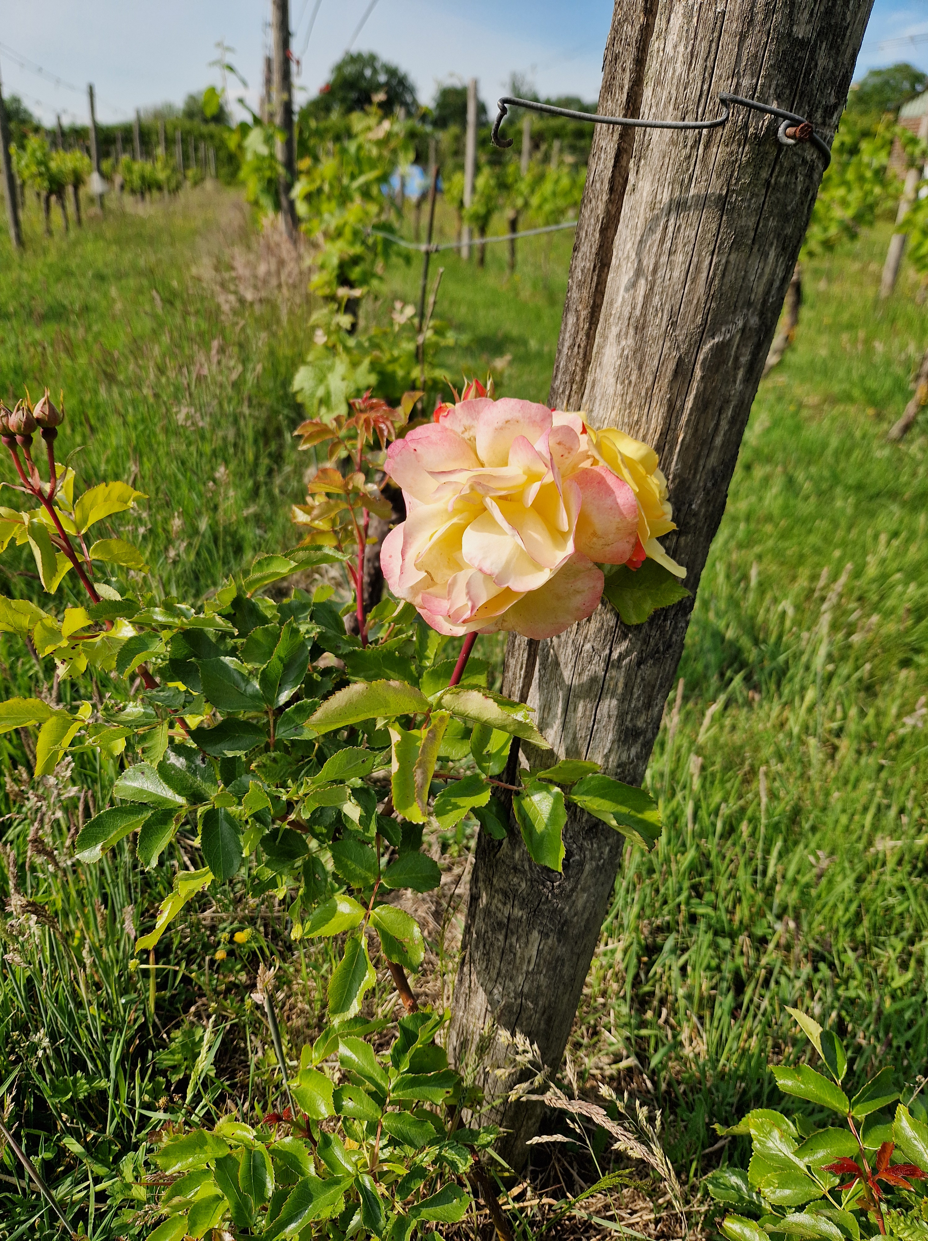 Ik kan het lang niet zo smeuïg navertellen. Er volgt een verhaal over een anti-valse-meeldauw-pap die gemaakt wordt van het alomtegenwoordige Heermoes, de pest als je het in je tuin hebt en het daar niet wilt hebben, dan is het je reinste onkruid. Op Zonnehoeve zijn ze er blij mee. De rest van de uitleg over de wijn, het persen en bottelen is al even boeiend maar ga ik hier niet herhalen. Ik zou zeggen: boek een proeverij met rondleiding, met een glas in de hand tussen de zonnige wijnstokken wandelen. Je ziet per stam de twee hoofdtakken gebogen naar links en rechts en alle uitlopers naar boven, het verhaal van daarnet wordt ineens aanschouwelijk. De rozen aan begin of eind van een rij vraagt Maarten elk jaar voor zijn verjaardag, dat is de vaste rozenplantdag. Verschillende soorten door mekaar, dat maakt niet uit voor dit natuurlijke en decoratieve “alarmsysteem”.