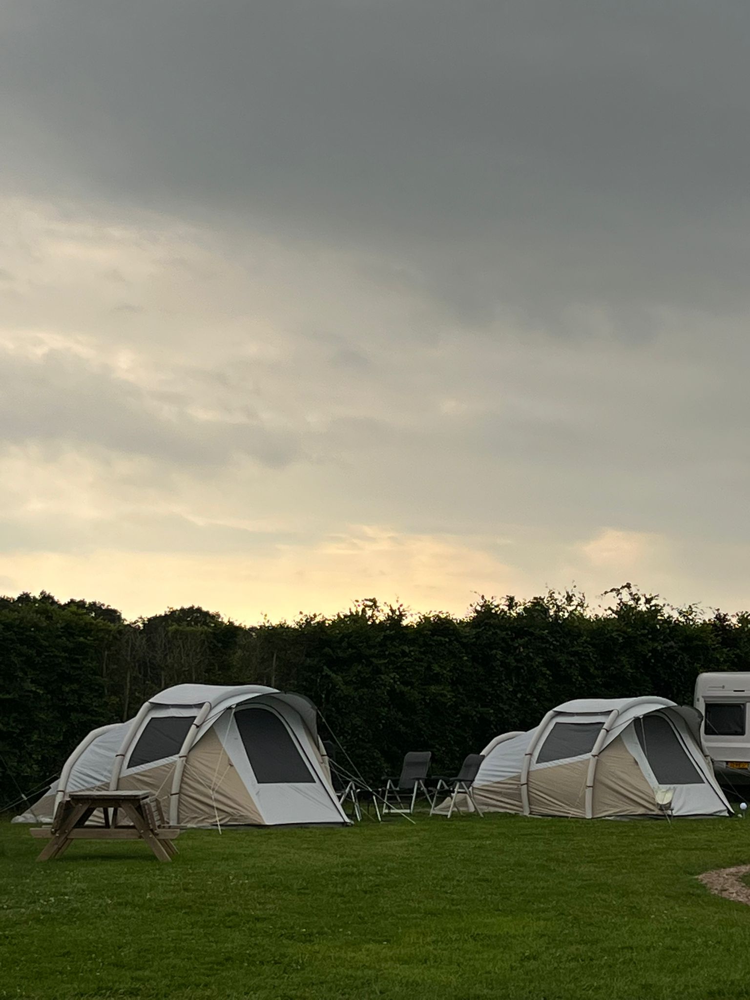 De vakantie kan beginnen. Met de heg achter ons en de twee identieke Queshua’s aan weerszijde zitten we buiten heerlijk beschut.