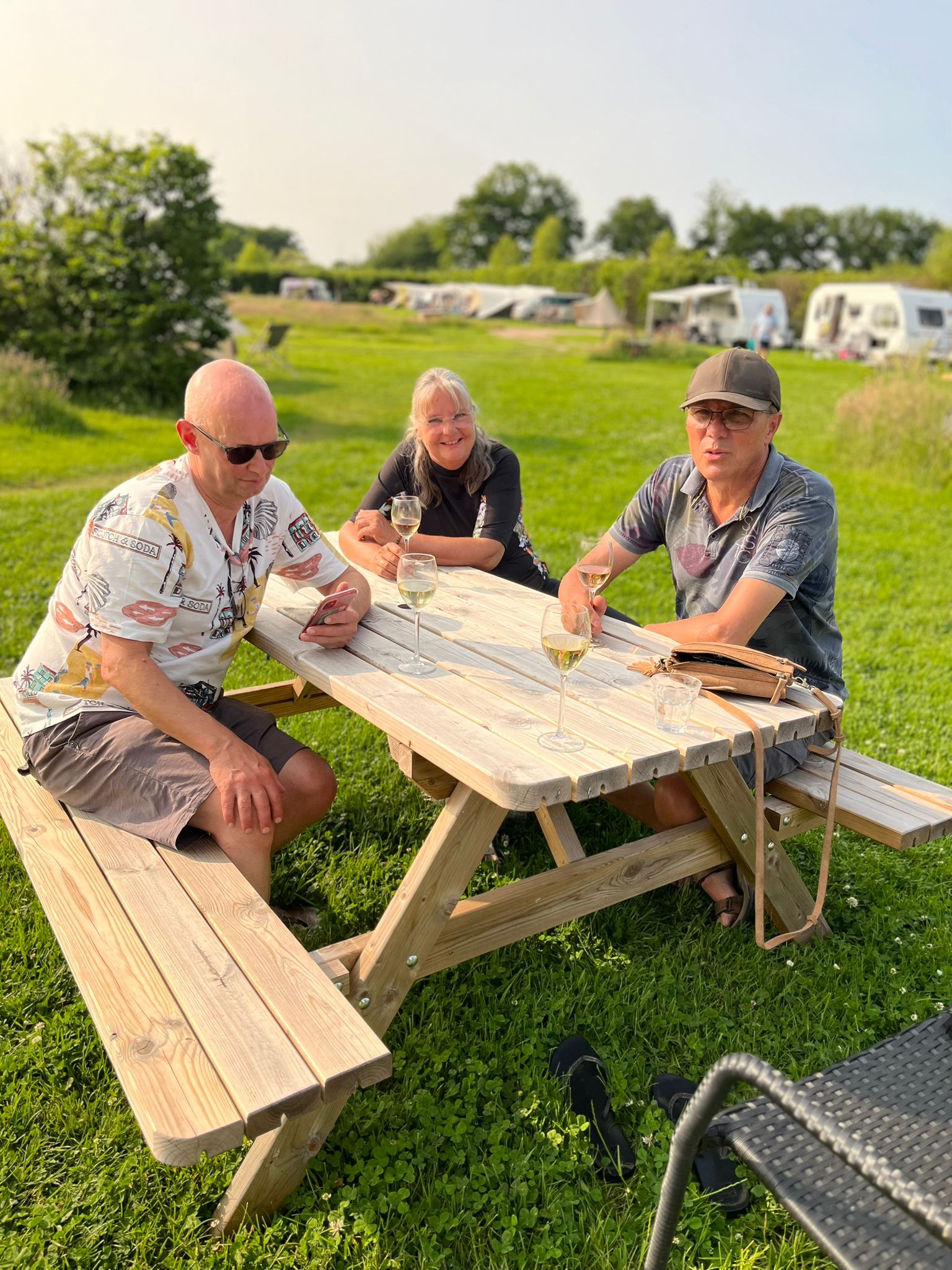 Precies op tijd zijn we alle vier terug voor het wijnproeverij-evenement. Echt, ik kan het iedereen aanraden, ook al houd je eigenlijk niet van witte wijn zoals Gijs. Het is net een voorstelling waar we naar kijken. Tineke en Maarten hebben jarenlang een kroeg in Leiden gehad, de babbel hebben ze van nature. Ze vertellen smakelijk hoe ze twee jaar geleden van de drukke stad naar het platteland zijn verhuisd, de uitdagingen waar ze voor kwamen te staan: een gesetteld wijnbedrijf waarvan de oogst direct moest worden binnengehaald en ondertussen de camping runnen. Ze zijn beiden open van aard, contacten worden makkelijk gelegd en ze krijgen veel hulp van een inmiddels bevriende wijnbouwer uit de contreien.