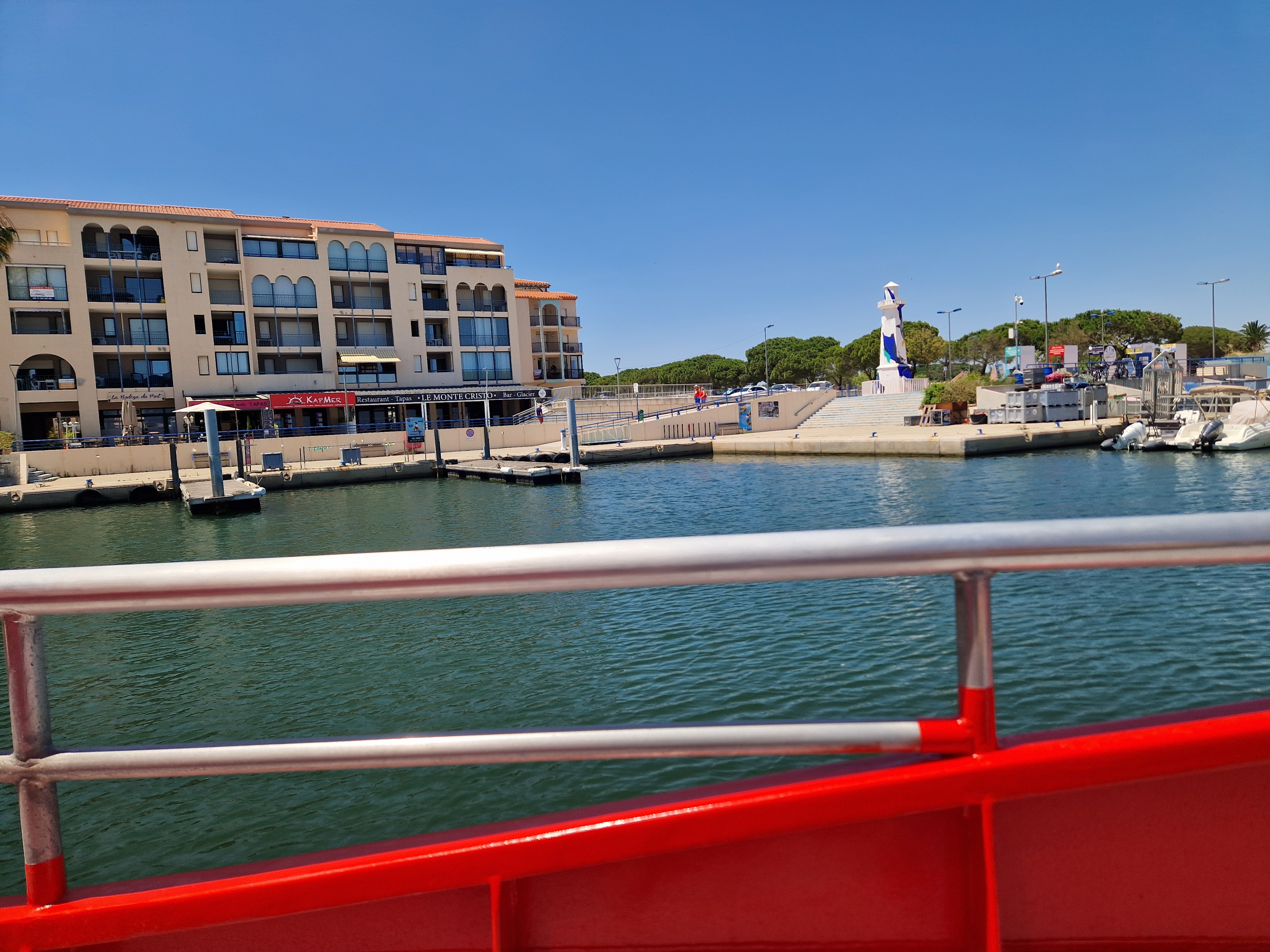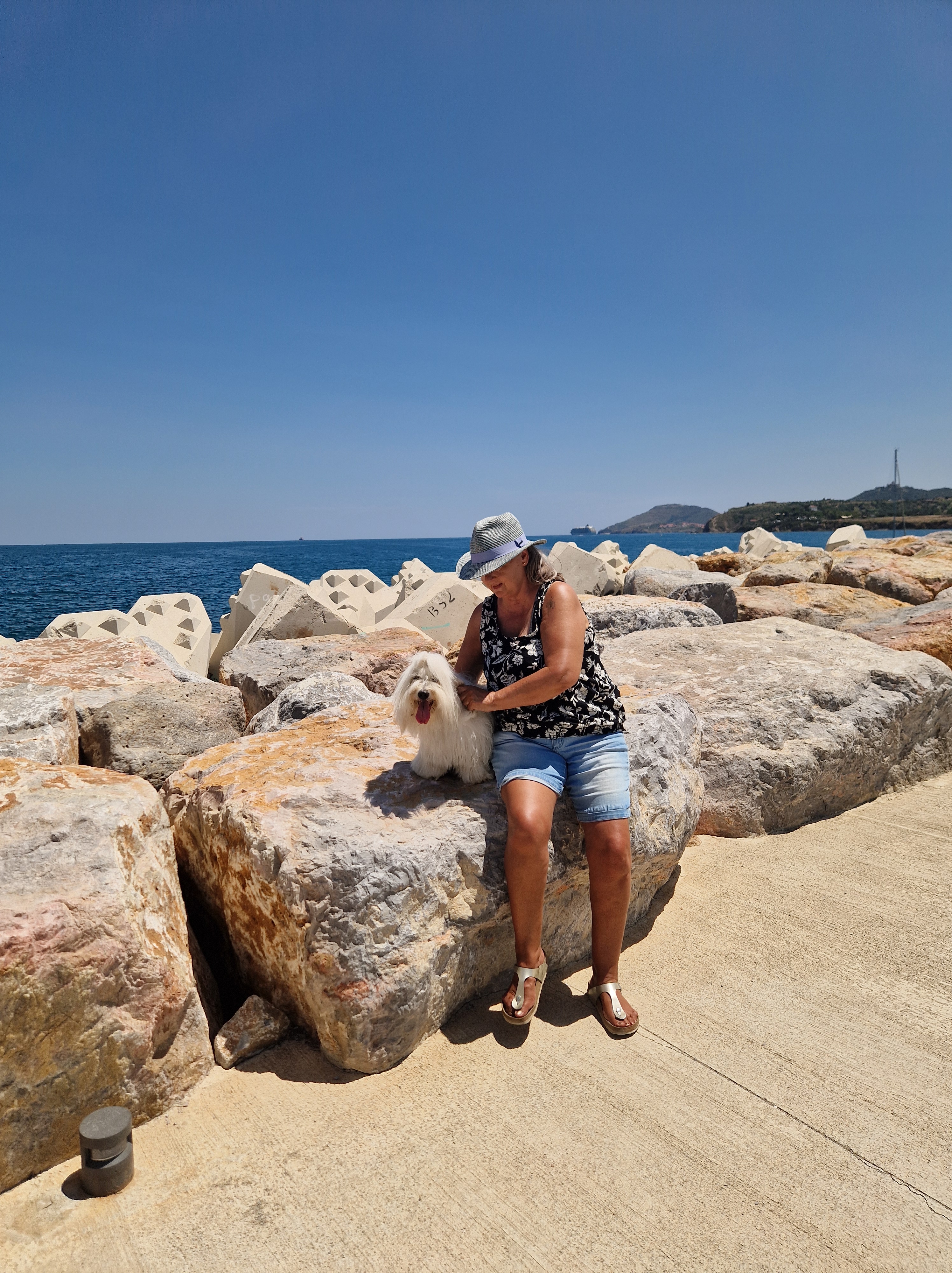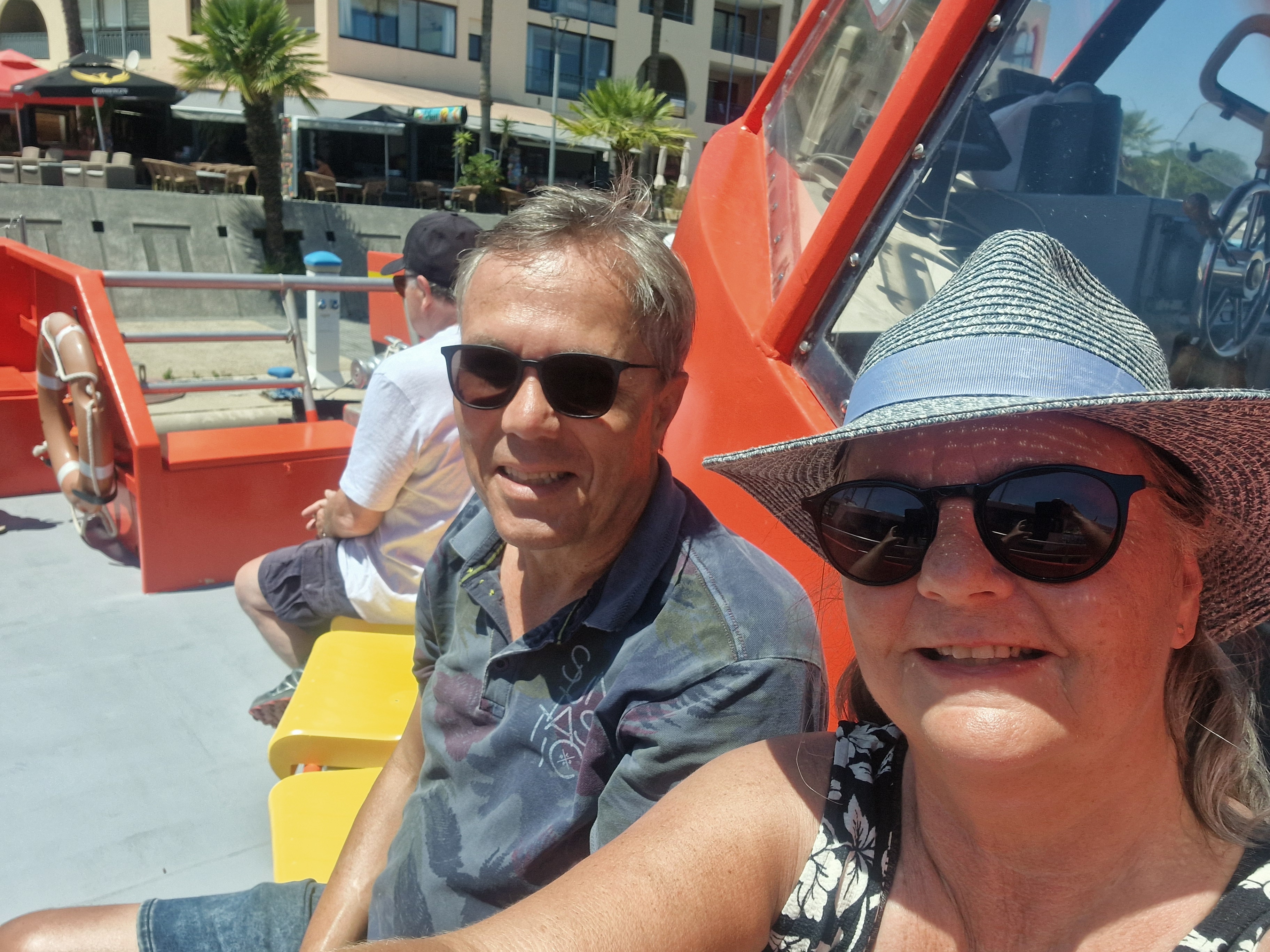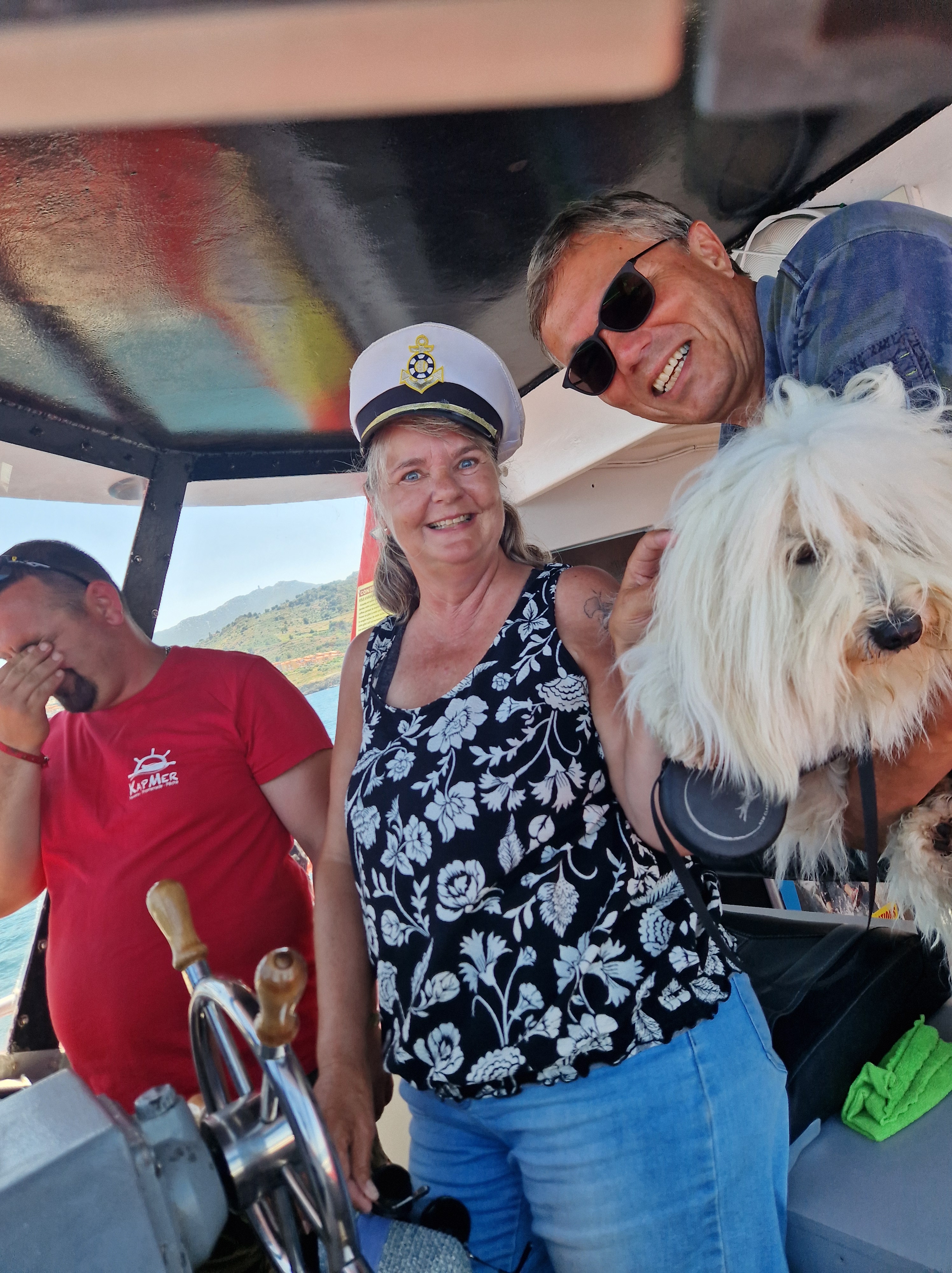 Op volle zee gaan we op de foto met hond en al in de captains cabin. Kijk vooral naar dat hoofd van de beste man. Port Vendres is een natuurlijke haven op de grens met Spanje, zoveel begrijp ik uit het verhaal. De gids vertelt nog meer. Geen idee meer wat, iets met explosievenfabriek, iets over de containertrawler die nu uitgeladen wordt met bananen uit Afrika en de douane die het hier maar druk heeft. We zijn gaargestoofd als klontjes boter als we in Argelès van boord stappen.