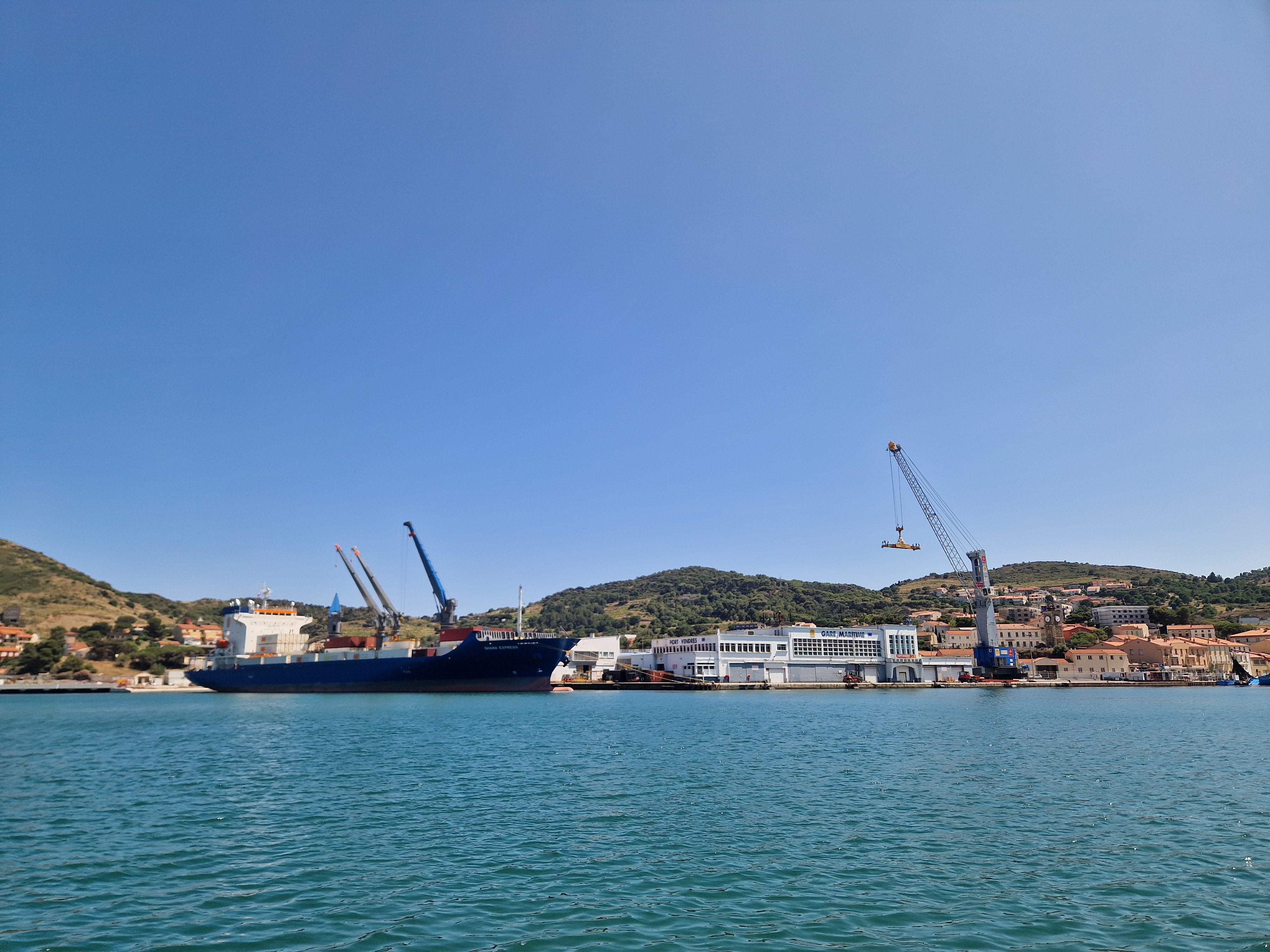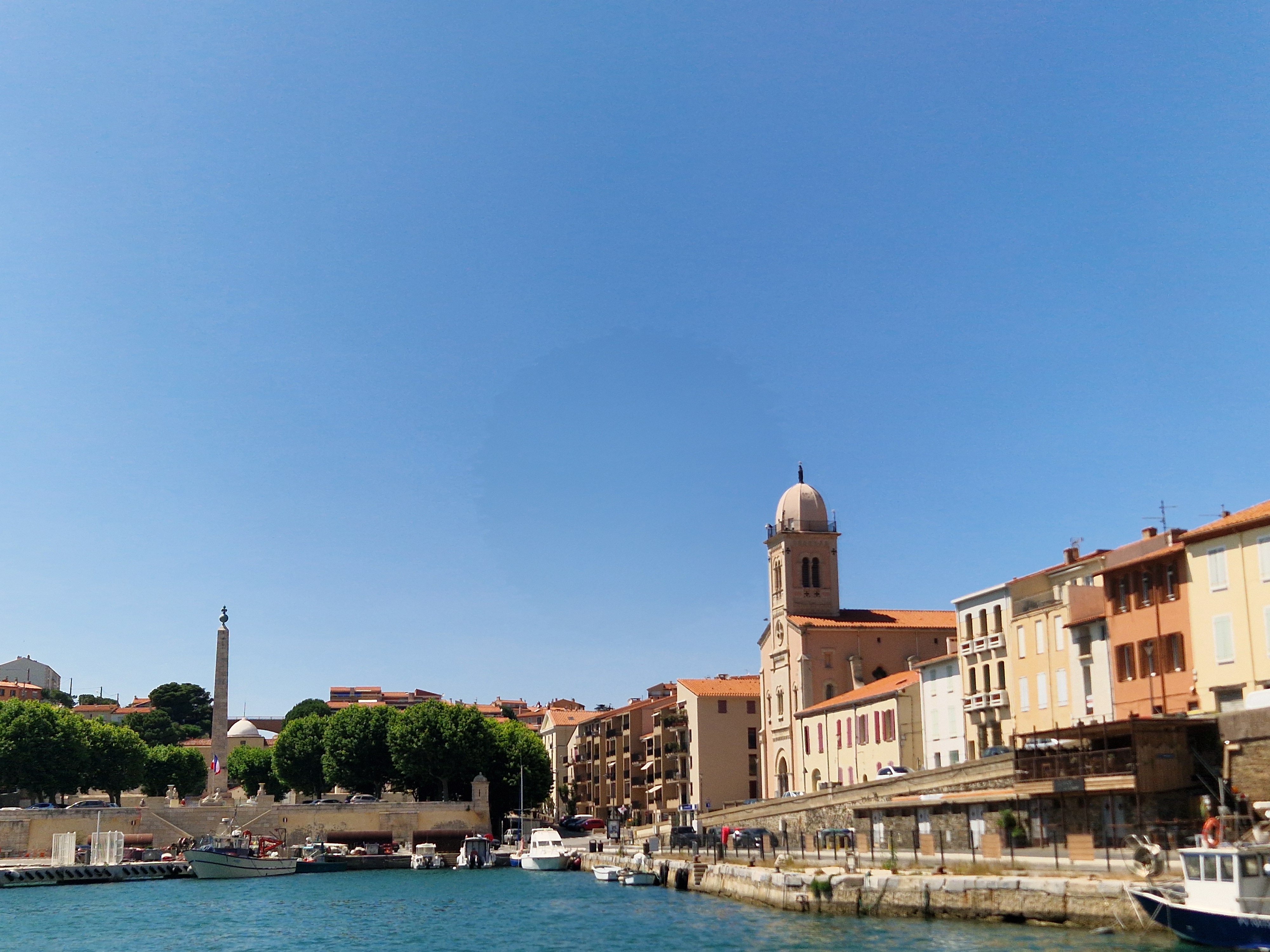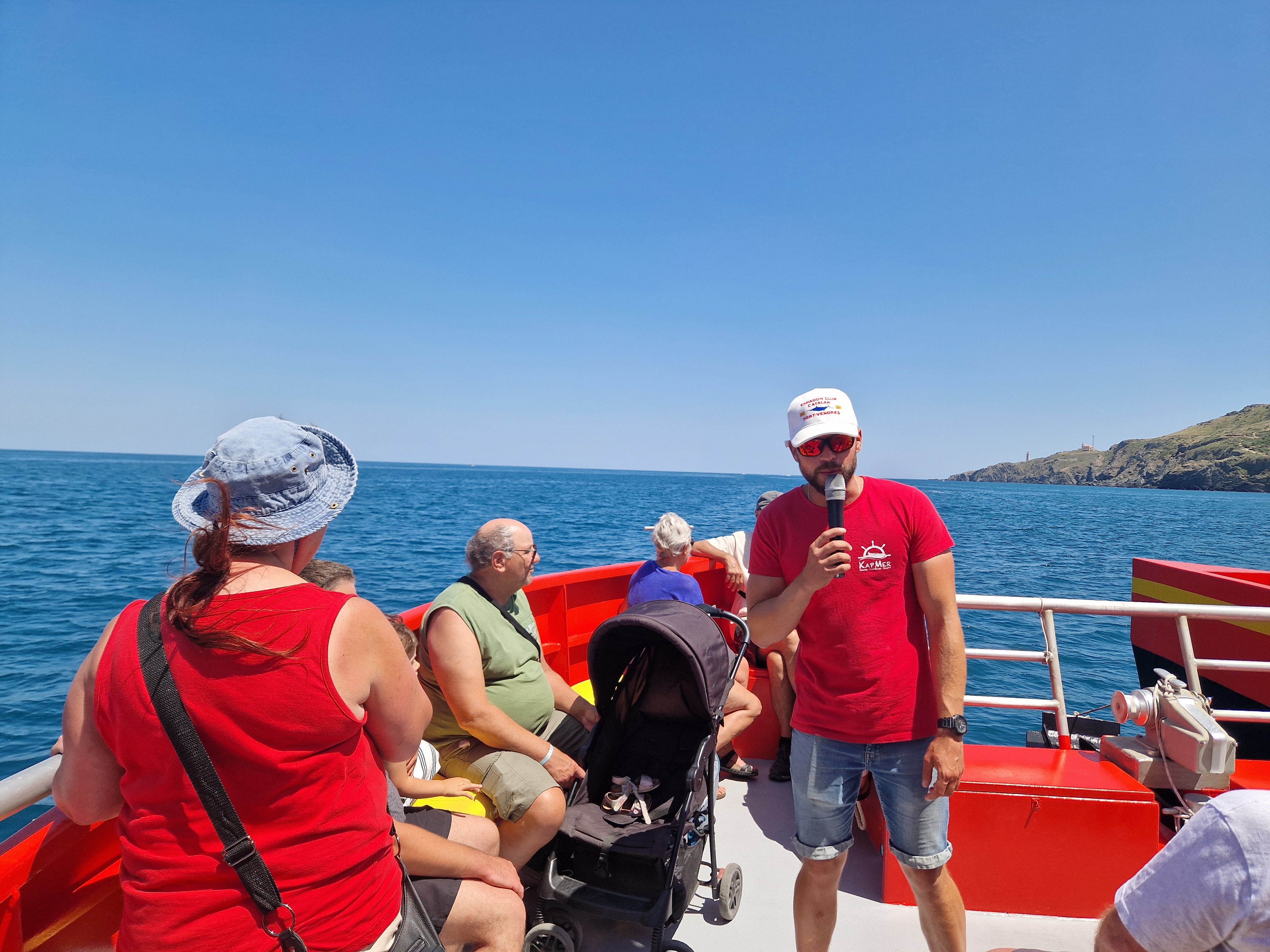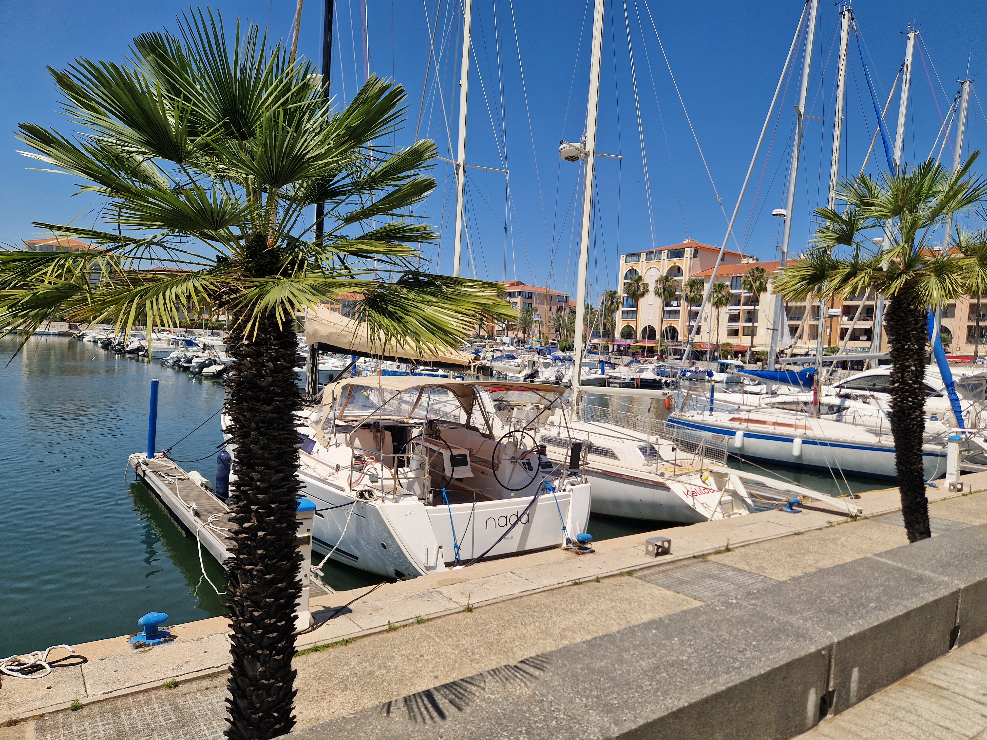 Op volle zee gaan we op de foto met hond en al in de captains cabin. Kijk vooral naar dat hoofd van de beste man. Port Vendres is een natuurlijke haven op de grens met Spanje, zoveel begrijp ik uit het verhaal. De gids vertelt nog meer. Geen idee meer wat, iets met explosievenfabriek, iets over de containertrawler die nu uitgeladen wordt met bananen uit Afrika en de douane die het hier maar druk heeft. We zijn gaargestoofd als klontjes boter als we in Argelès van boord stappen.