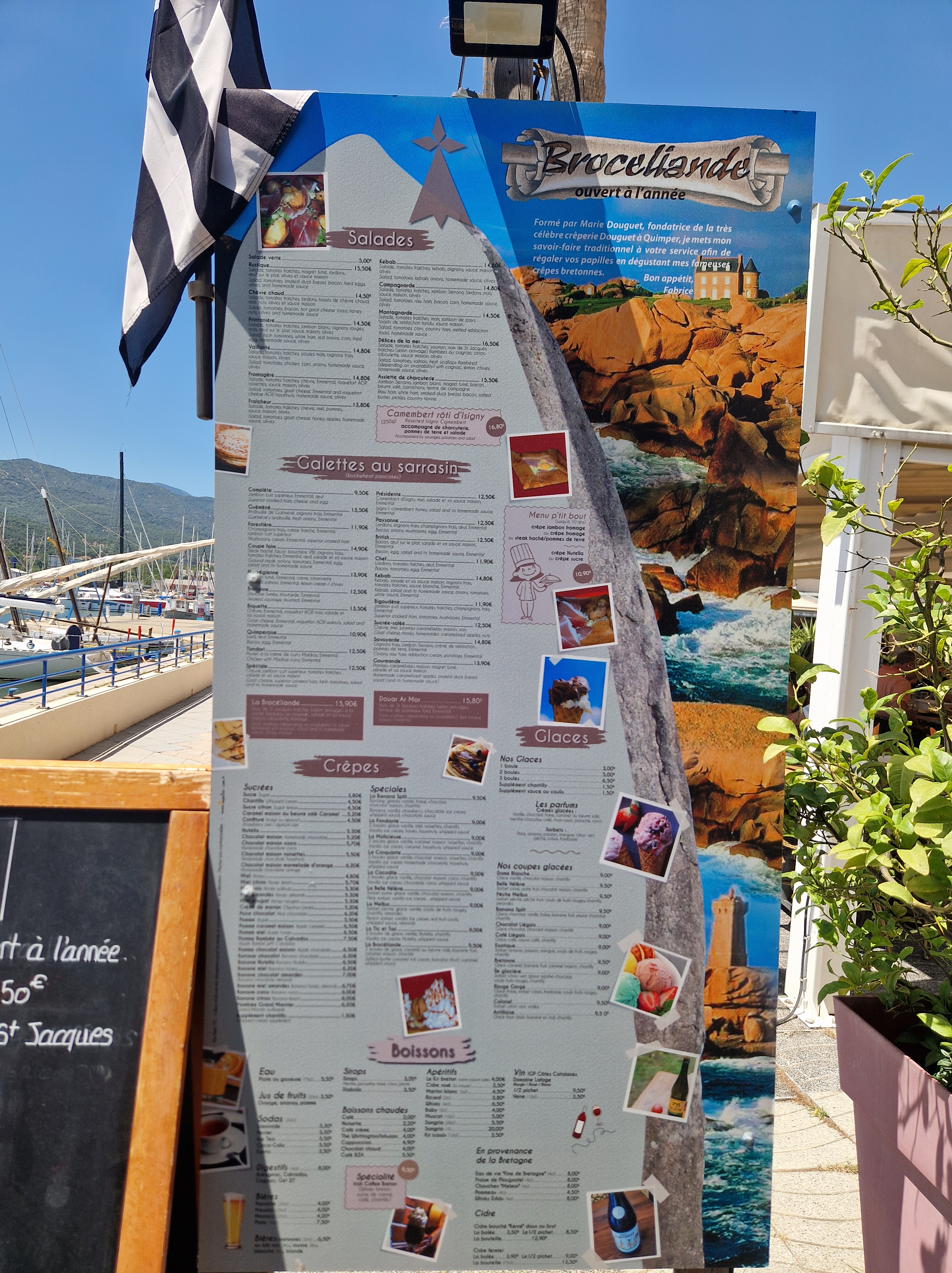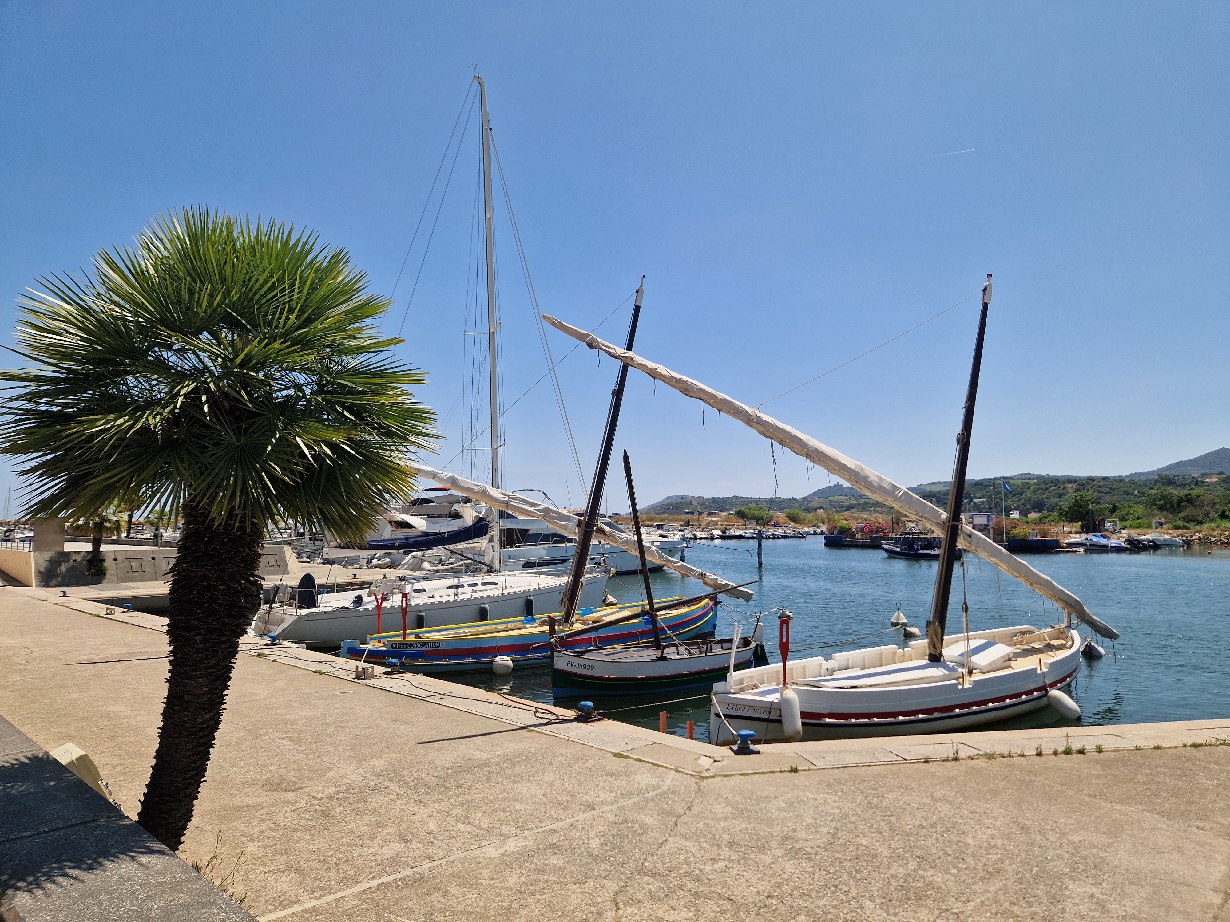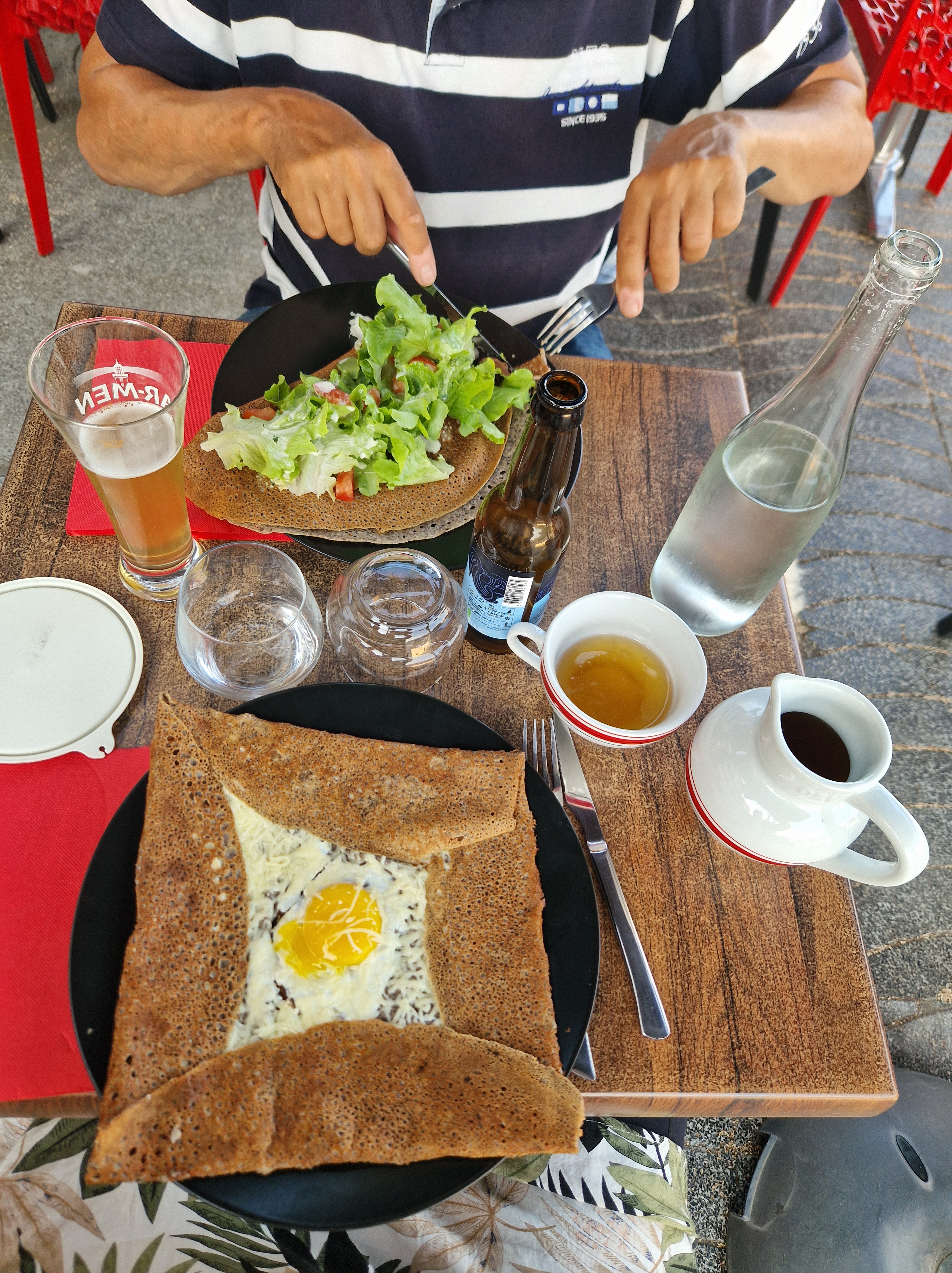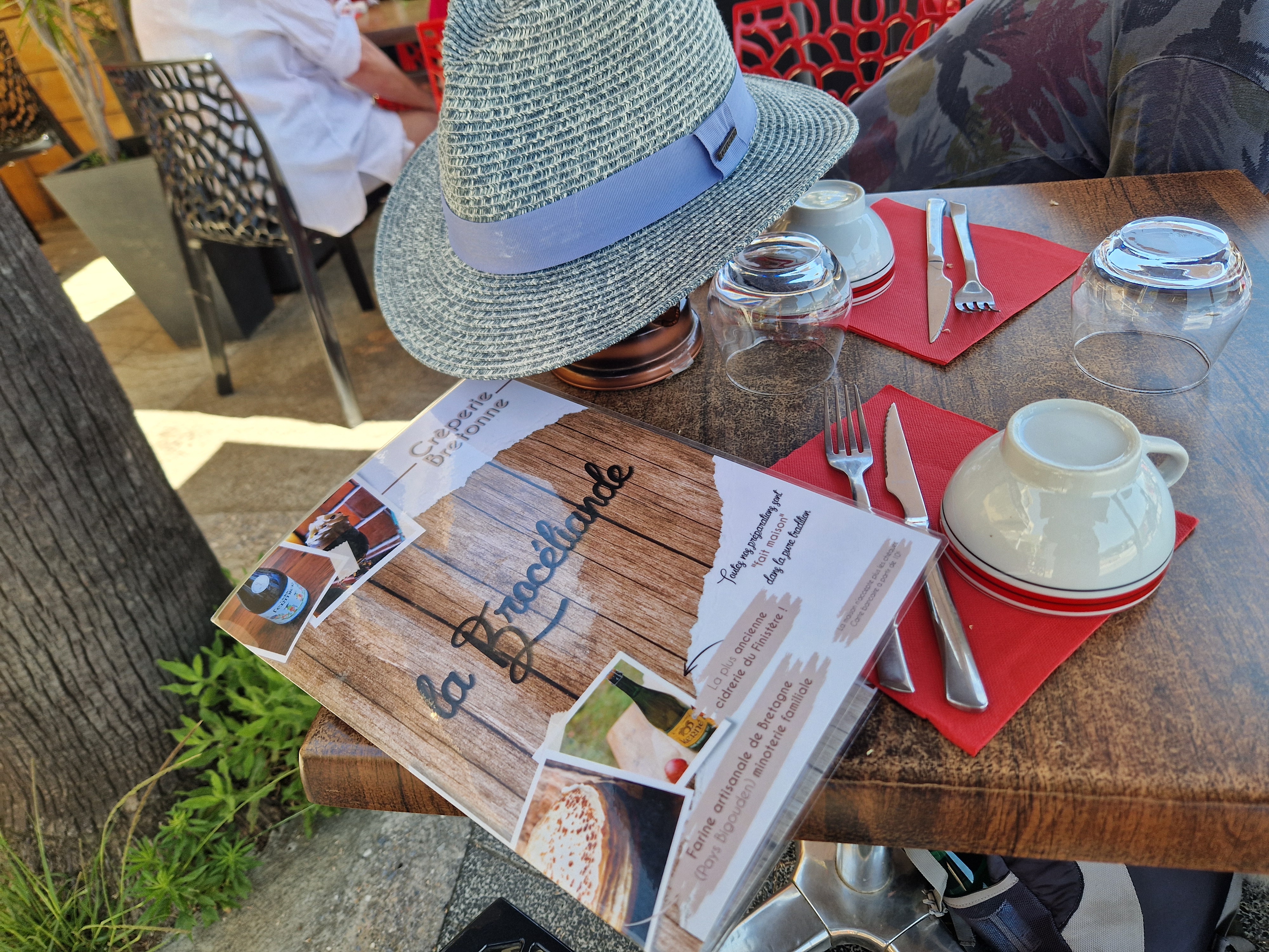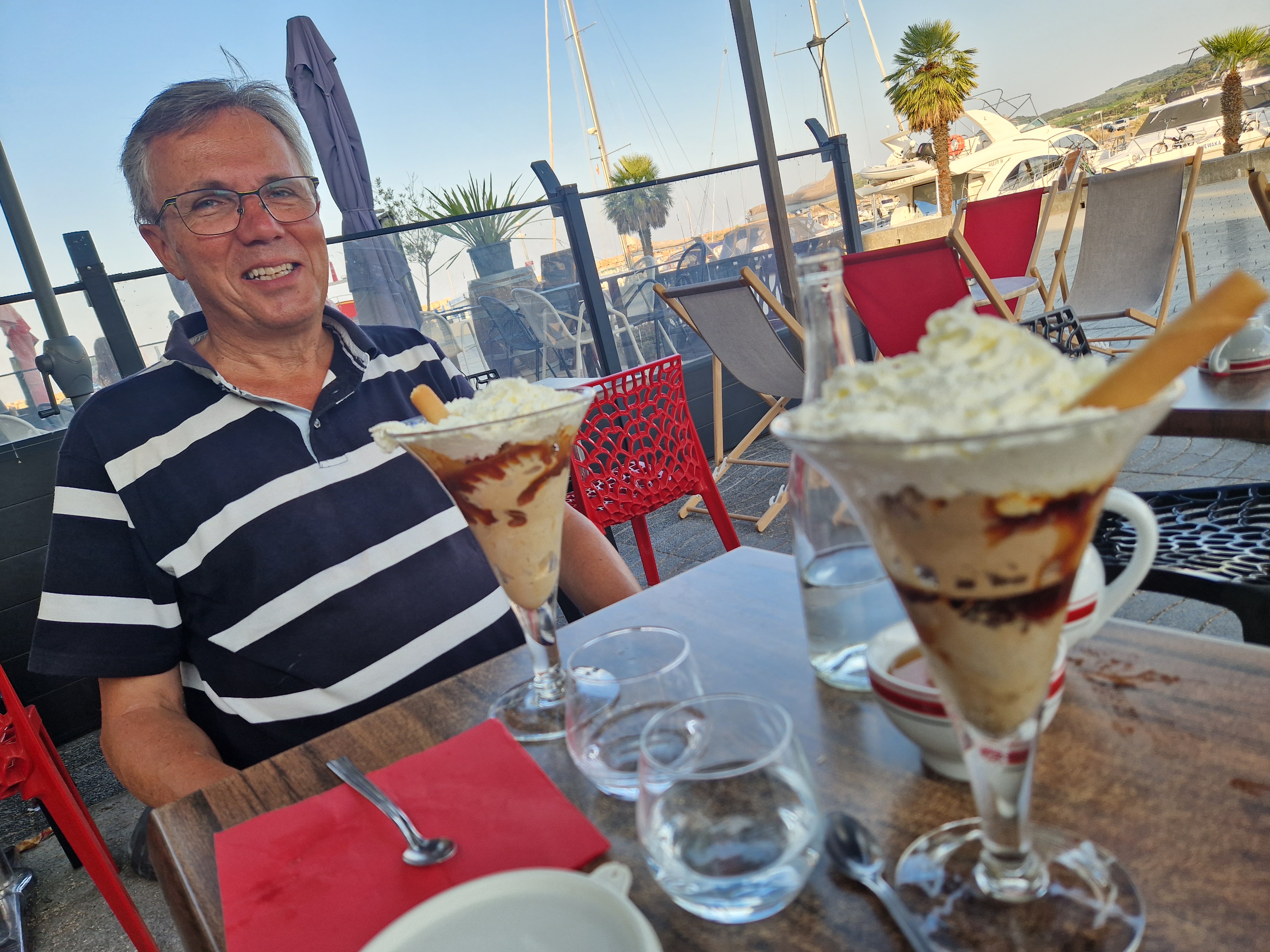 Om eens niet met de auto erop uit te gaan, plannen we een rondvaartje vanuit Argelès-sur-Mer. De zon brandt gaten in het marmeren wegdek van de boulevard. We kopen bij de stalletjes langs de boulevard vast kaartjes voor de boot, ja, de hond mag ook mee. Nu hebben tijd over. “Als we nu eens gingen lunchen met pannenkoeken?” Crèpes en cidre brut, dat is toch vakantie?